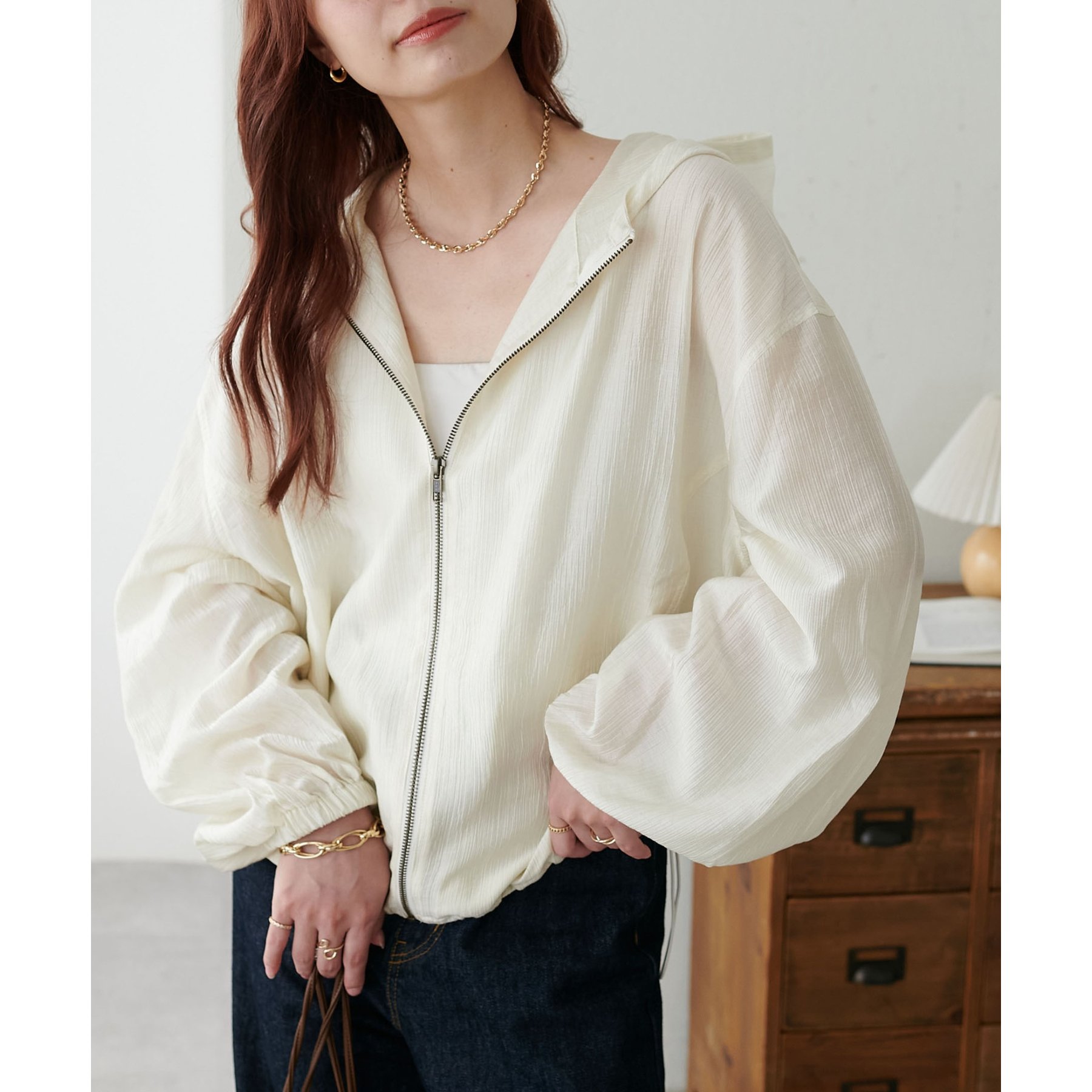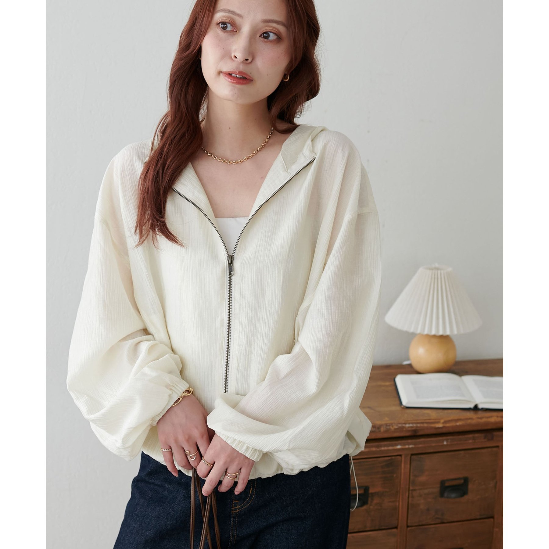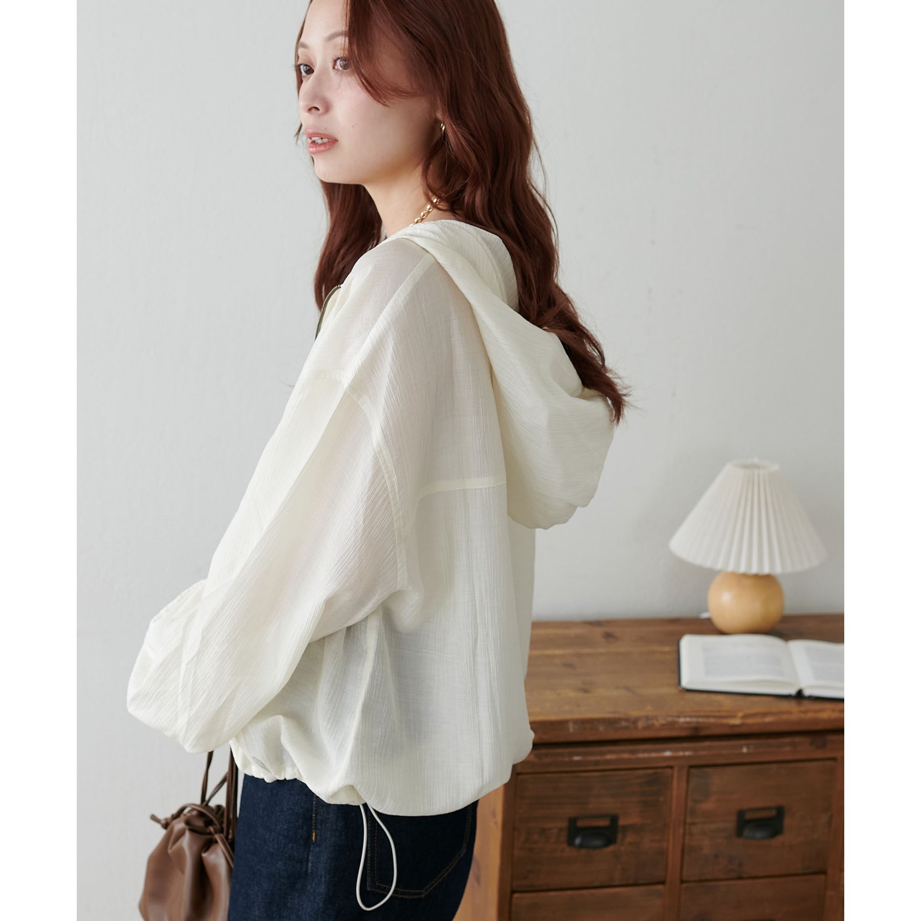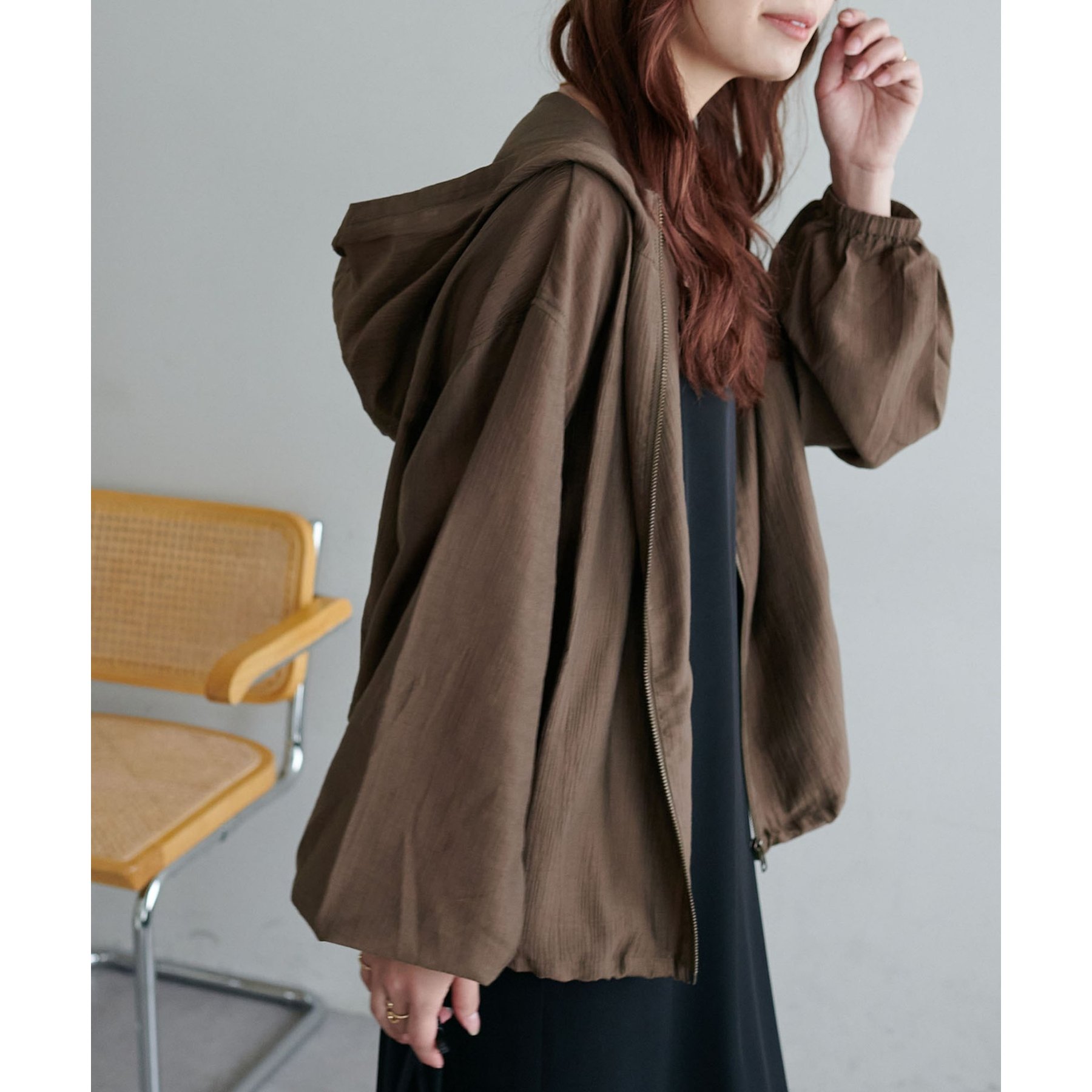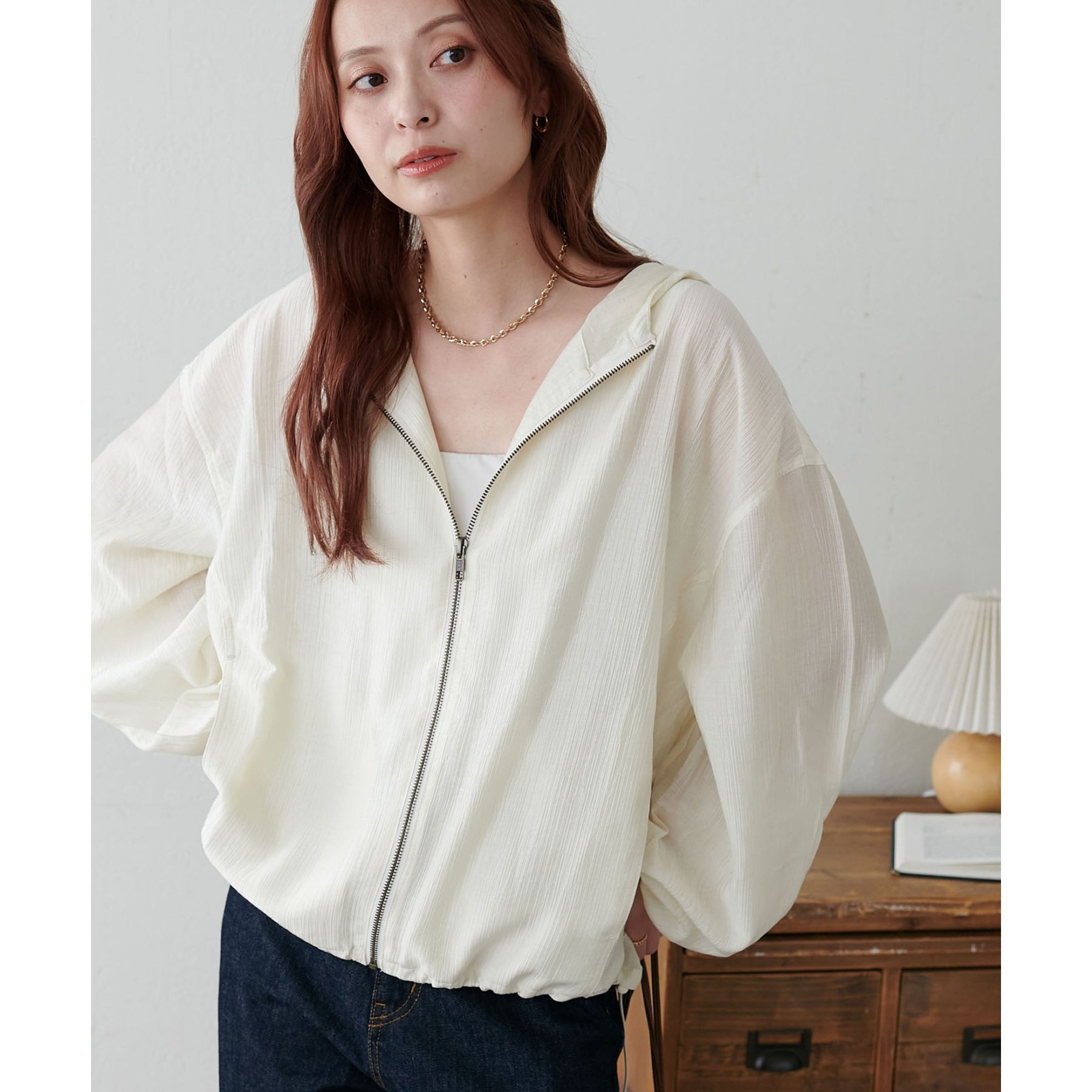 軽やかに羽織れてバランス良く決まる、シアー素材のフードブルゾン