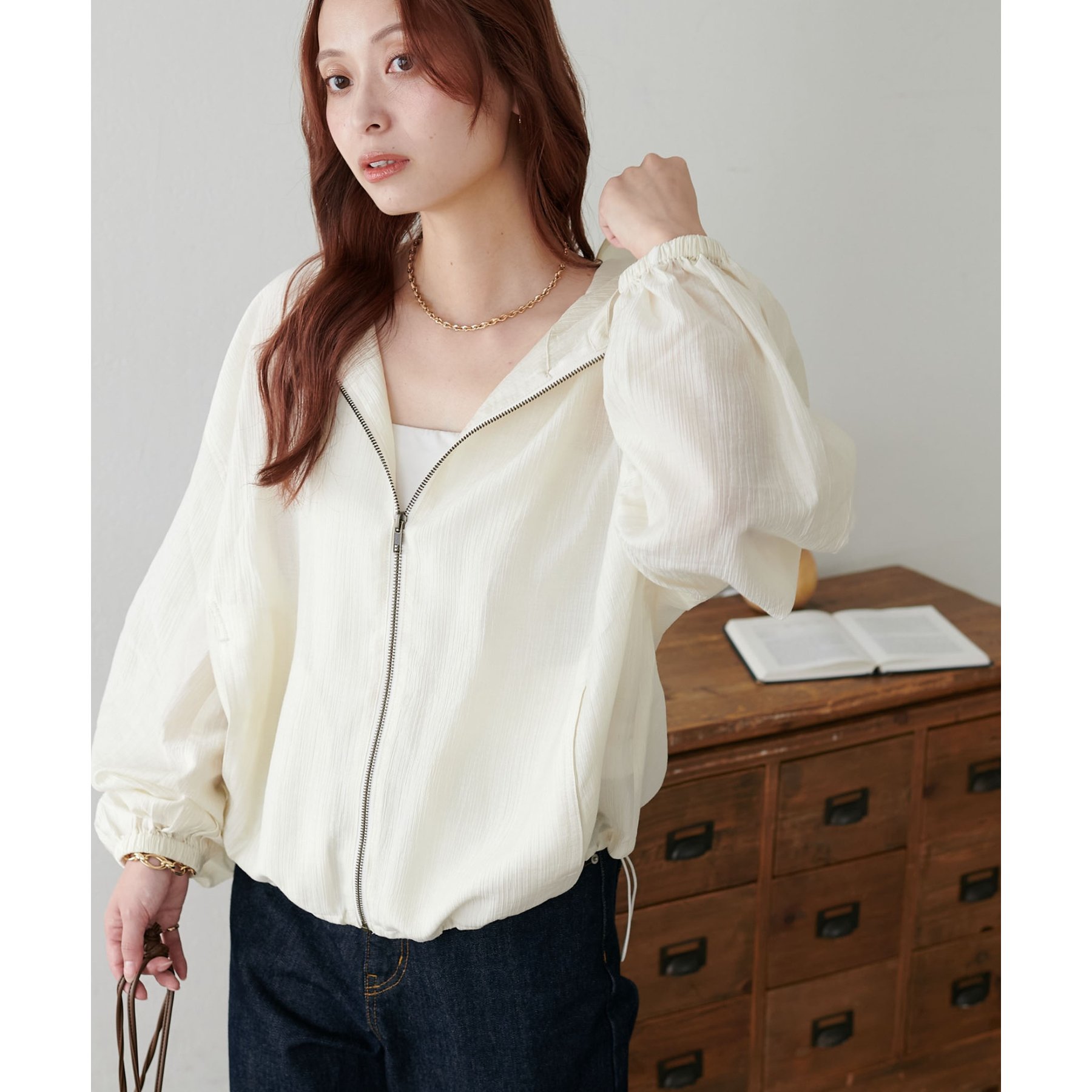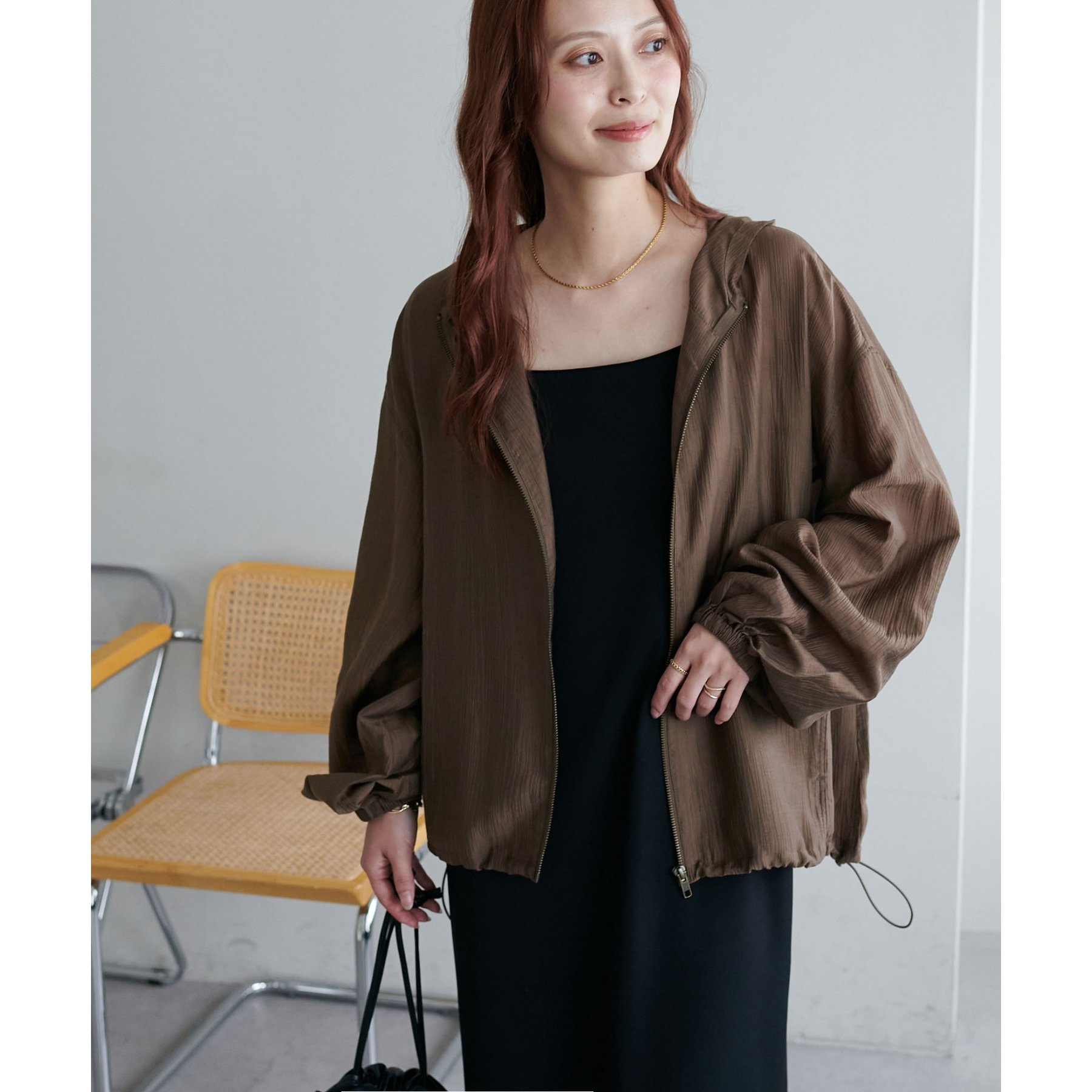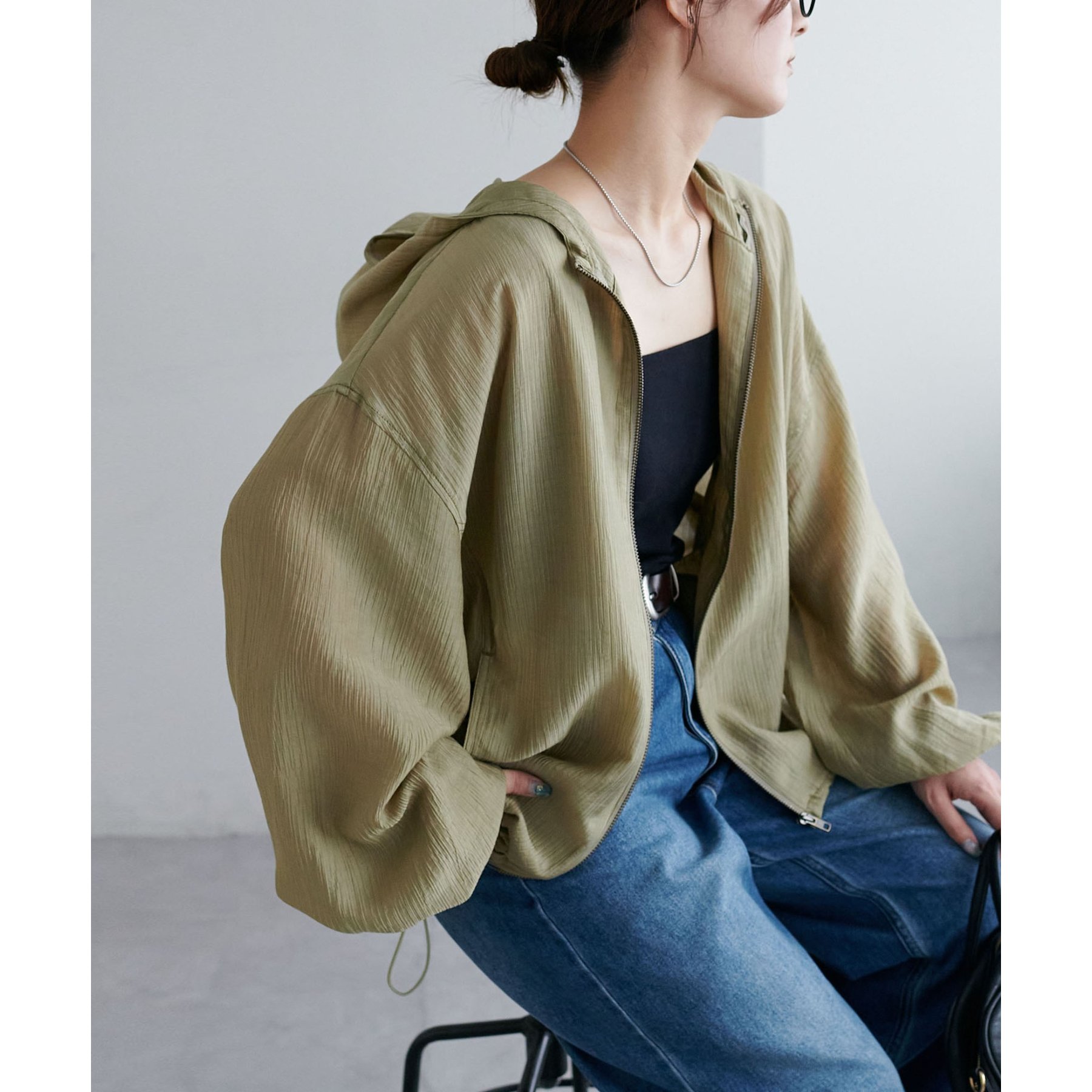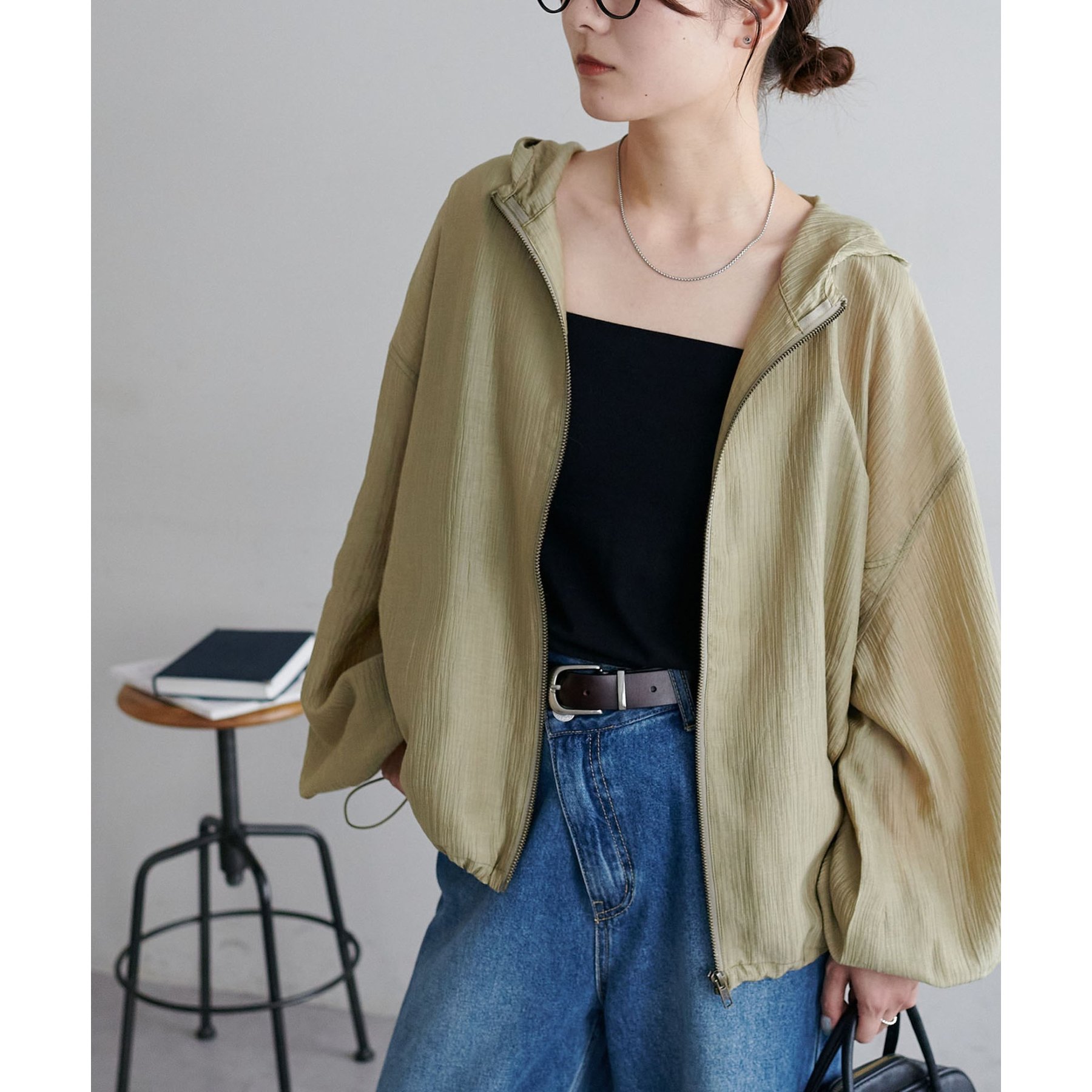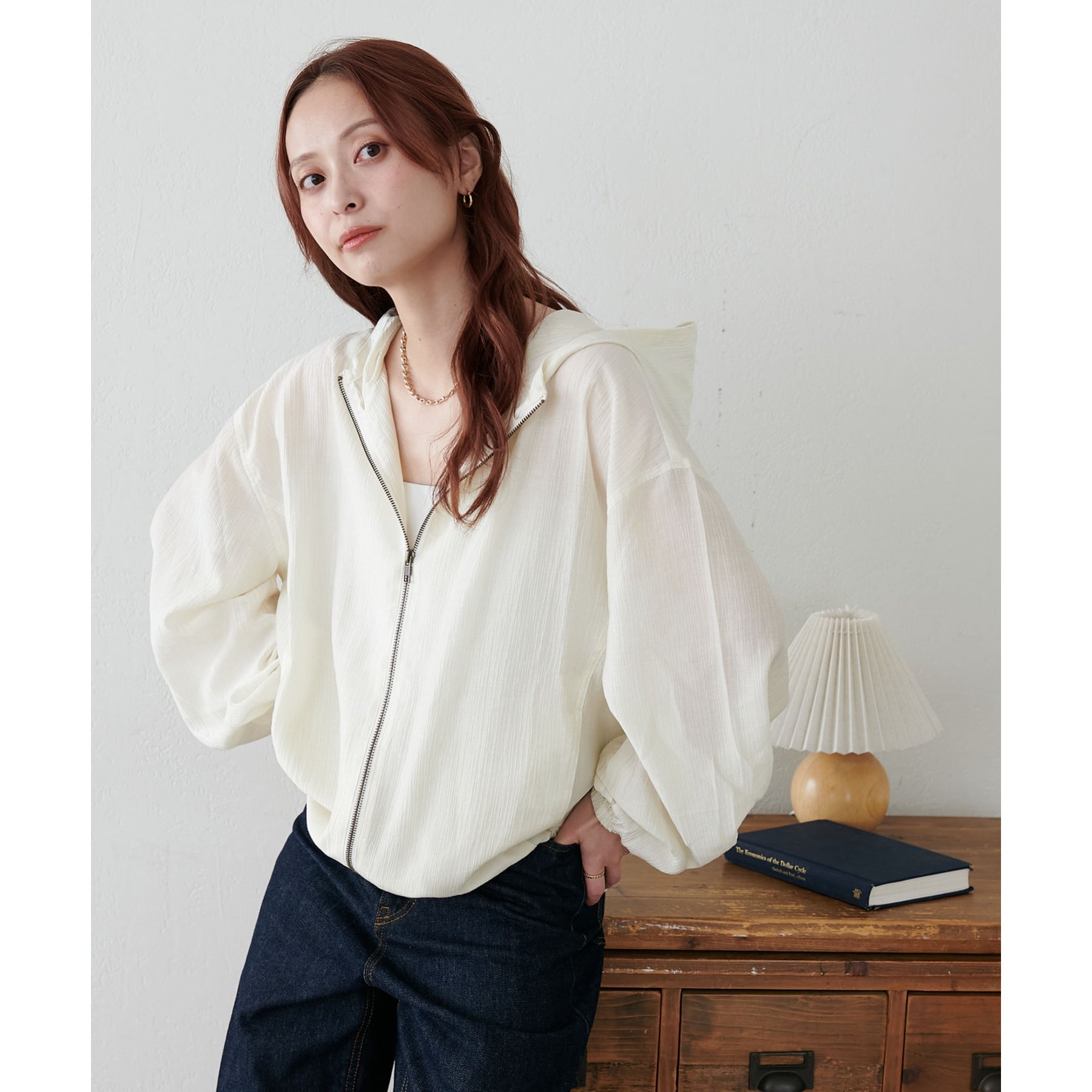 軽やかに羽織れてバランス良く決まる、シアー素材のフードブルゾン