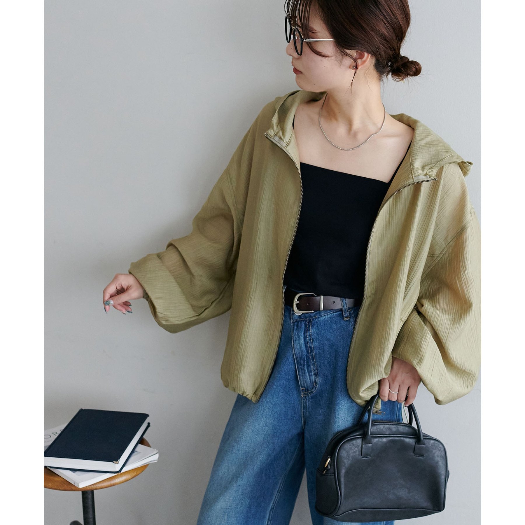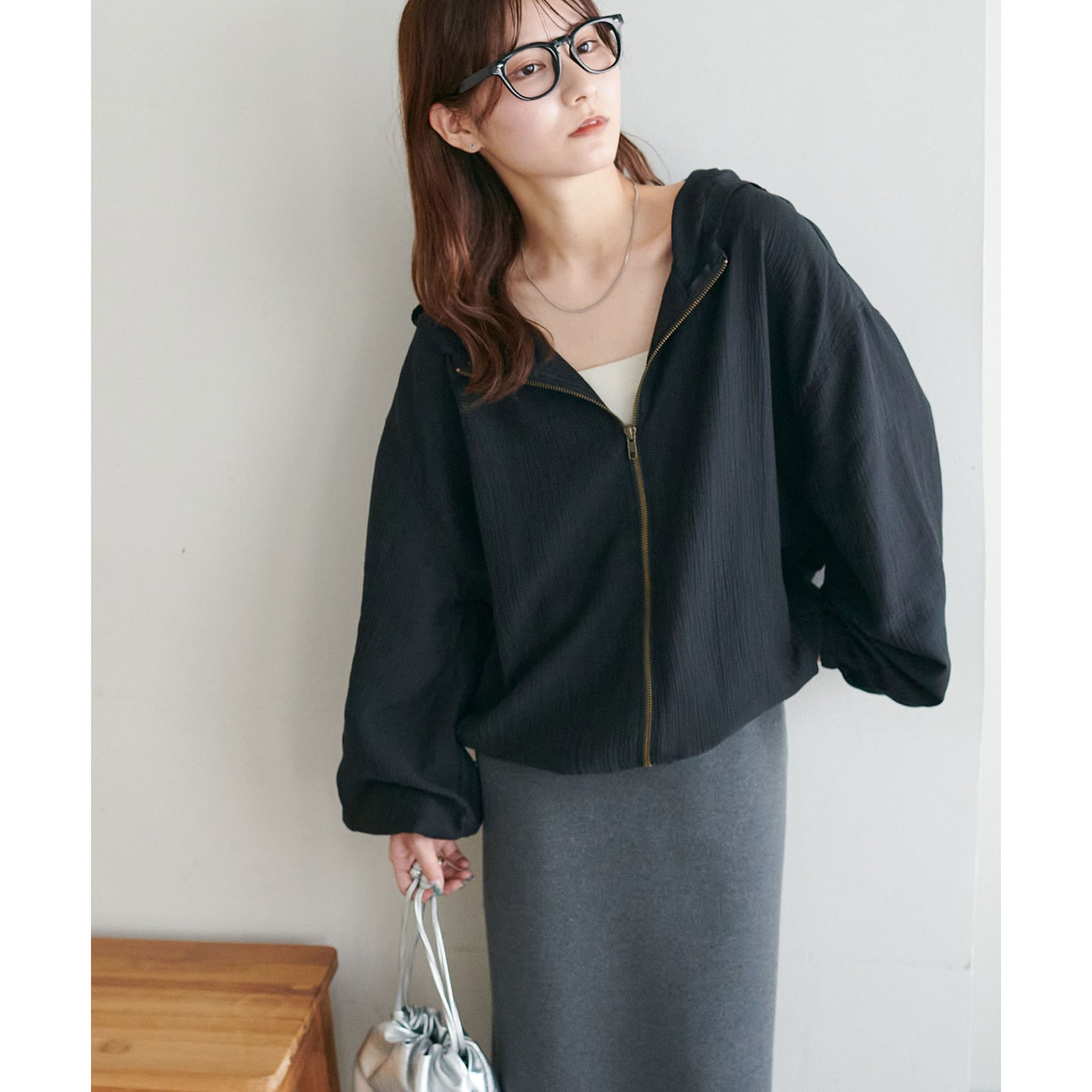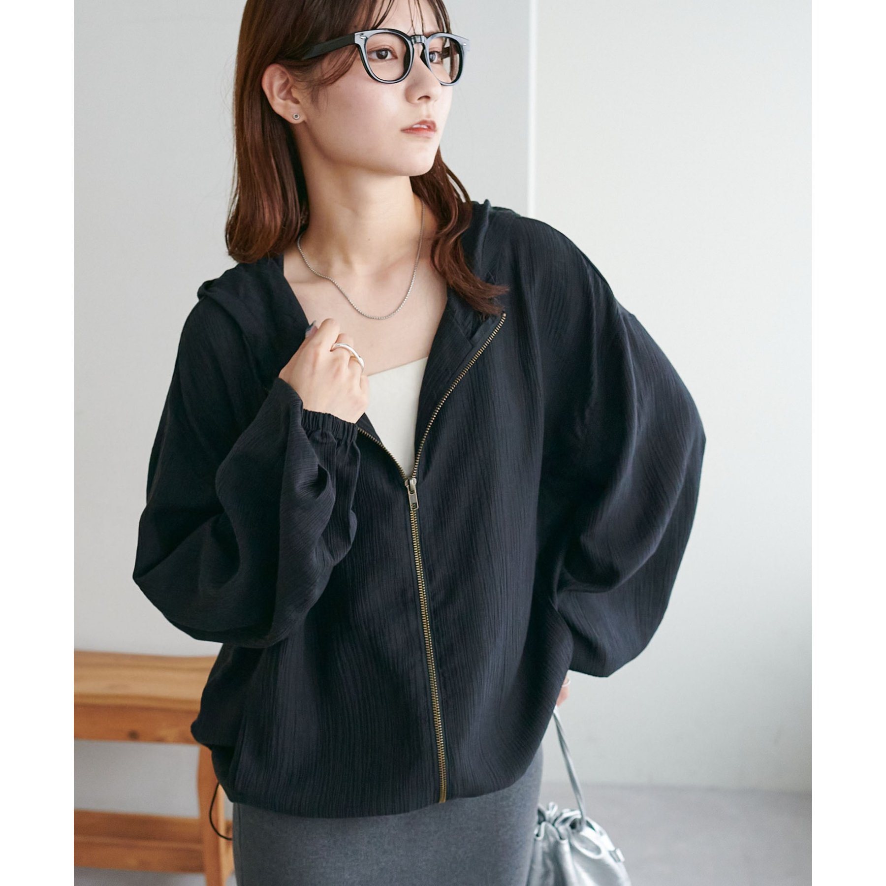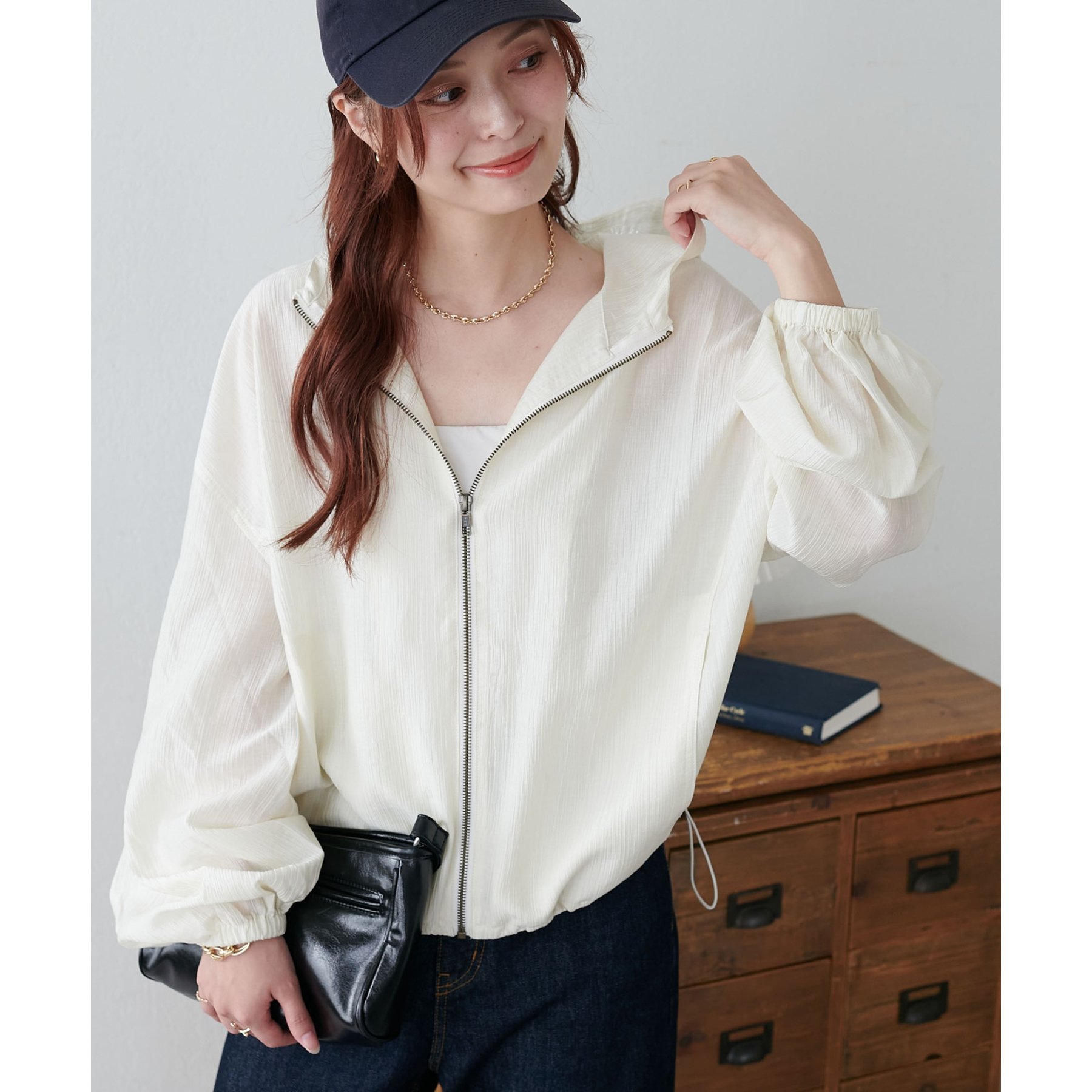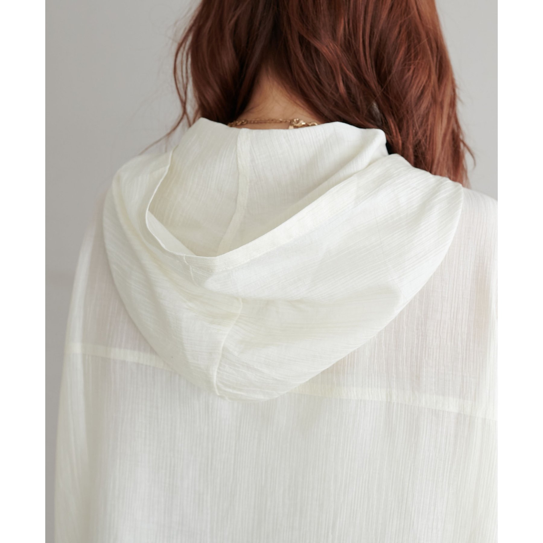 軽やかに羽織れてバランス良く決まる、シアー素材のフードブルゾン