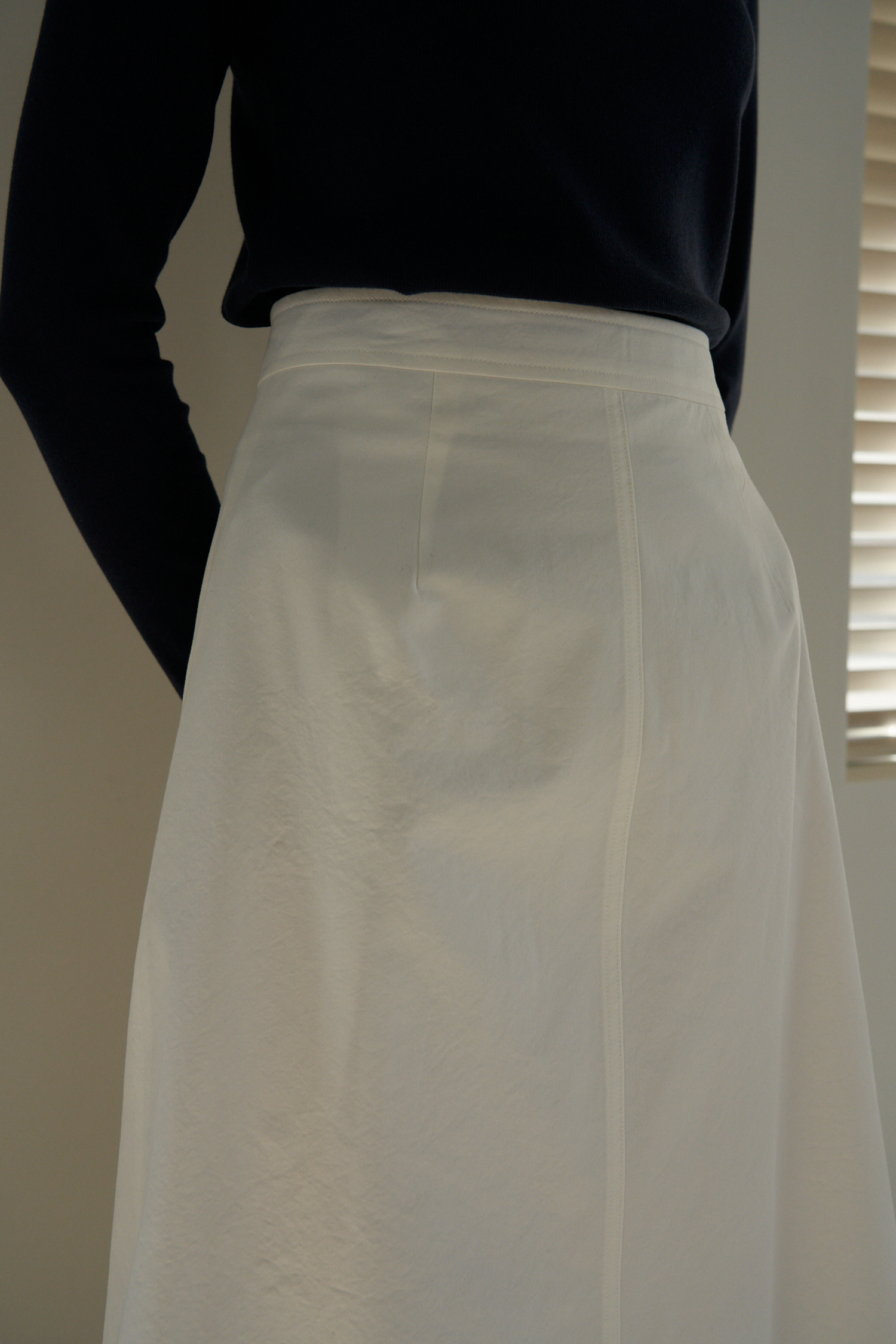 腰端と裾、 スカート中央の切開ラインに2本のステッチ