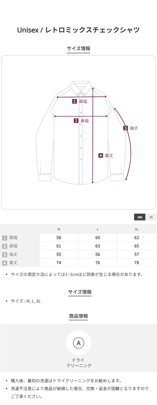着丈 M:74cm L:76cm XL:78cm