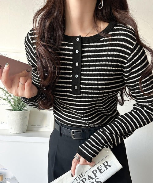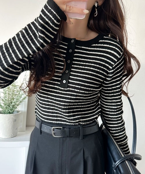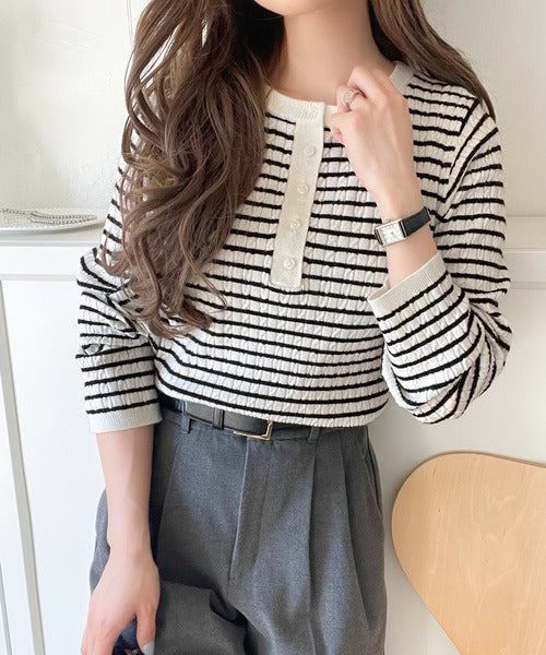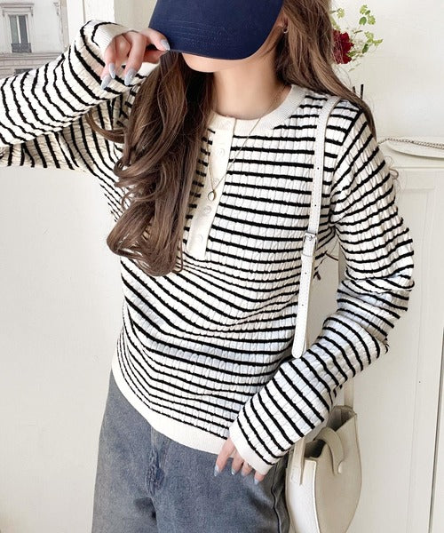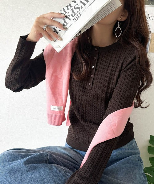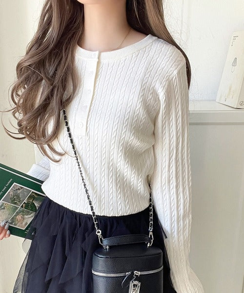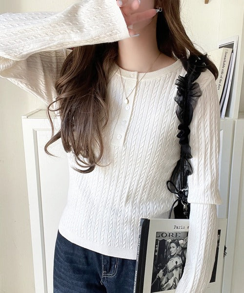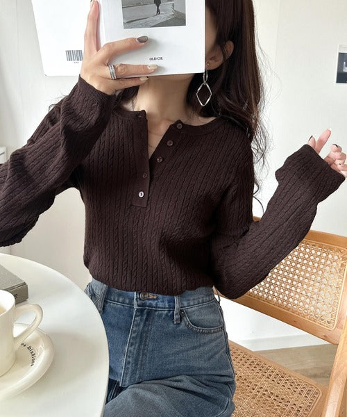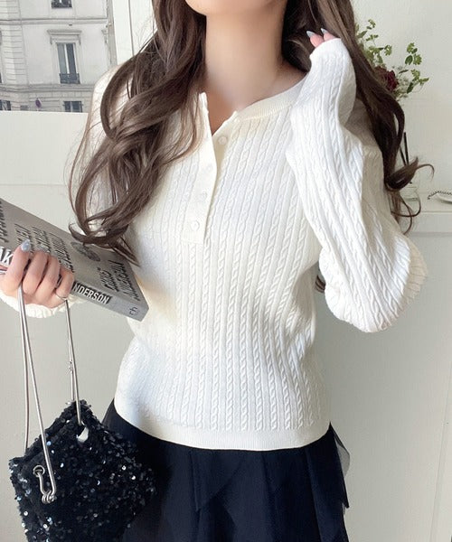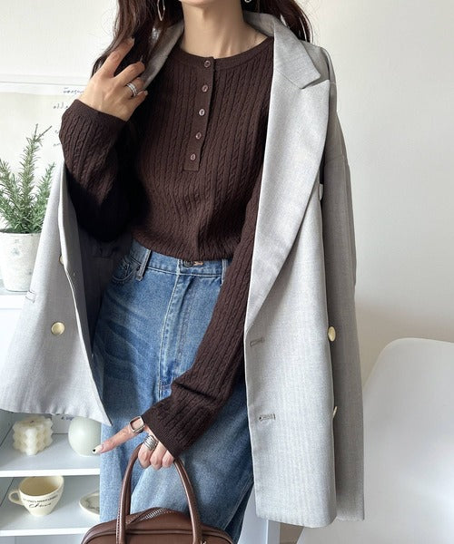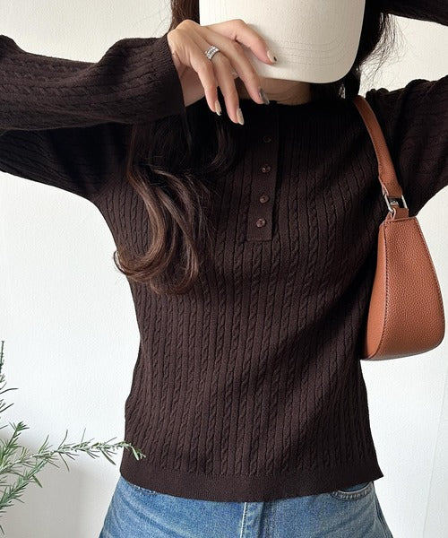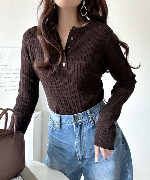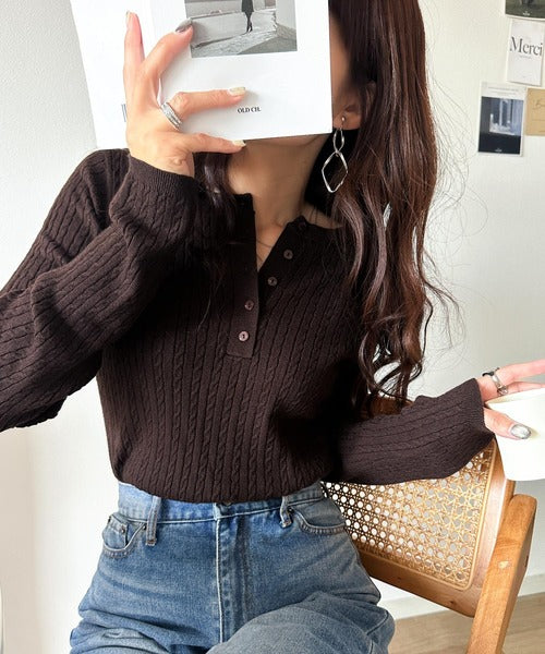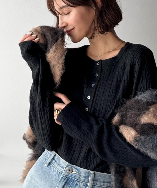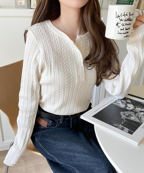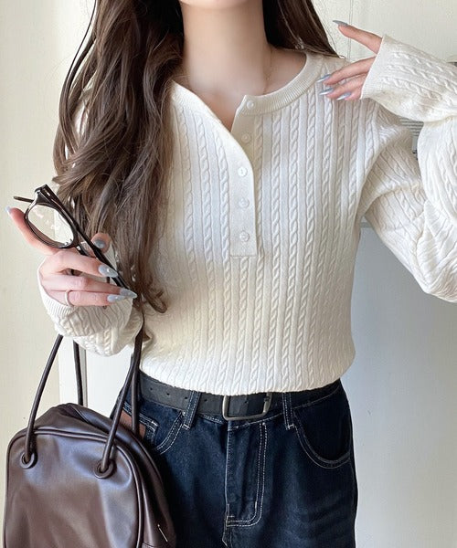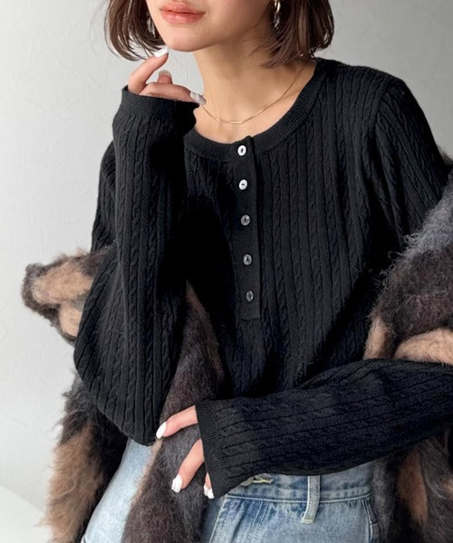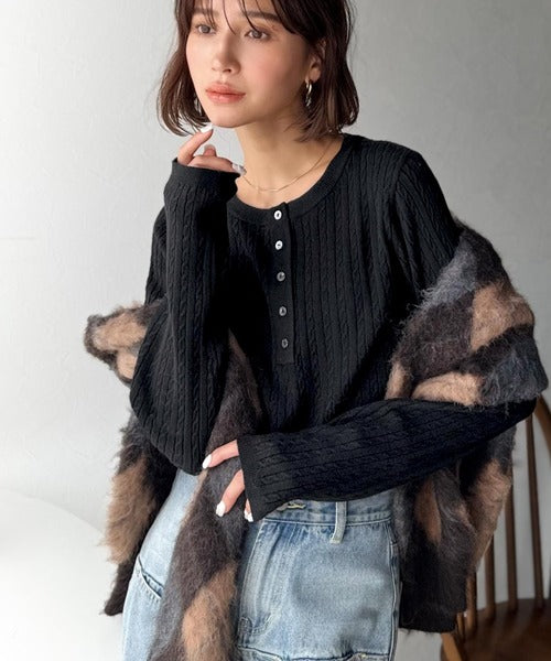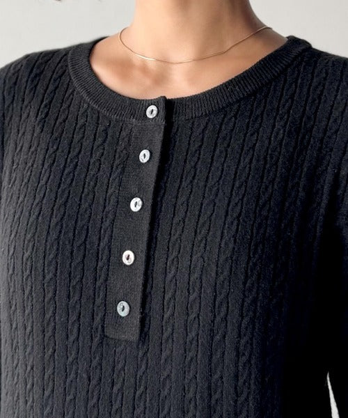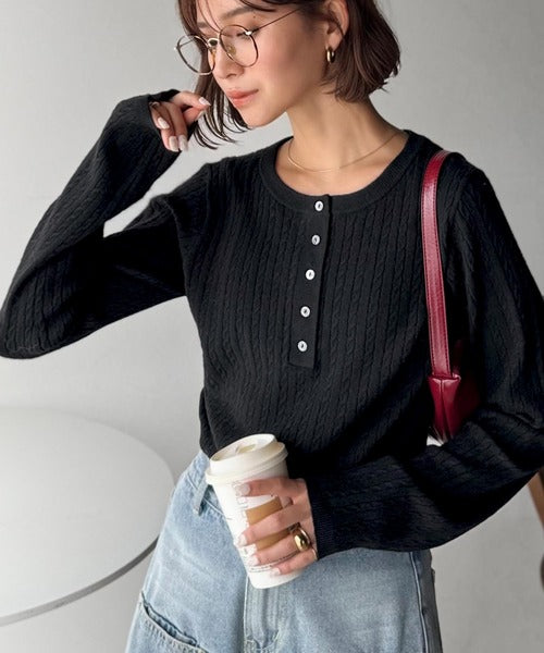 襟元のボタン使いがアクセントのミニケーブルヘンリーネックニット。