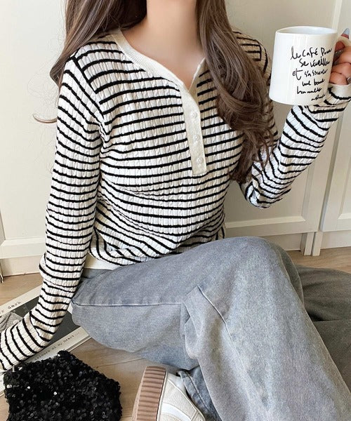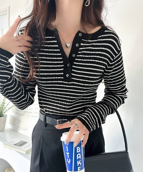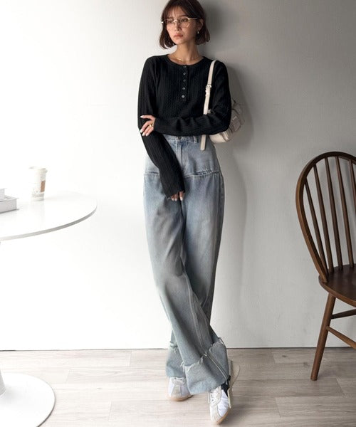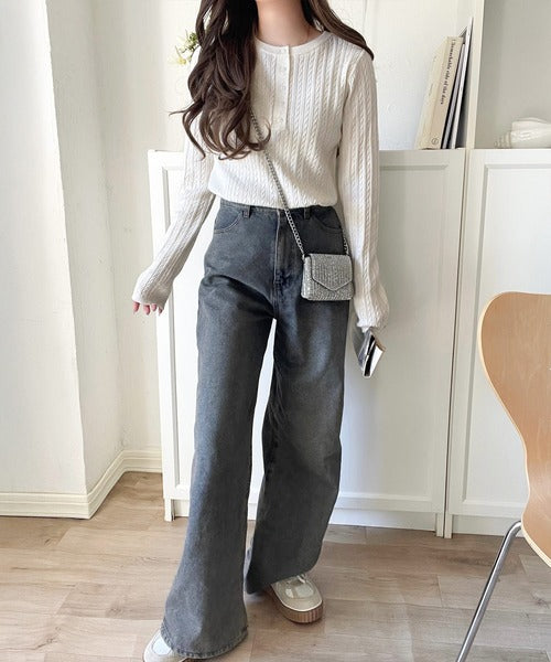 ミニケーブル編みのヘンリーネックニットは、スッキリとしたシルエットで着こなせます◎