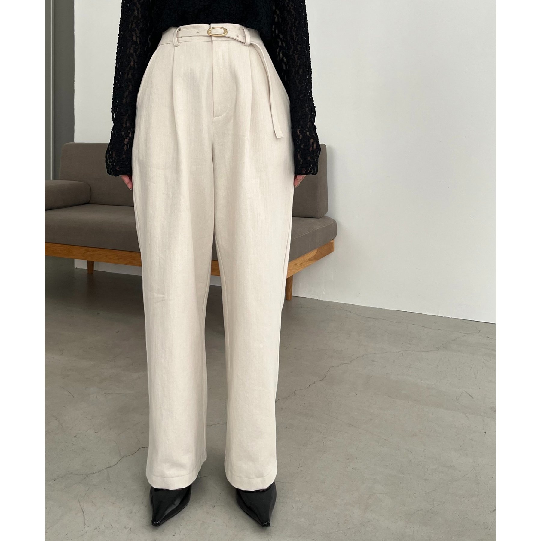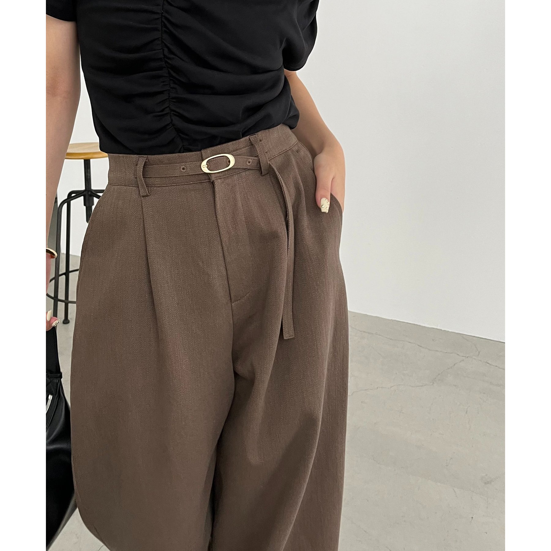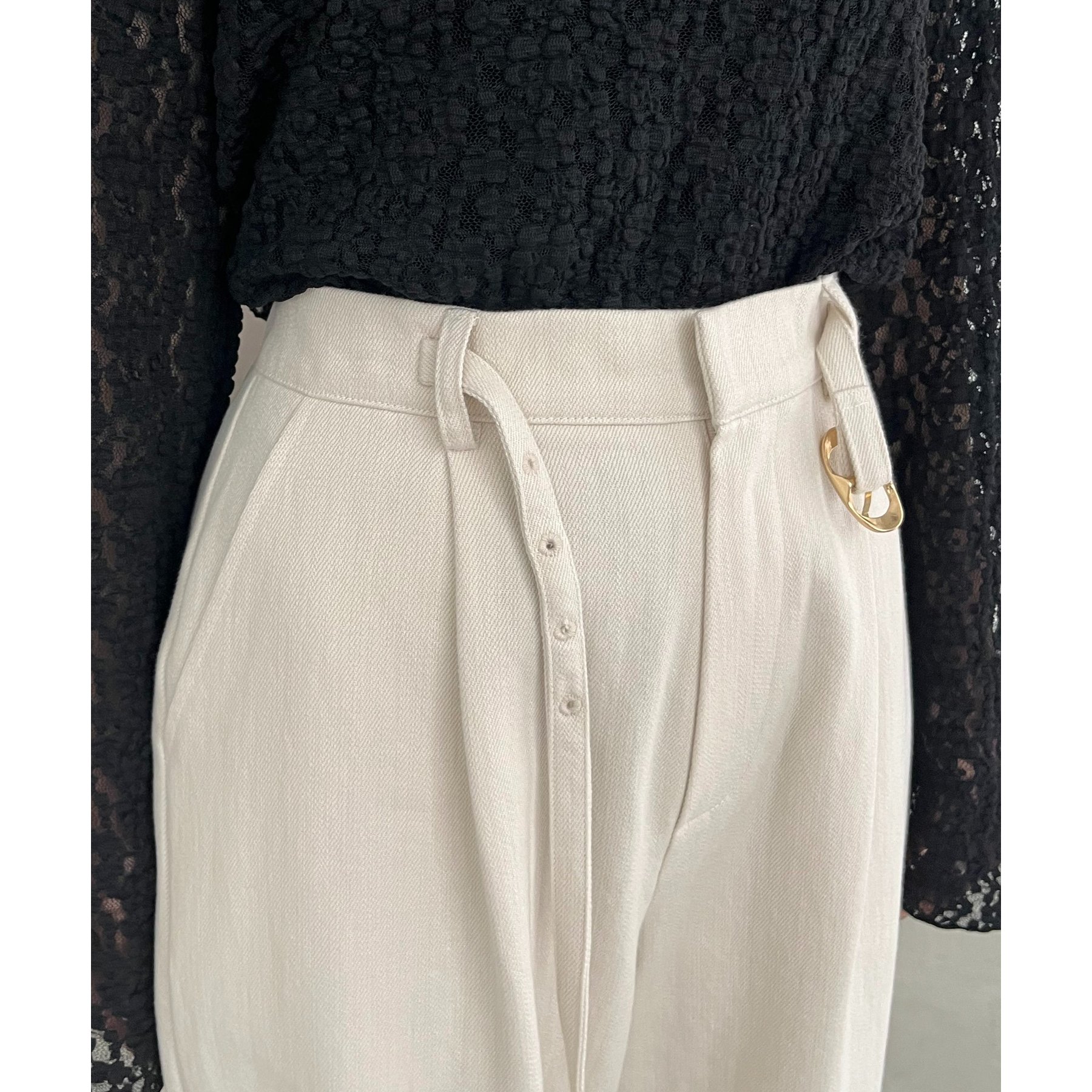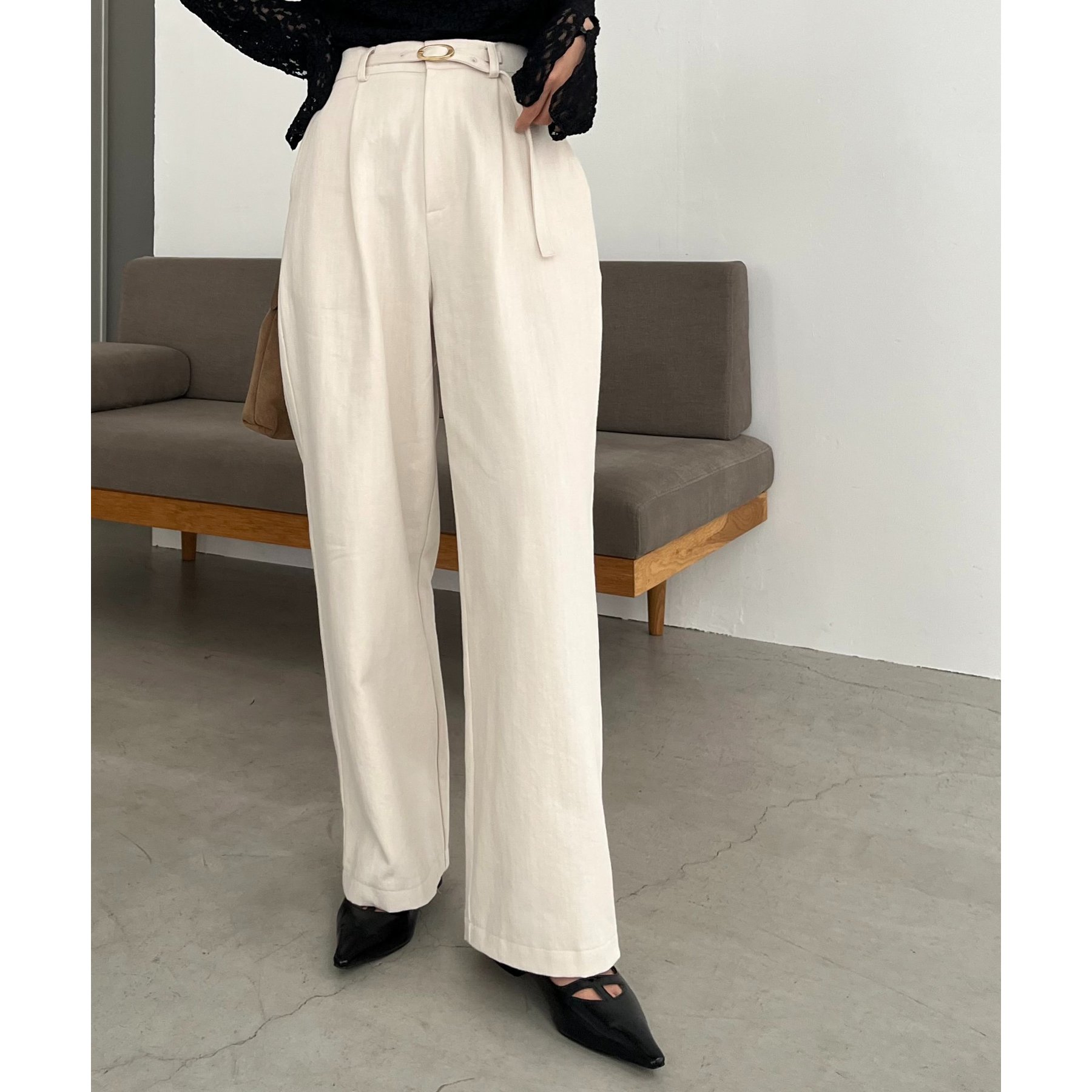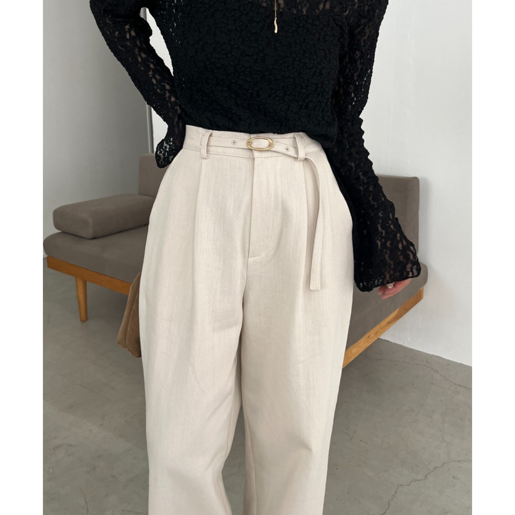 ゴールドバックルの細ベルトがビンテージライクな今年らしいパンツ