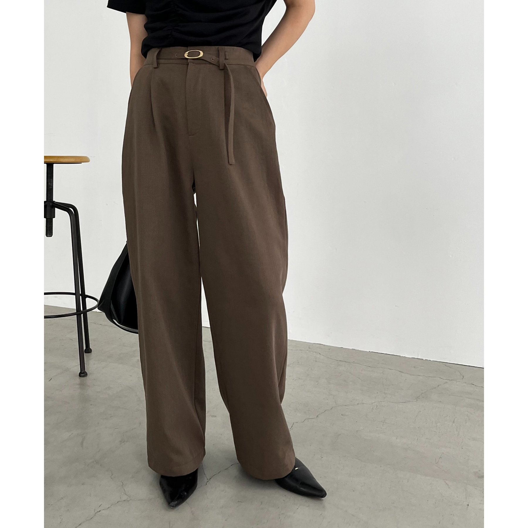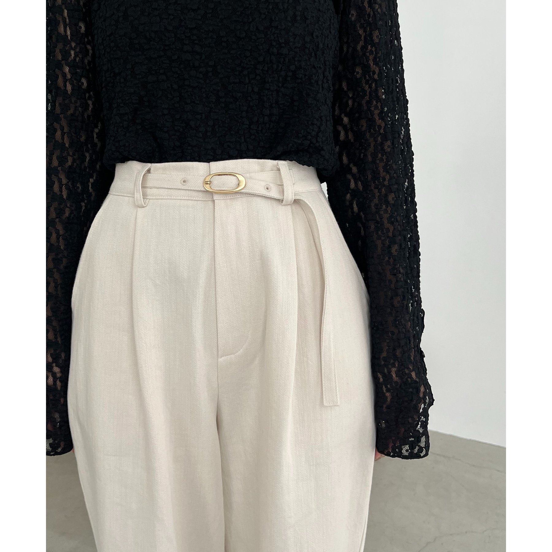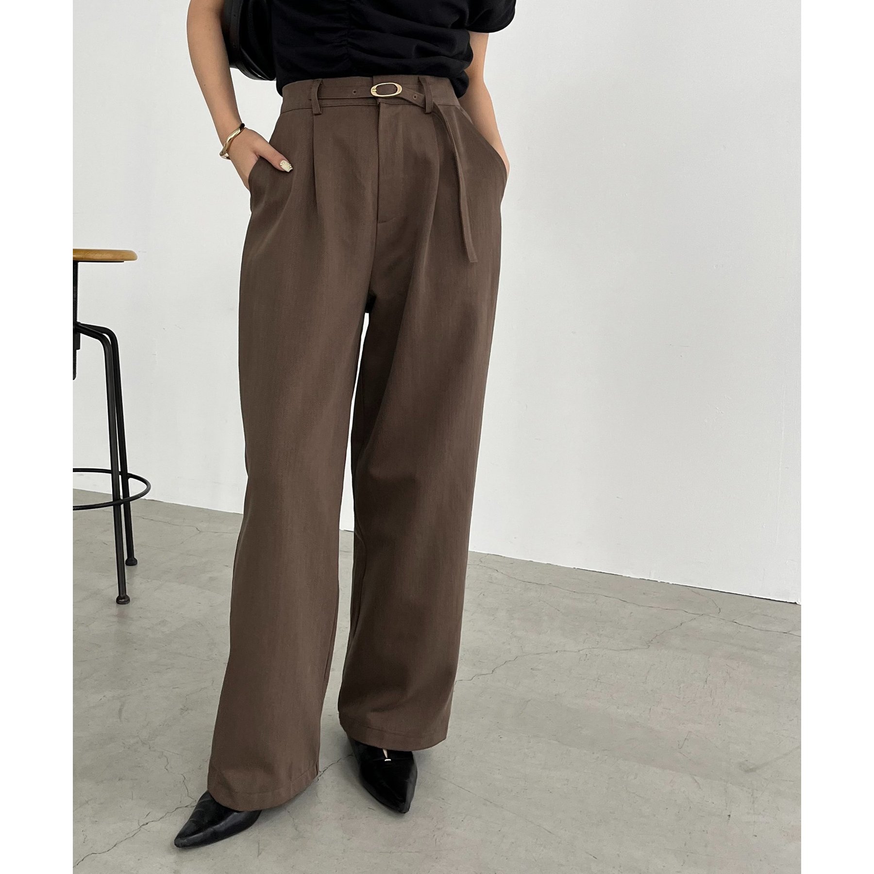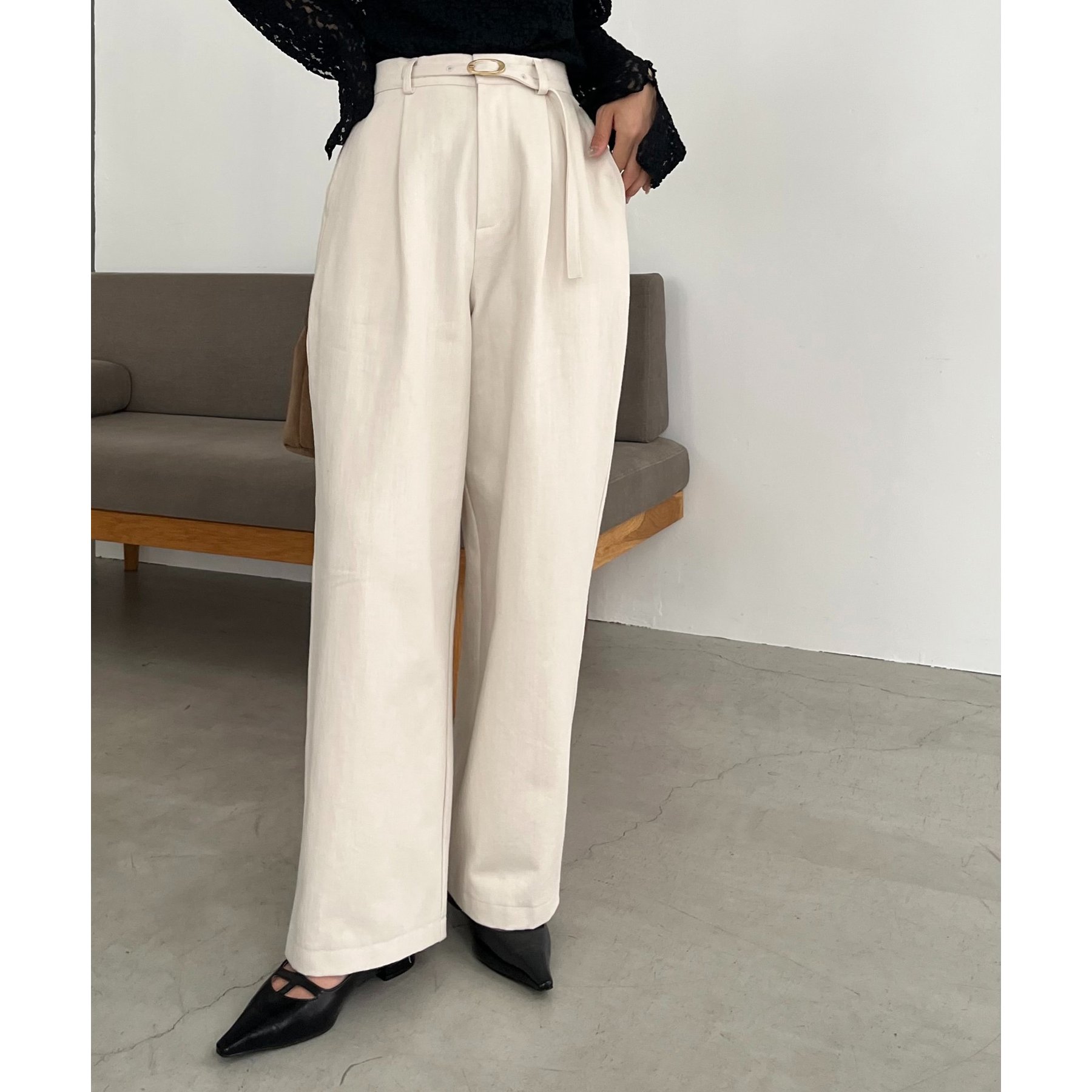 ゴールドバックルの細ベルトがビンテージライクな今年らしいパンツ