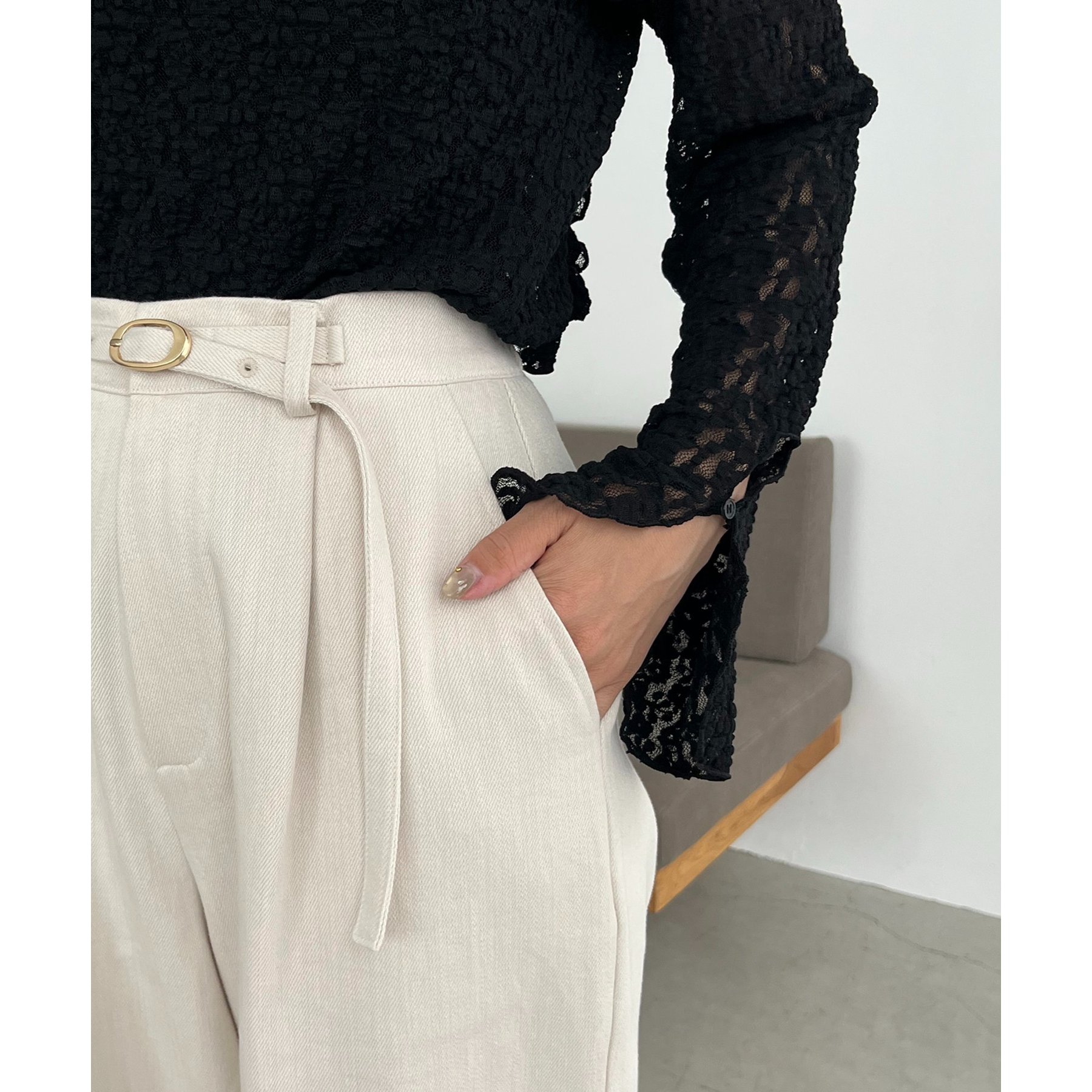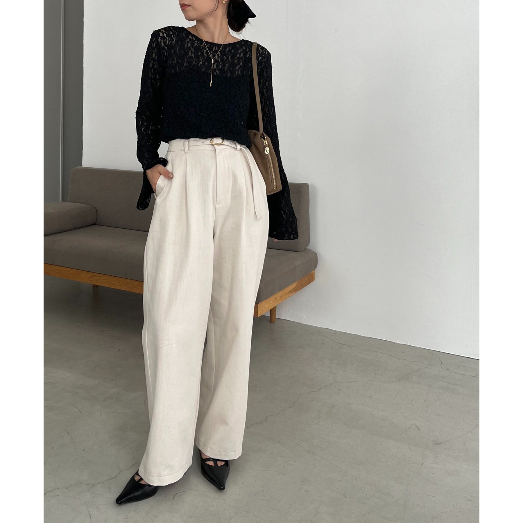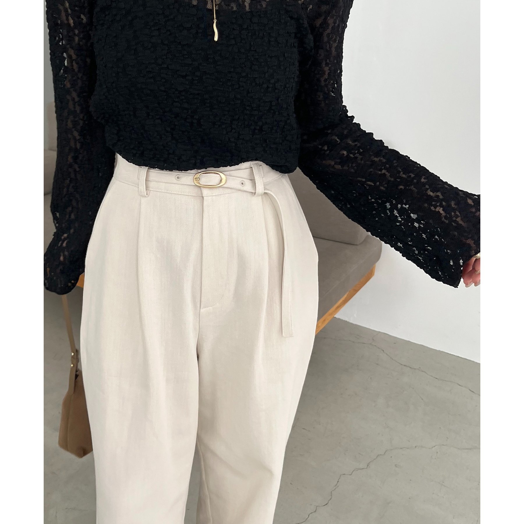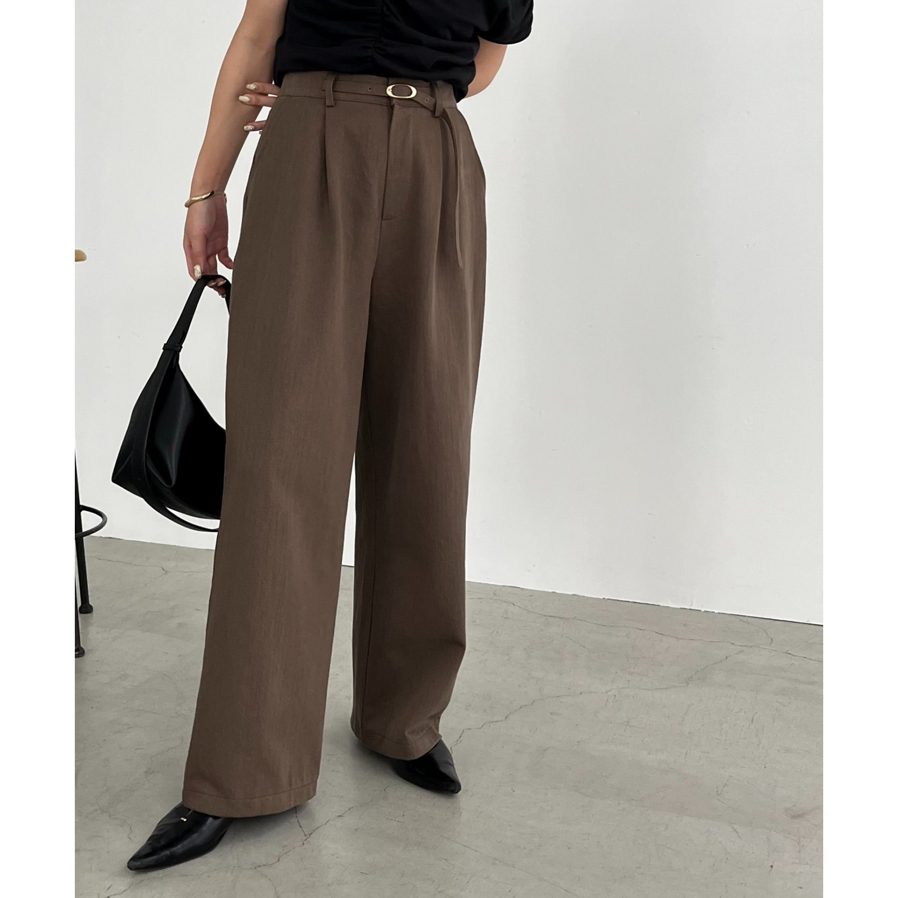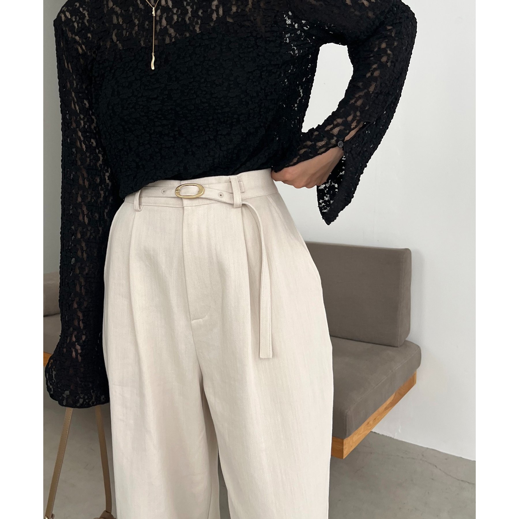 ゴールドバックルの細ベルトがビンテージライクな今年らしいパンツ