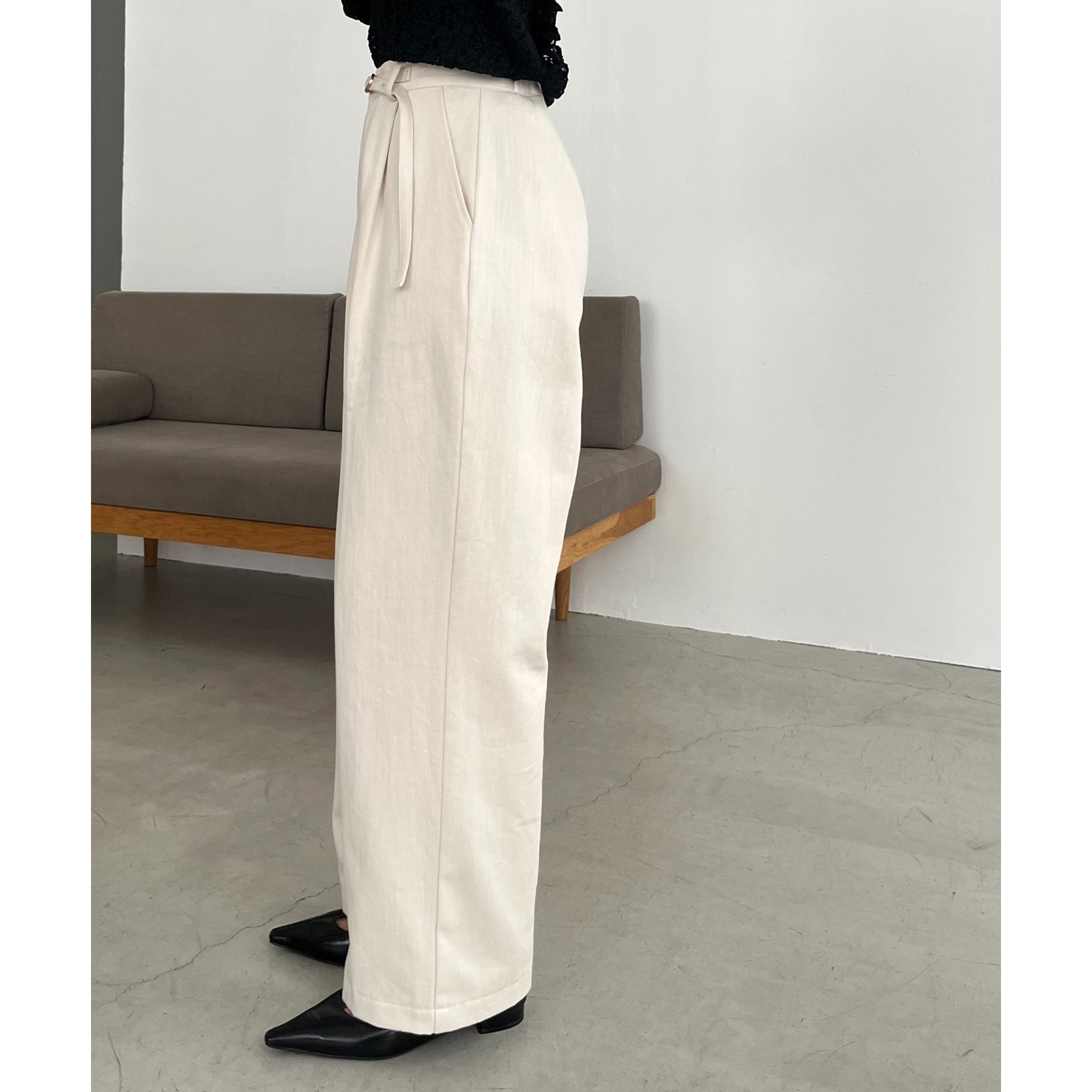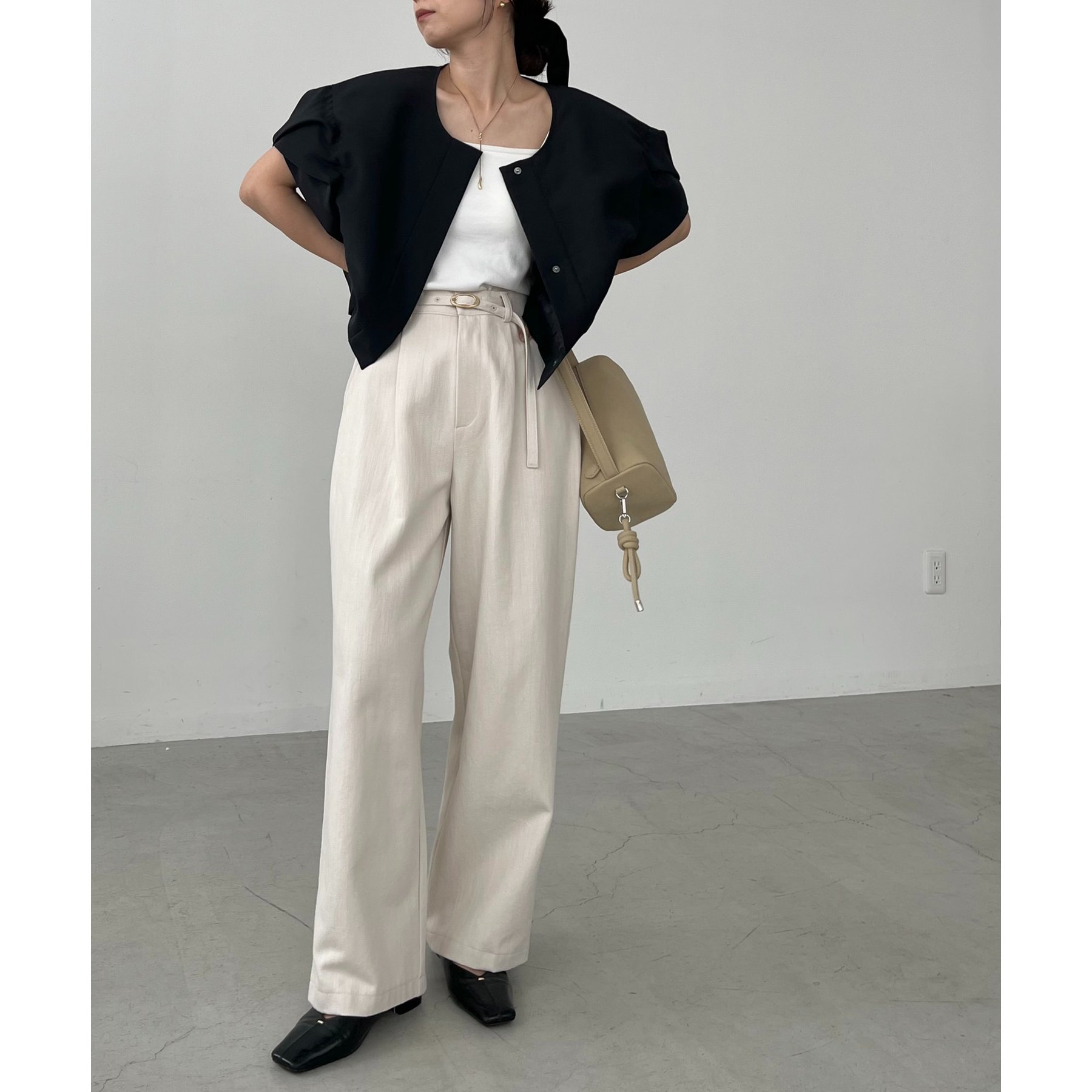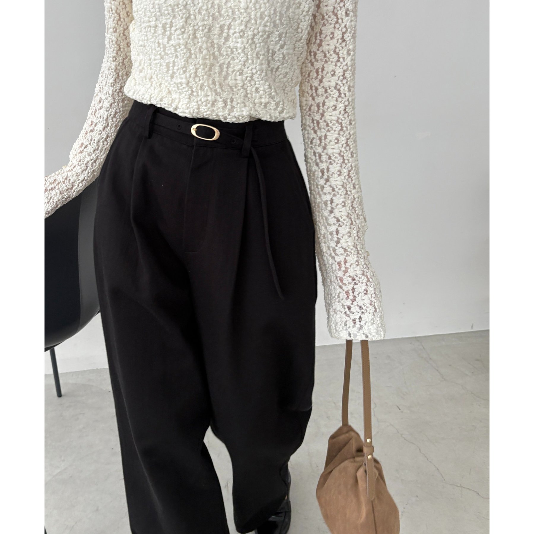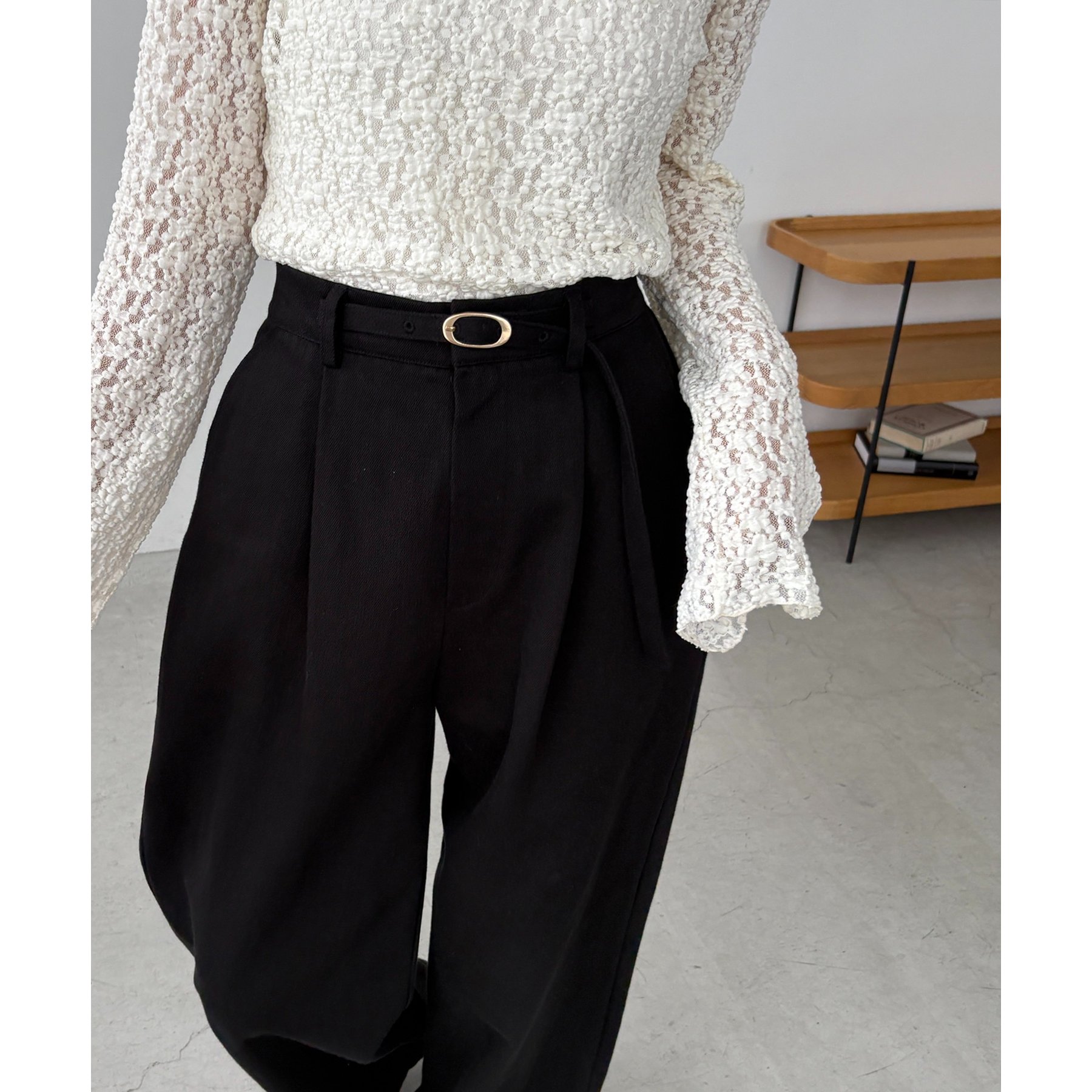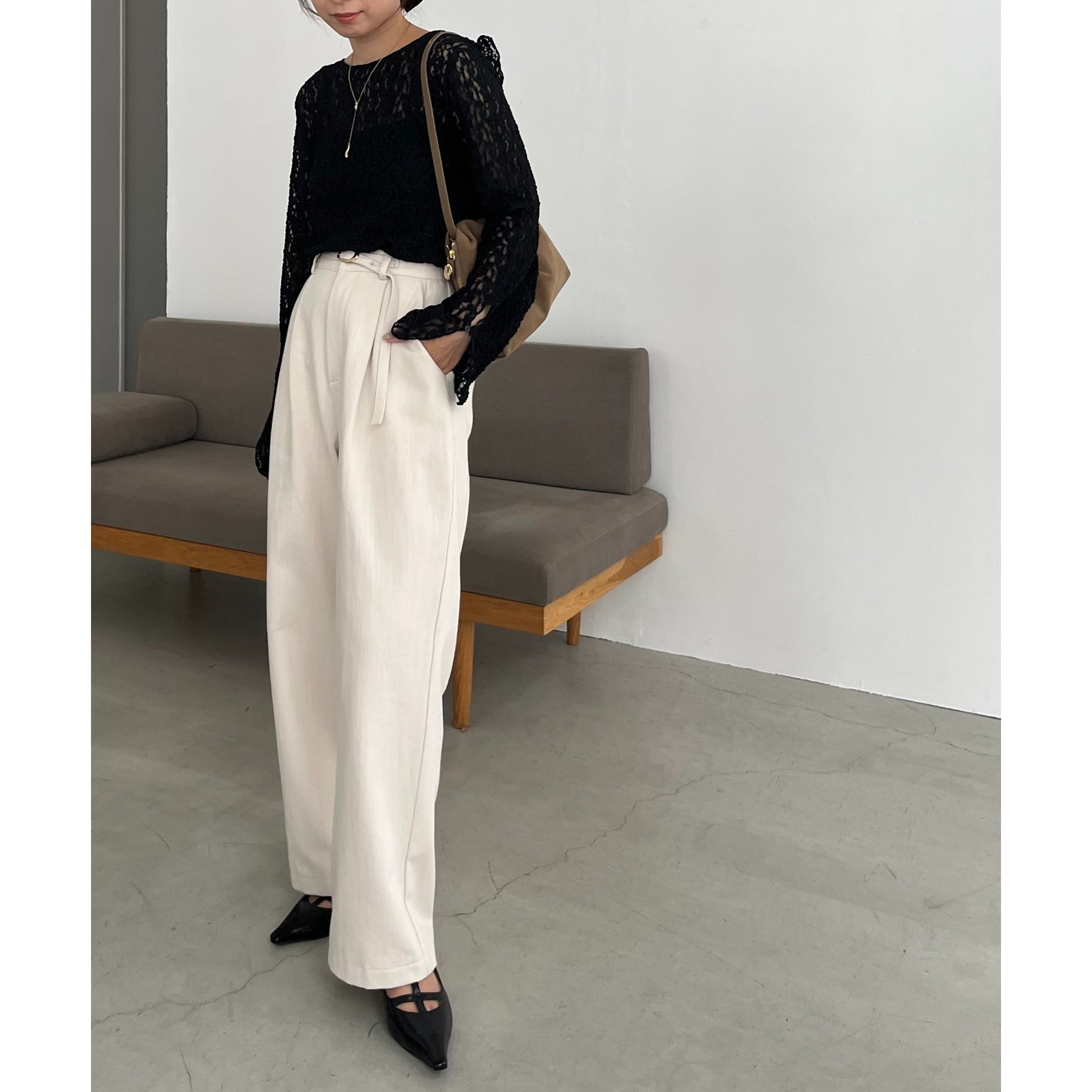 ゴールドバックルの細ベルトがビンテージライクな今年らしいパンツ