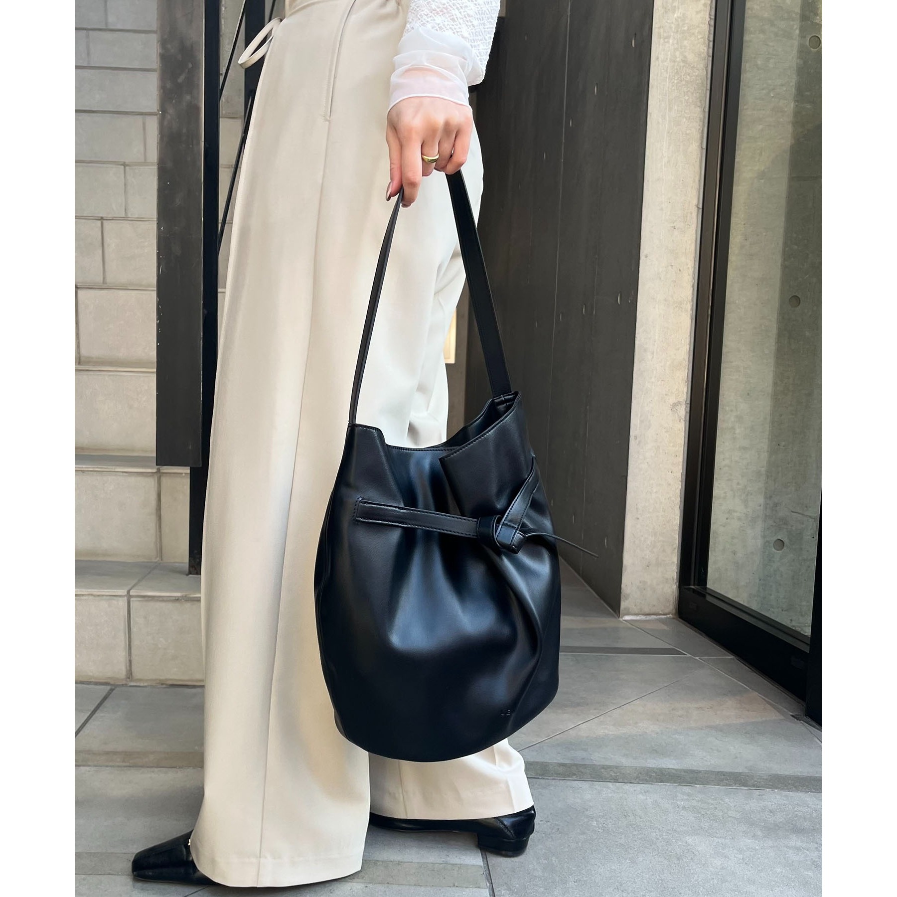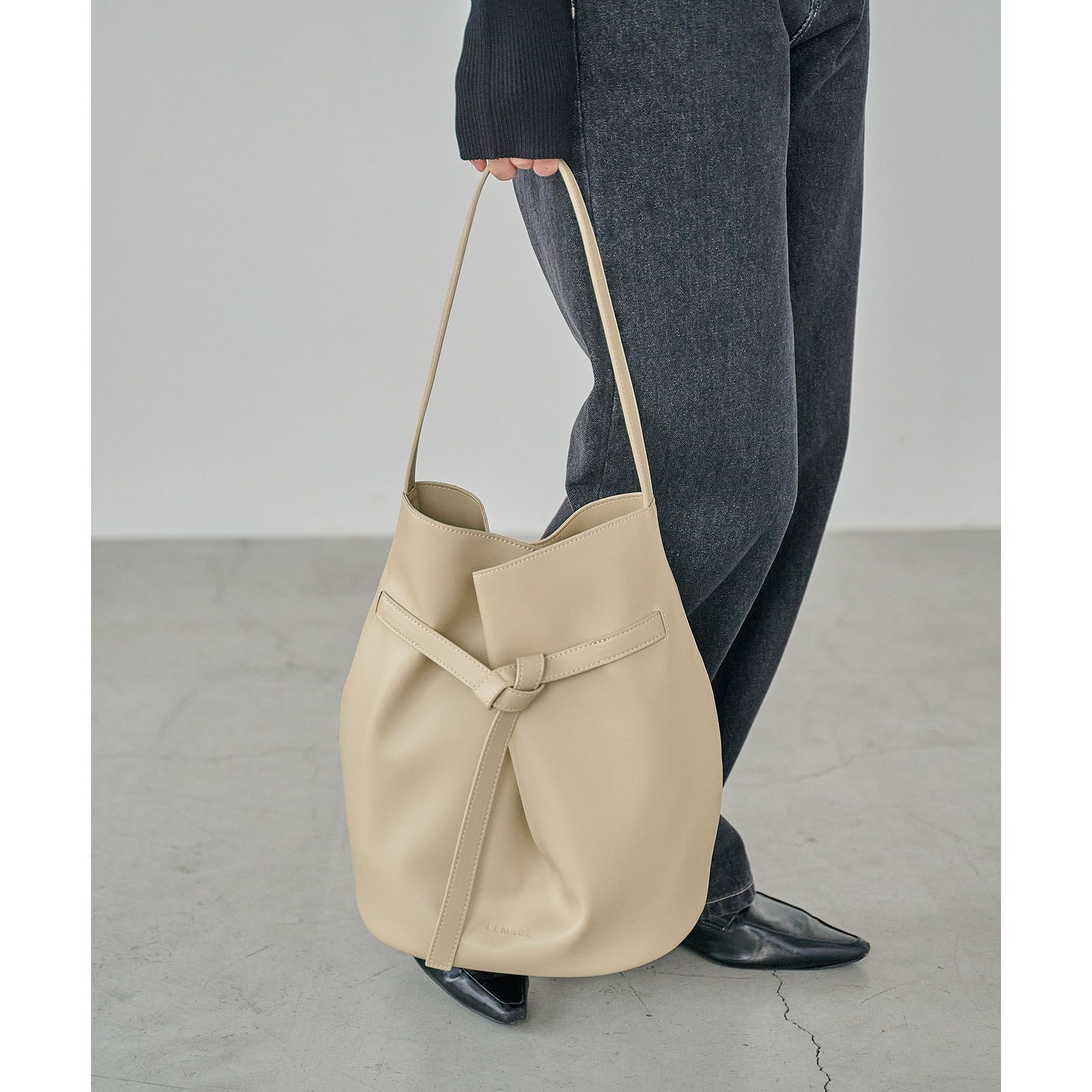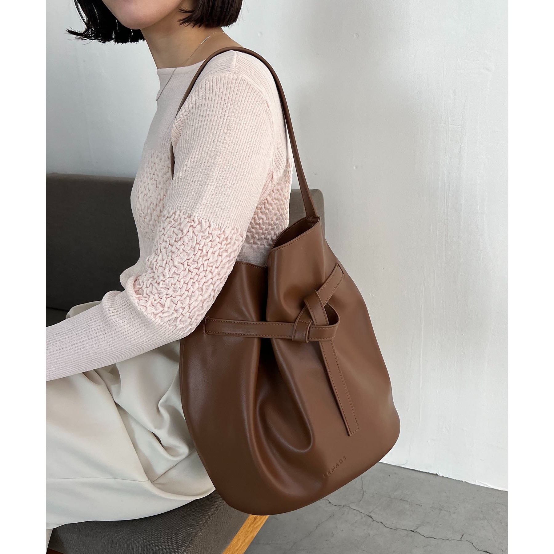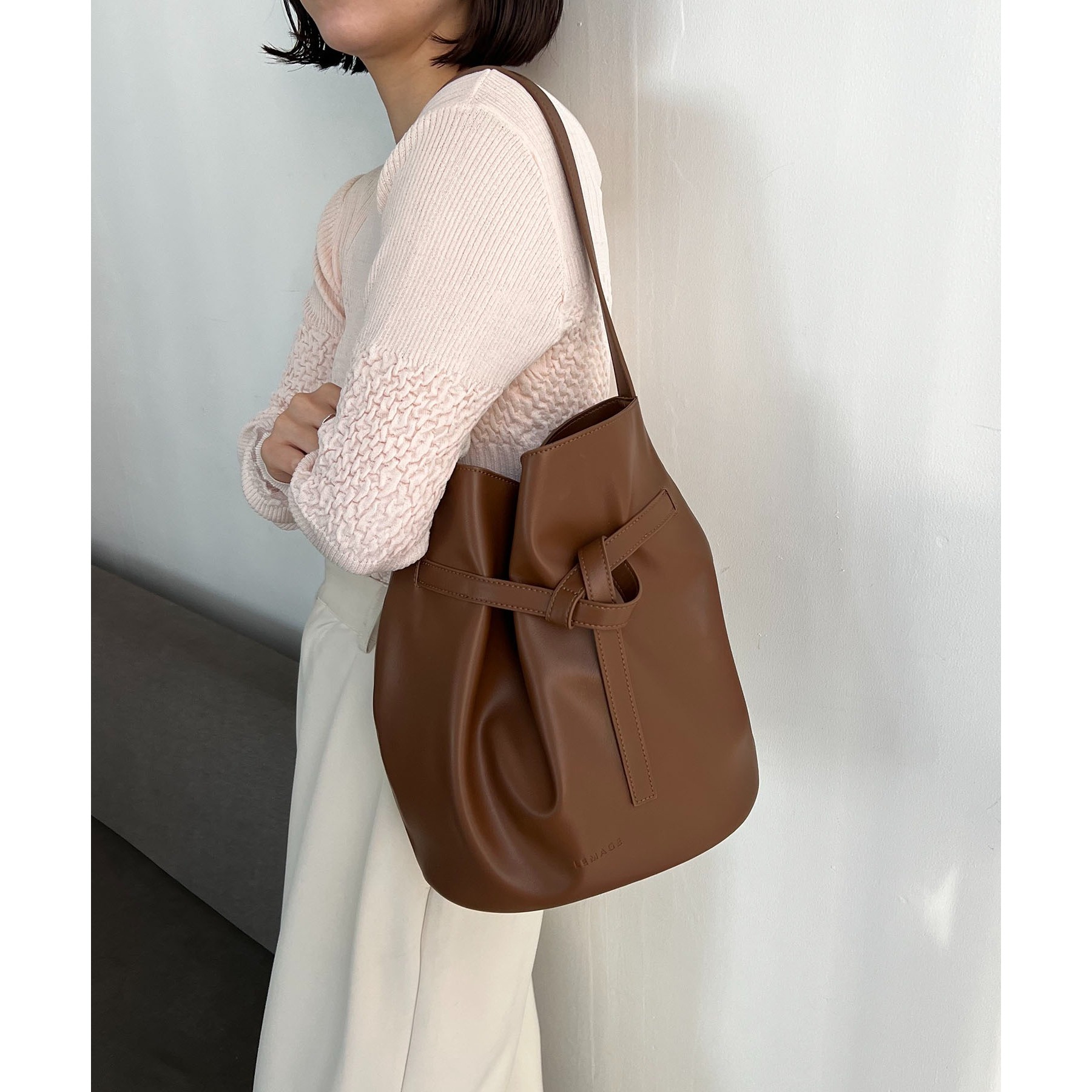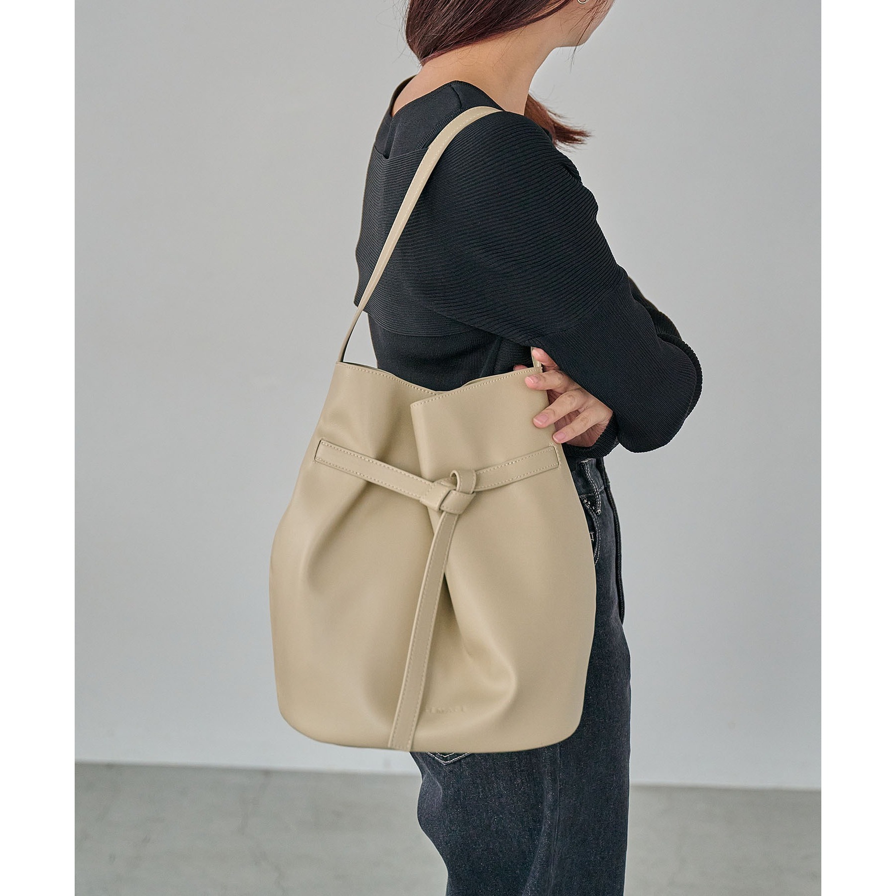 フロントでキュッと結ばれたベルトのデザインで立体感のあるバケツ型バッグ