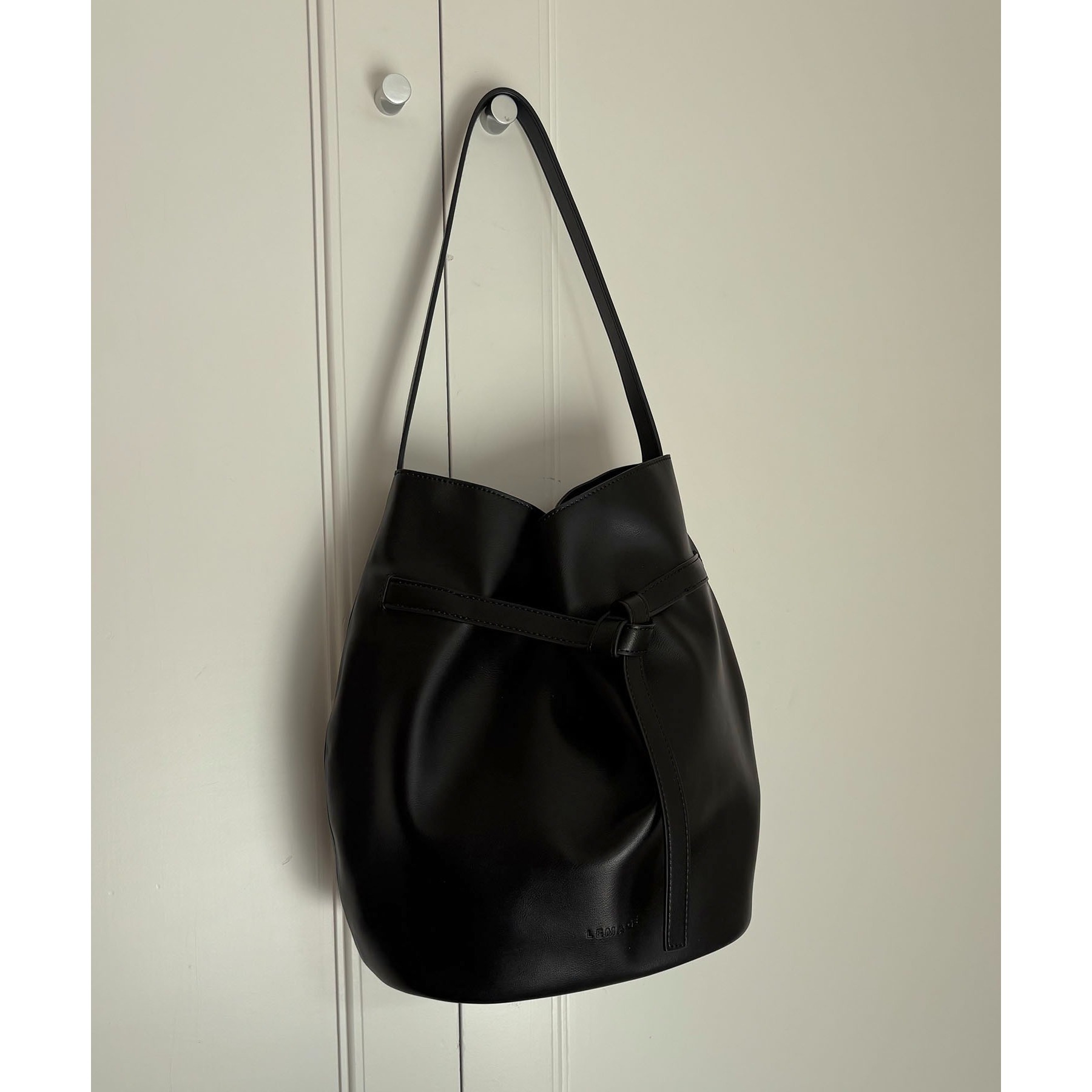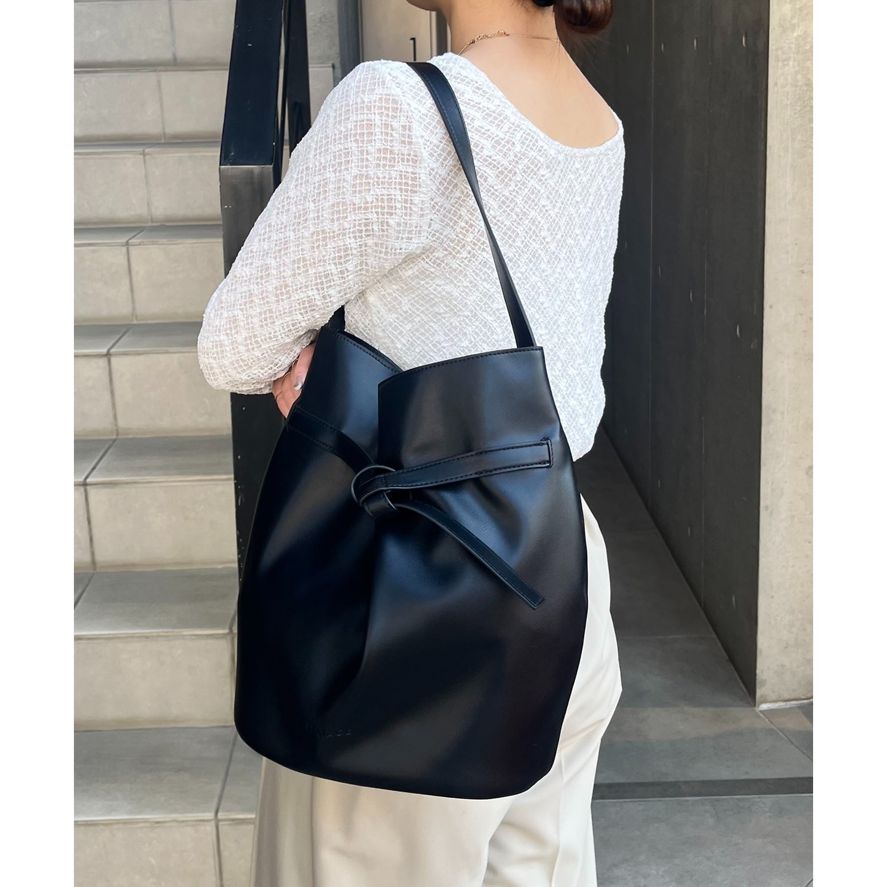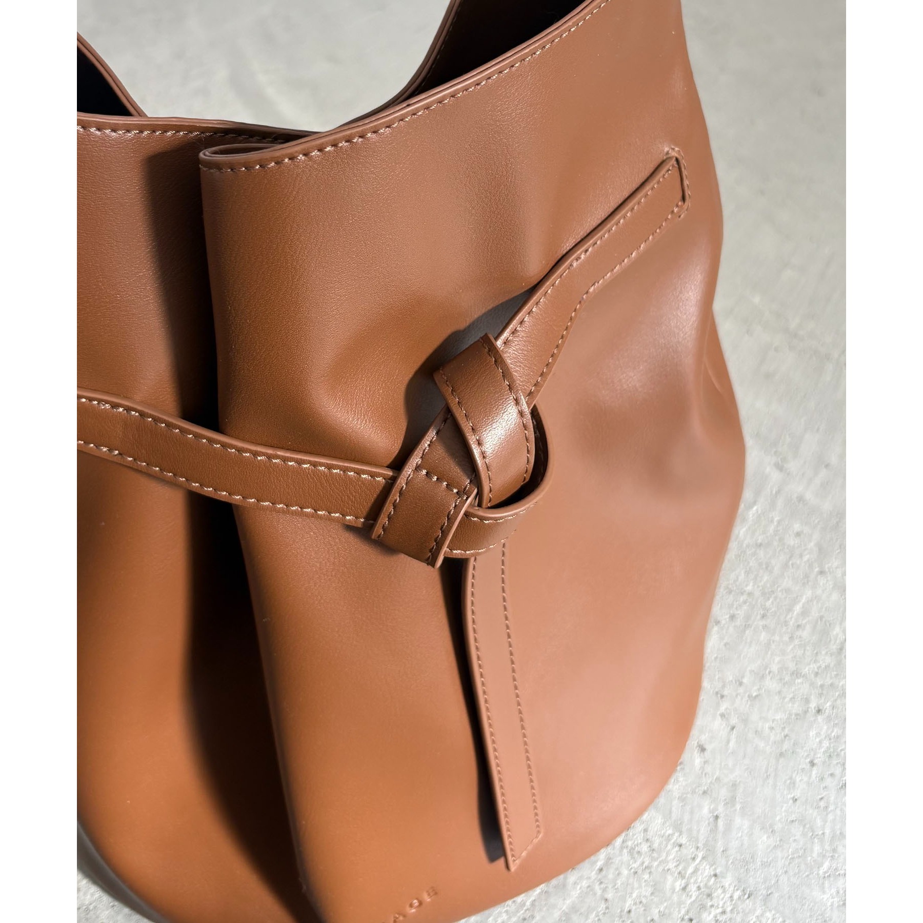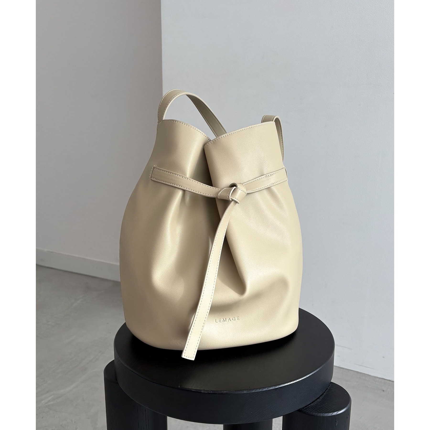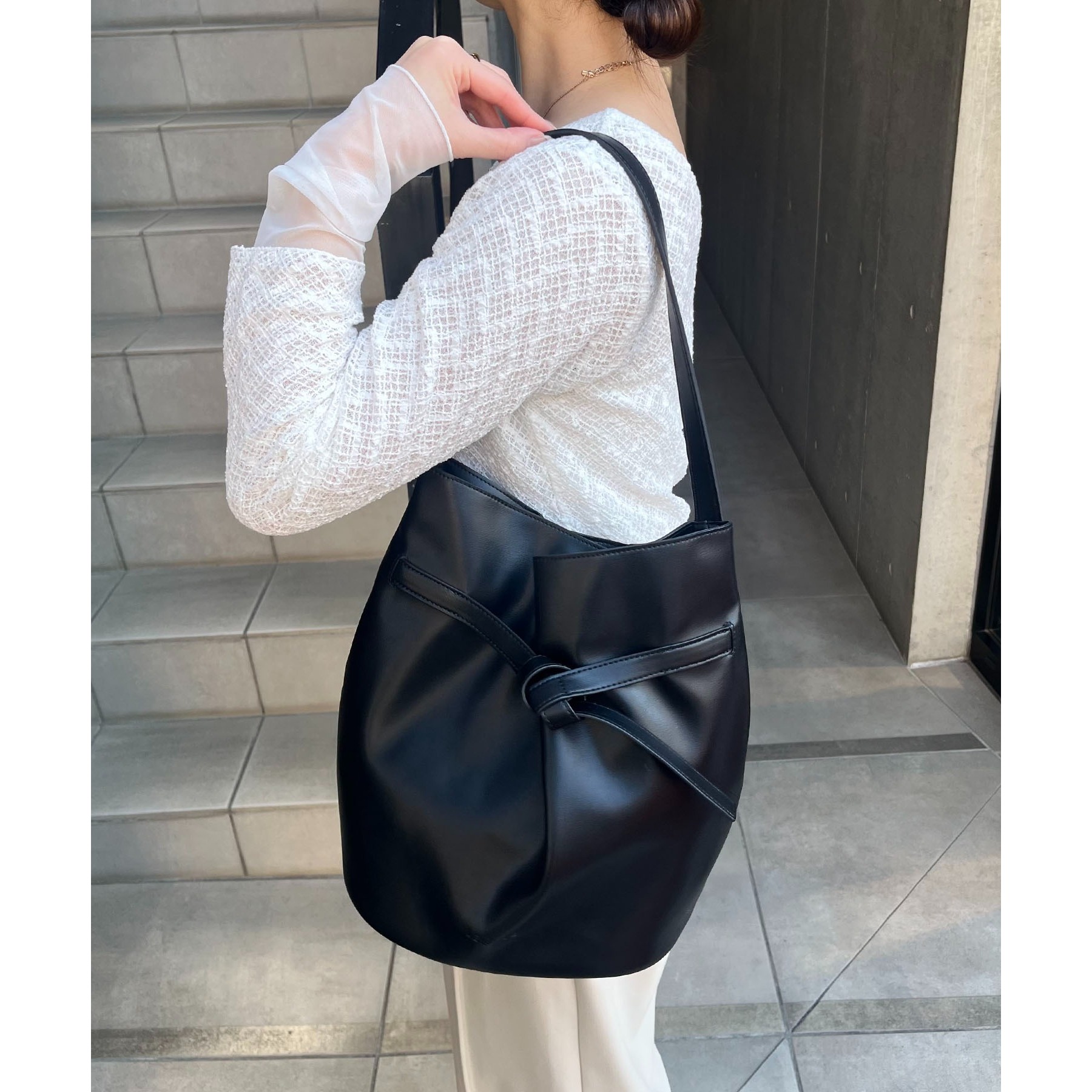 フロントでキュッと結ばれたベルトのデザインで立体感のあるバケツ型バッグ
