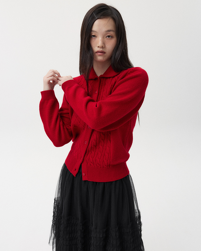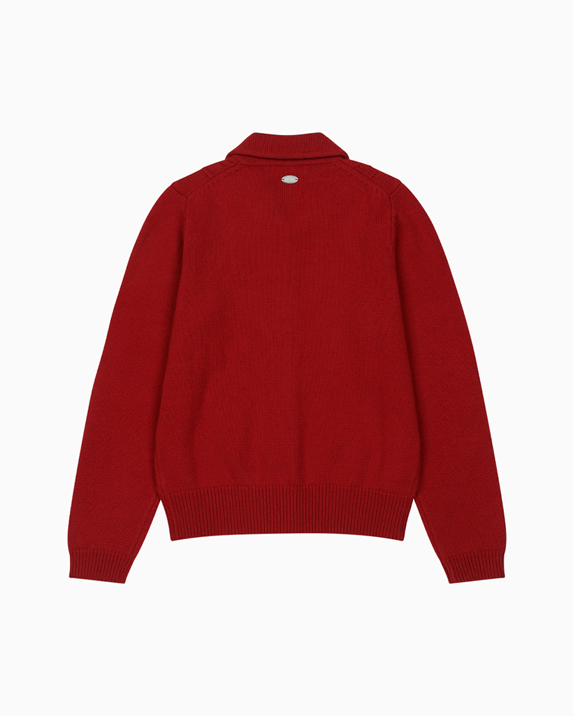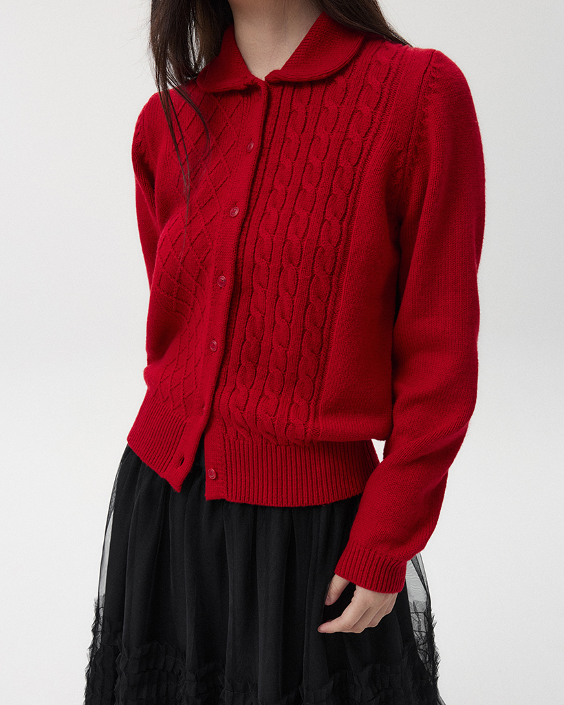 ROUND COLLAR JACQUARD CARDIGAN, RED