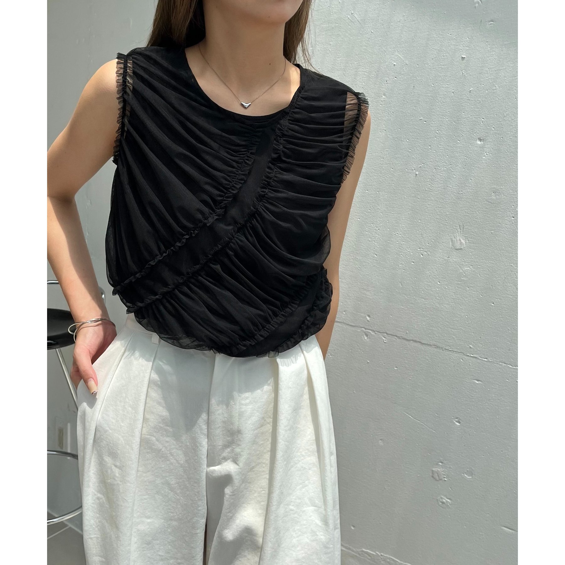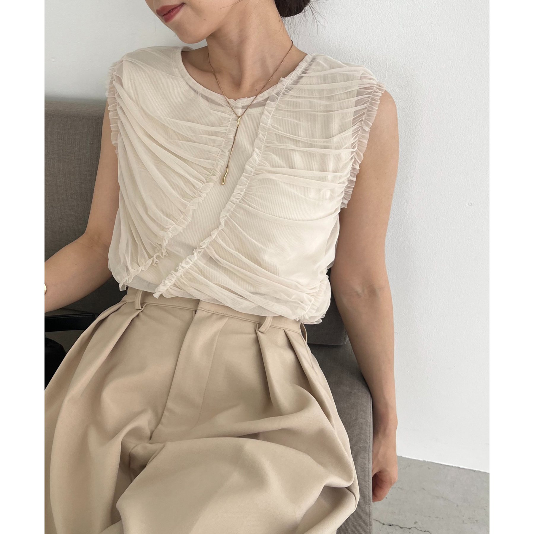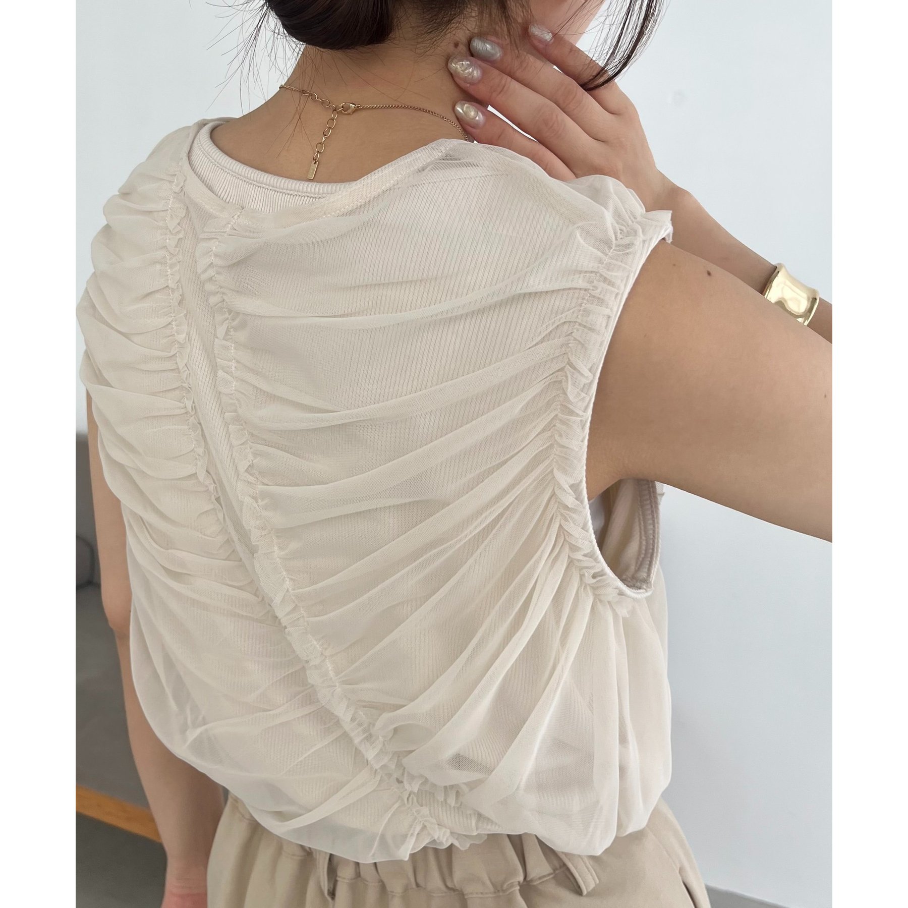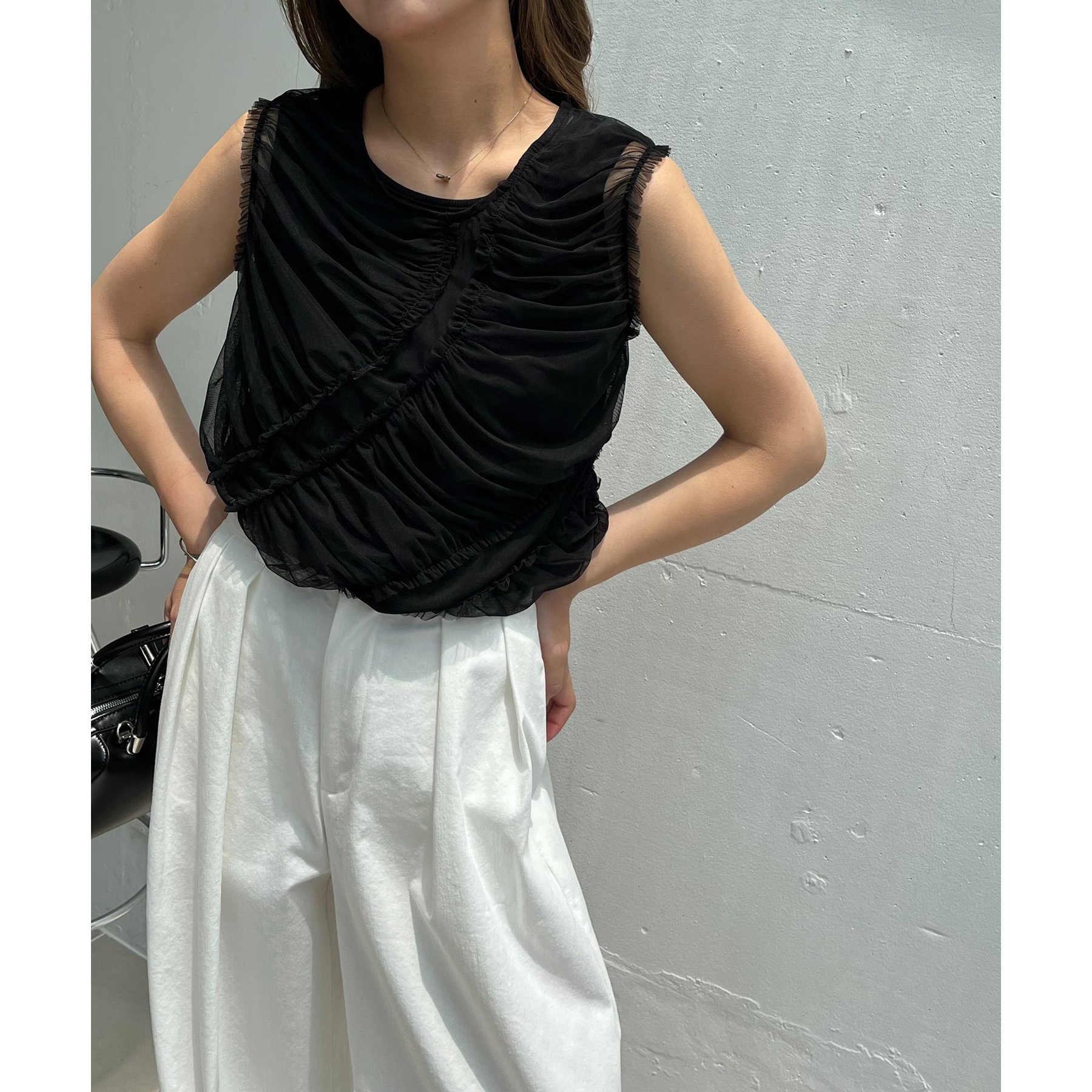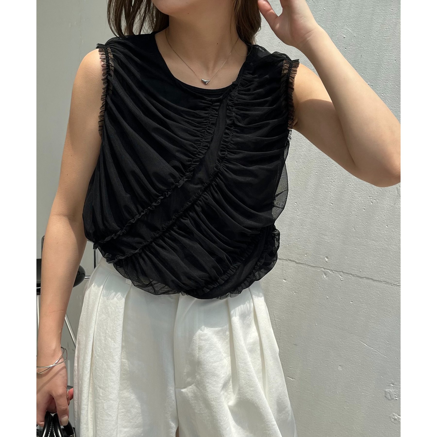 チュール素材にたっぷりとギャザーを入れた着映えするデザイントップス