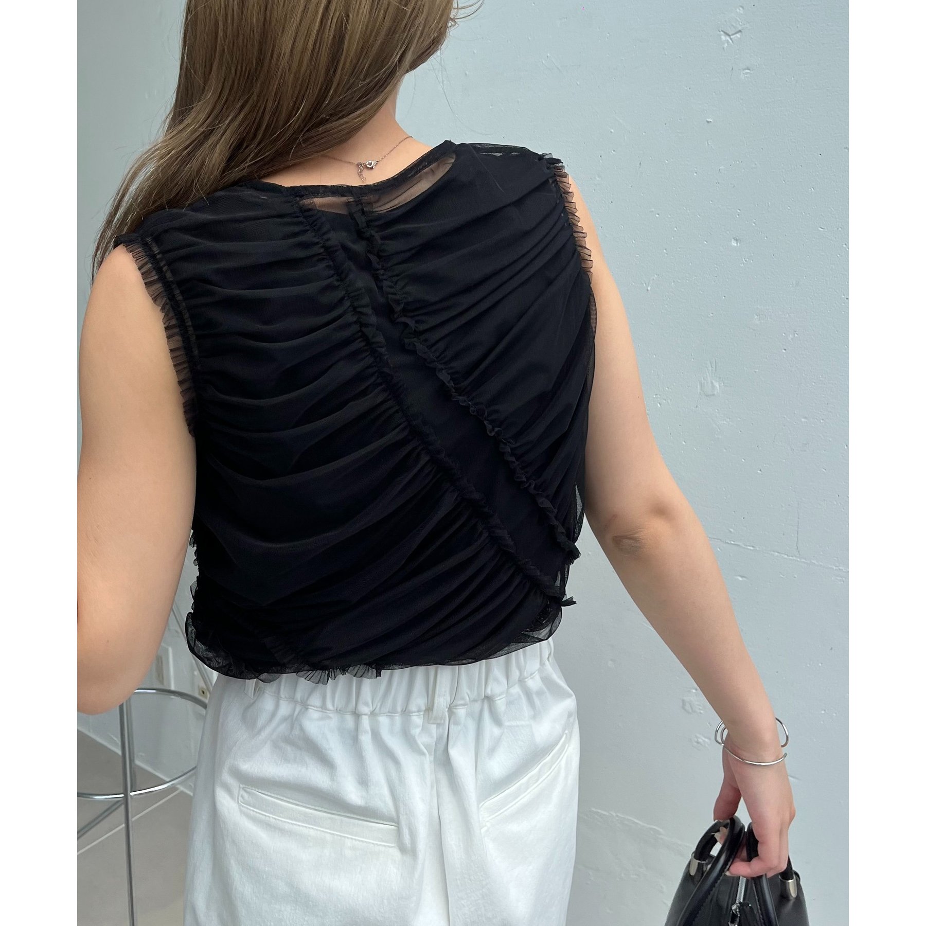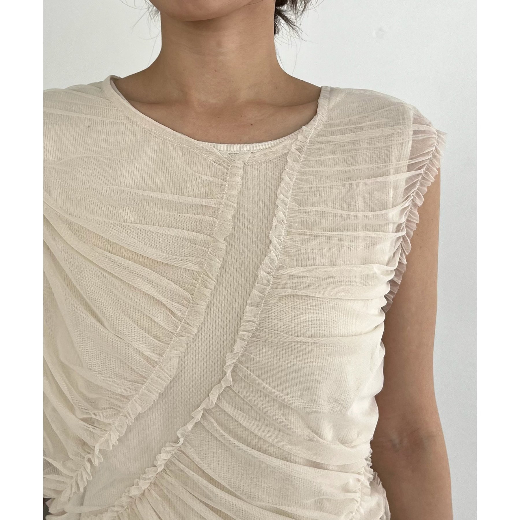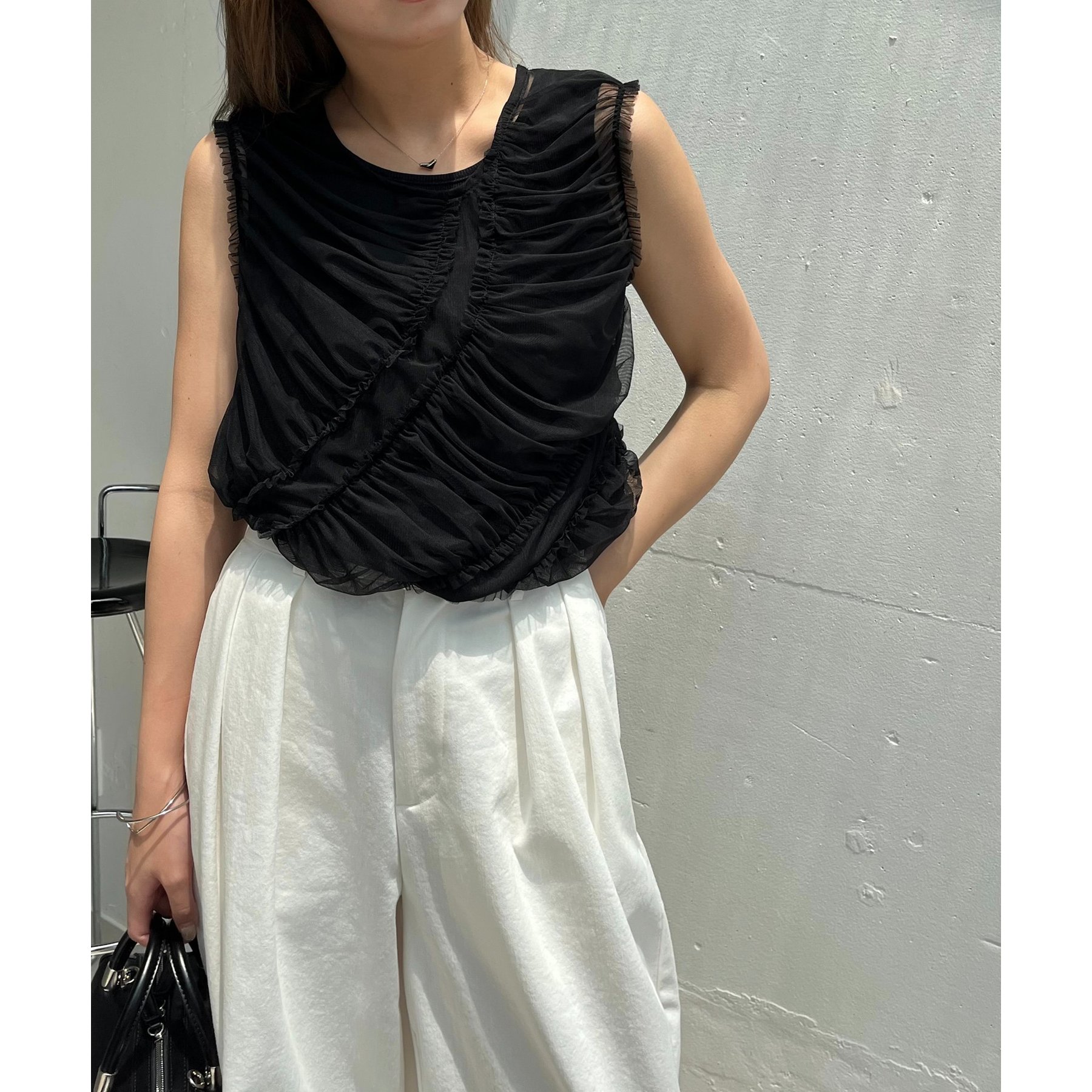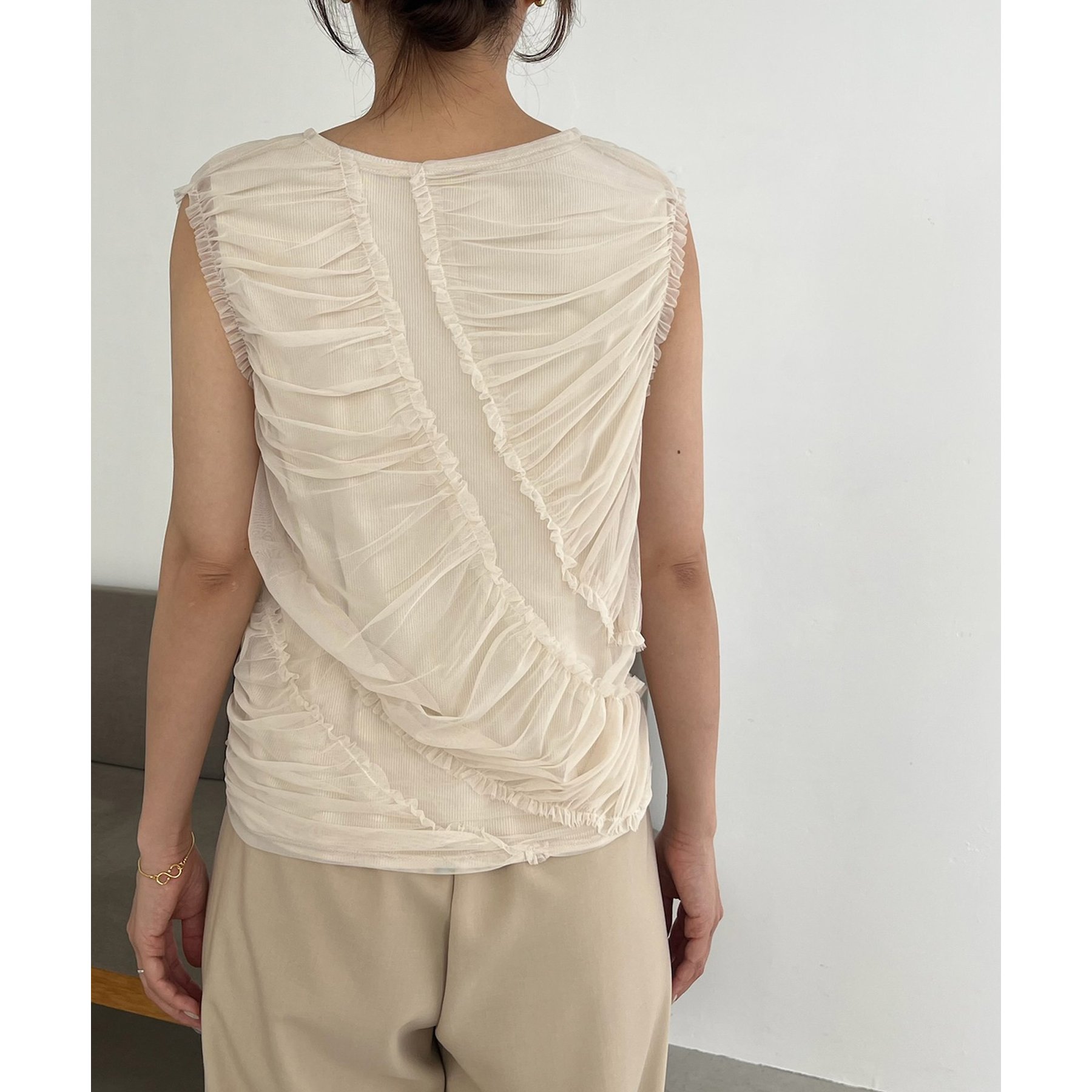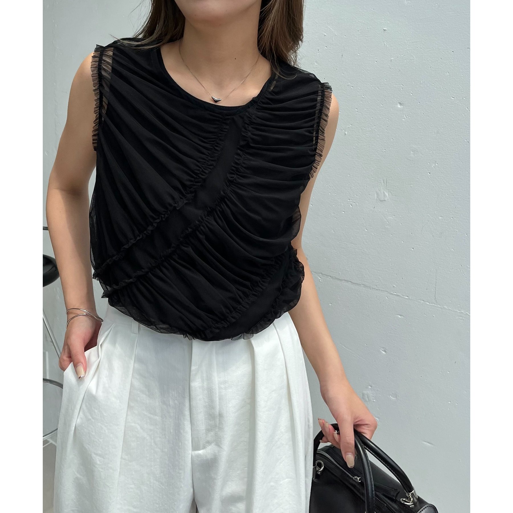 チュール素材にたっぷりとギャザーを入れた着映えするデザイントップス