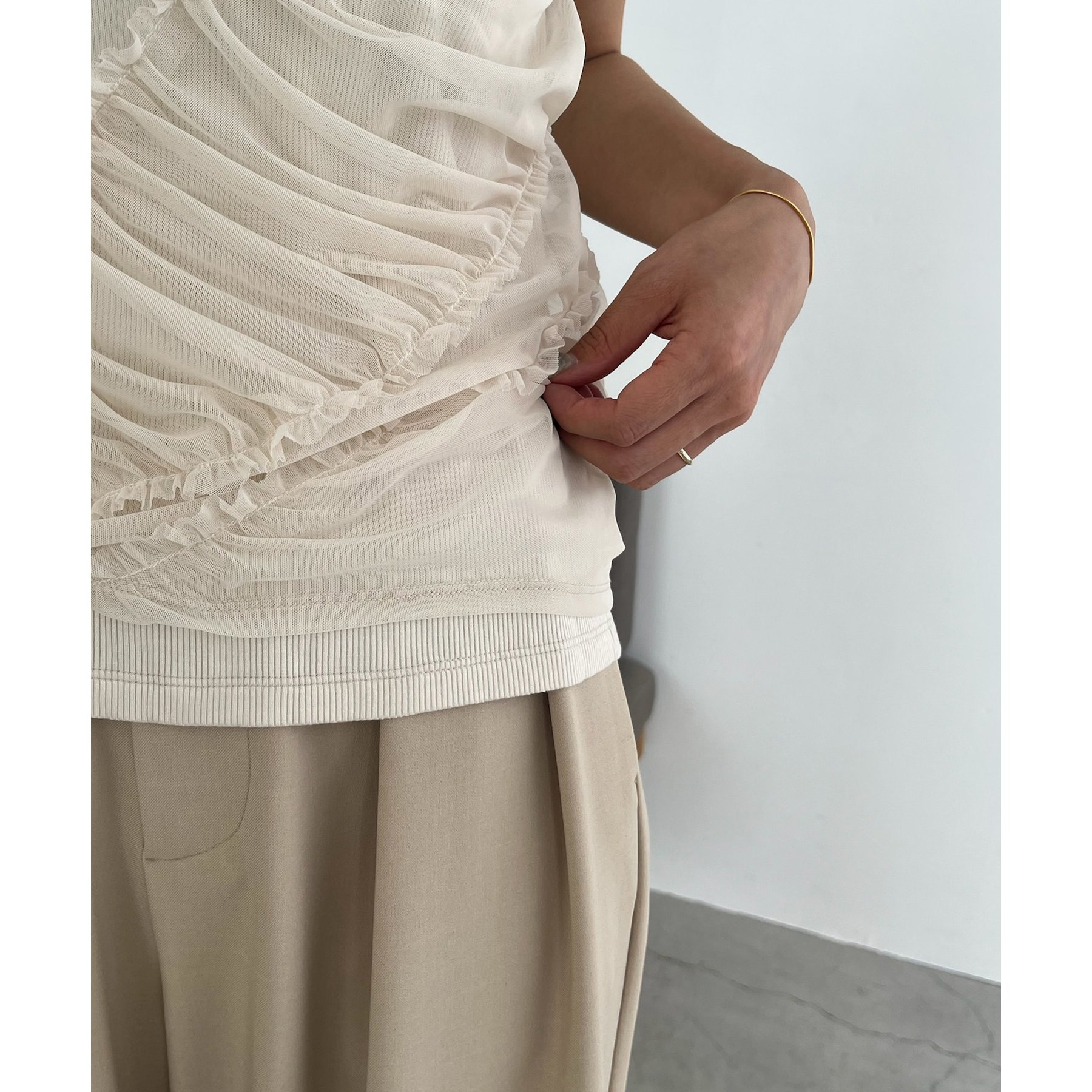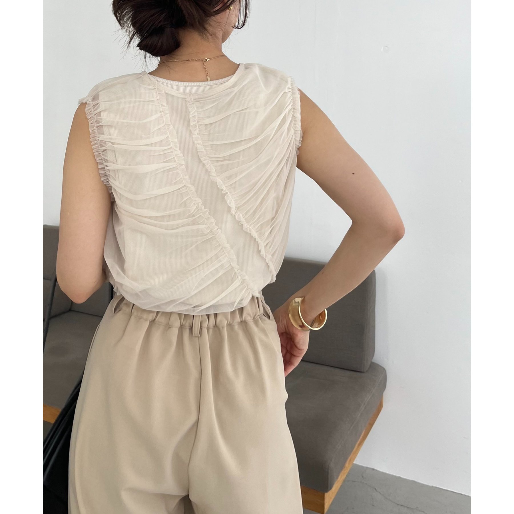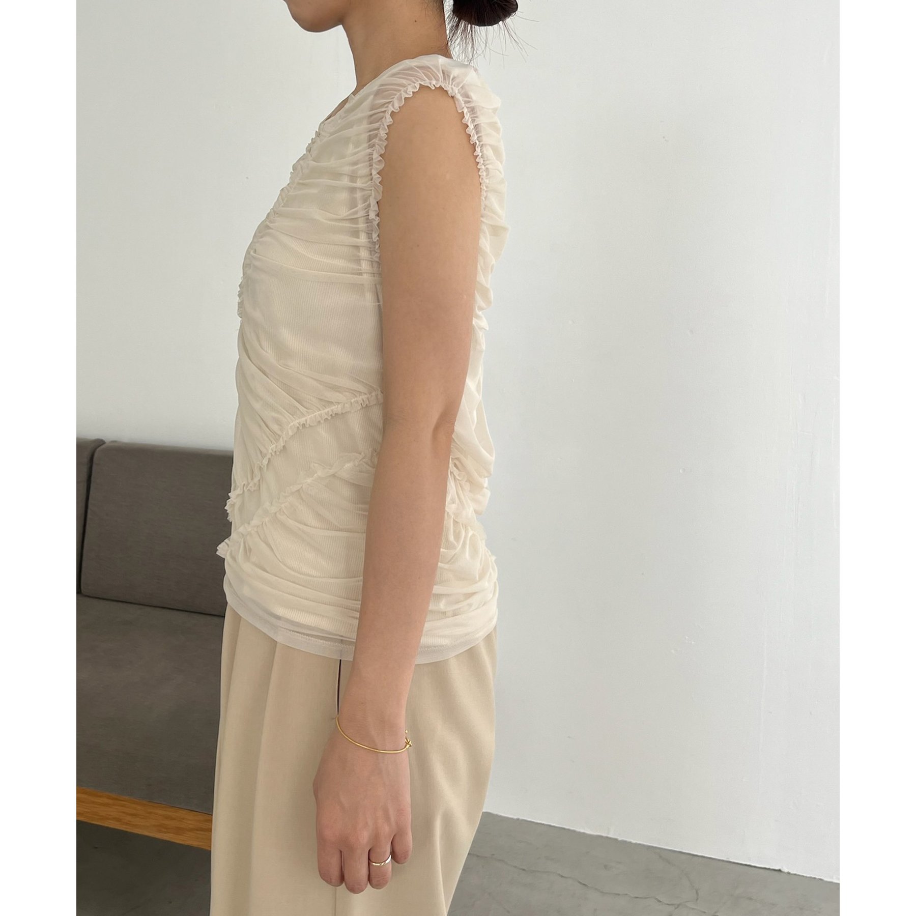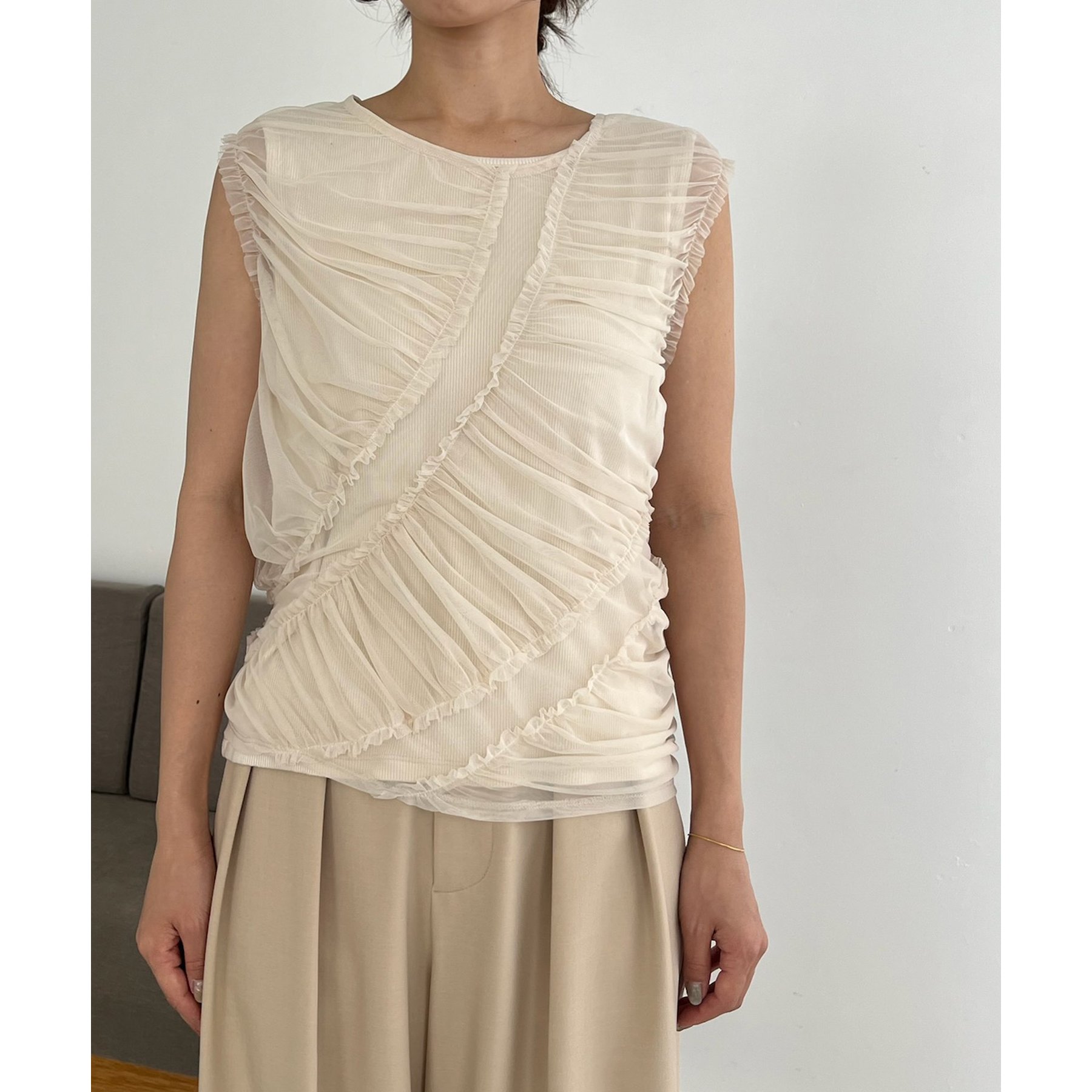 チュール素材にたっぷりとギャザーを入れた着映えするデザイントップス