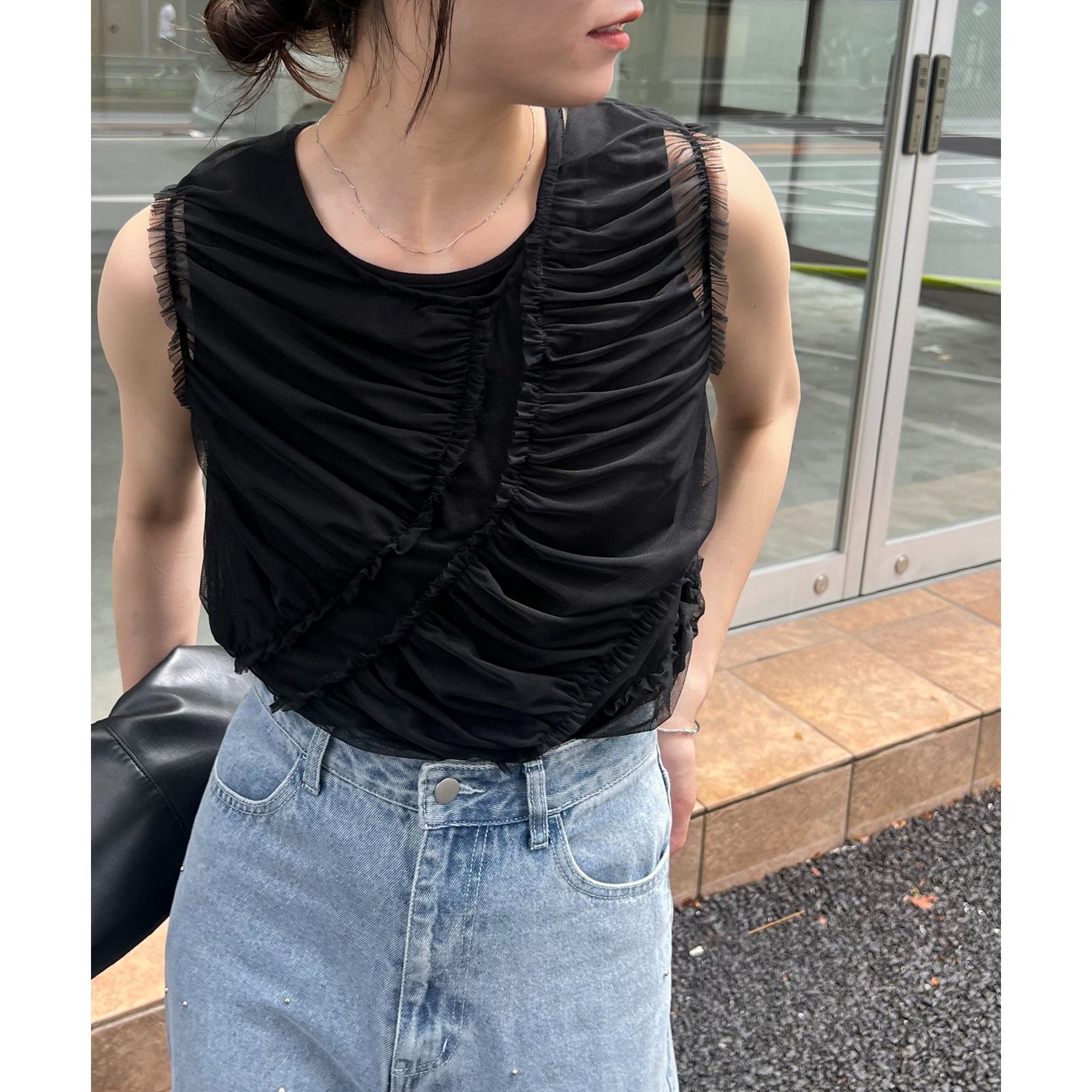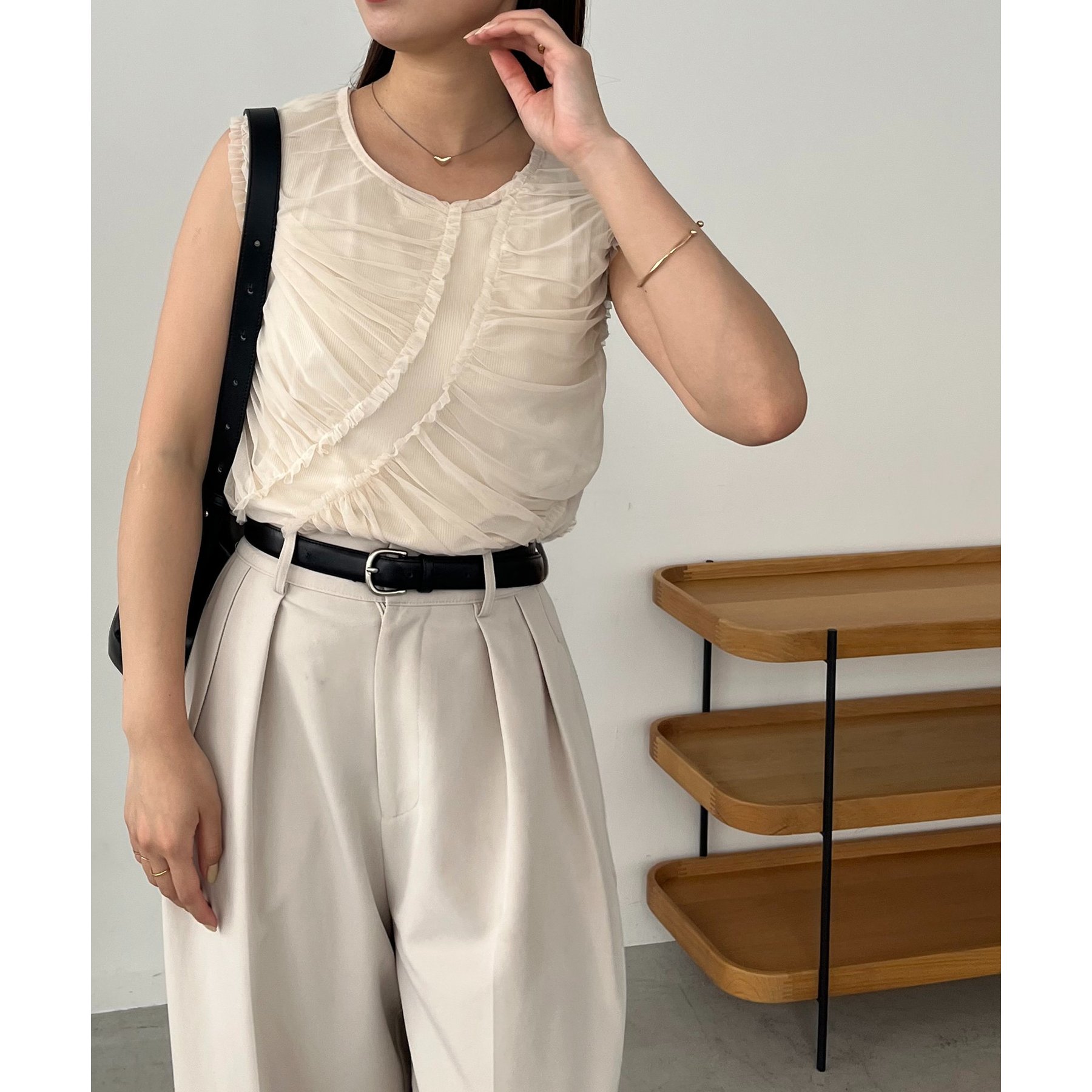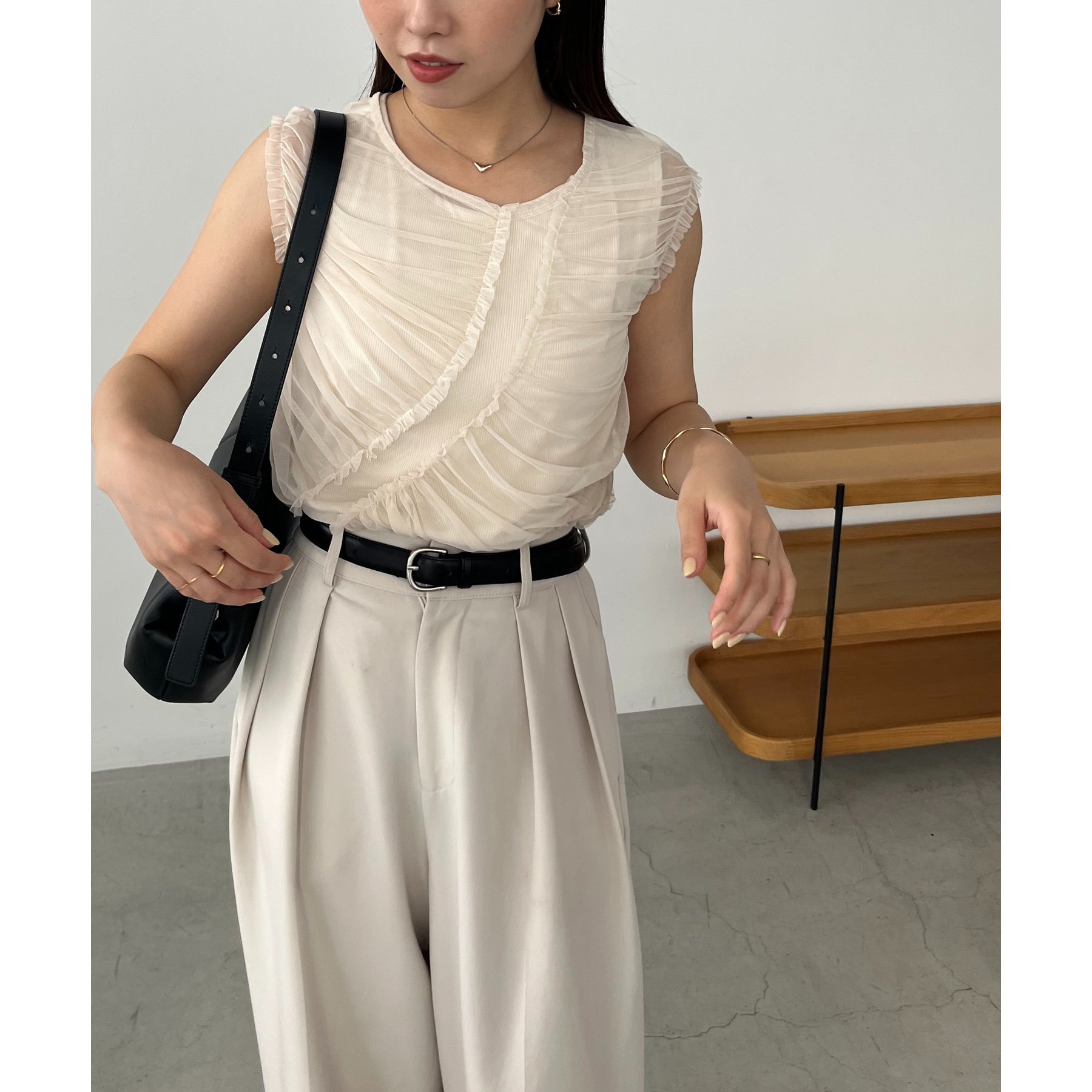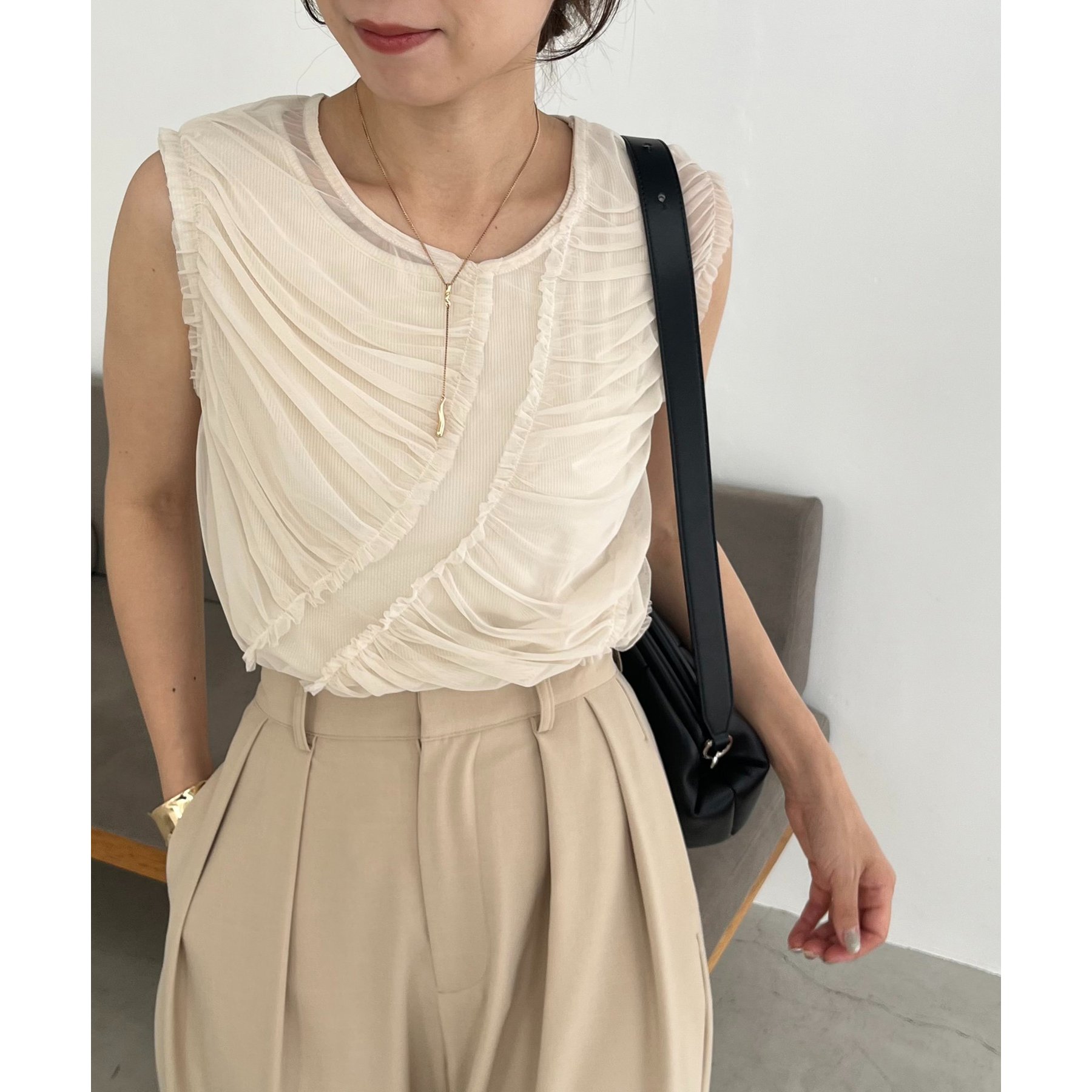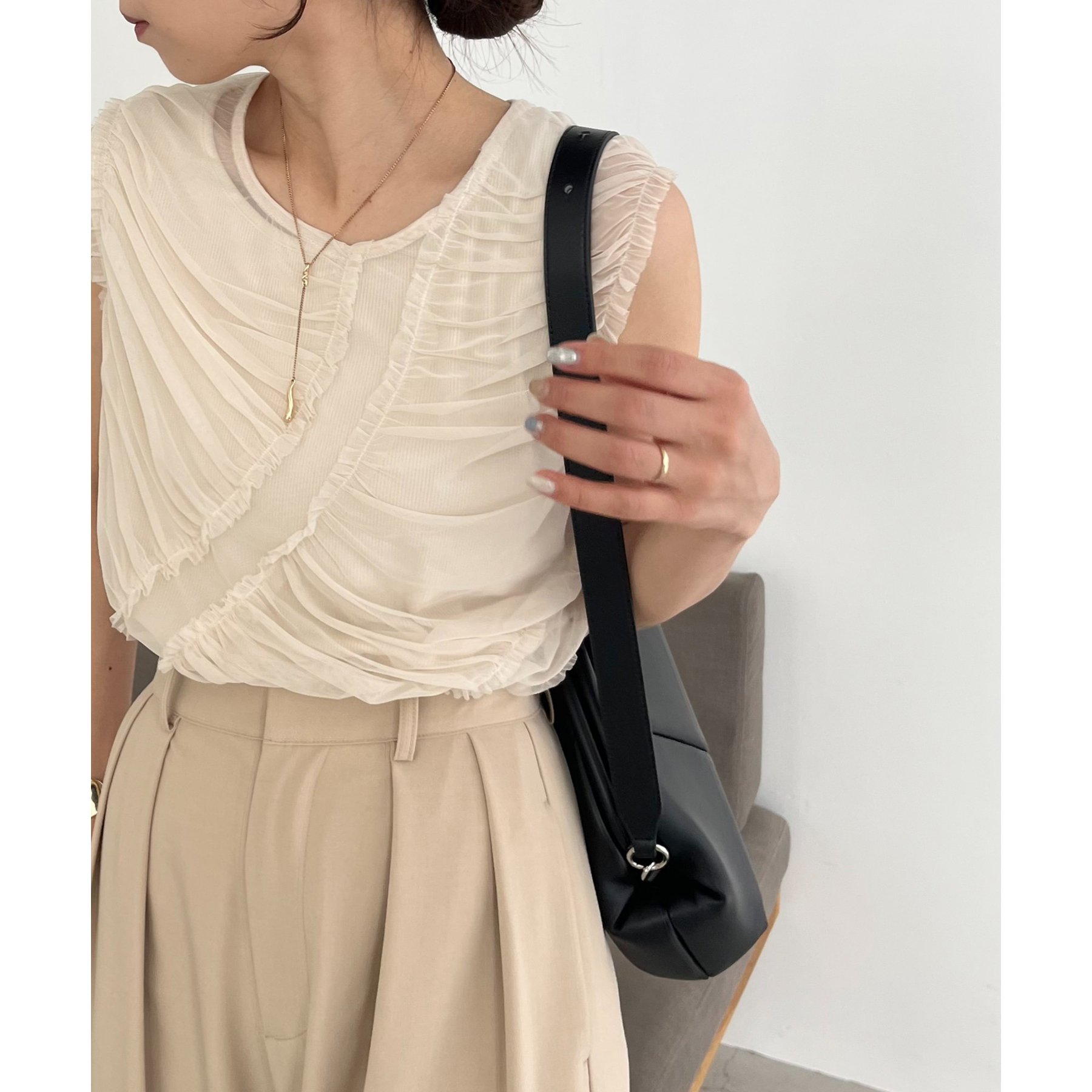 チュール素材にたっぷりとギャザーを入れた着映えするデザイントップス