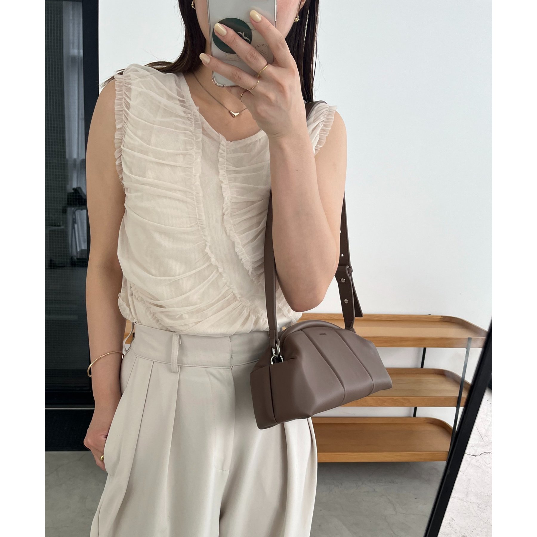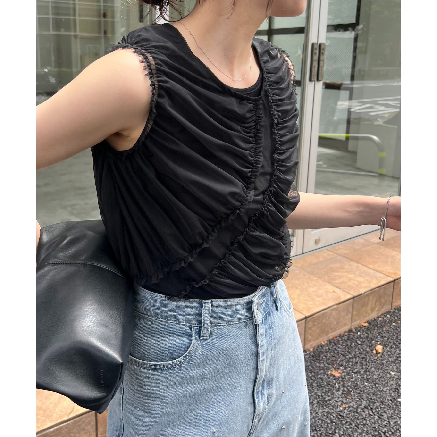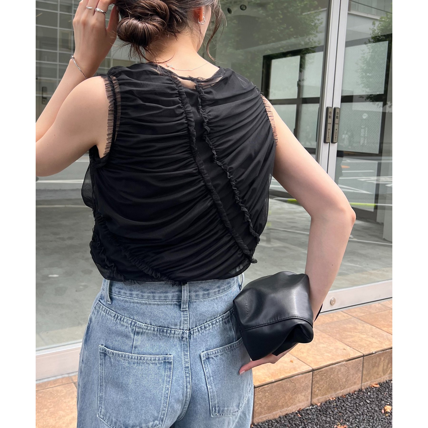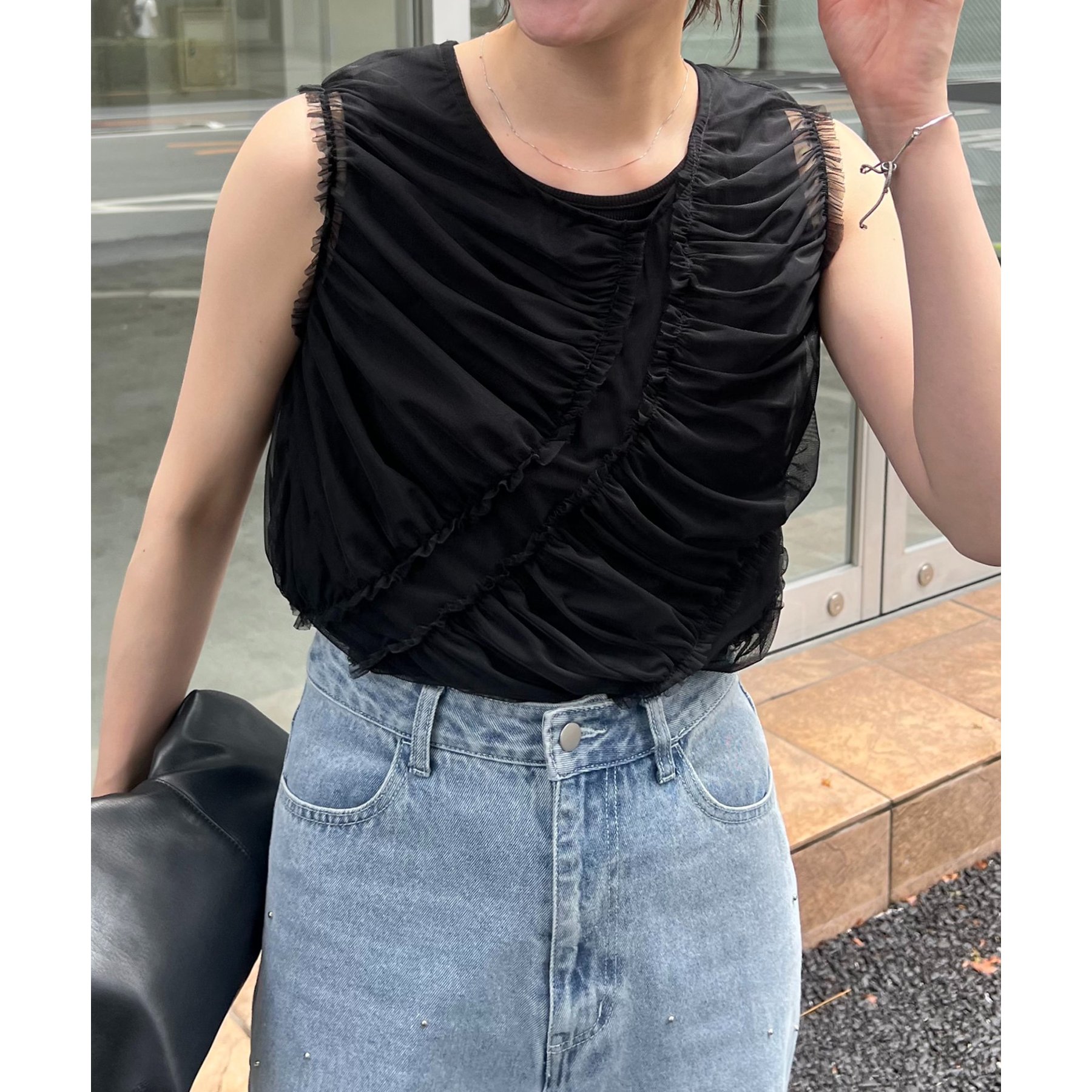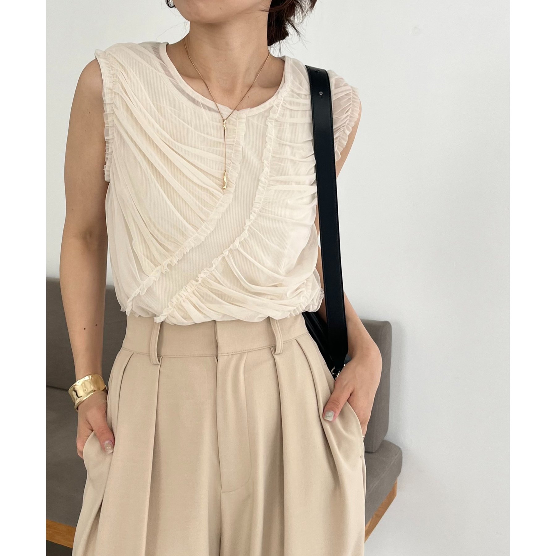 チュール素材にたっぷりとギャザーを入れた着映えするデザイントップス