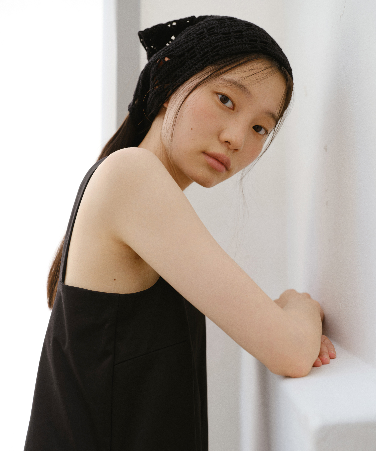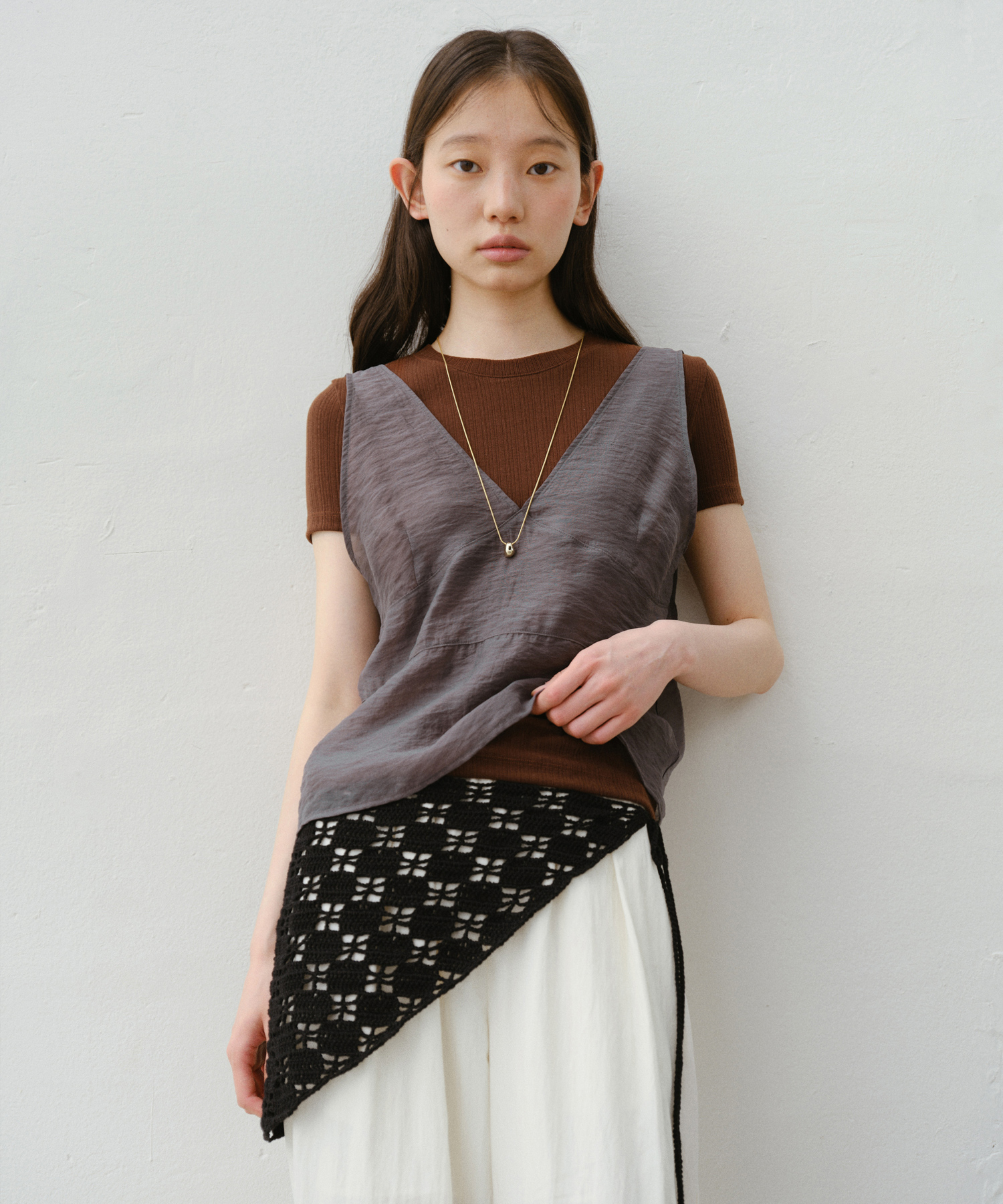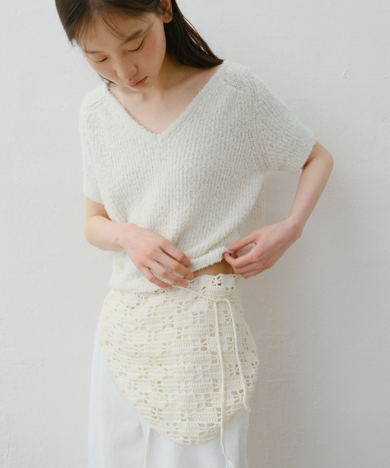 ドットと光沢のないコットン100%糸を使って手編み方式で丁寧に制作したニットスカーフです。スタイリングできるユニークなアイテム。