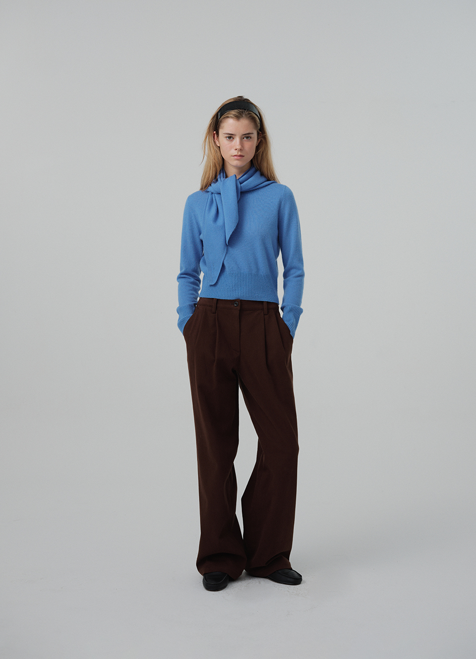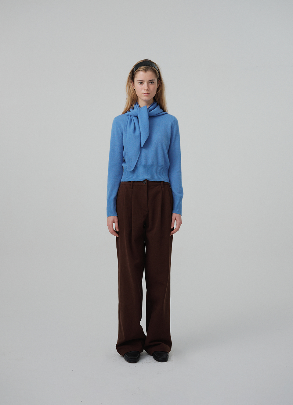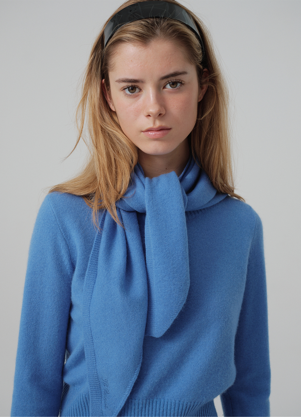 裾リブ編みのディテールと使いやすい長さの ニットスカーフタイプ