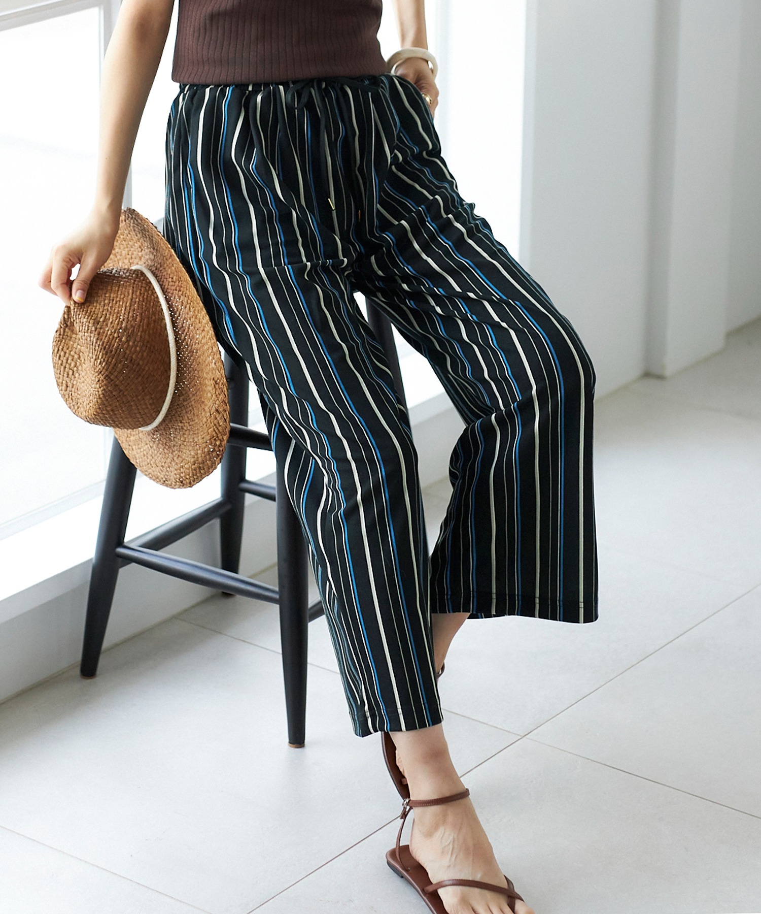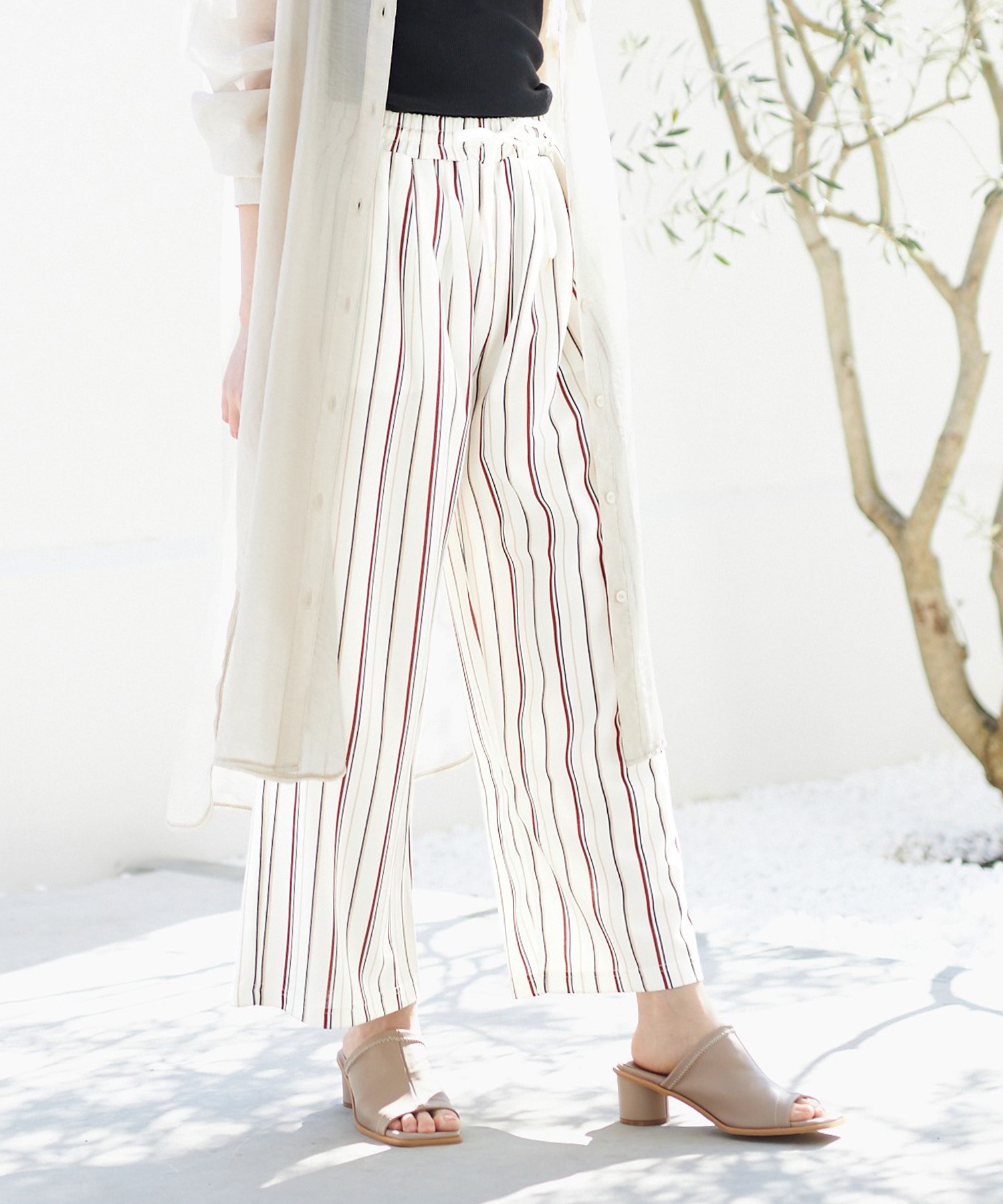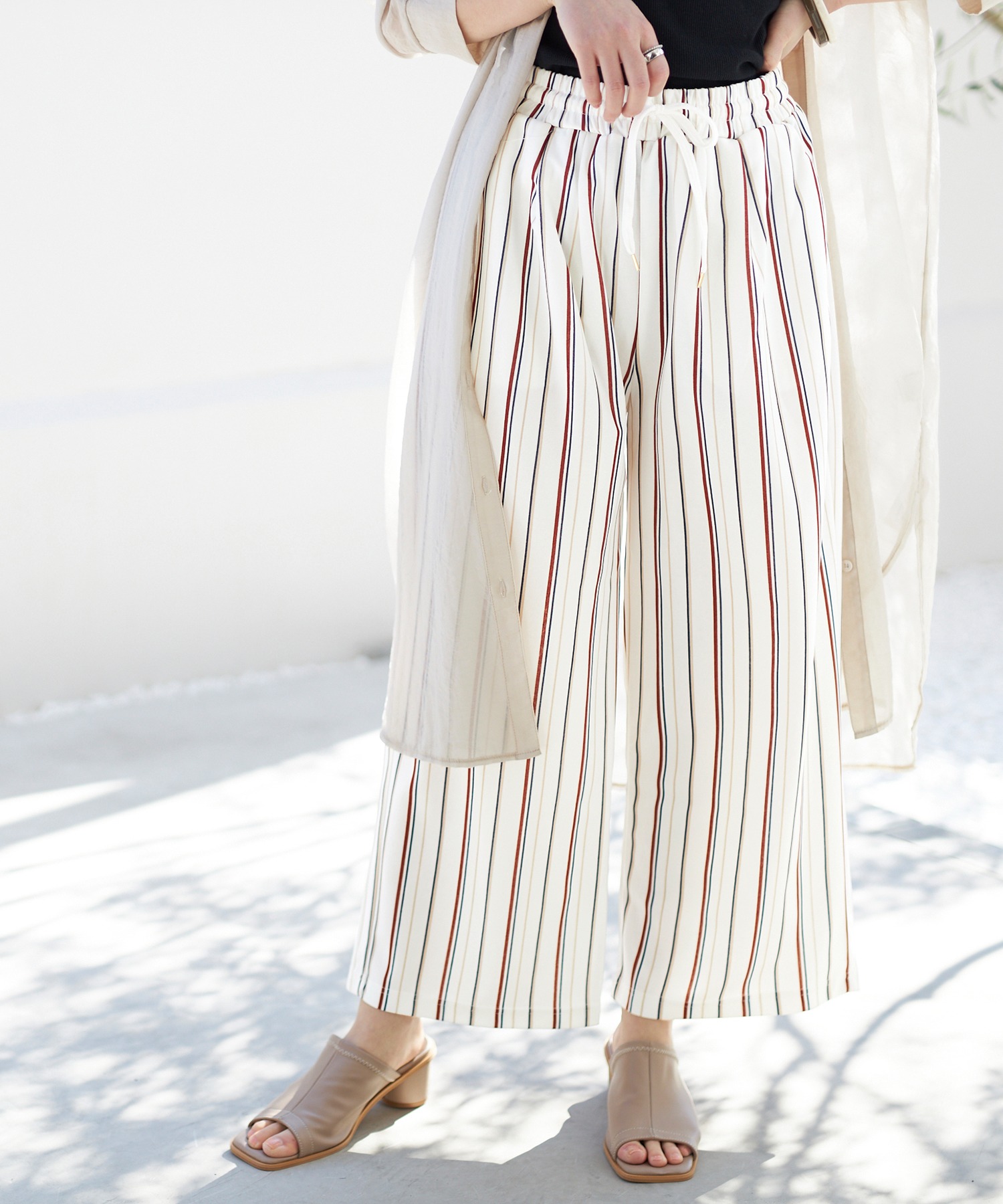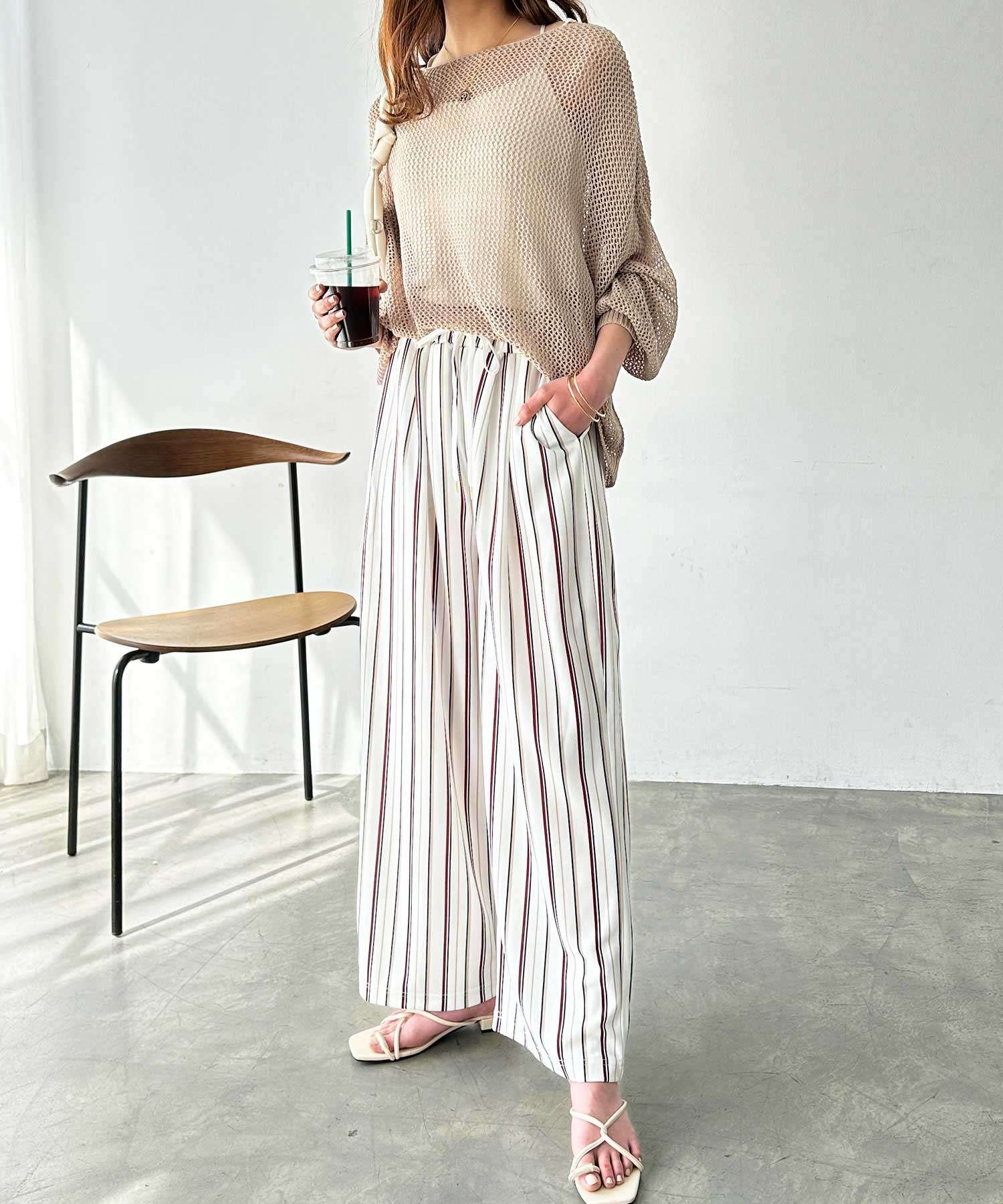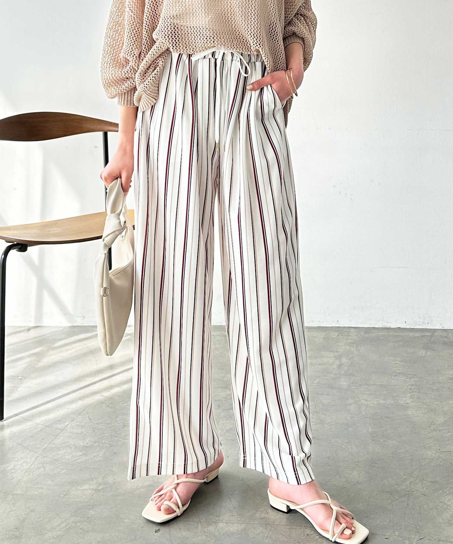 ウエストは紐入りだから、トップスをウエストインしてもきれいに決まります。