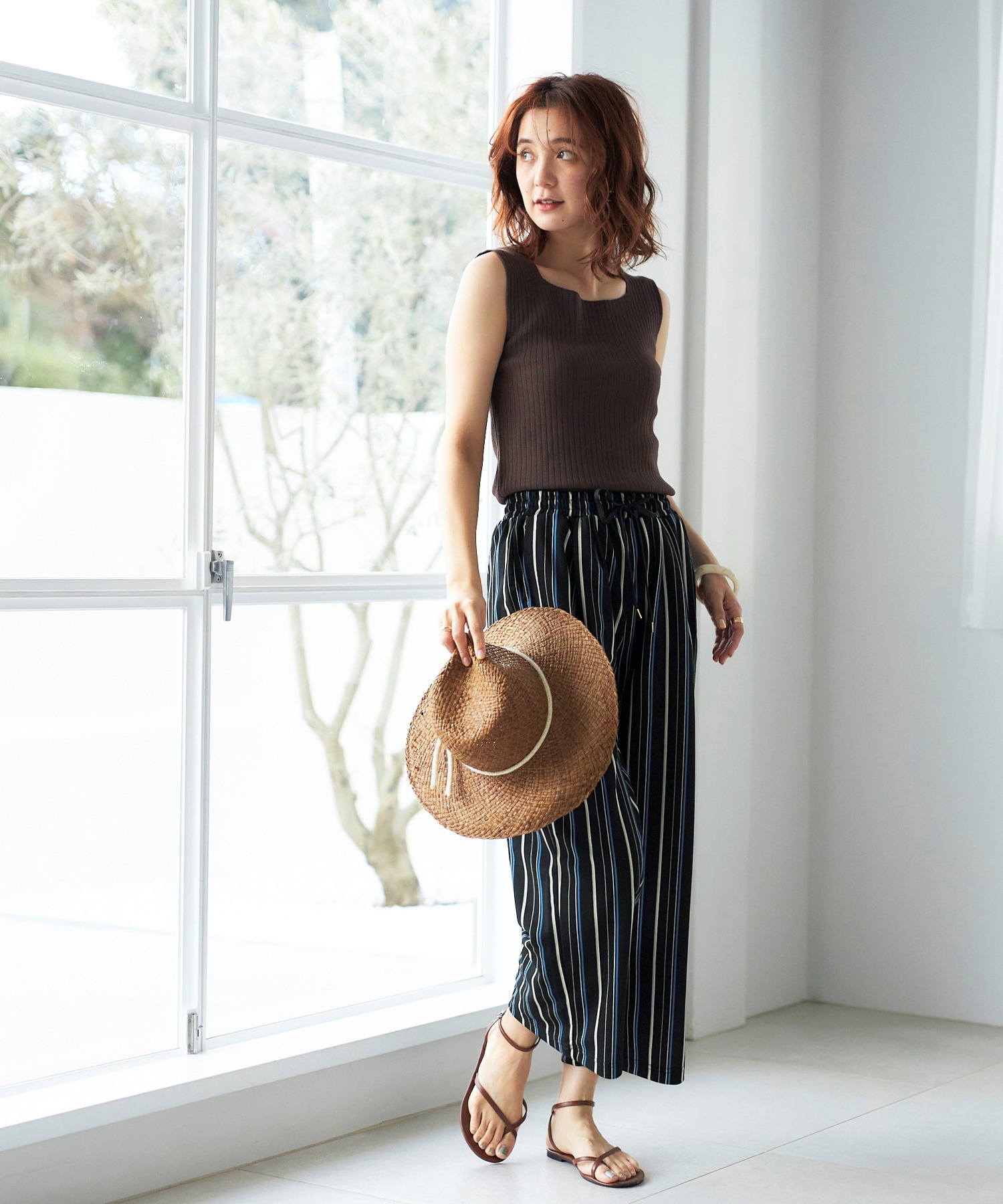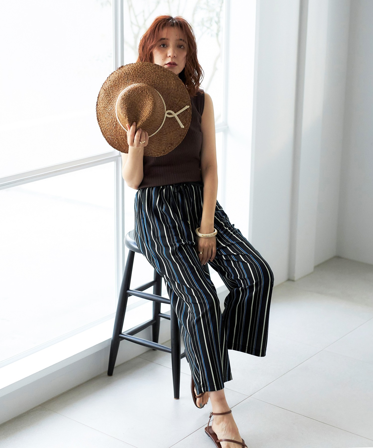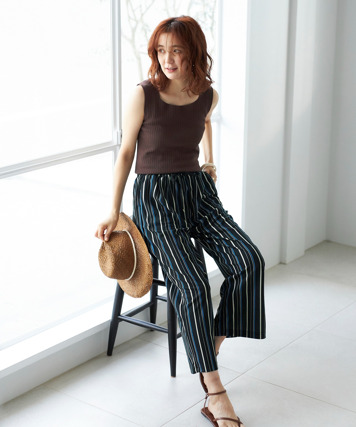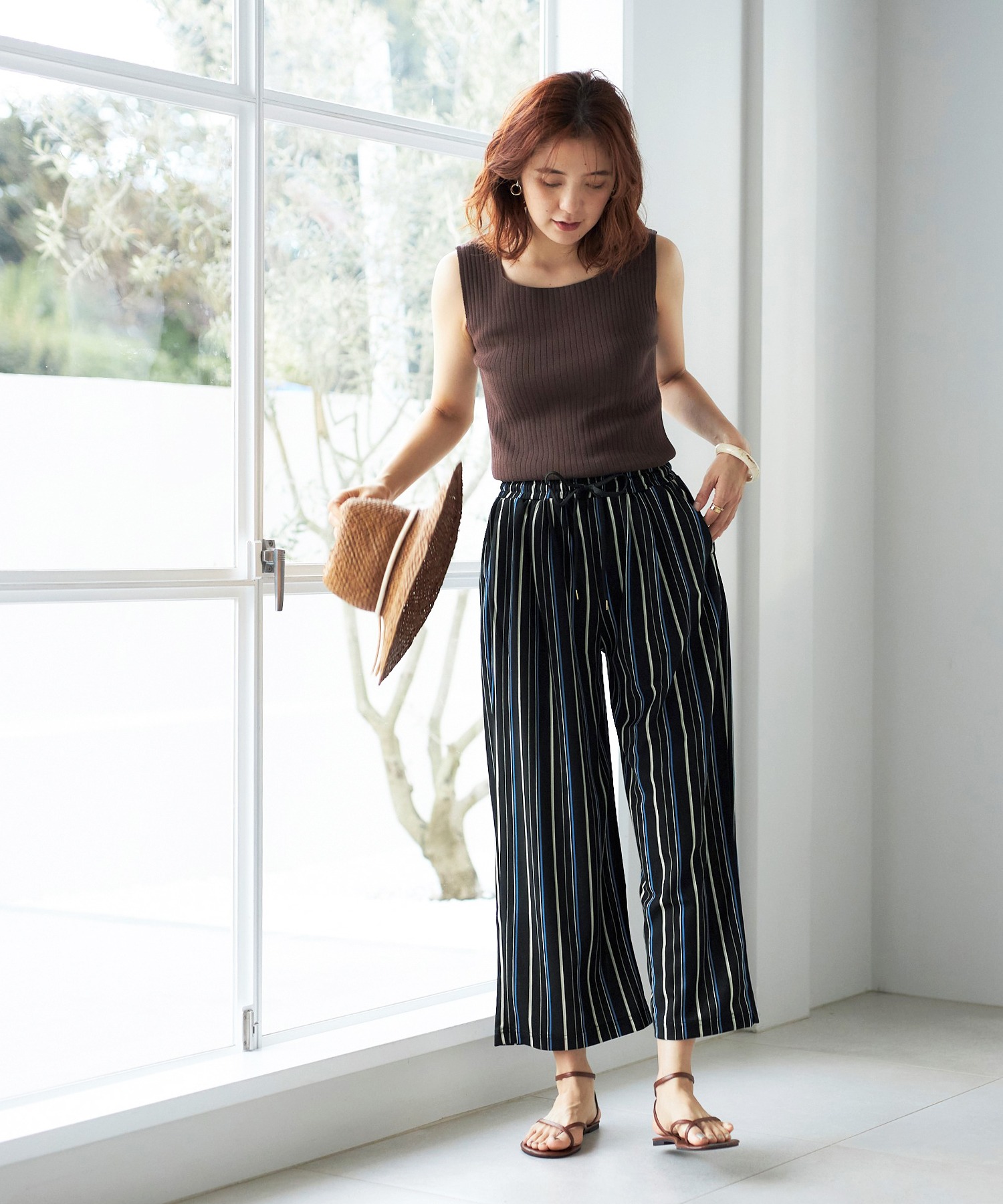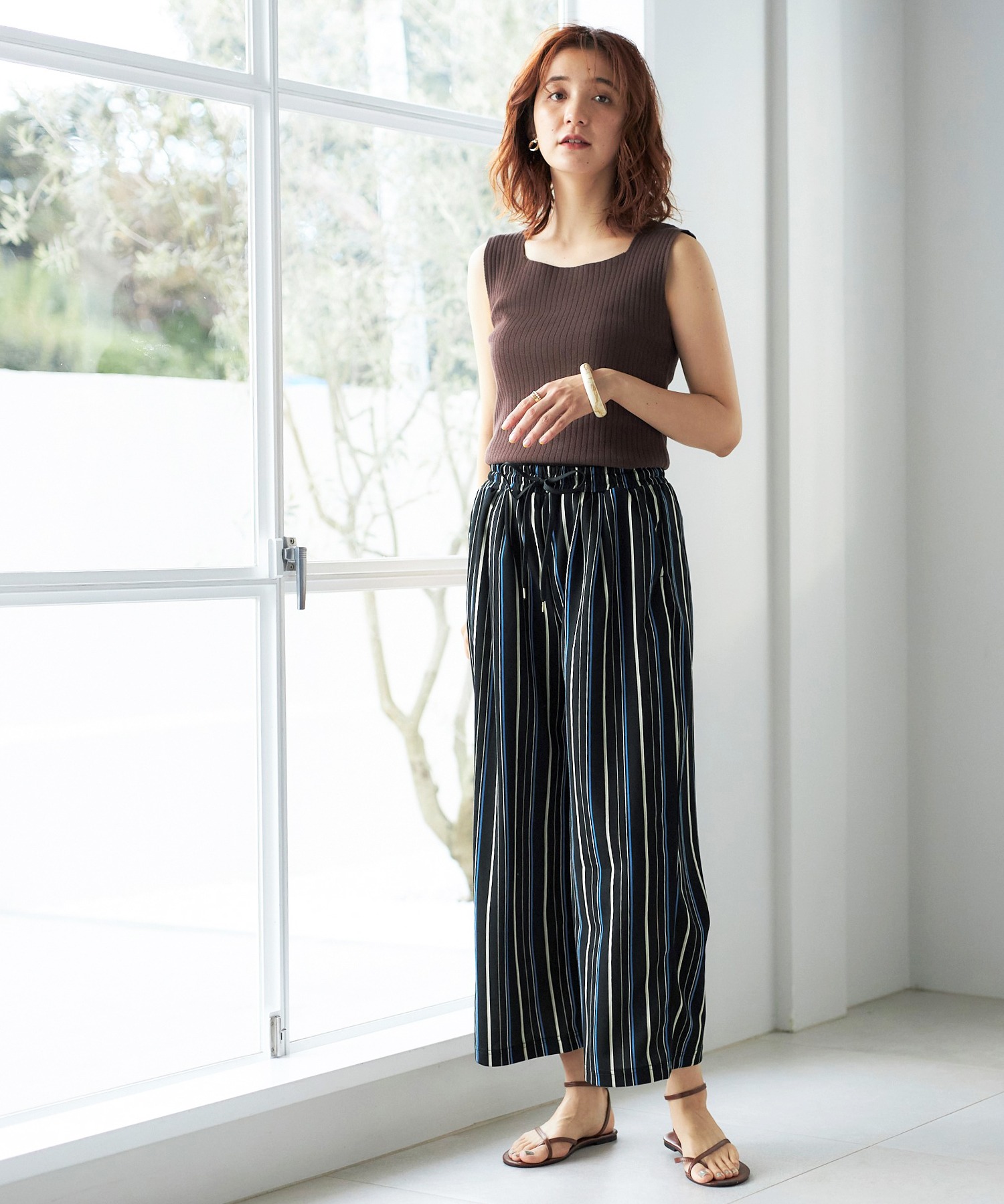 ウエストは紐入りだから、トップスをウエストインしてもきれいに決まります。