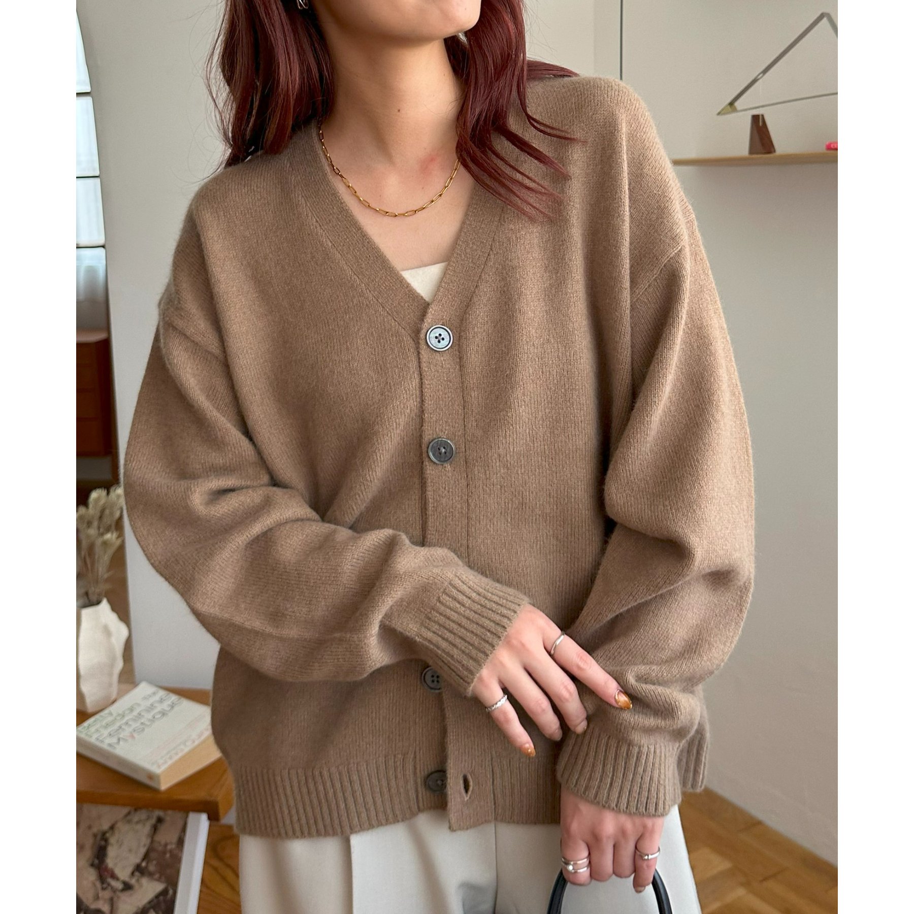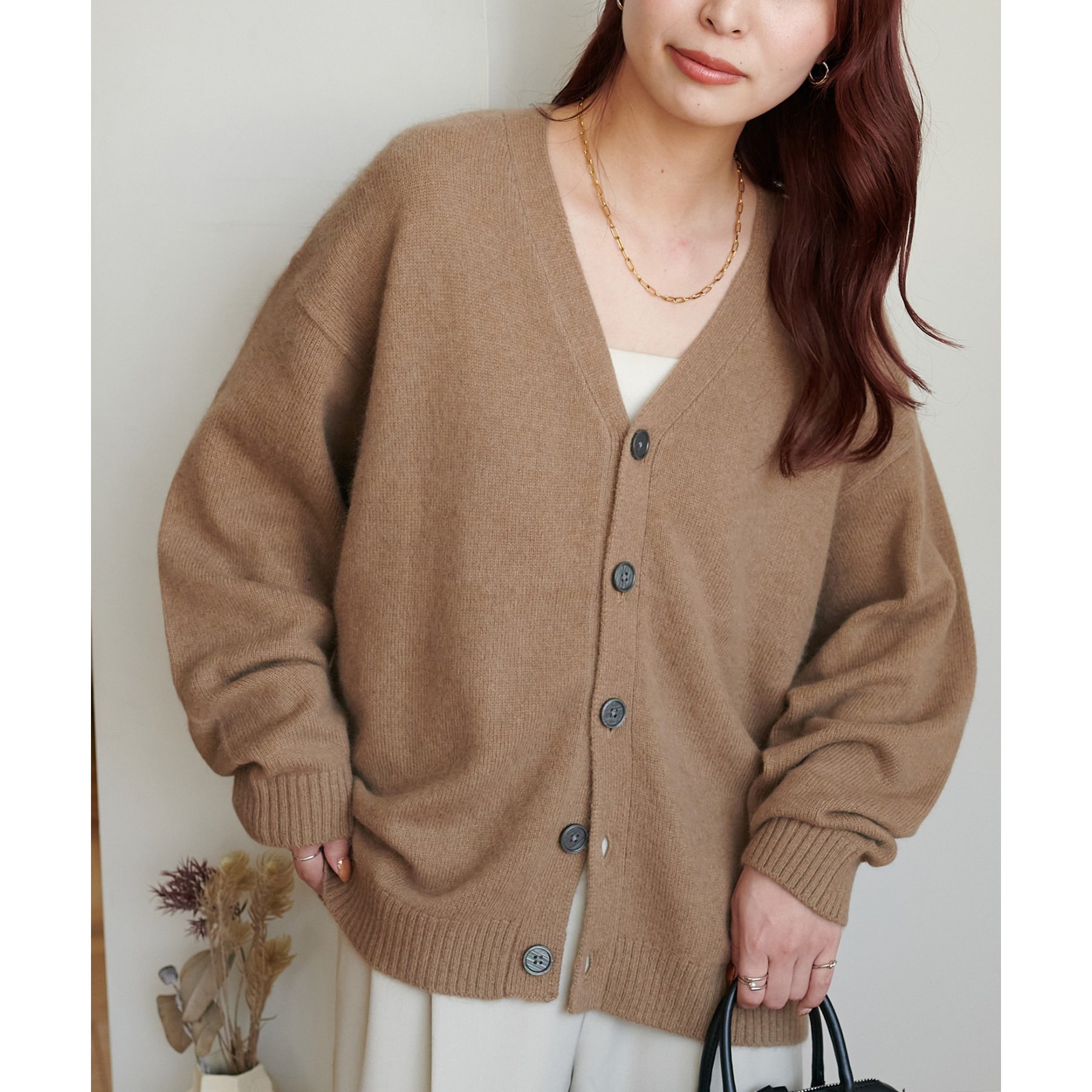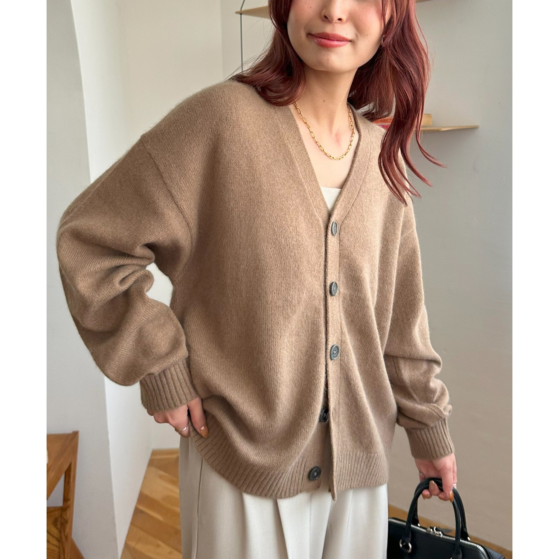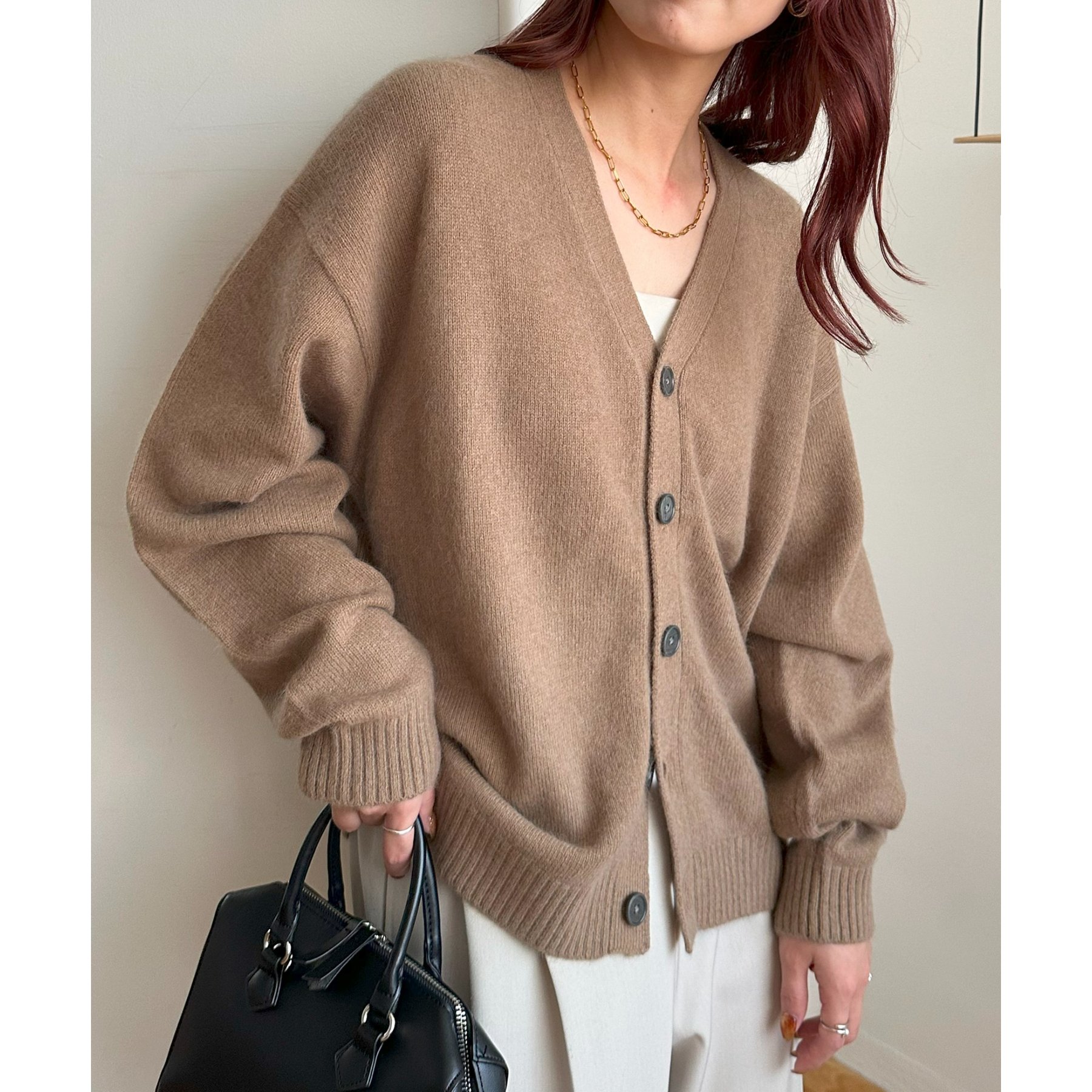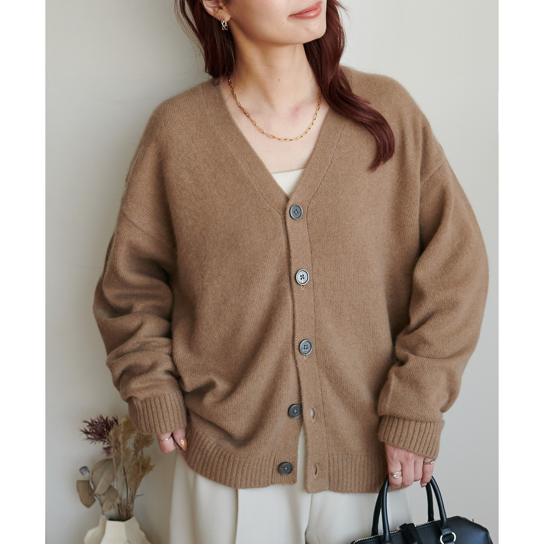シンプルながらも程よい抜け感のあるVネックデザインが、顔まわりをすっきり見せてくれるカーディガン。