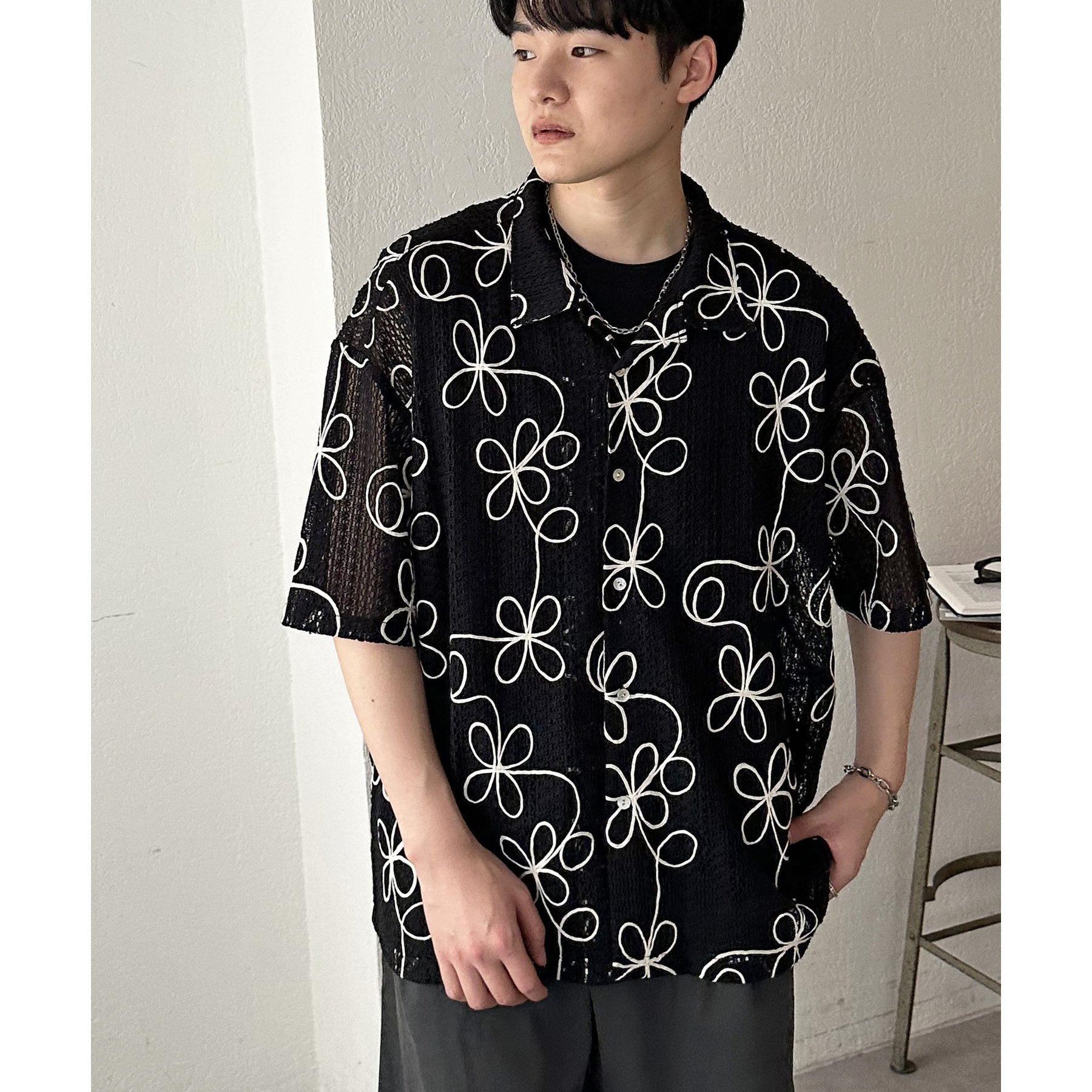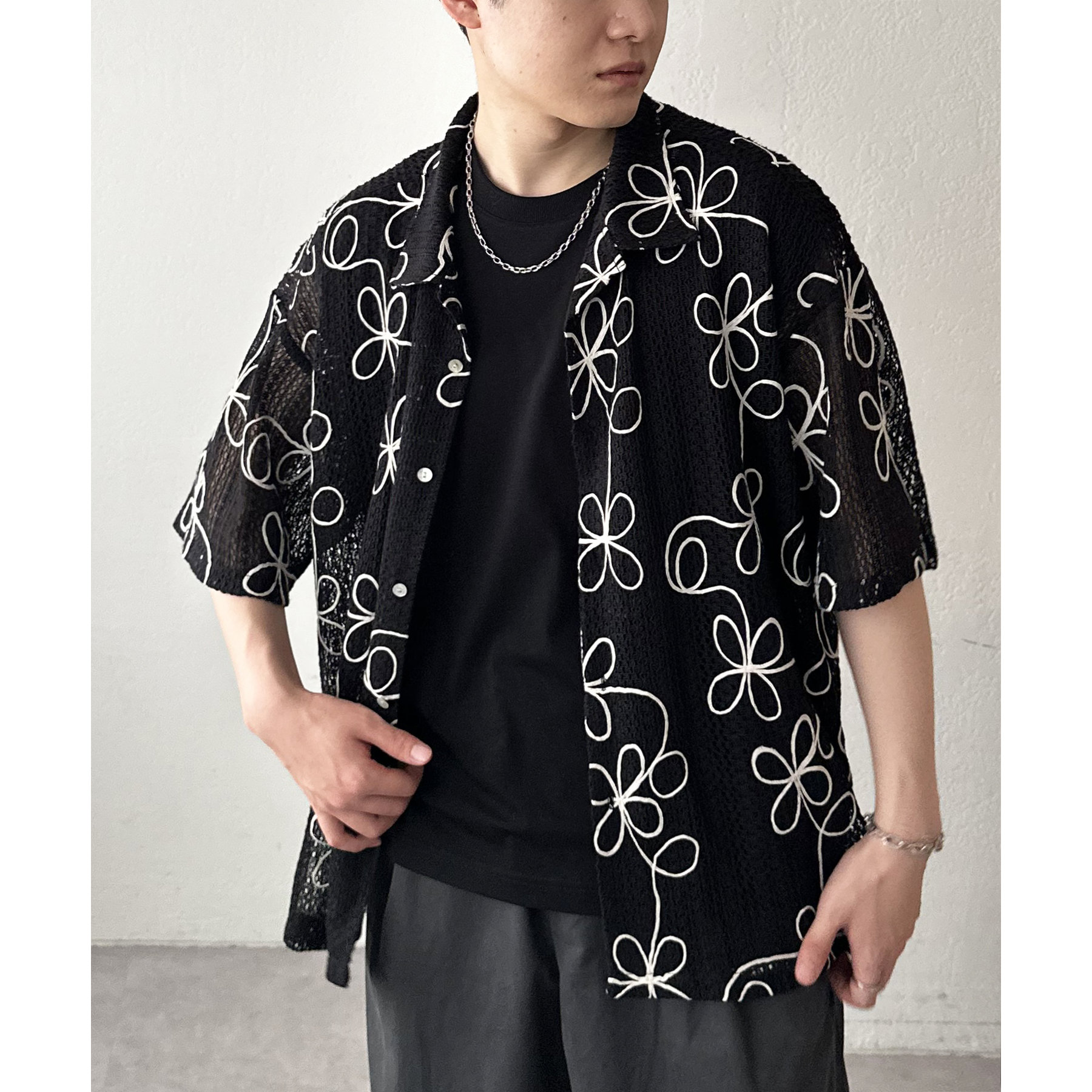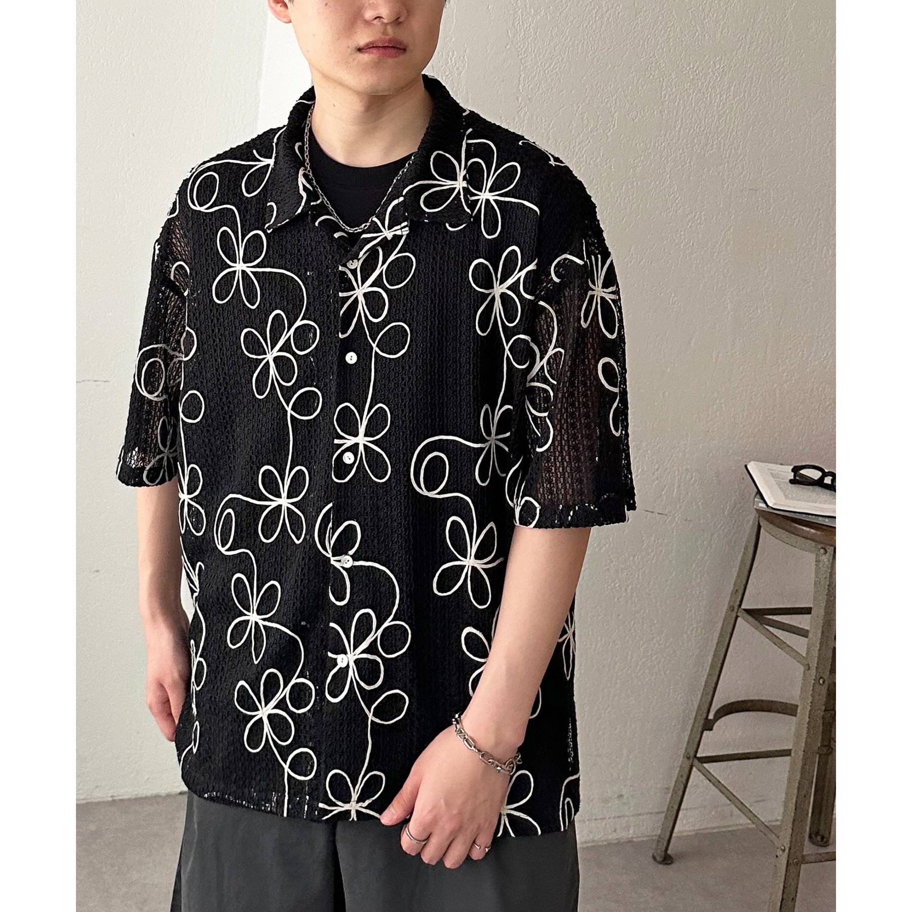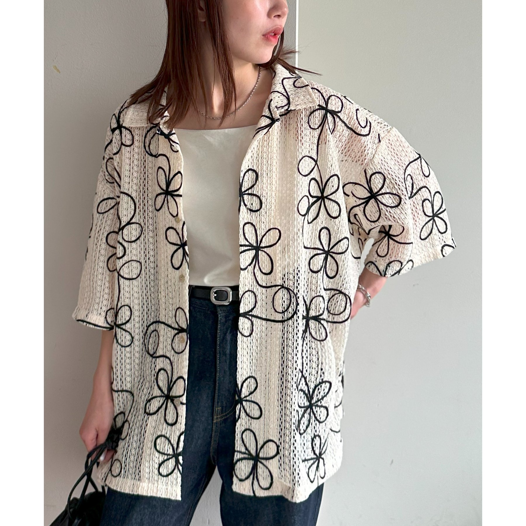 花柄刺繍が目を惹くメッシュシャツ。透け感のある素材と程よいオーバーサイズシルエットが、こなれ感を演出します。