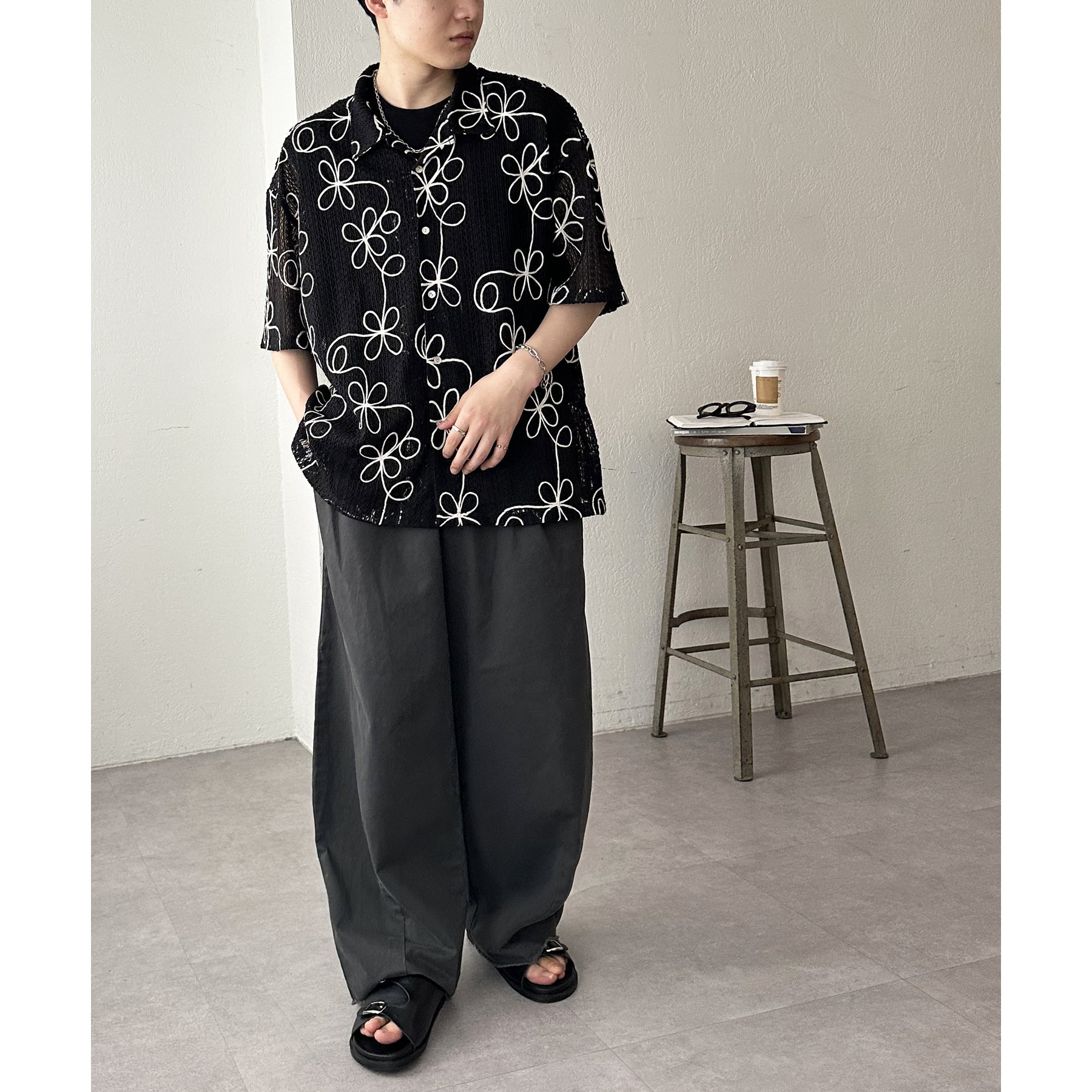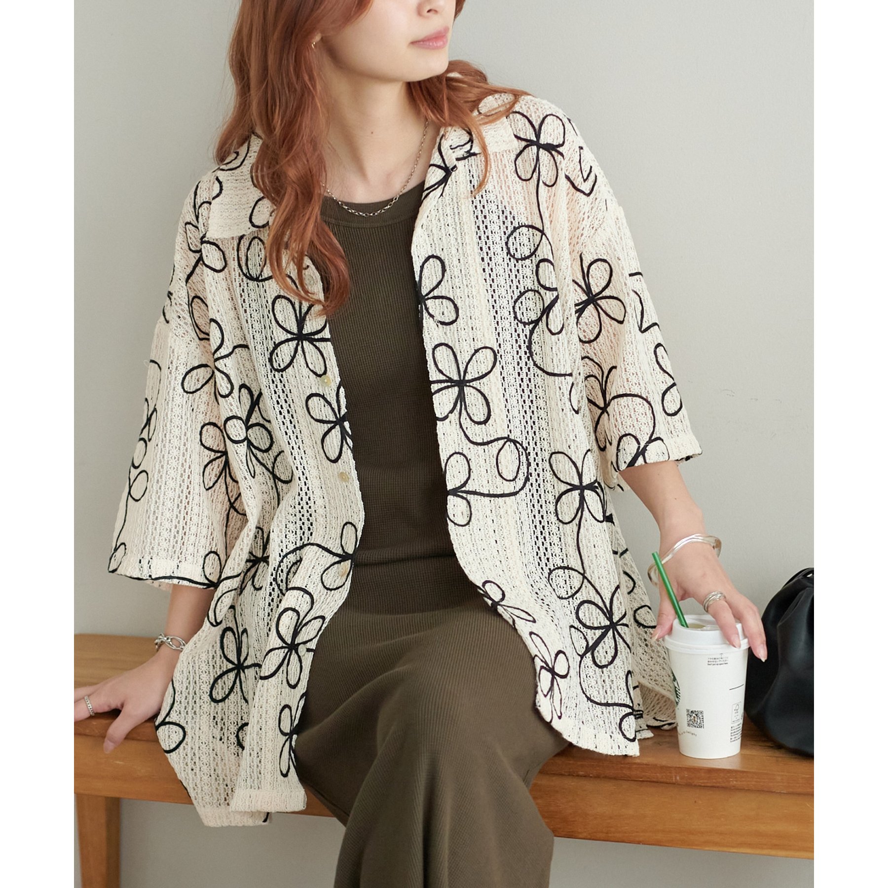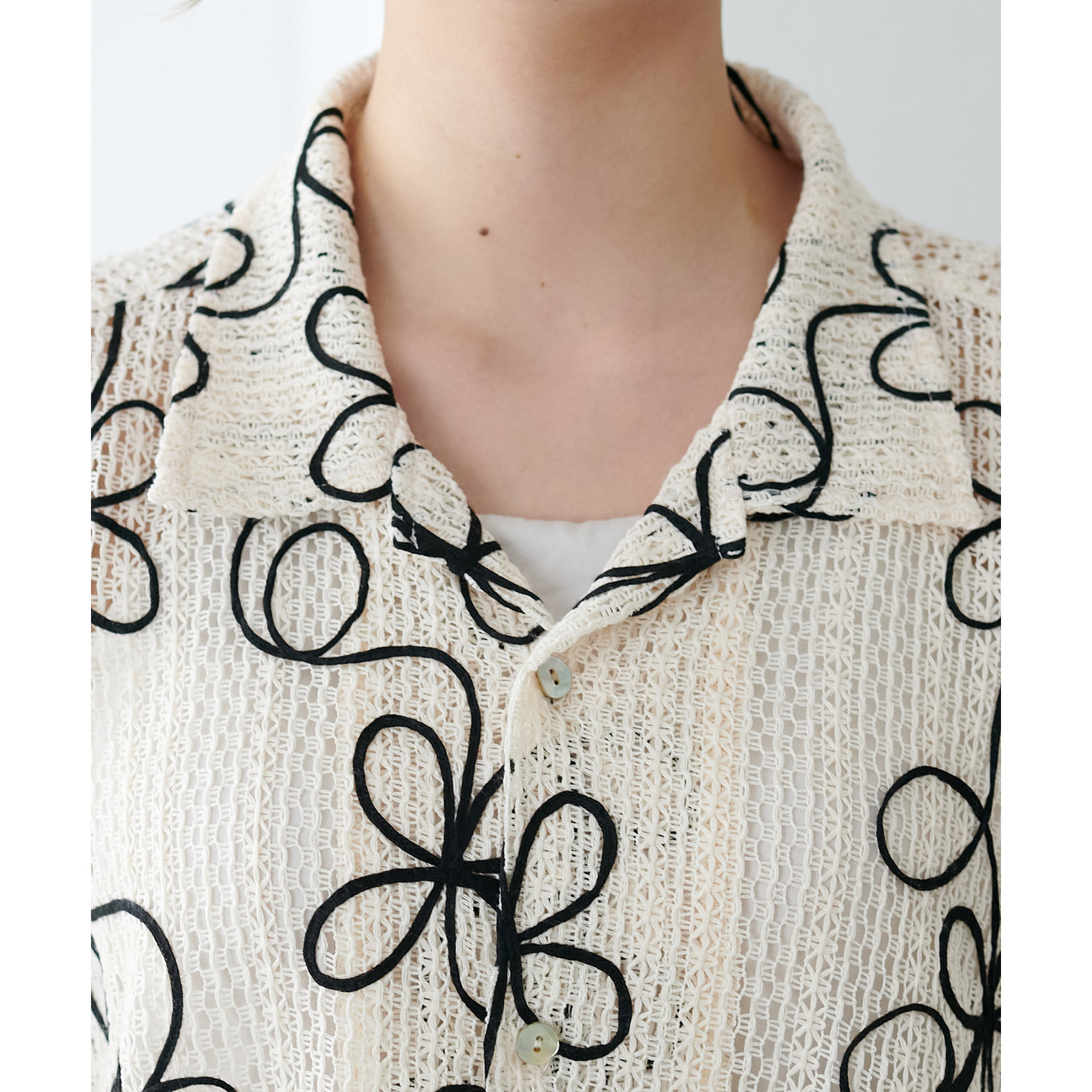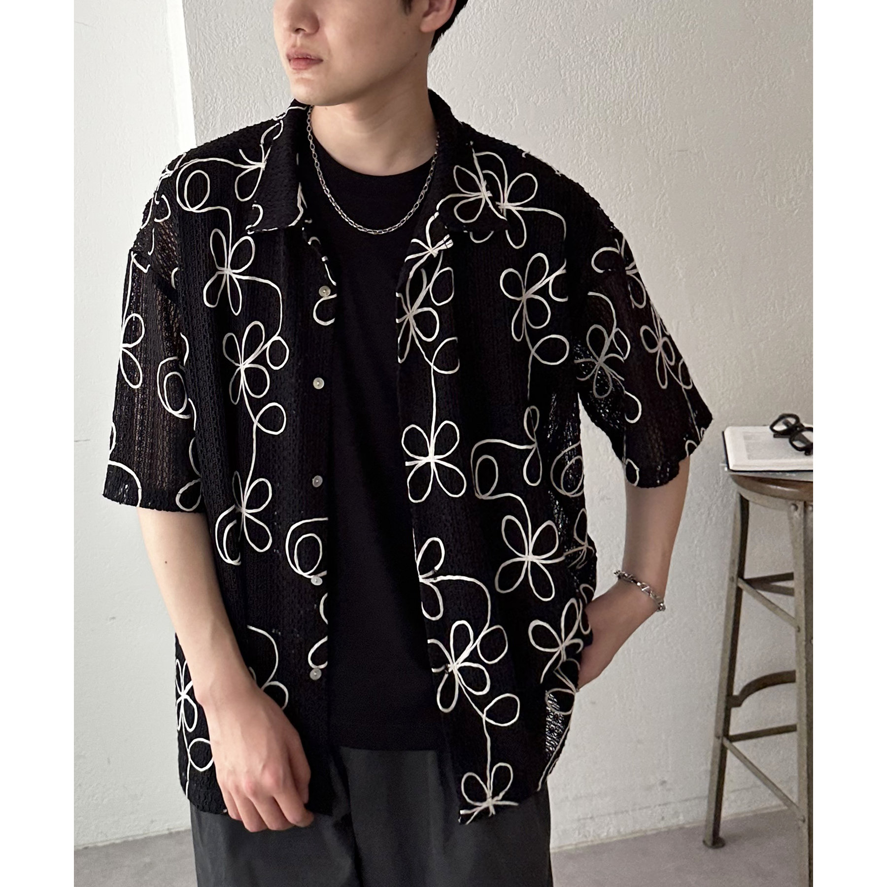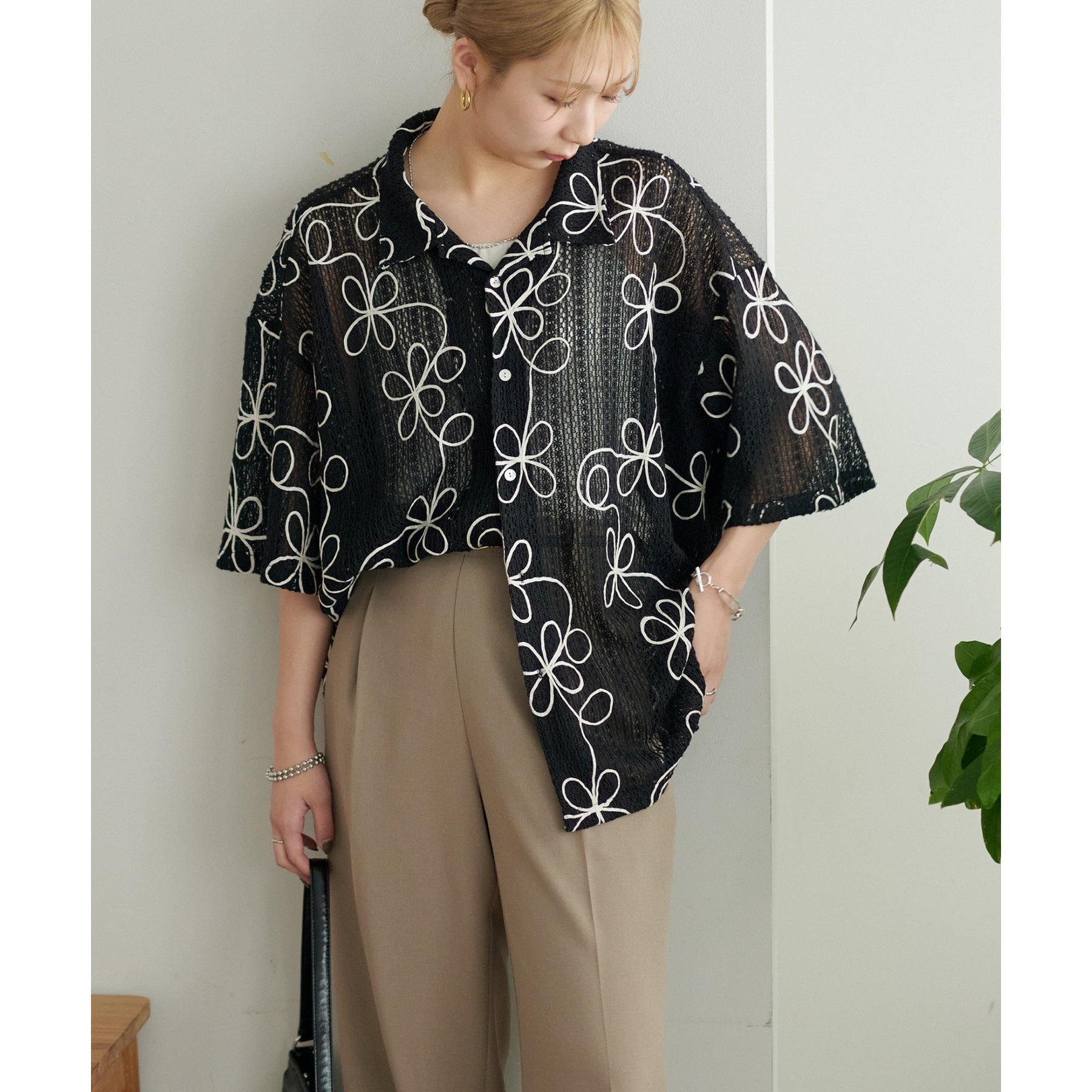 花柄刺繍が目を惹くメッシュシャツ。透け感のある素材と程よいオーバーサイズシルエットが、こなれ感を演出します。