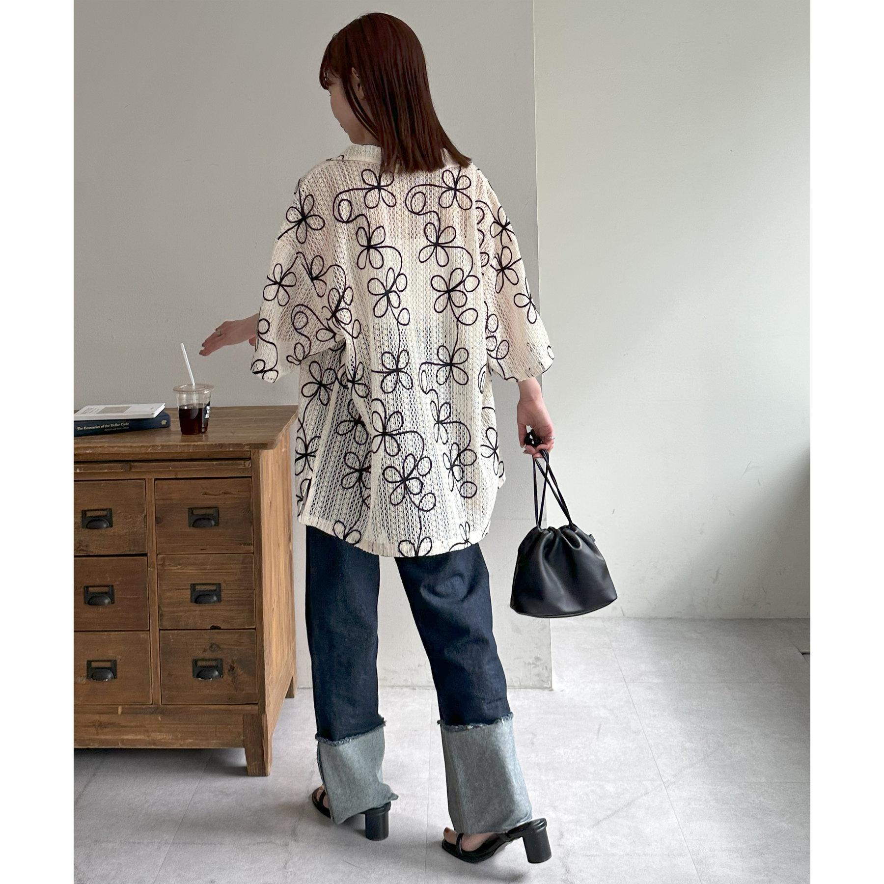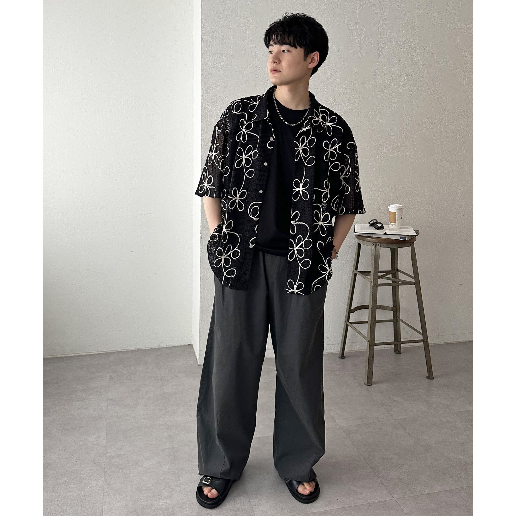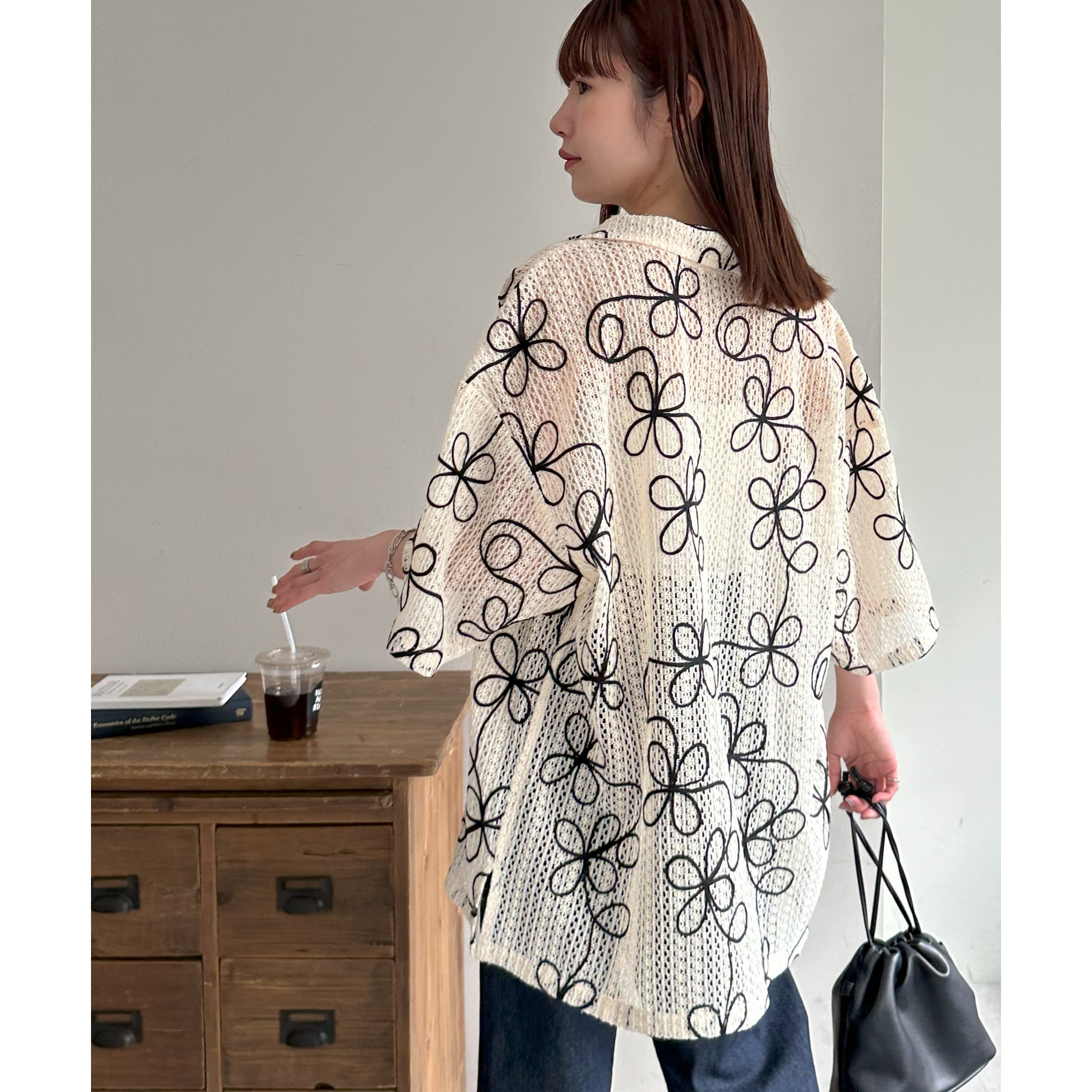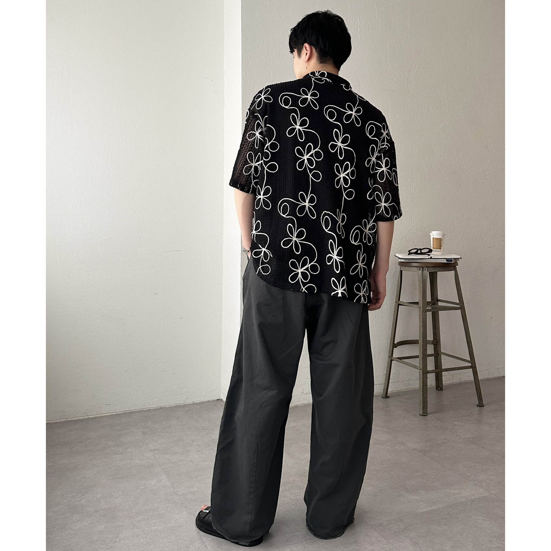 花柄刺繍が目を惹くメッシュシャツ。透け感のある素材と程よいオーバーサイズシルエットが、こなれ感を演出します。