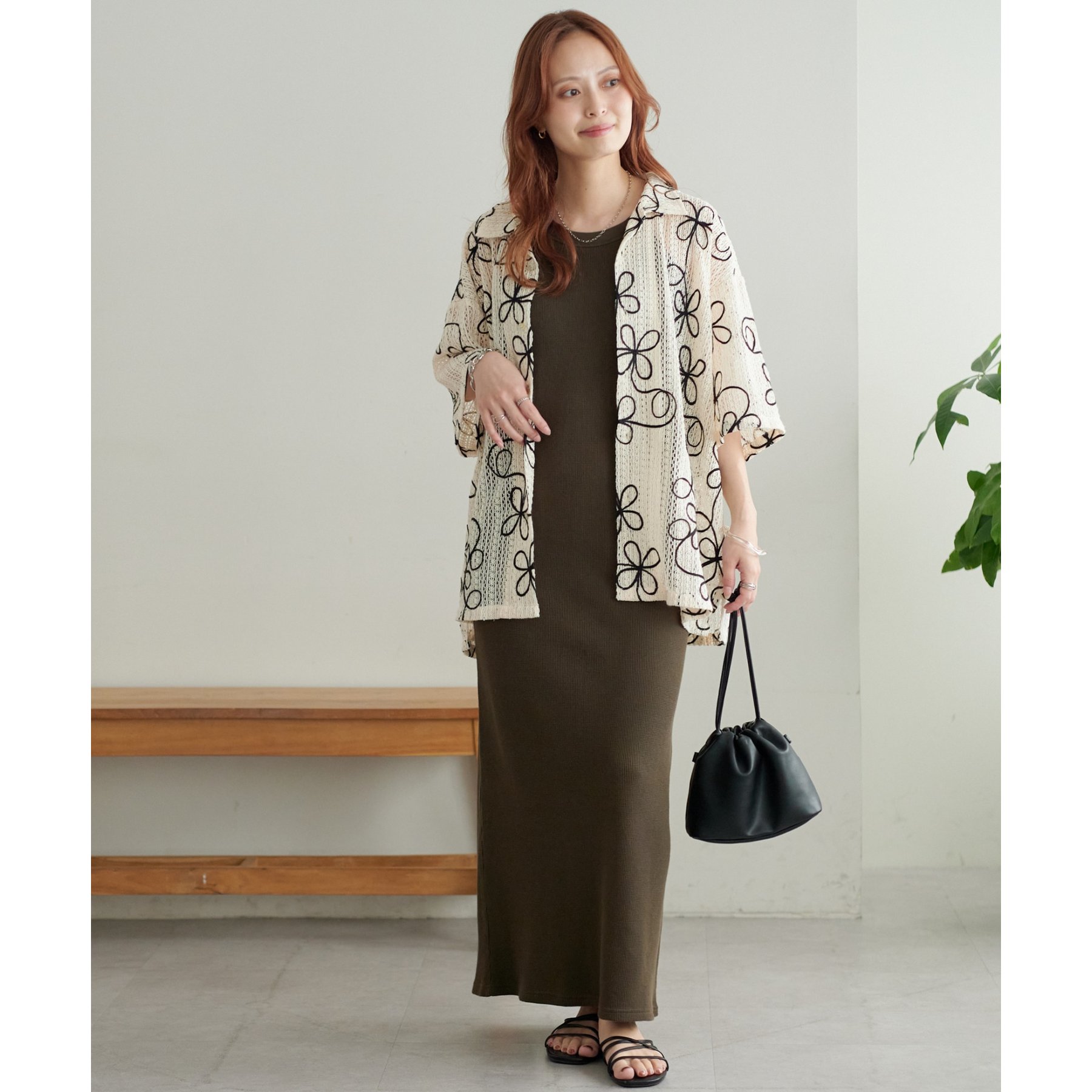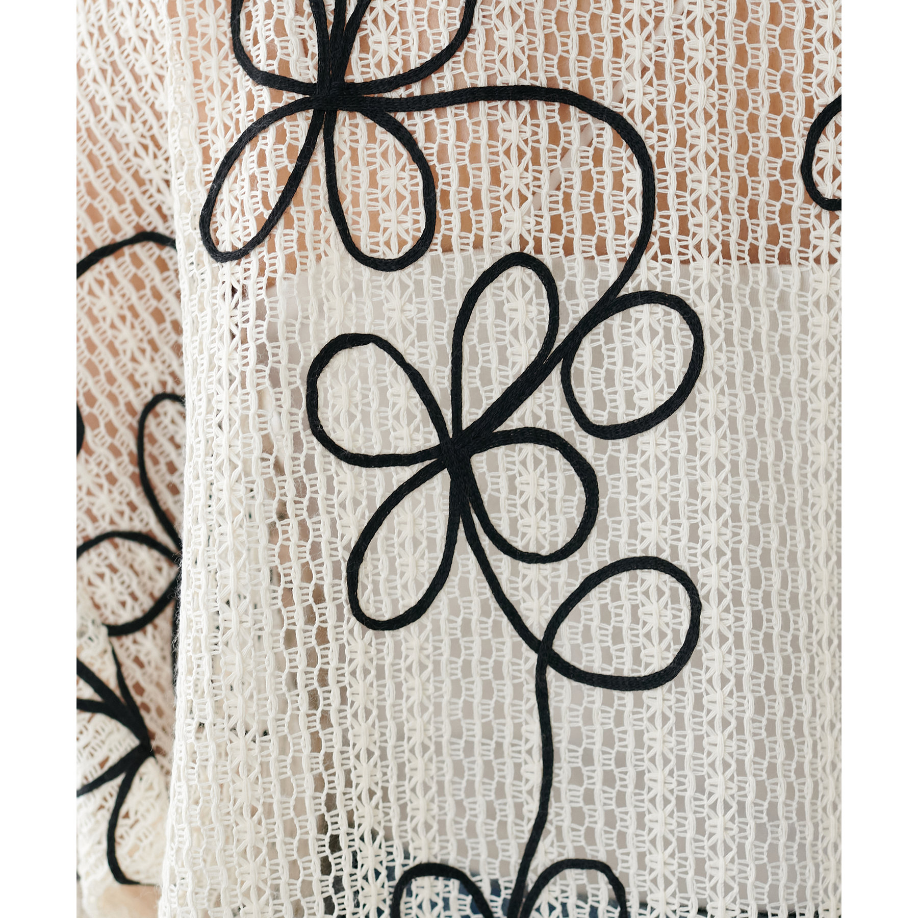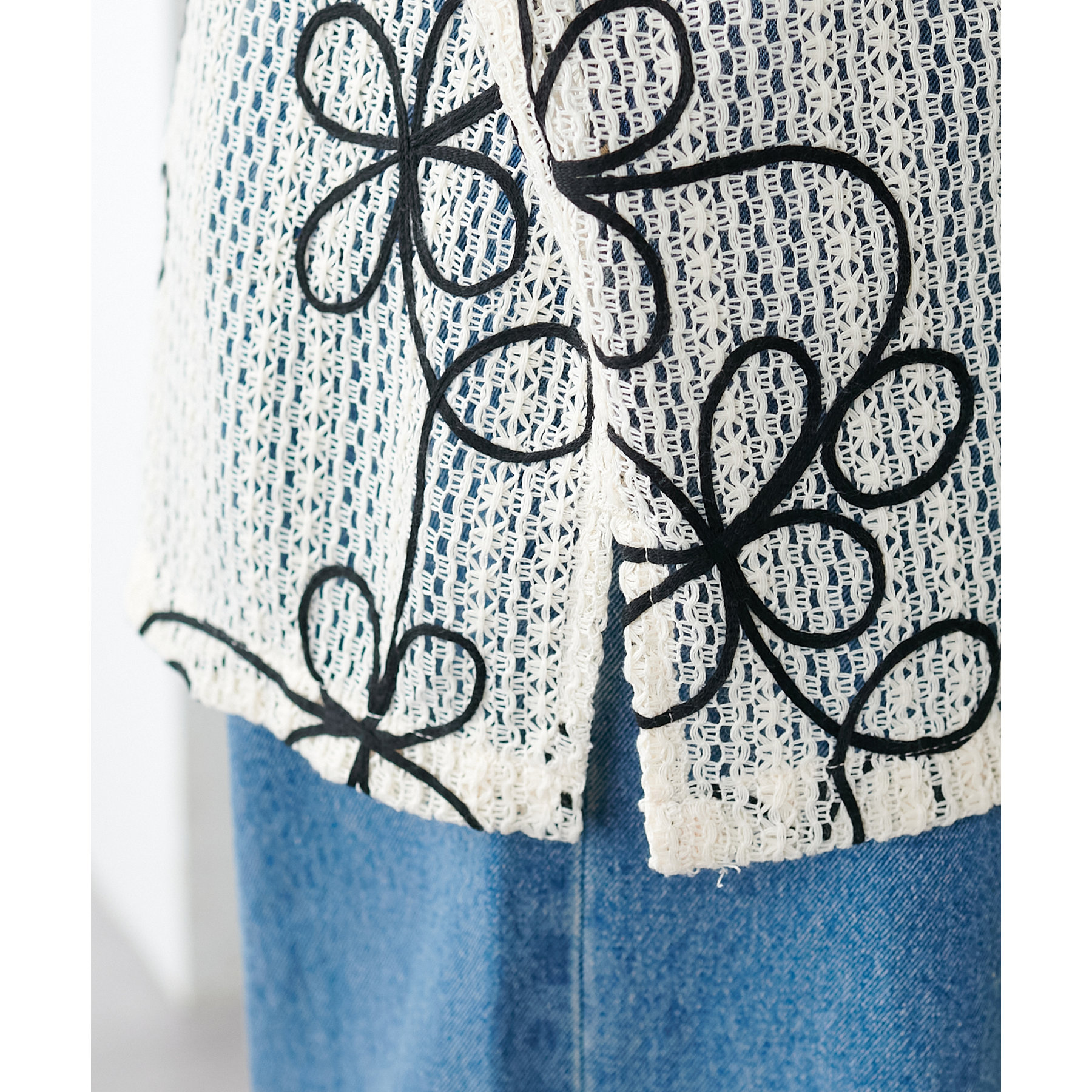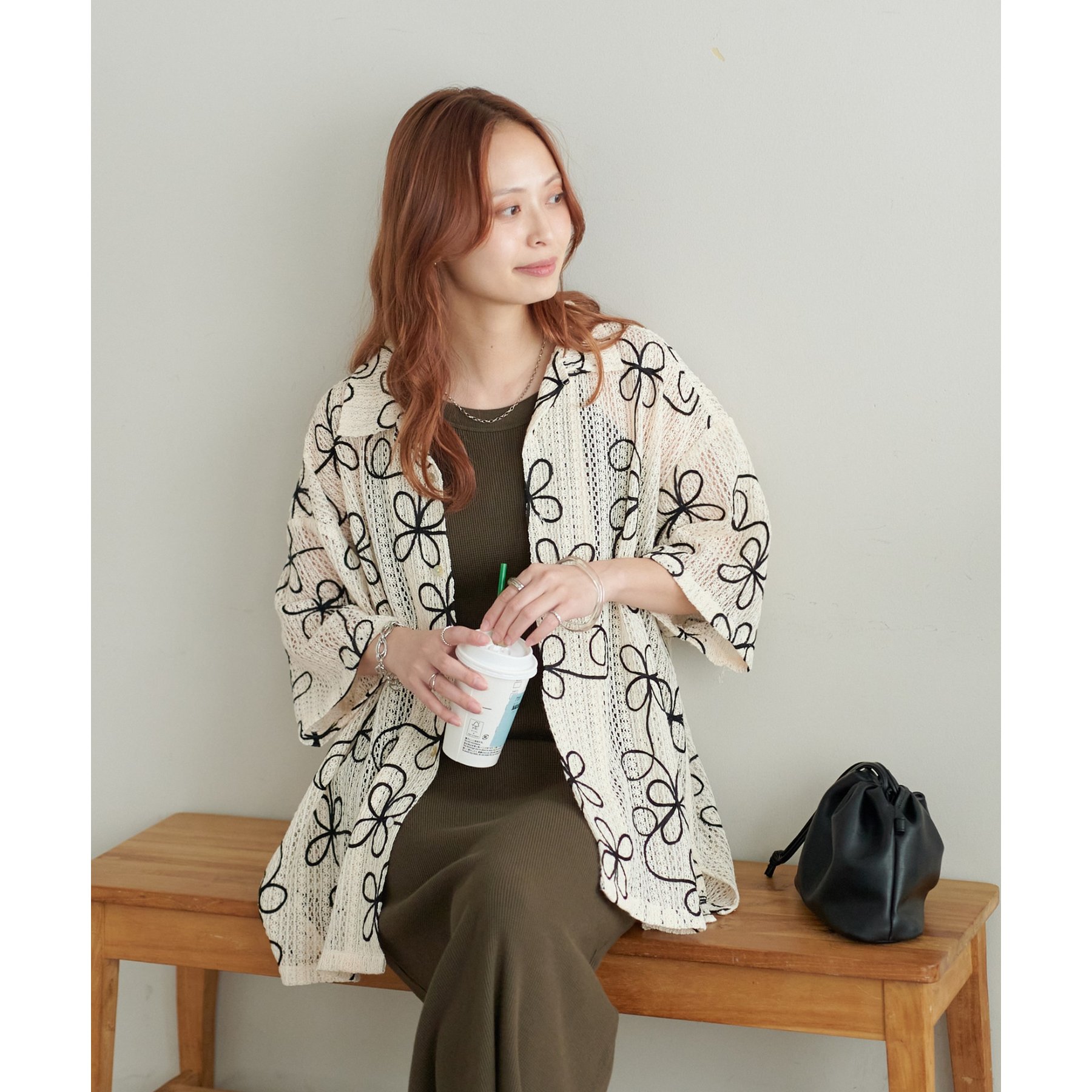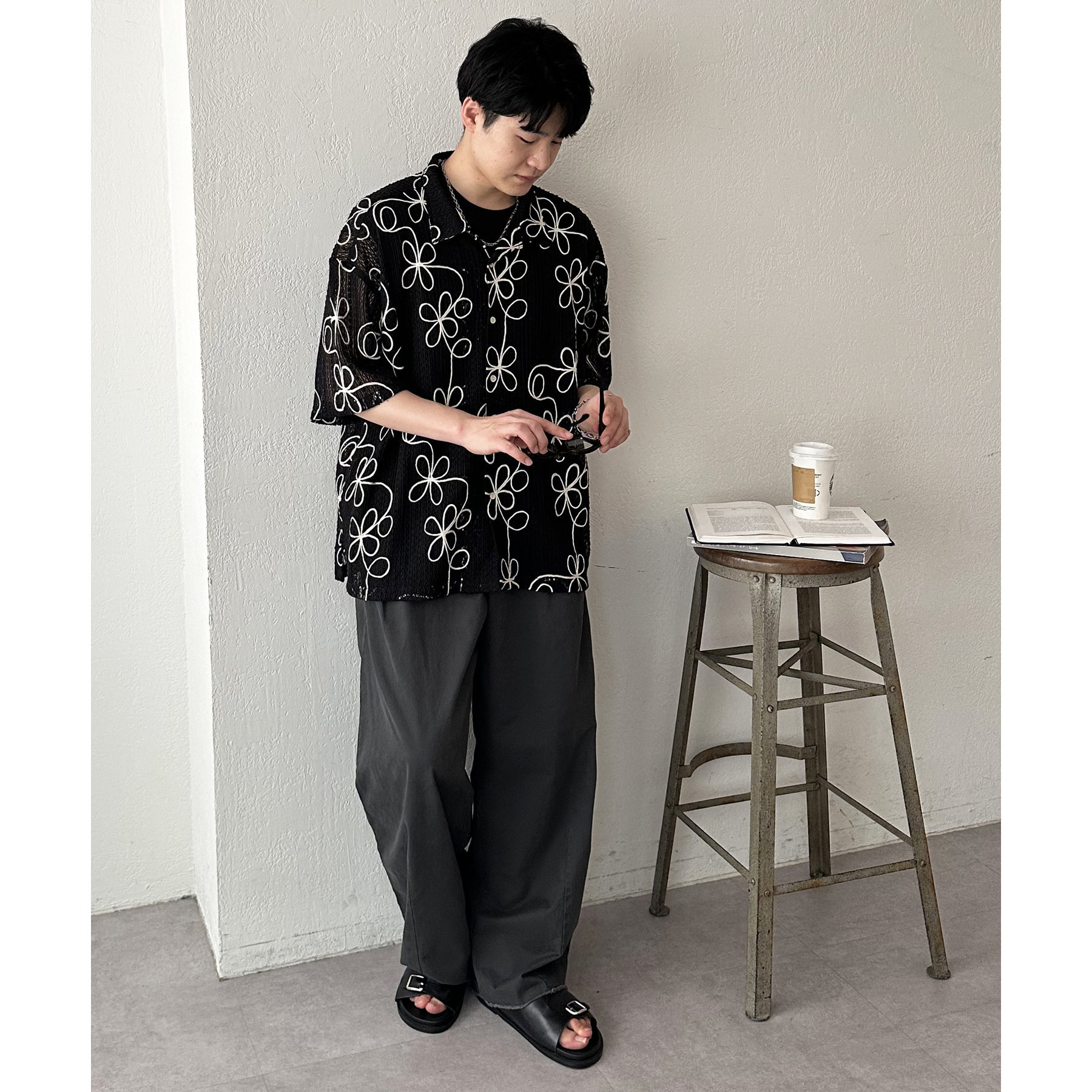 花柄刺繍が目を惹くメッシュシャツ。透け感のある素材と程よいオーバーサイズシルエットが、こなれ感を演出します。