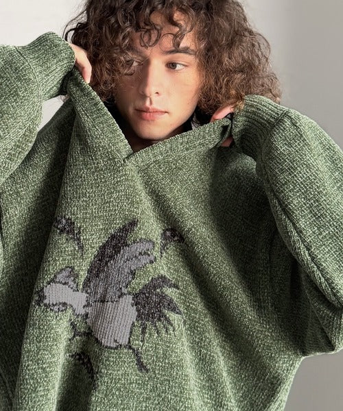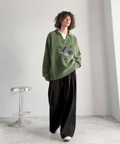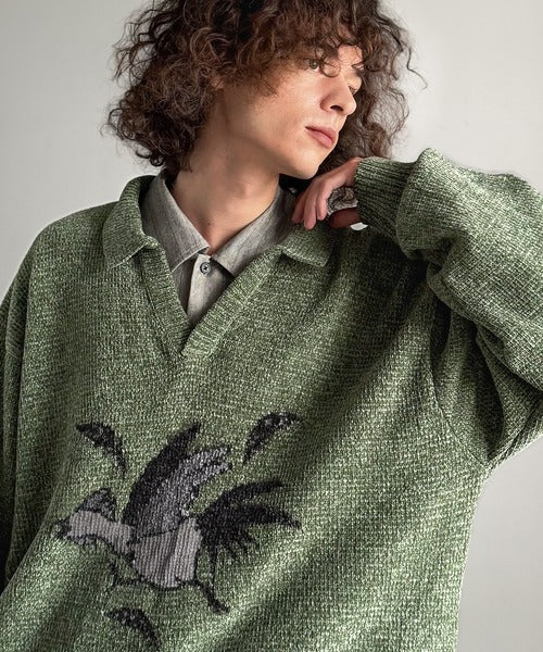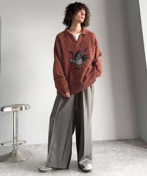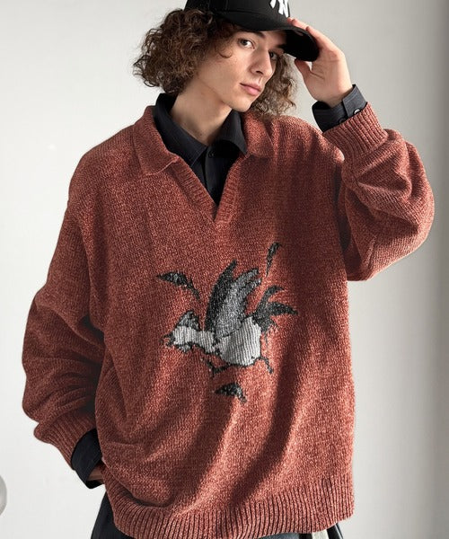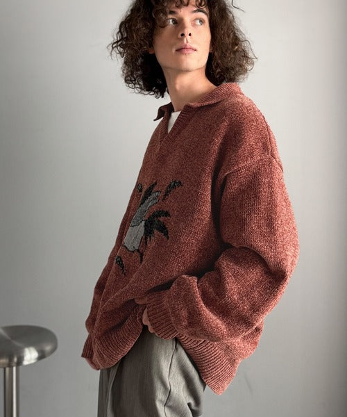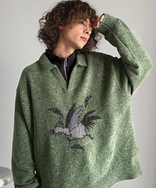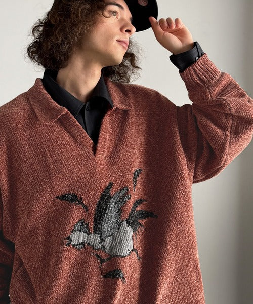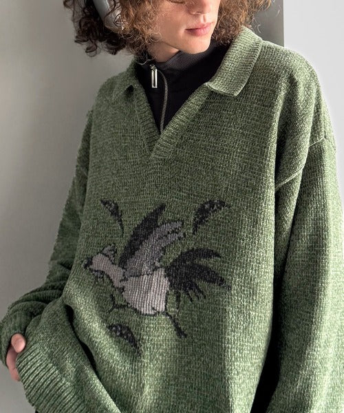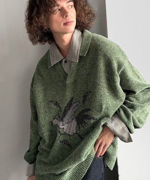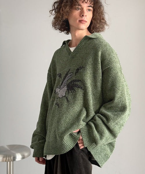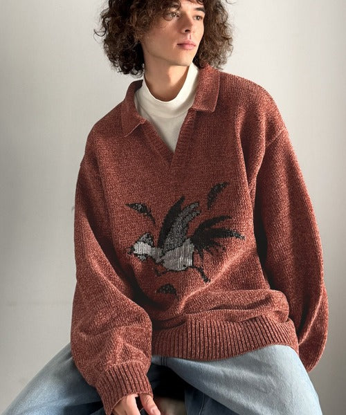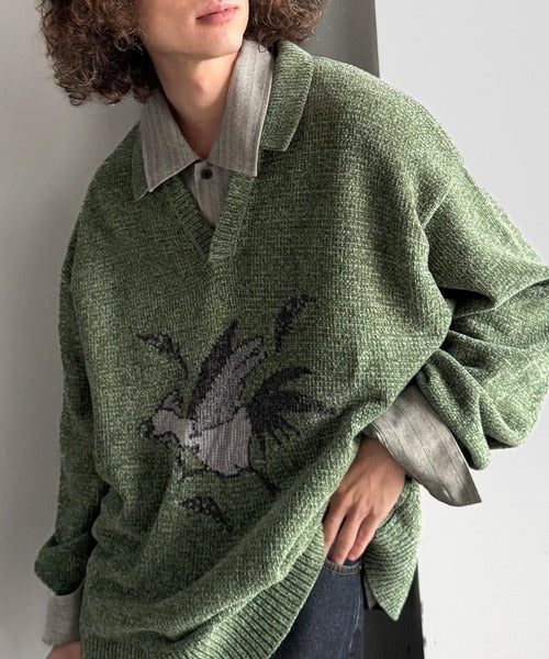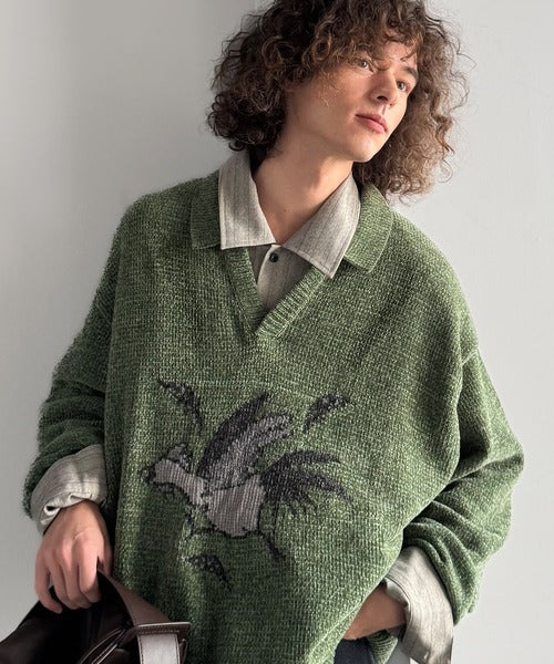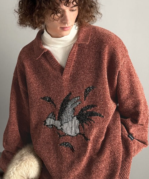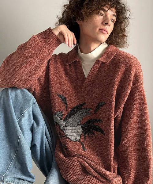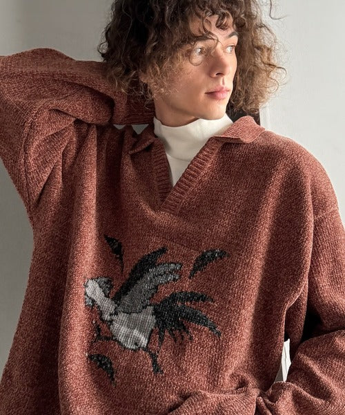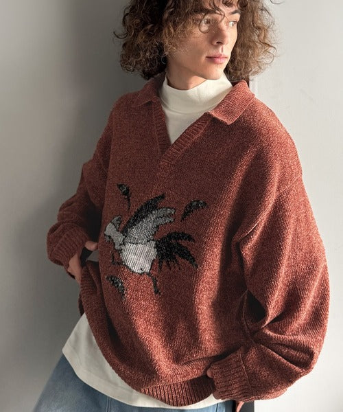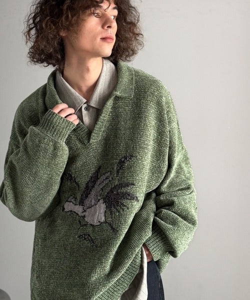 【Classical Origin】「個性で遊ぶ。」モール糸使いルースター柄襟付きVネックセーター/Chenille Yarn Rooster Motif Collared V-Neck Sweater co1150075