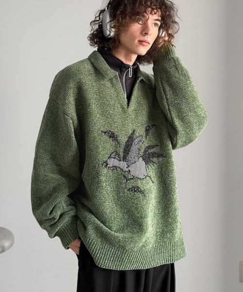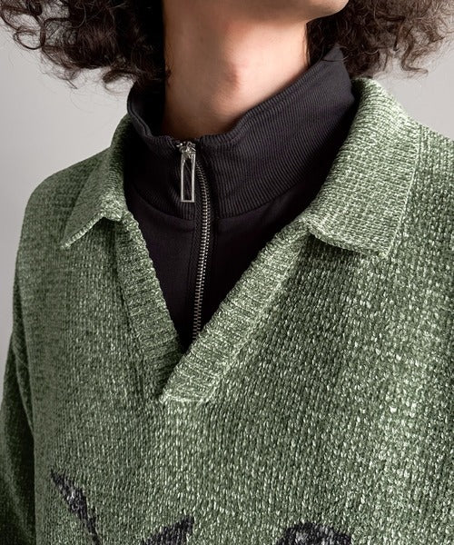 モール糸使いルースター柄襟付きVネックセーター」