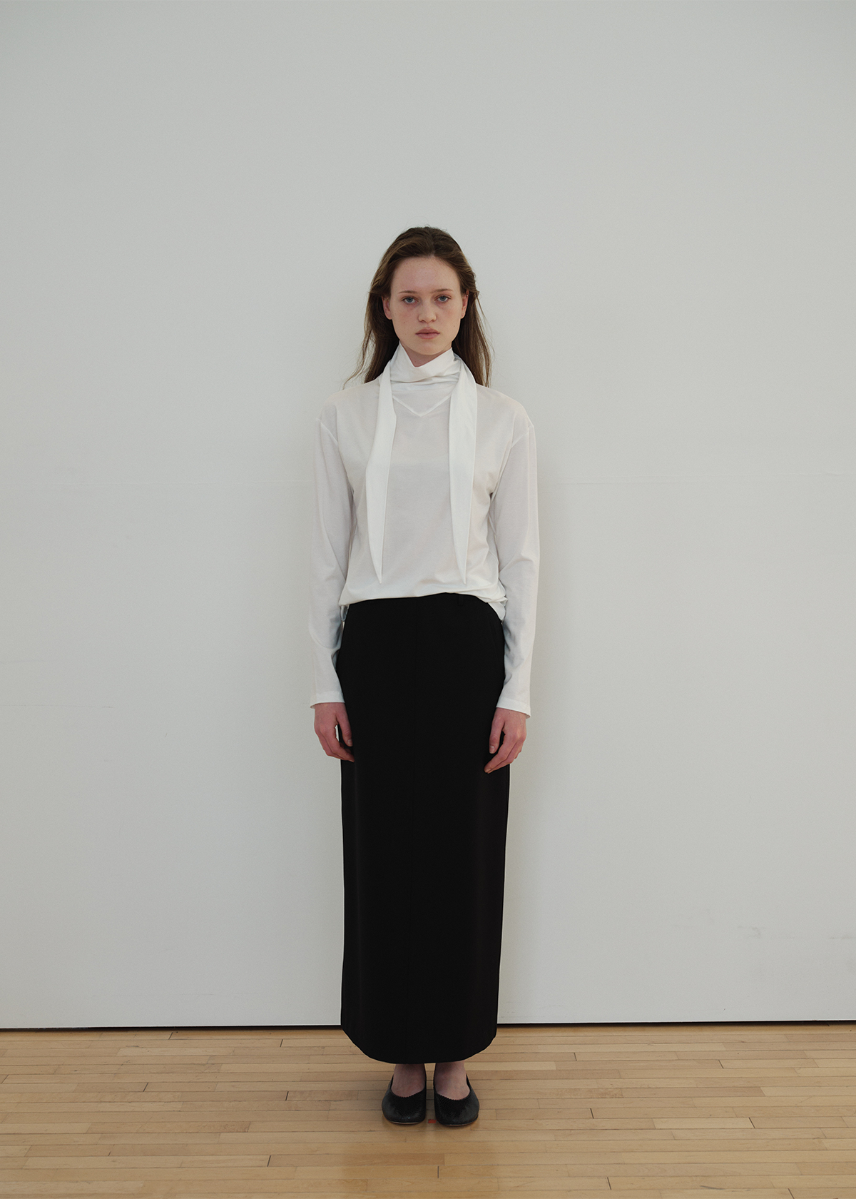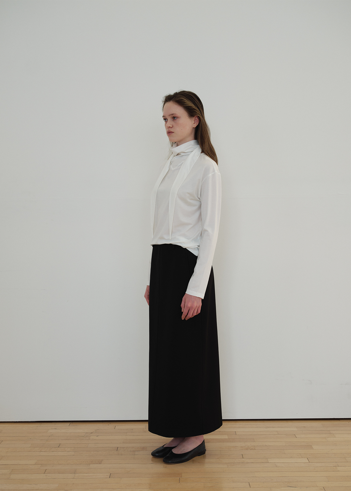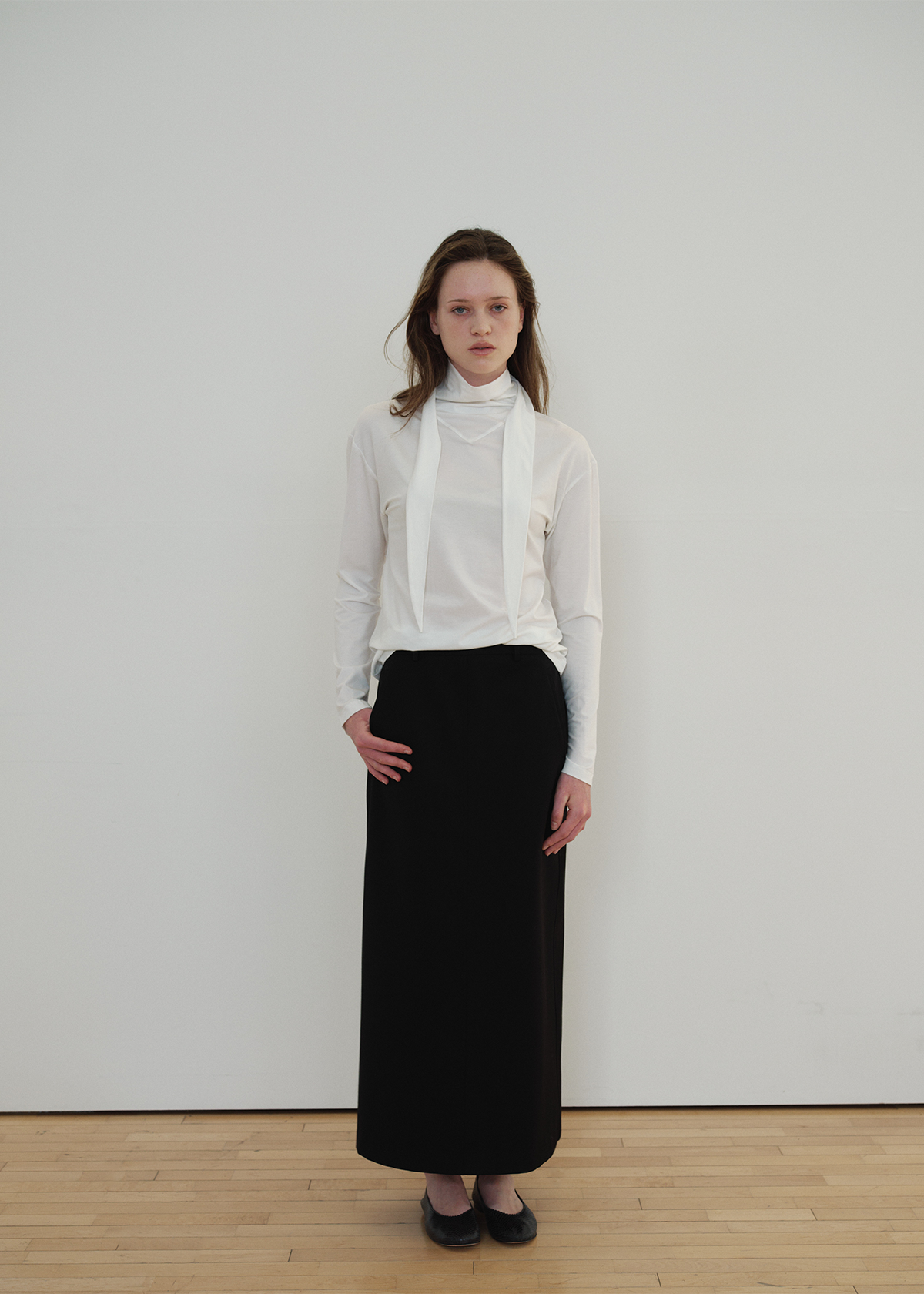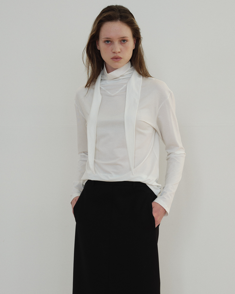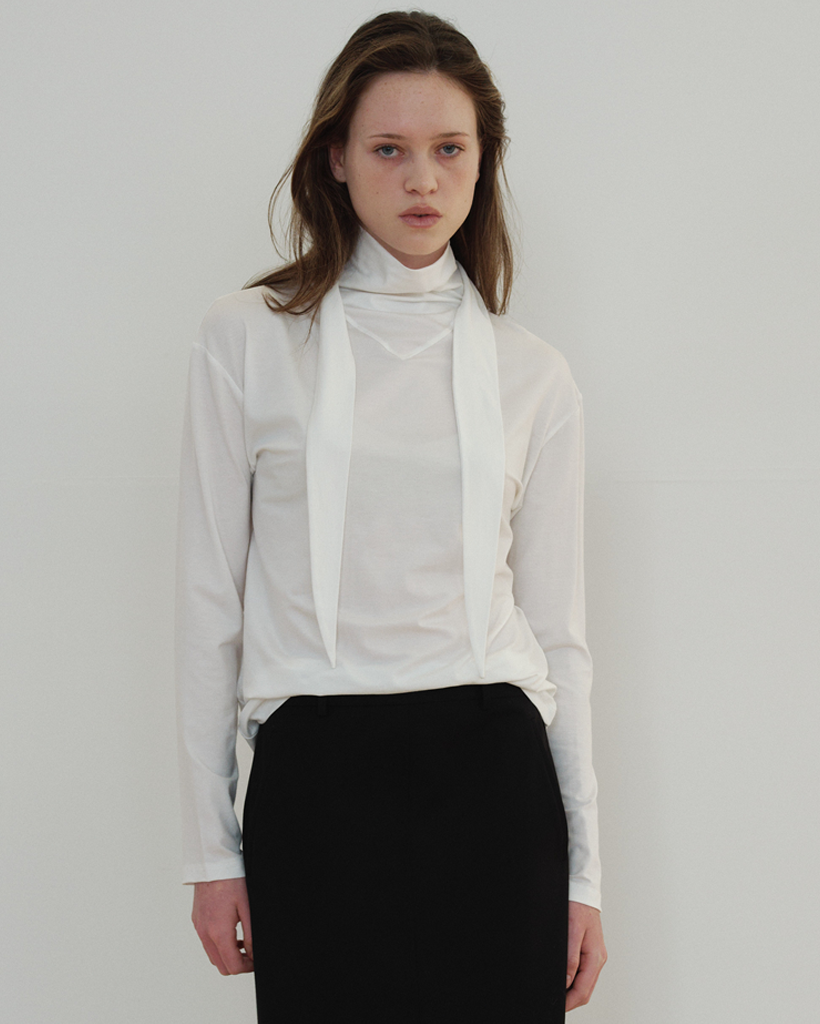 ネックラインはハイネックとタイが身頃に固定された構造で、結ばずに自然に垂らしたり、軽く巻いて演出したりしても崩れにくくムードを完成させます。一般的な Tシャツ型の袖でデイリーに合わせやすく、スラックス・デニム・スカートのどれにも洗練されたポイントを添えるアイテムです。