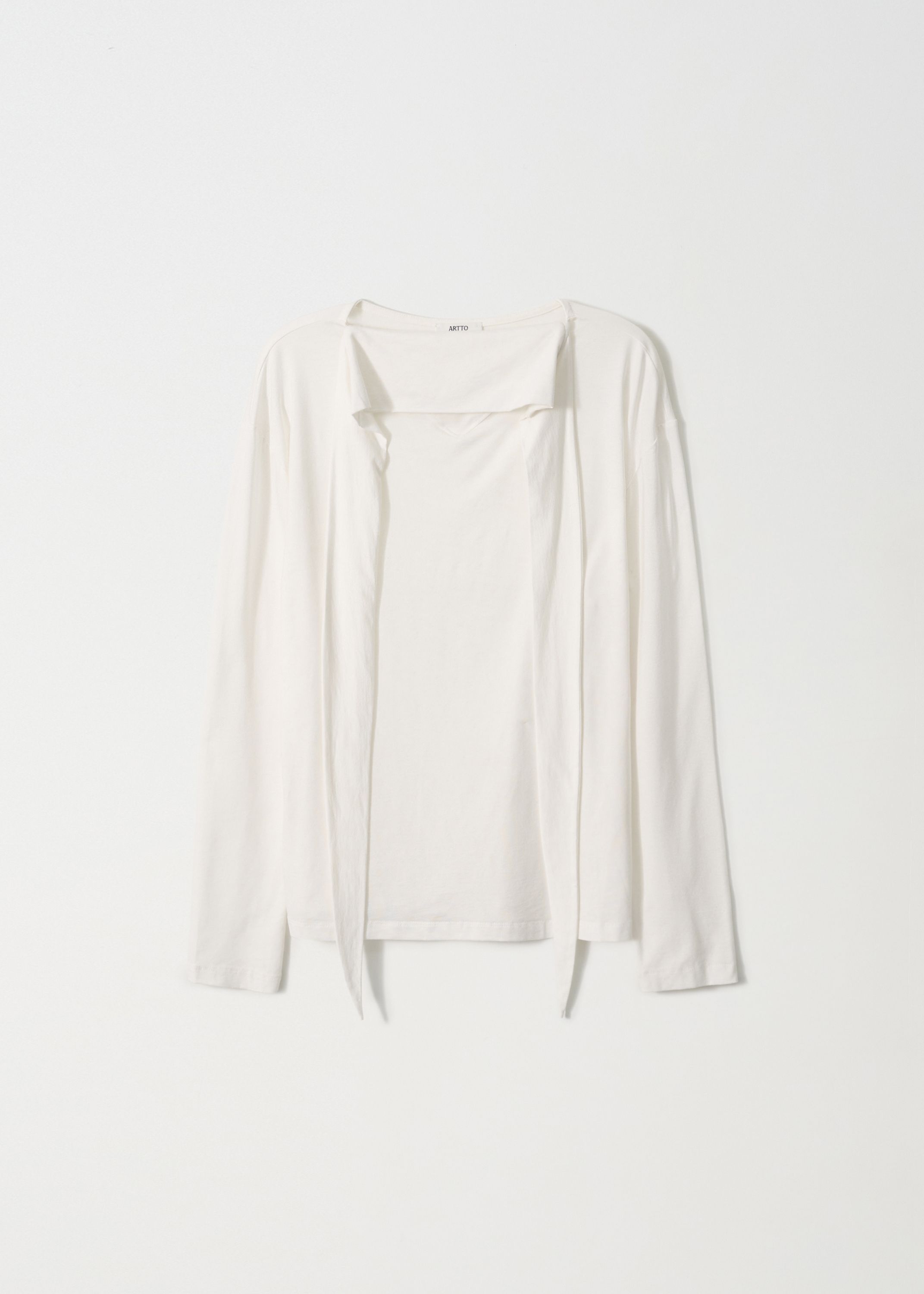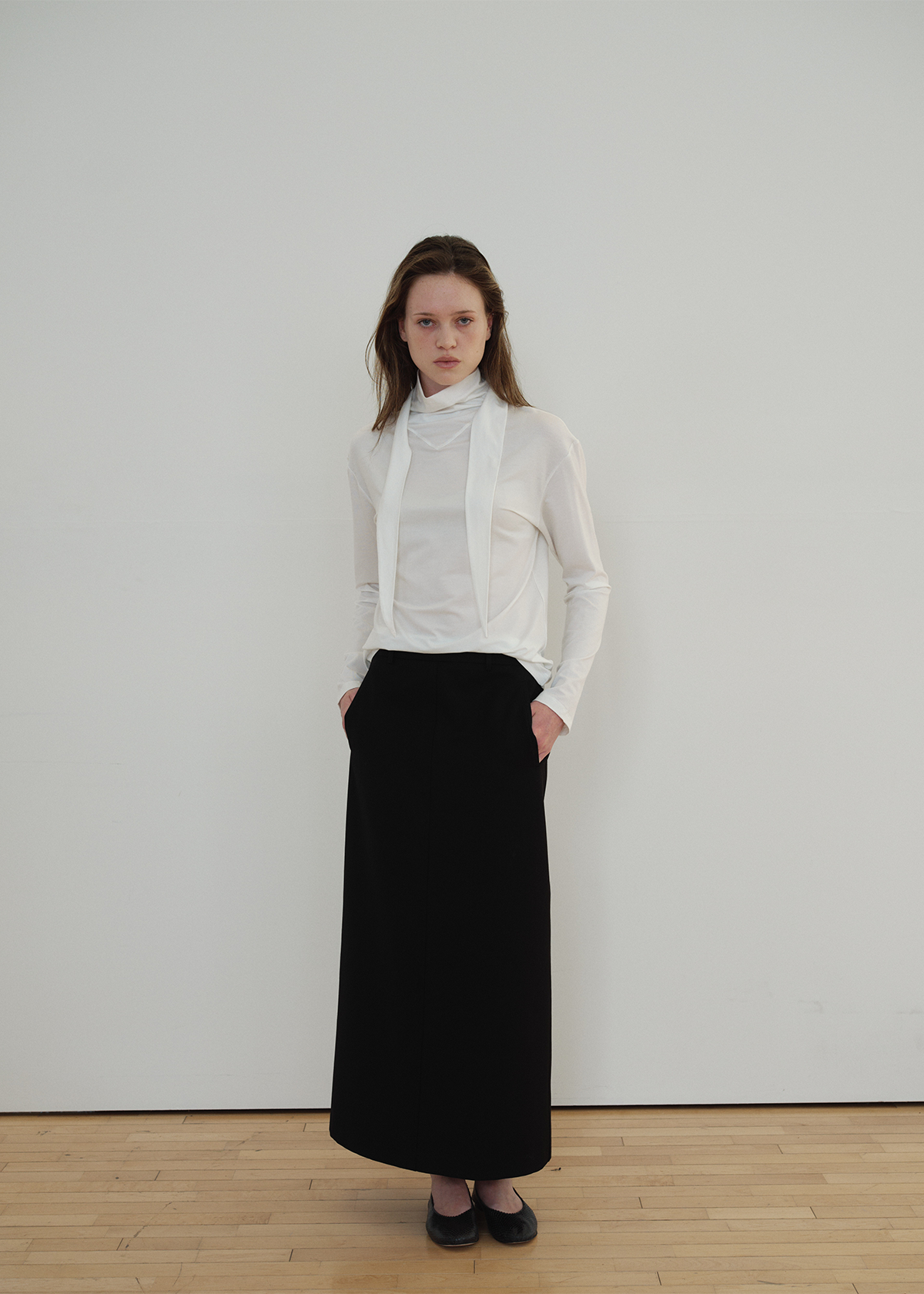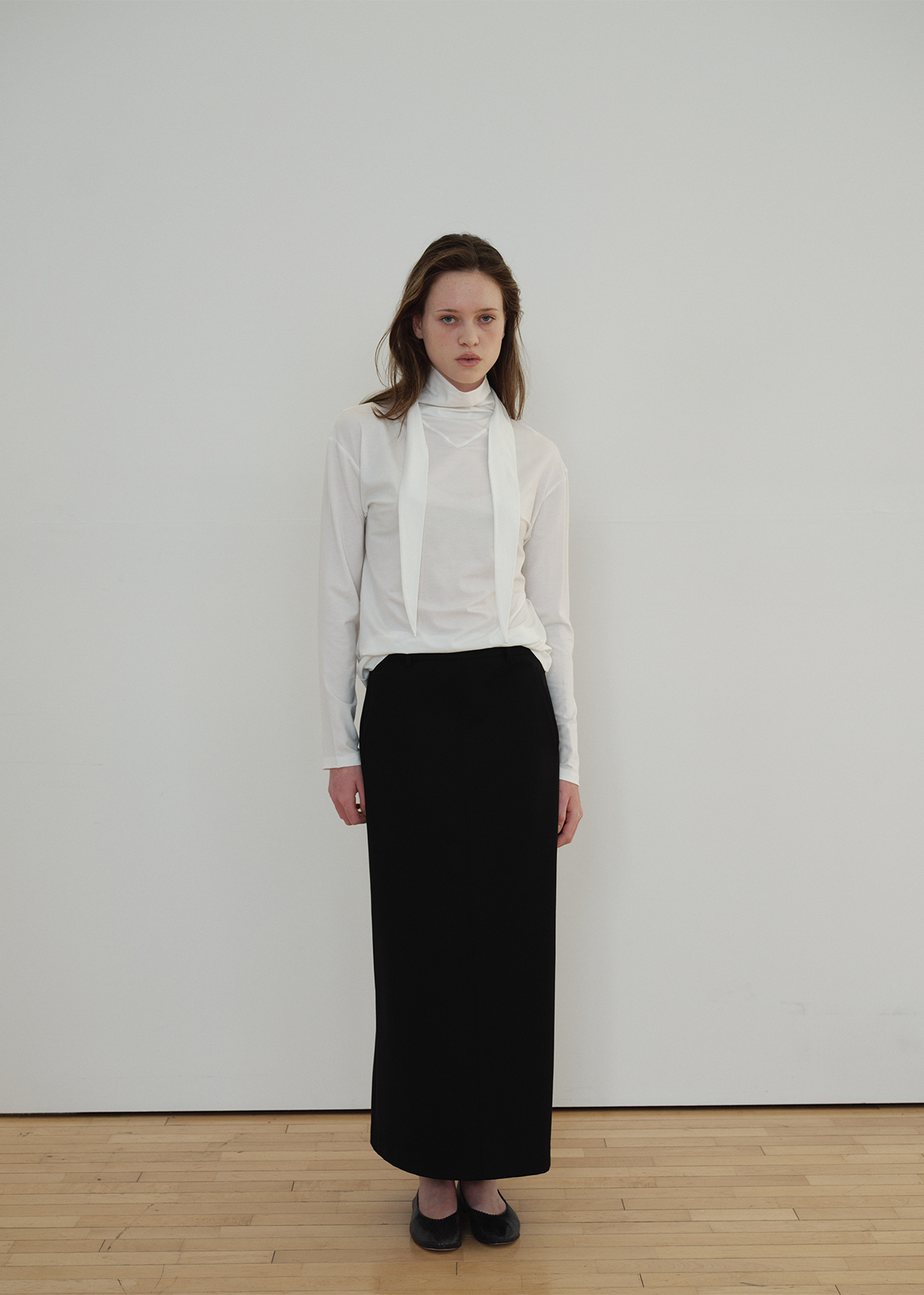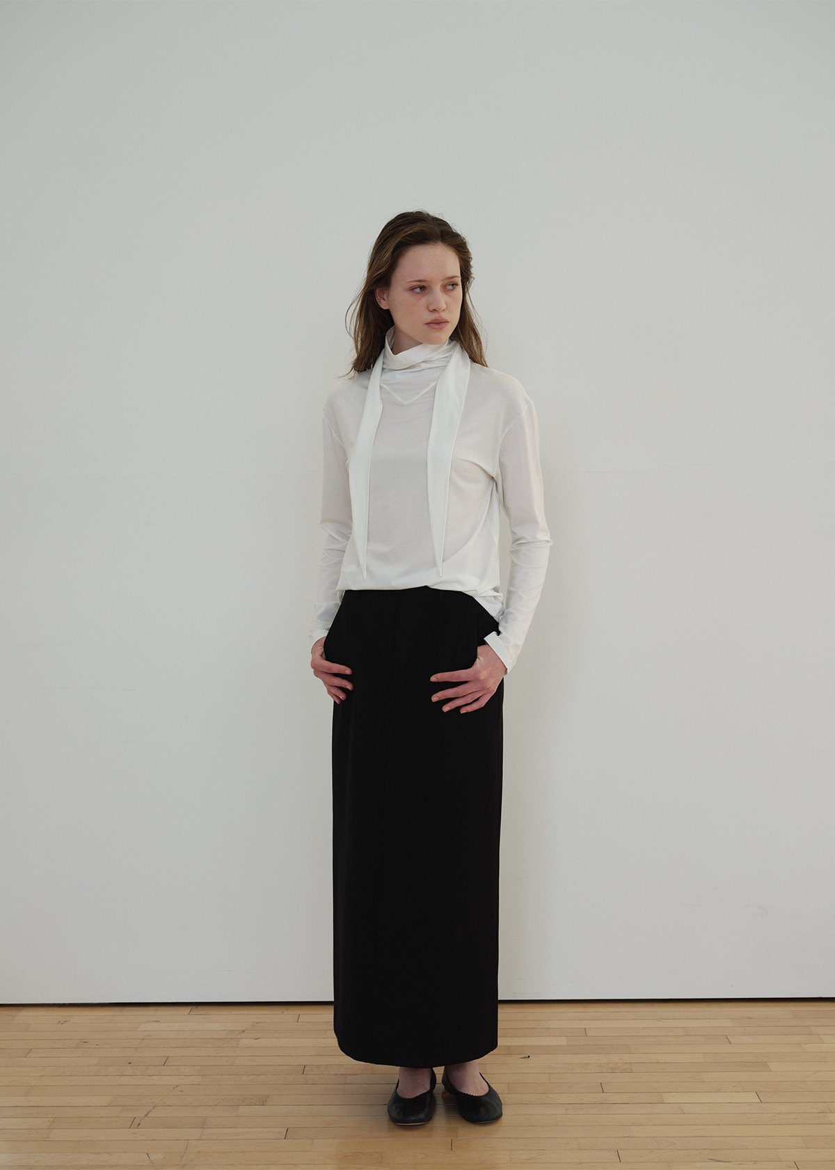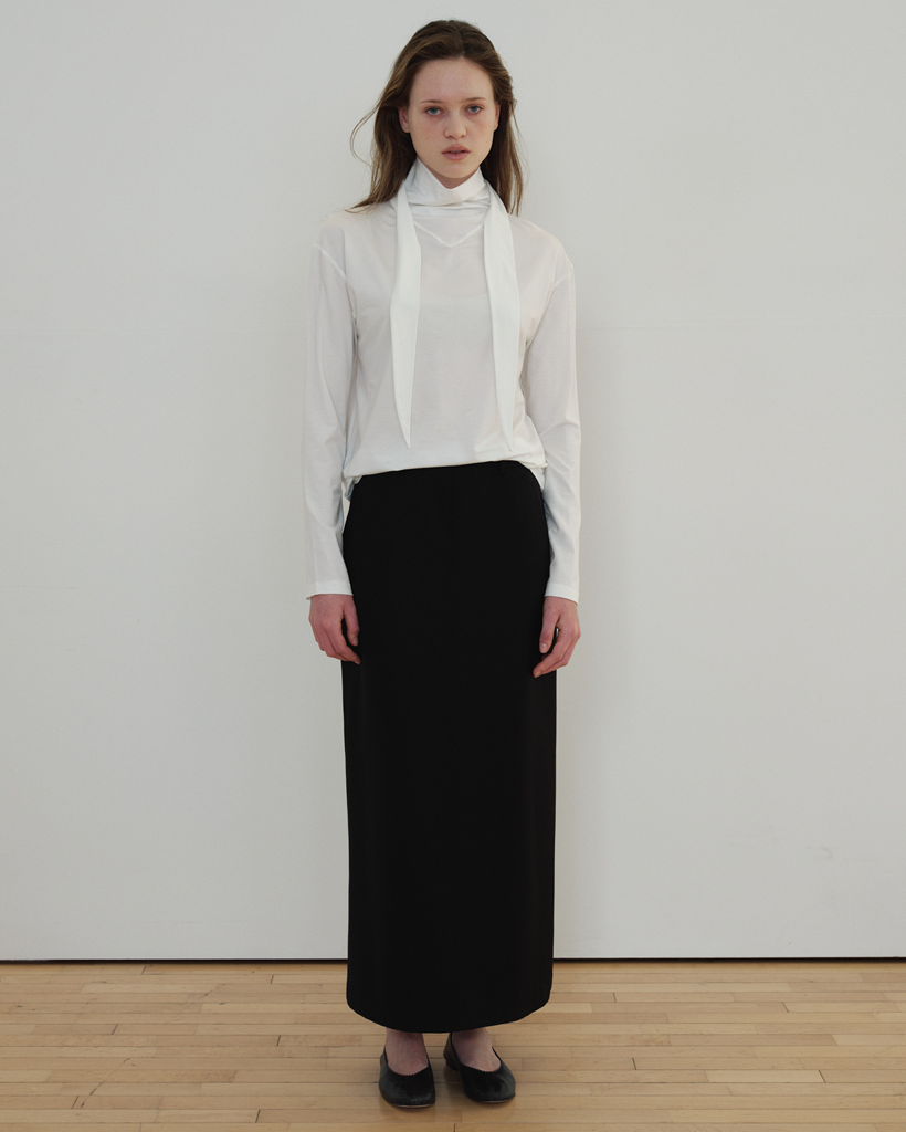 ネックラインはハイネックとタイが身頃に固定された構造で、結ばずに自然に垂らしたり、軽く巻いて演出したりしても崩れにくくムードを完成させます。一般的な Tシャツ型の袖でデイリーに合わせやすく、スラックス・デニム・スカートのどれにも洗練されたポイントを添えるアイテムです。