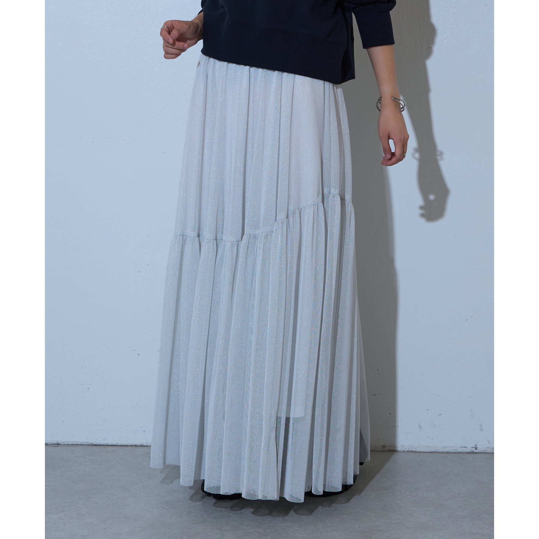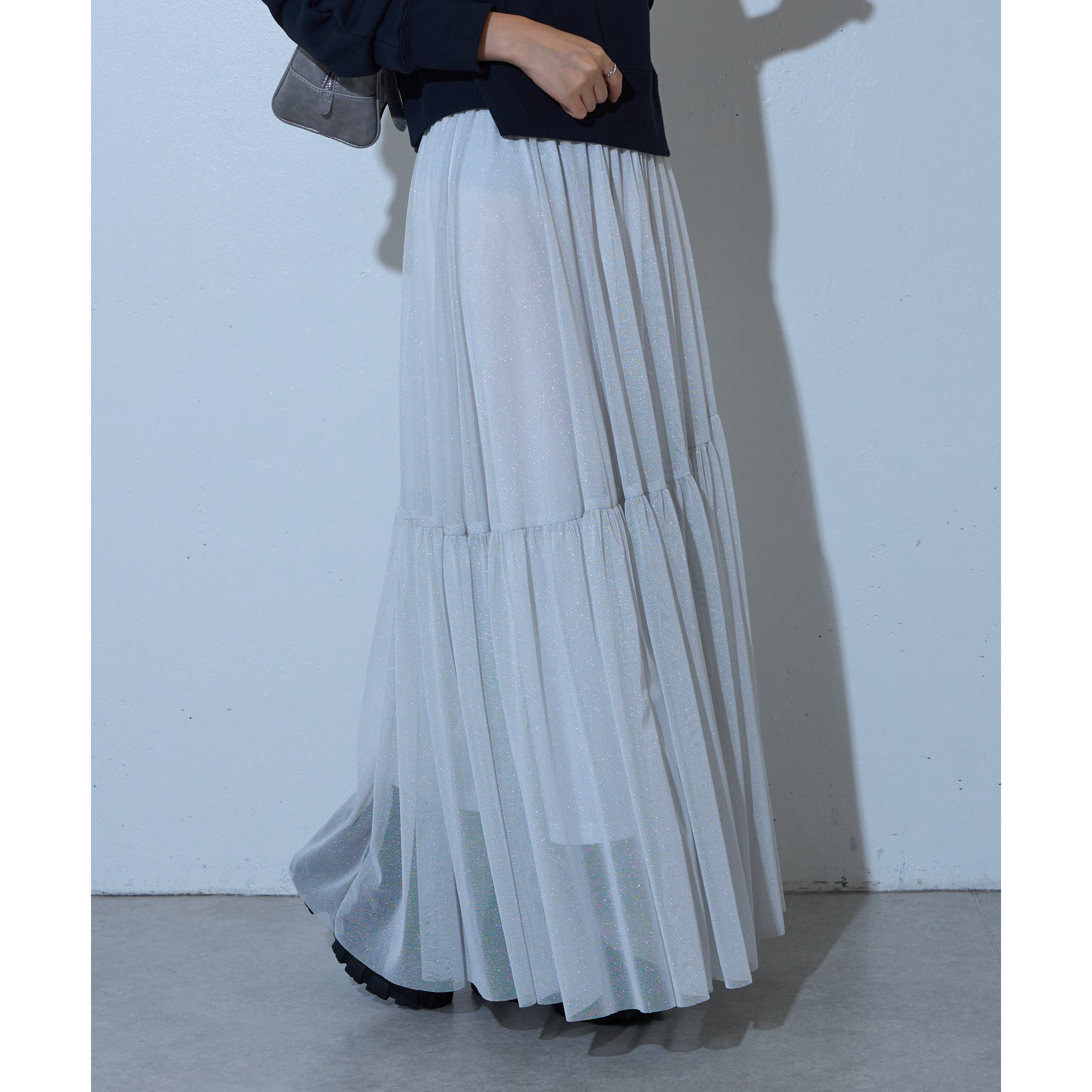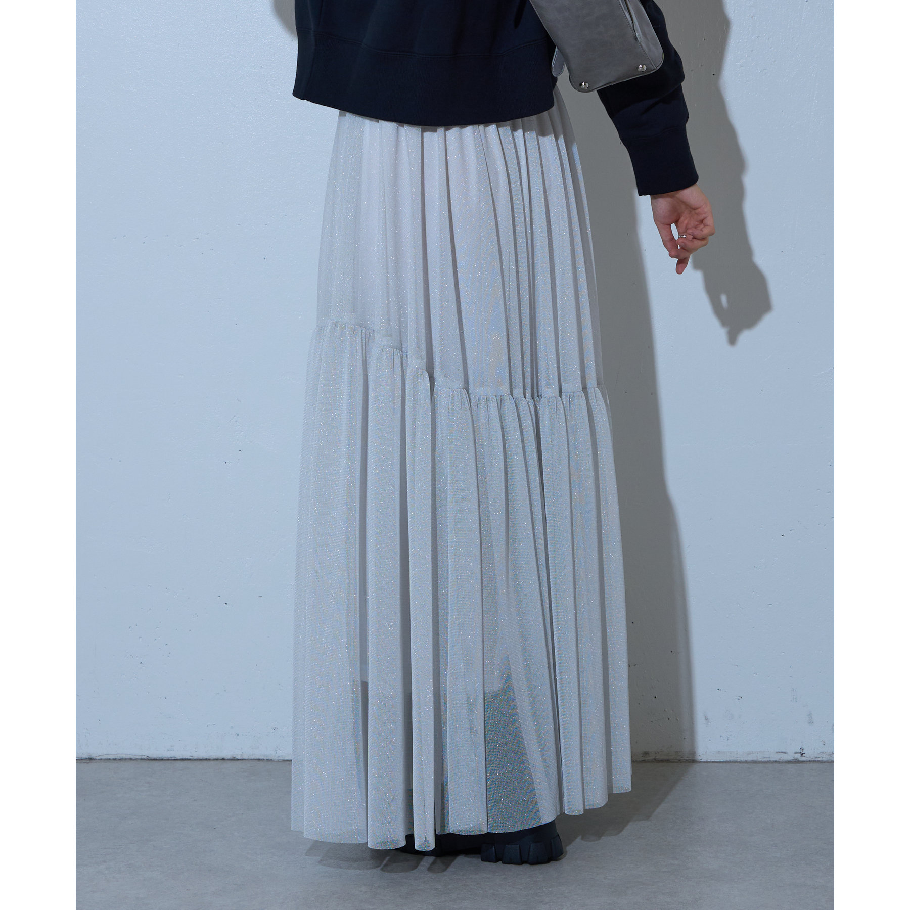 トレンド感のある繊細なラメを施したチュール素材のティアードスカート