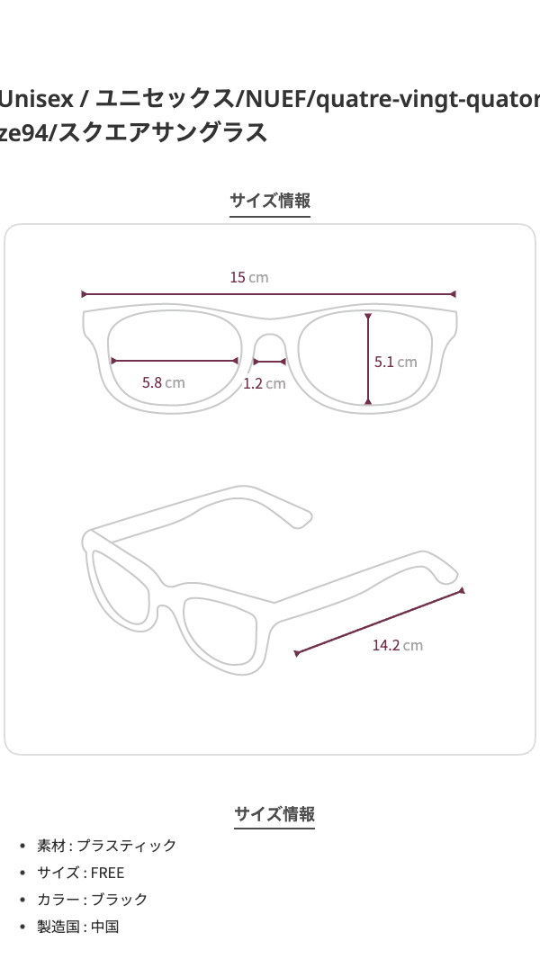 SIZE GUIDEフレーム正面150mmレンズ横58mmレンズ高さ51mmブリッジ12mmテンプル長さ142mm重量20g、素材:プラスティック