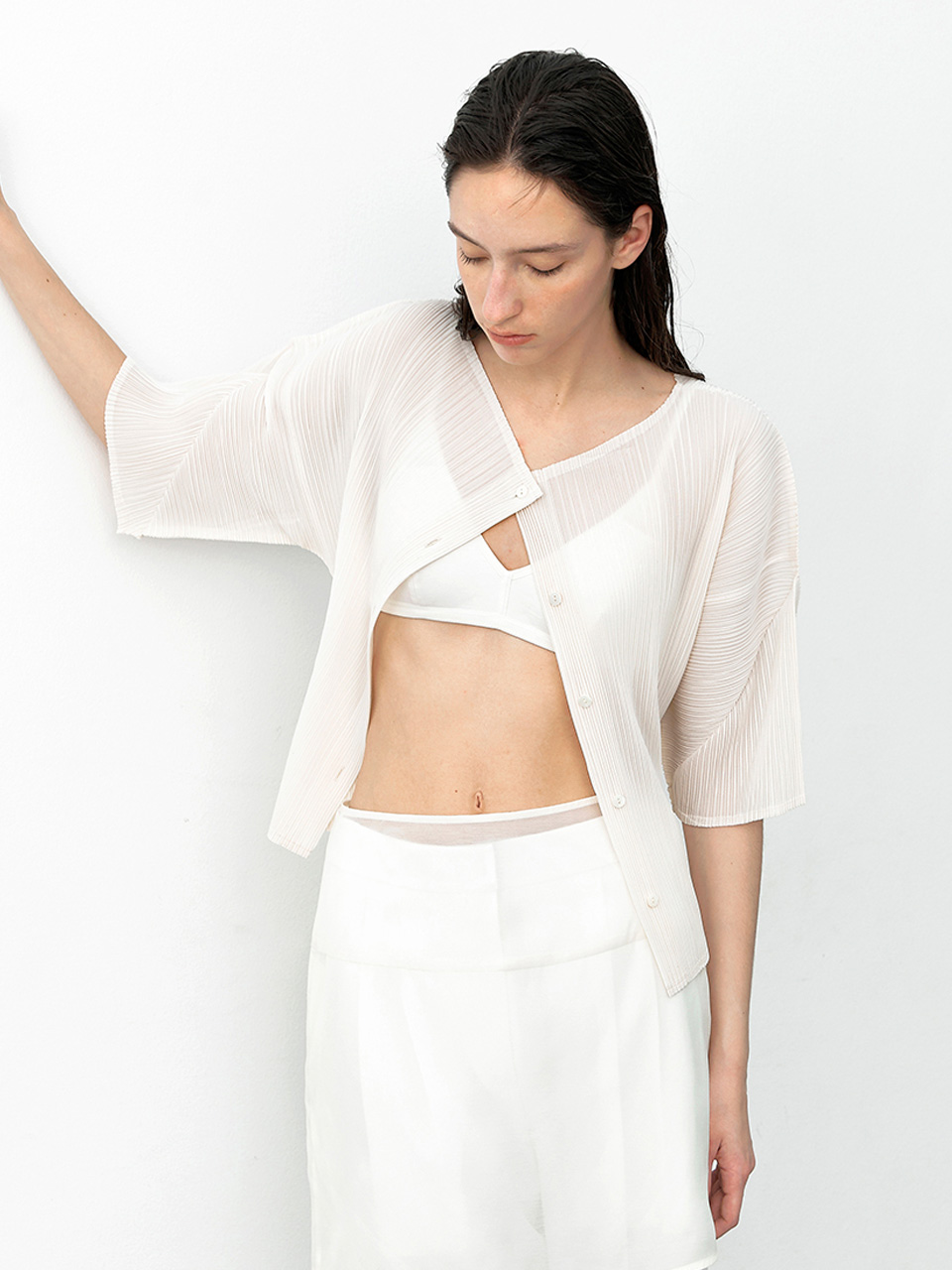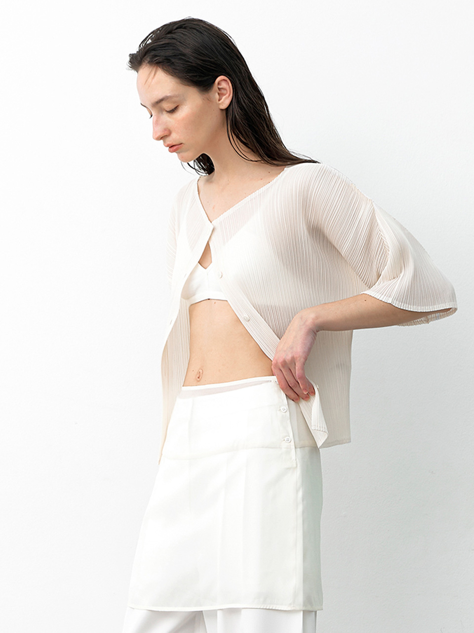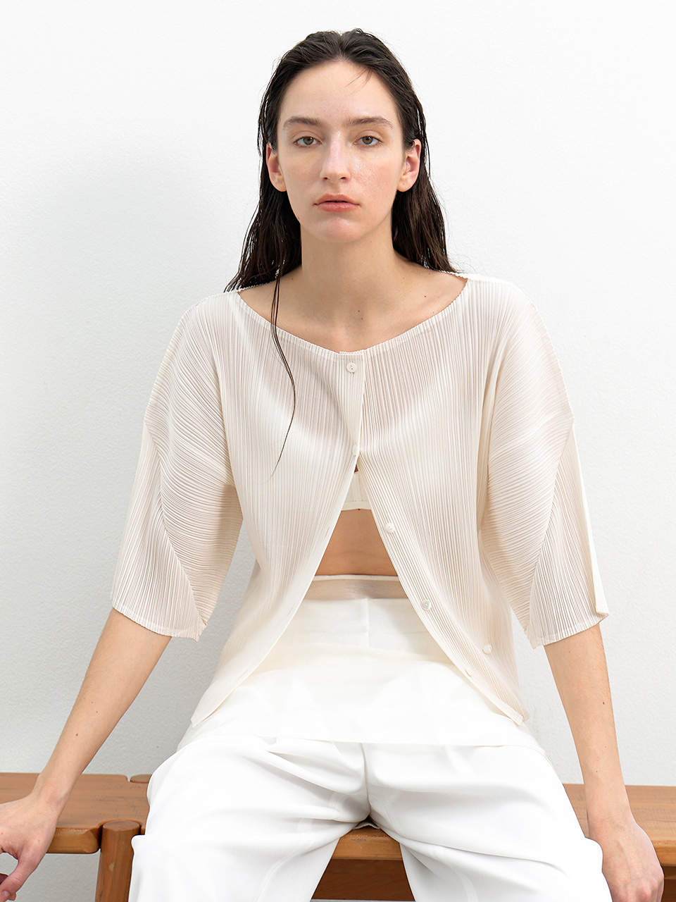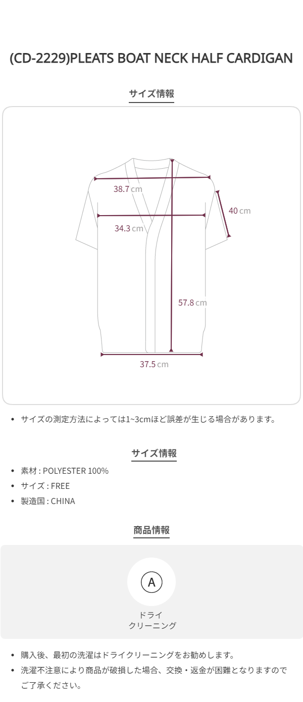 (CD-2229)PLEATS BOAT NECK HALF CARDIGAN