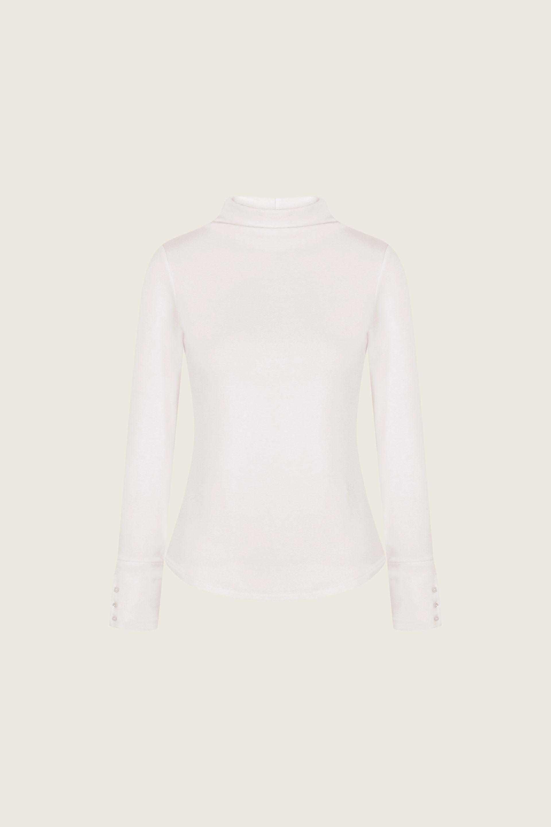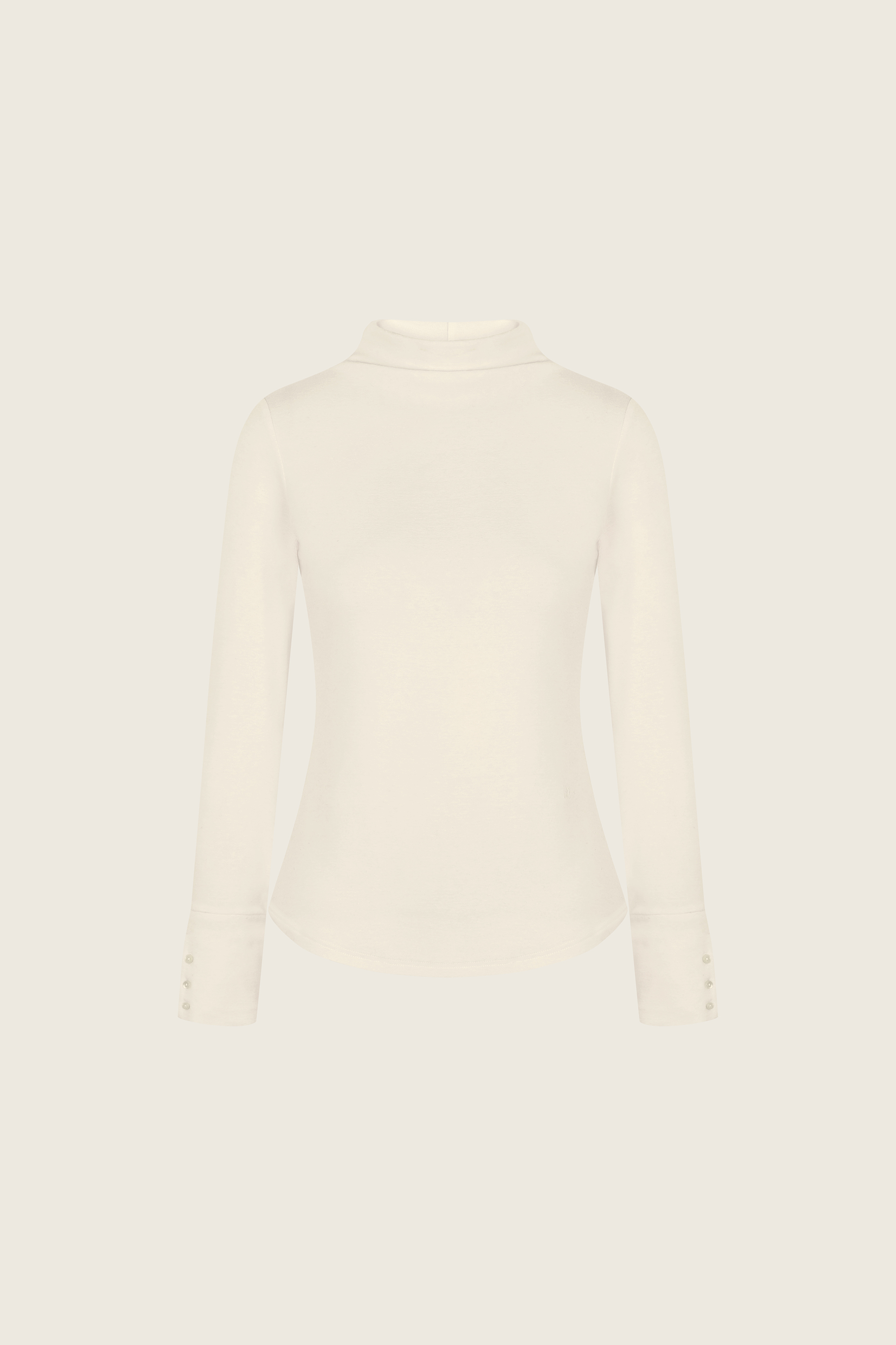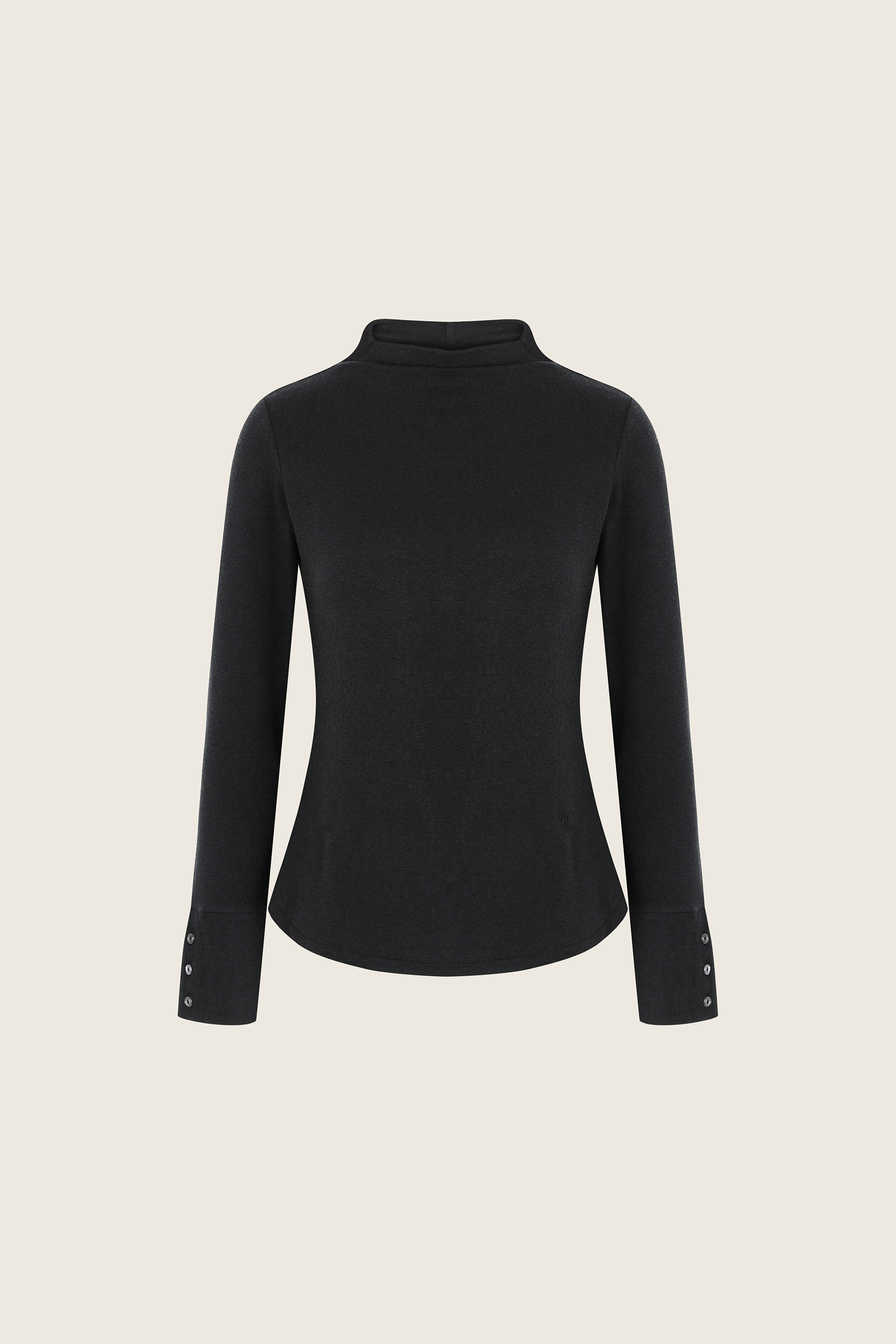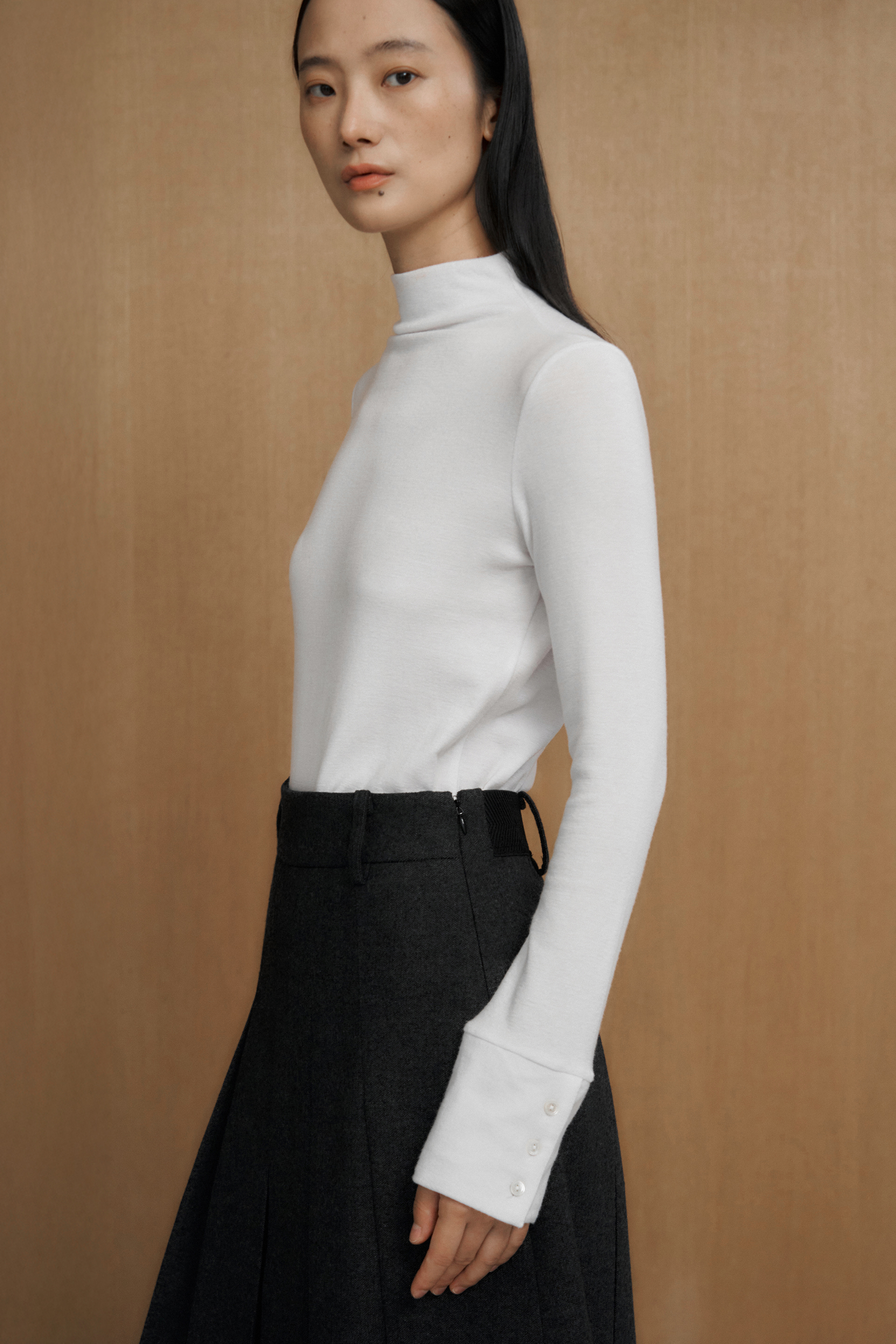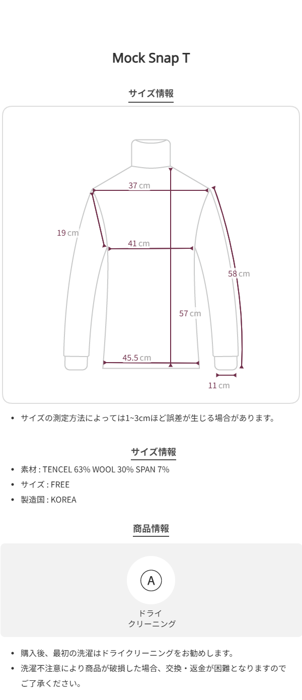 テンセル・ウール・スパン混 / モックネック / カフスディテール / 背面切替ライン / 貝ボタン / ロゴ刺繍ディテール