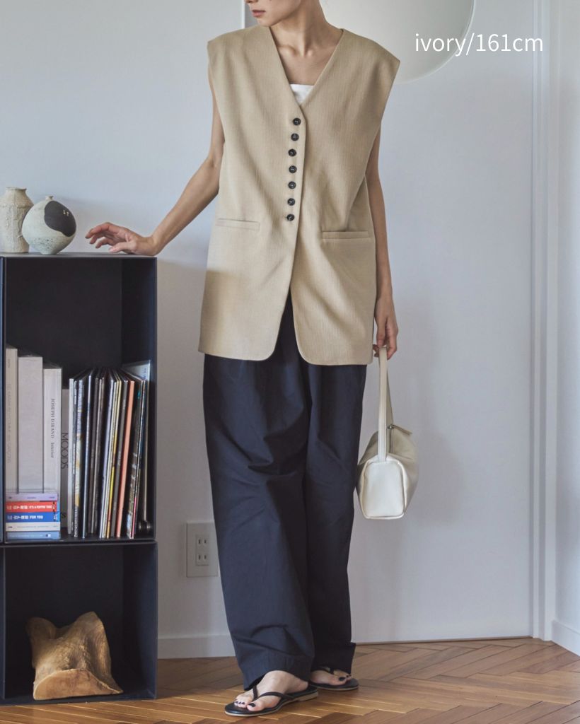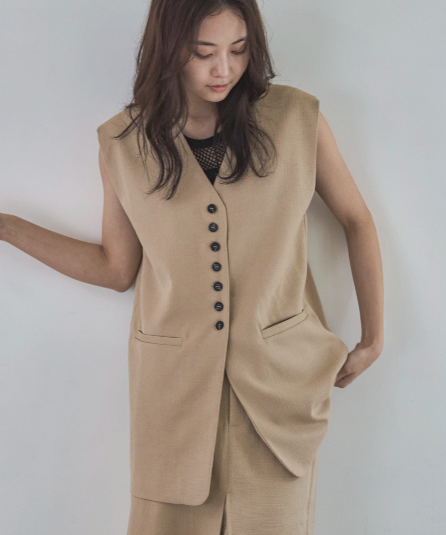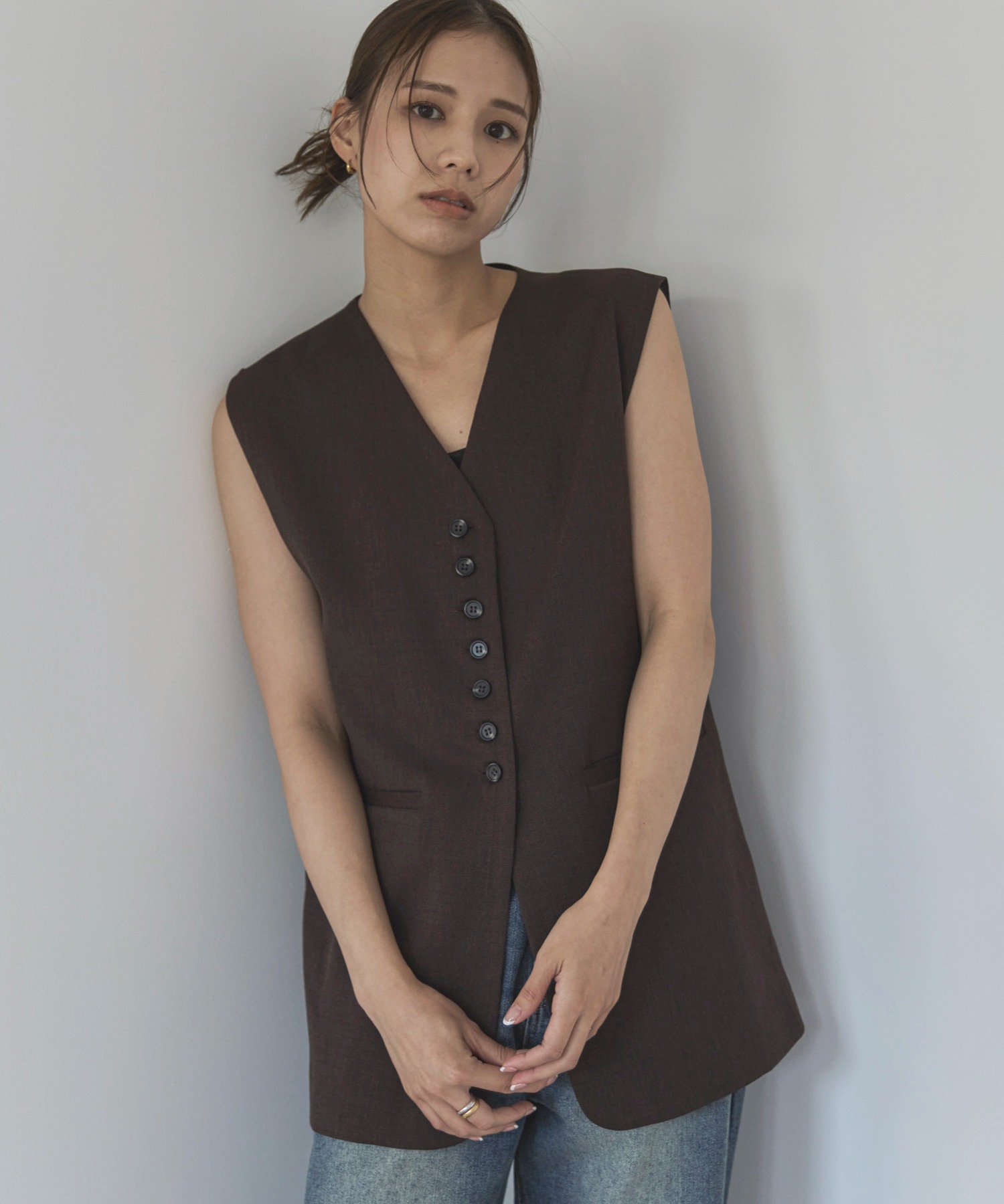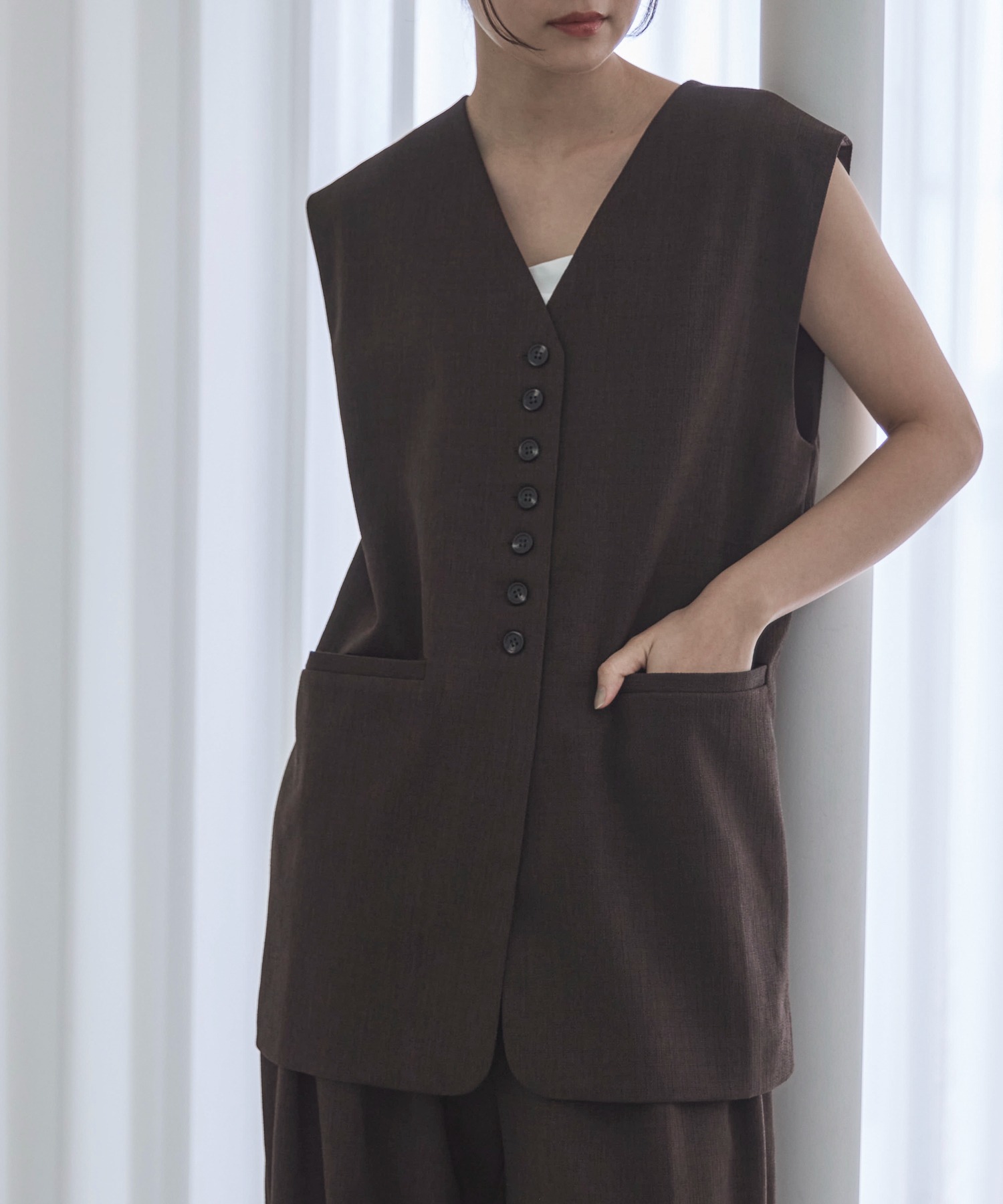 中心に寄せた多ボタンデザインと、ネックの開き具合もやや控えめにしたミニマルさが特徴。