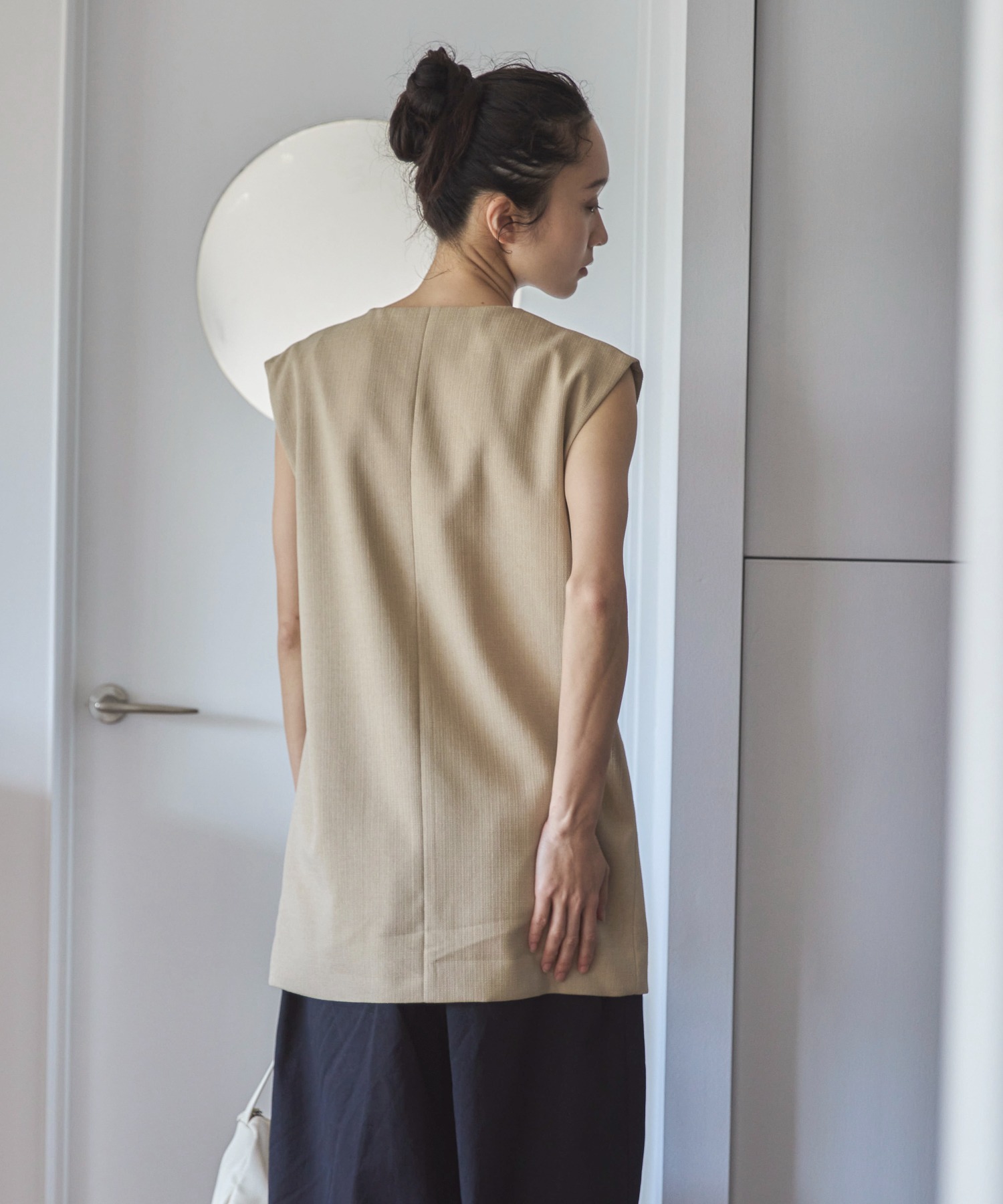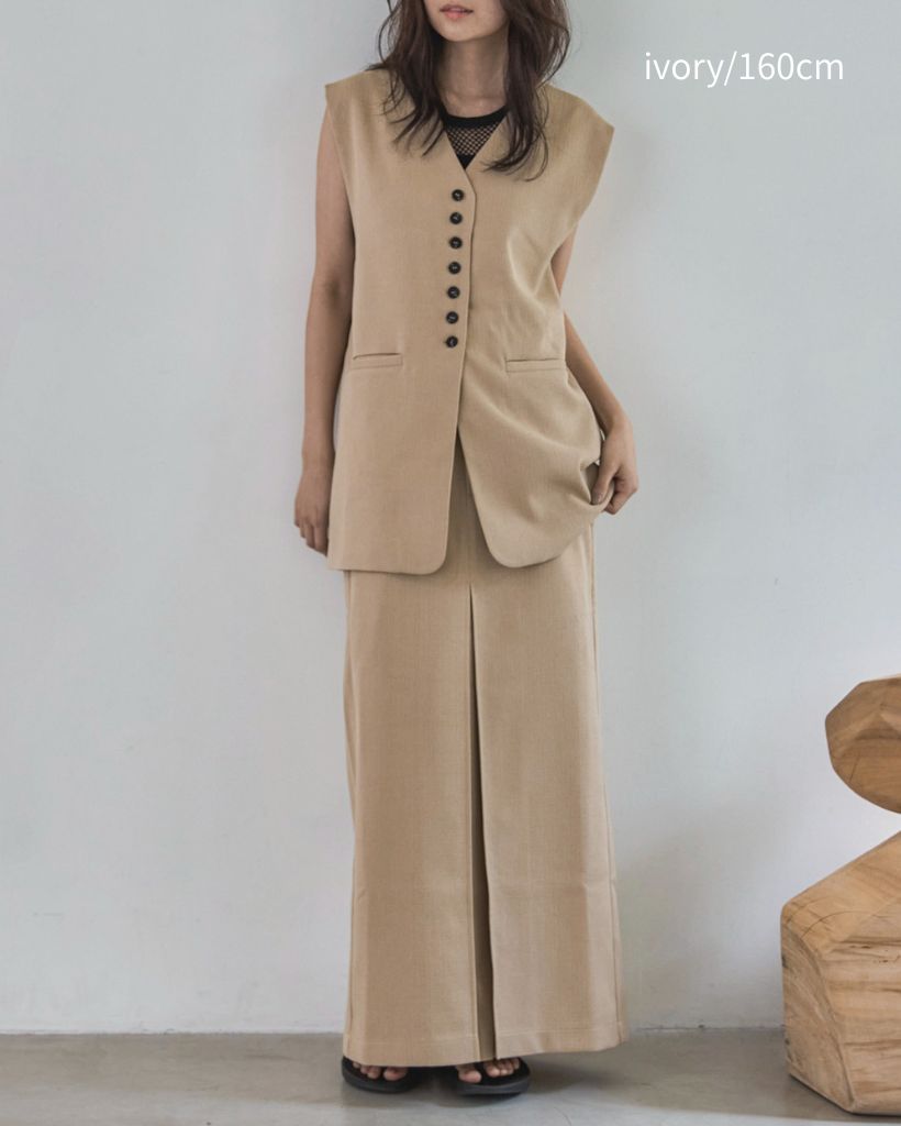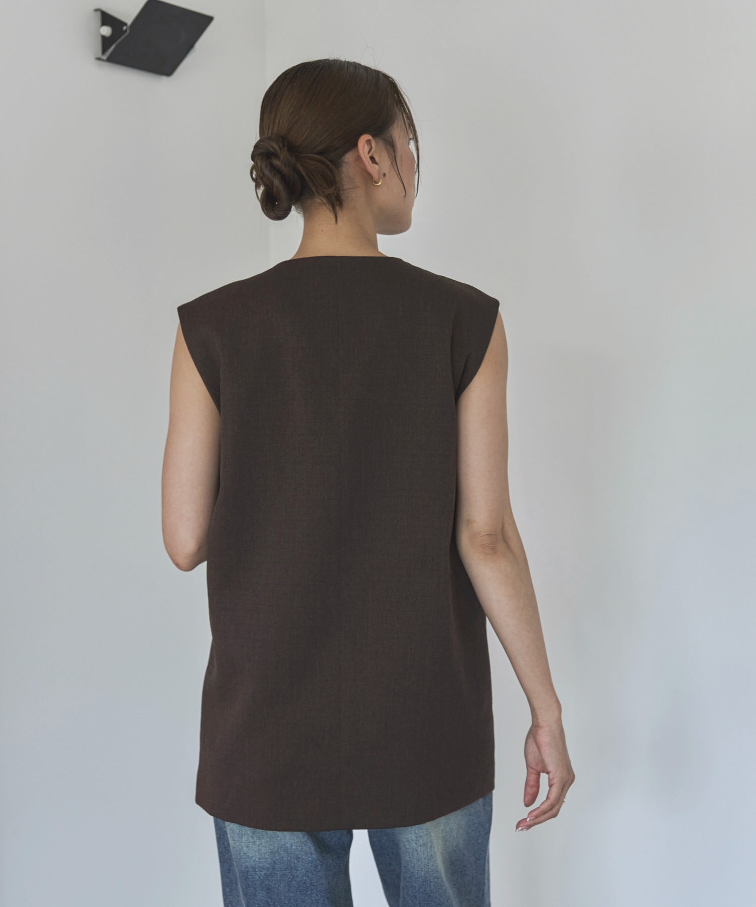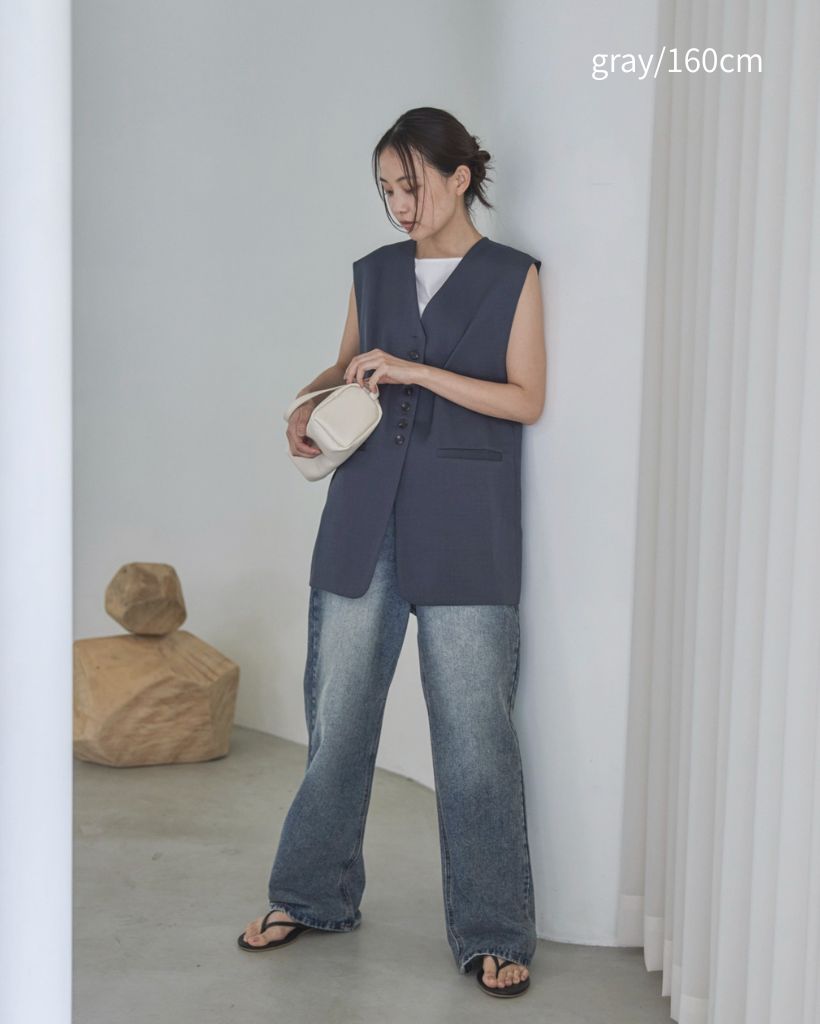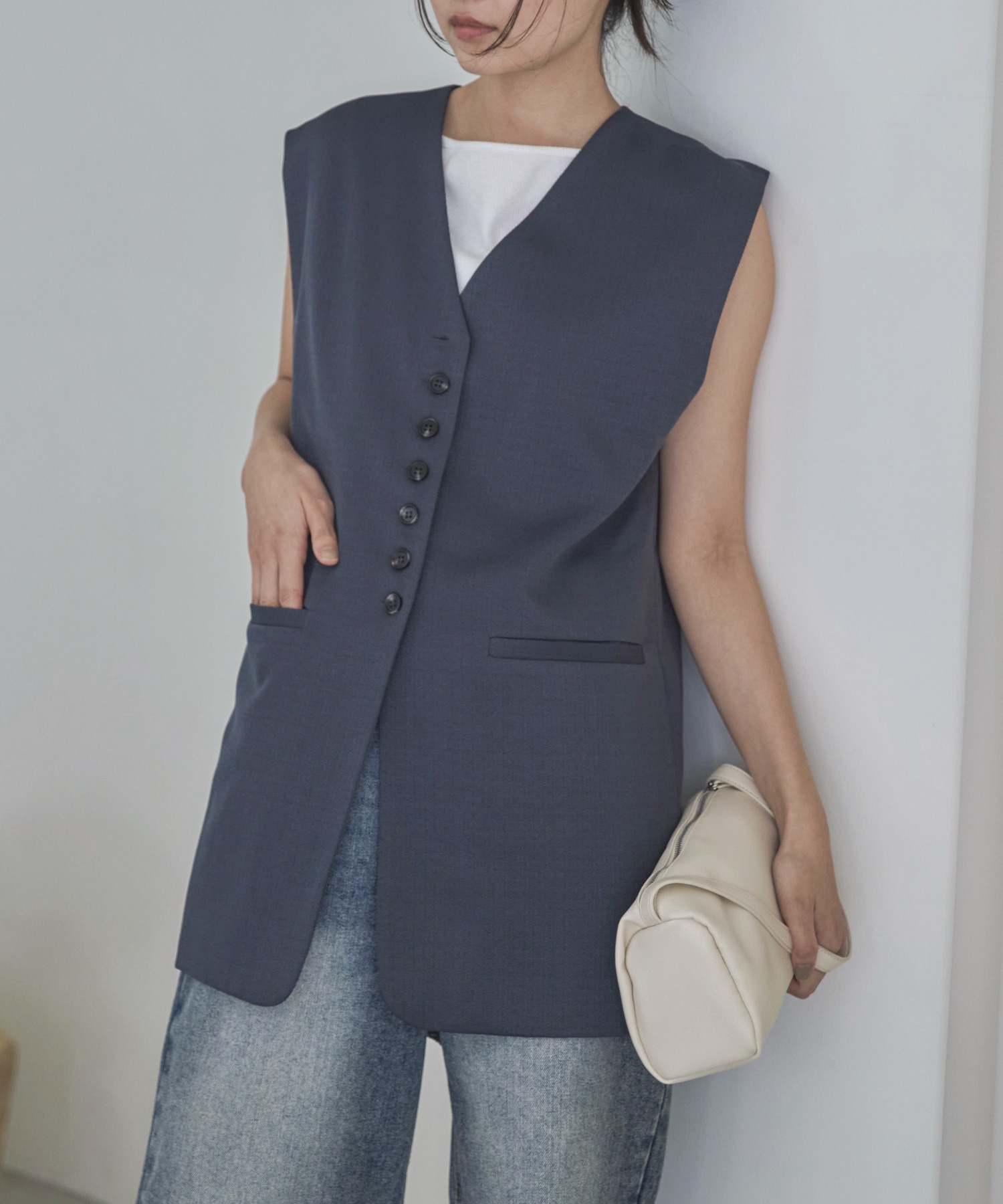 中心に寄せた多ボタンデザインと、ネックの開き具合もやや控えめにしたミニマルさが特徴。