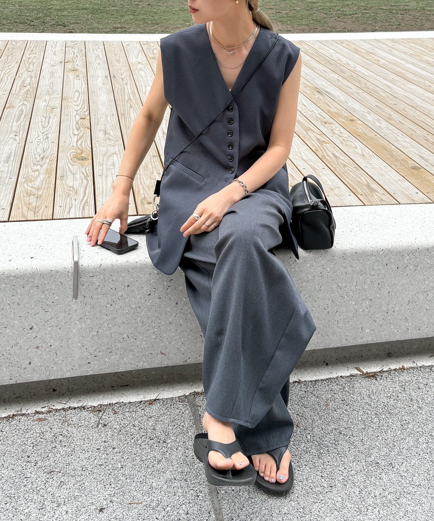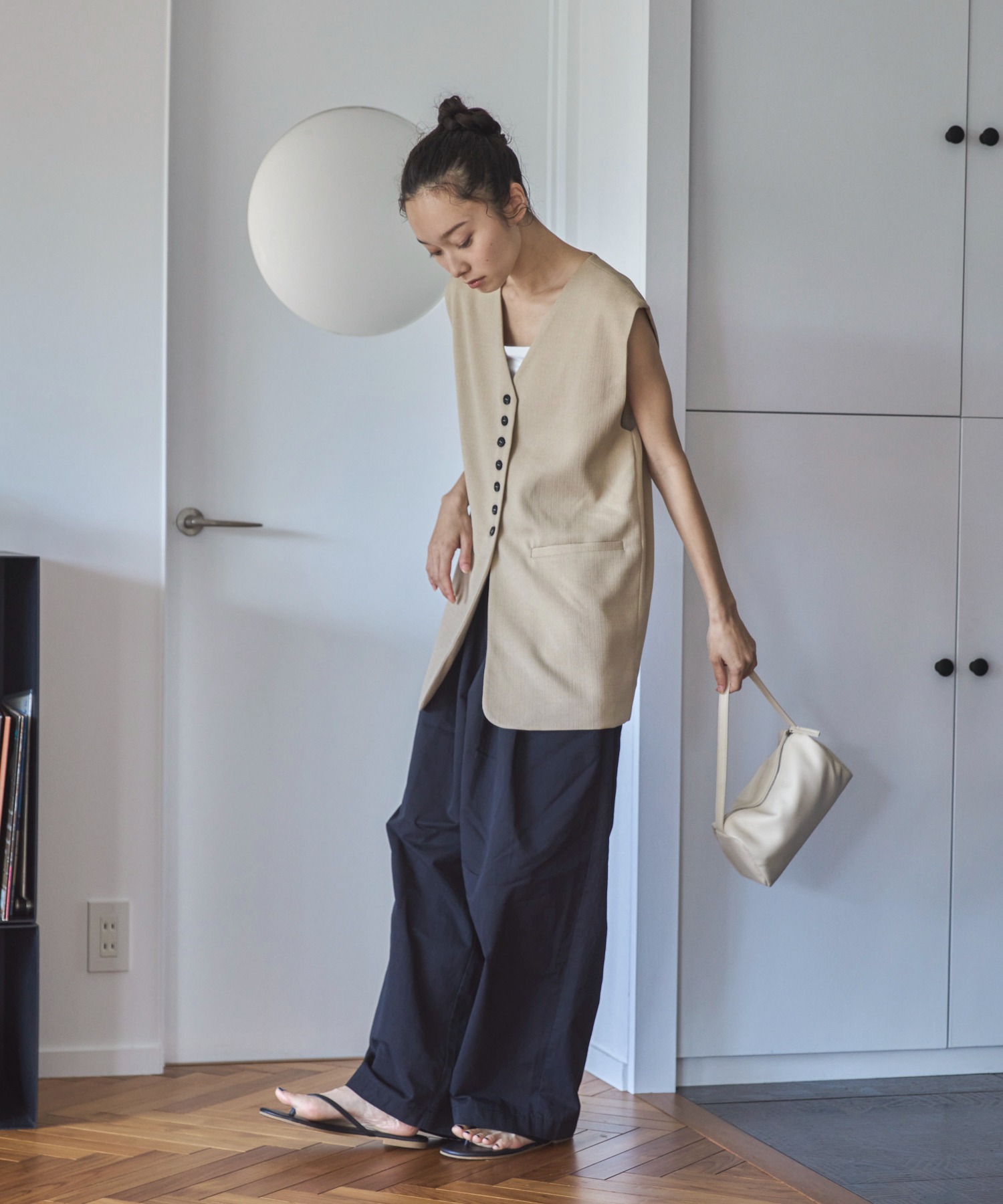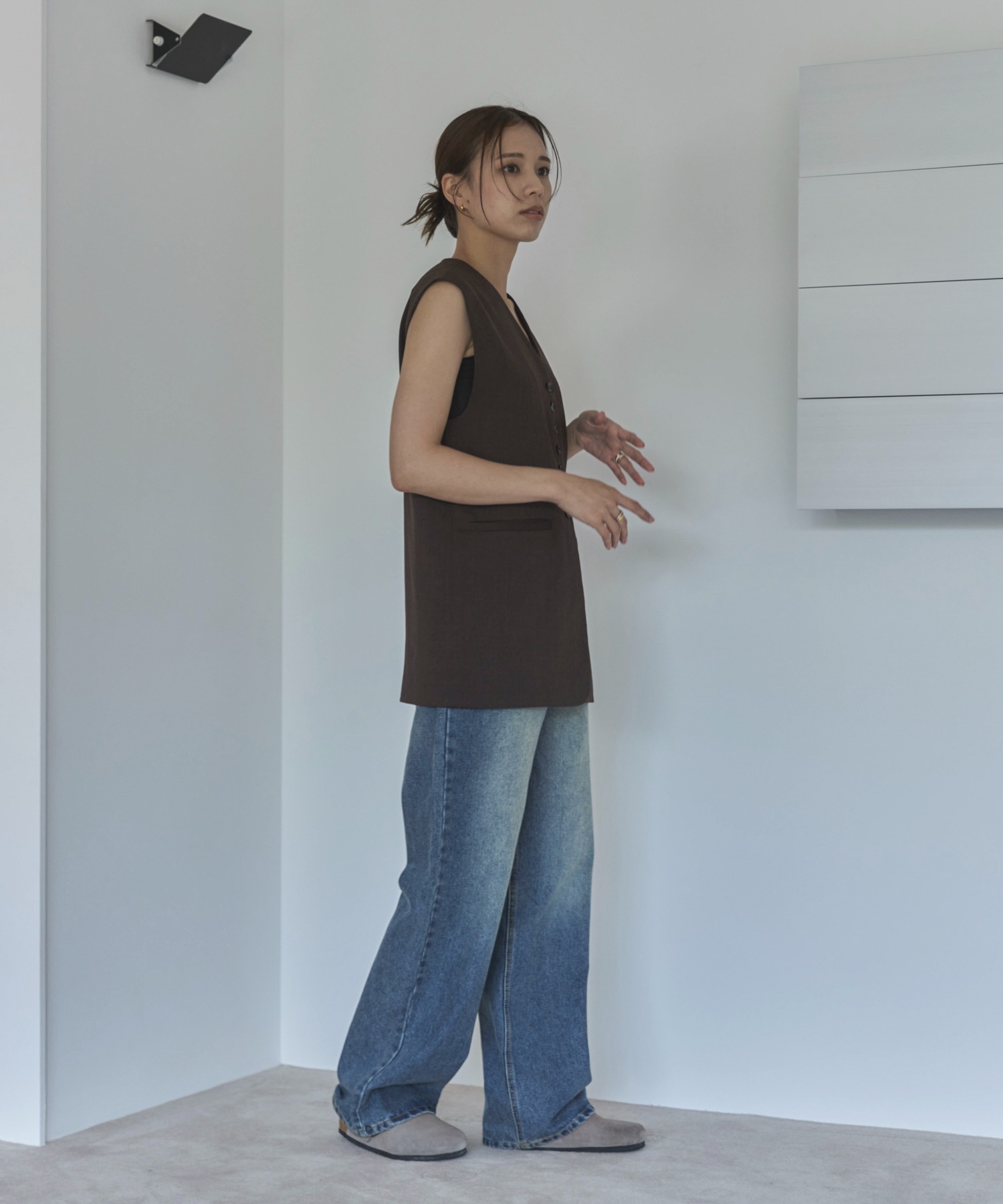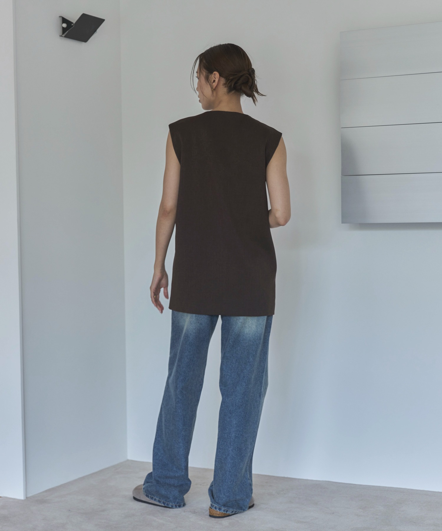 中心に寄せた多ボタンデザインと、ネックの開き具合もやや控えめにしたミニマルさが特徴。