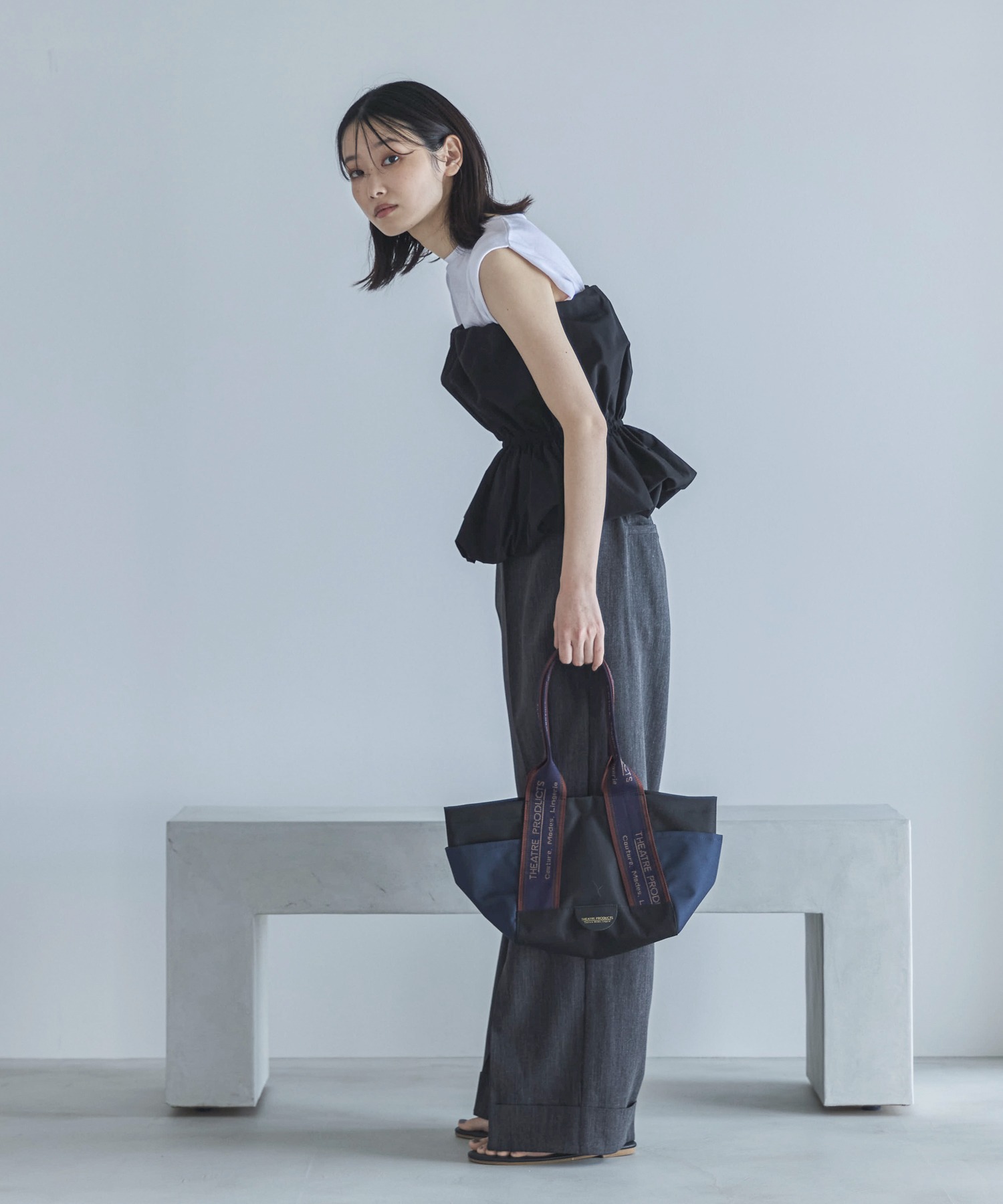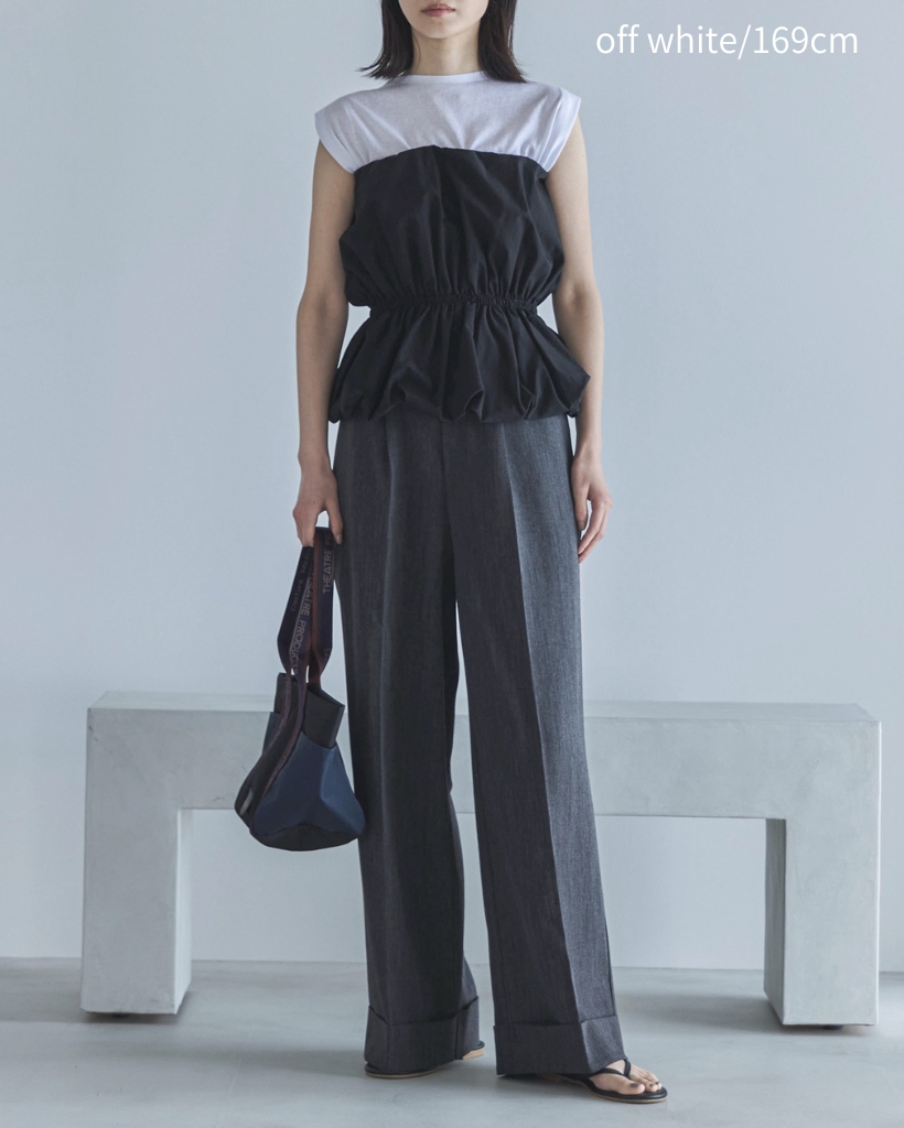 肩にタックを寄せたディティールと肩幅もやや長めにとったデザインのため、フロントから見ると二の腕のシルエットが少しカバーできる嬉しいデザインに。