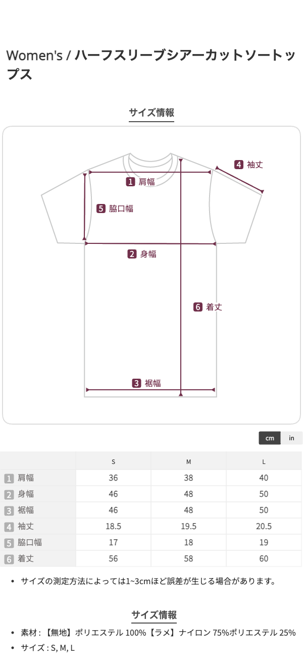 【S】着丈:56、肩幅:36、袖丈:18.5、アームホール:34、バスト:92、裾幅:46