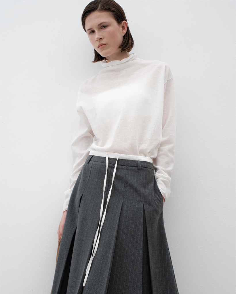 不規則なタックがアクセントになり、さまざまなトップスと合わせやすいアイテムです。