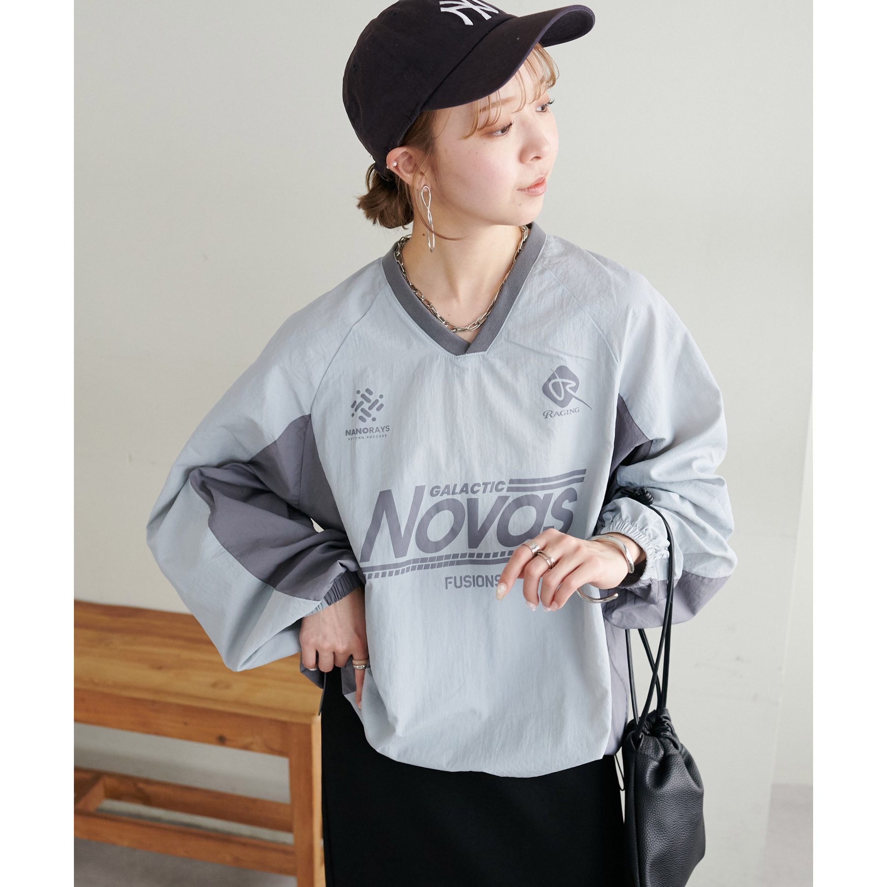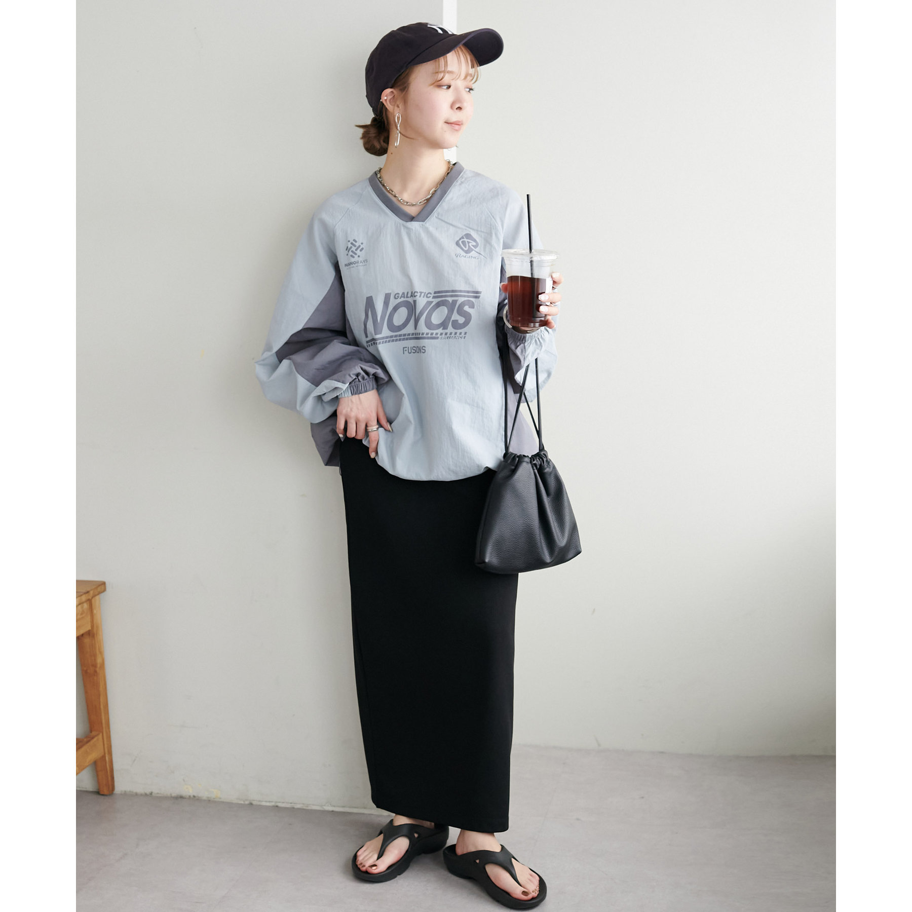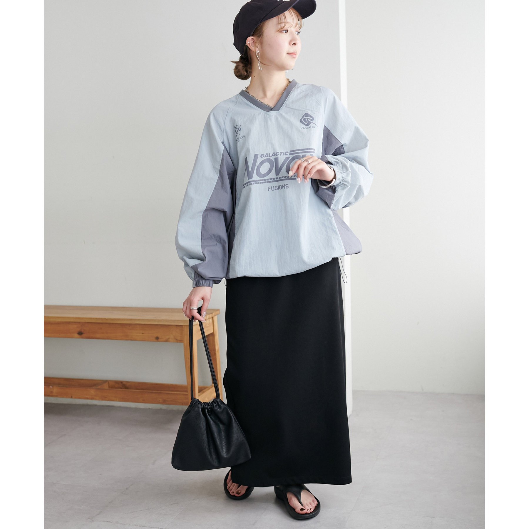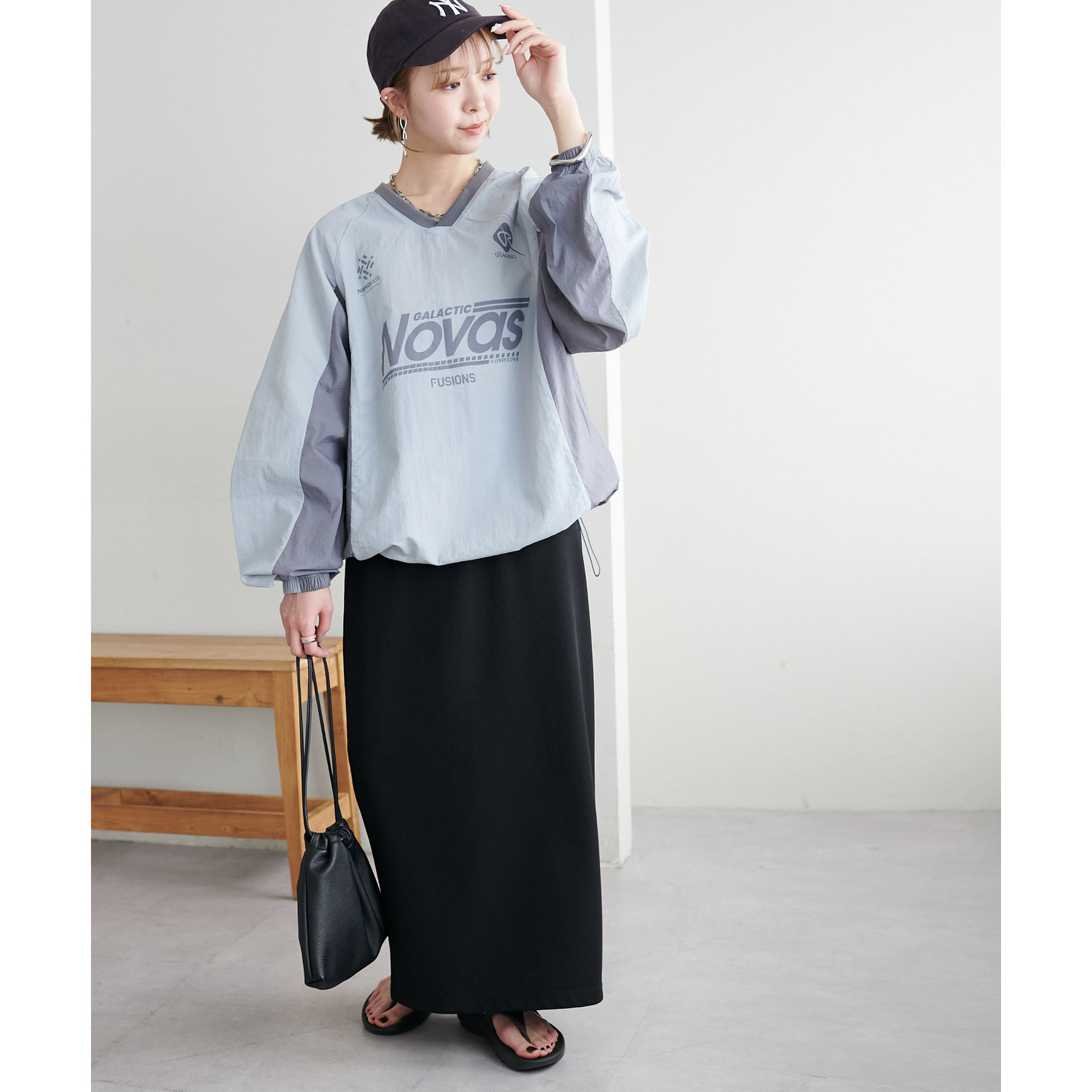配色デザインとフロントのロゴデザインが魅力のナイロンスウェット。裾はドロスト仕様なので絞ってシルエットを丸くすれば女性らしさをプラスできます!Vネックで抜け感も◎メンズライクなアイテムなので、女性の方はスカートを合わせて少し甘さをプラスしたコーデがおすすめです♪