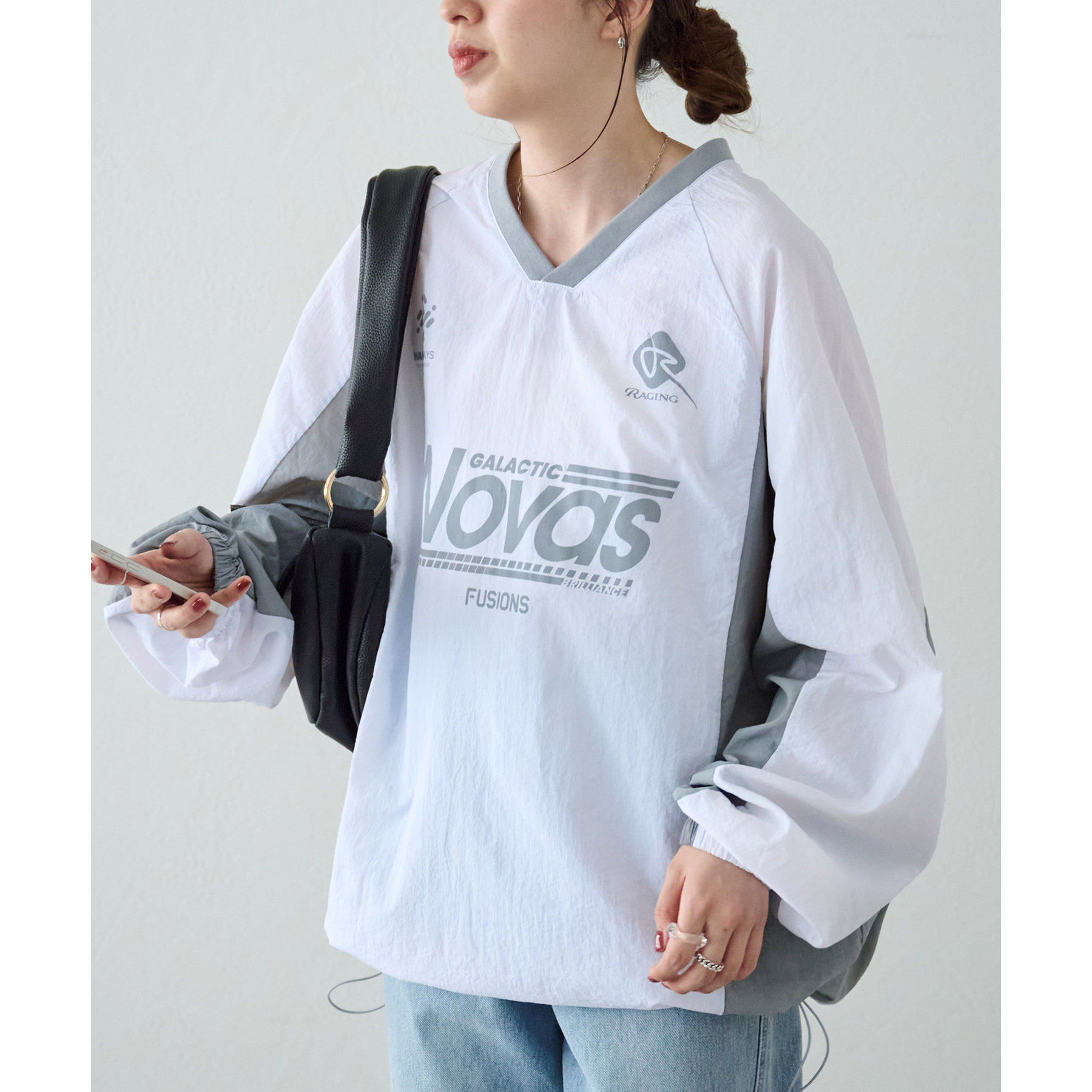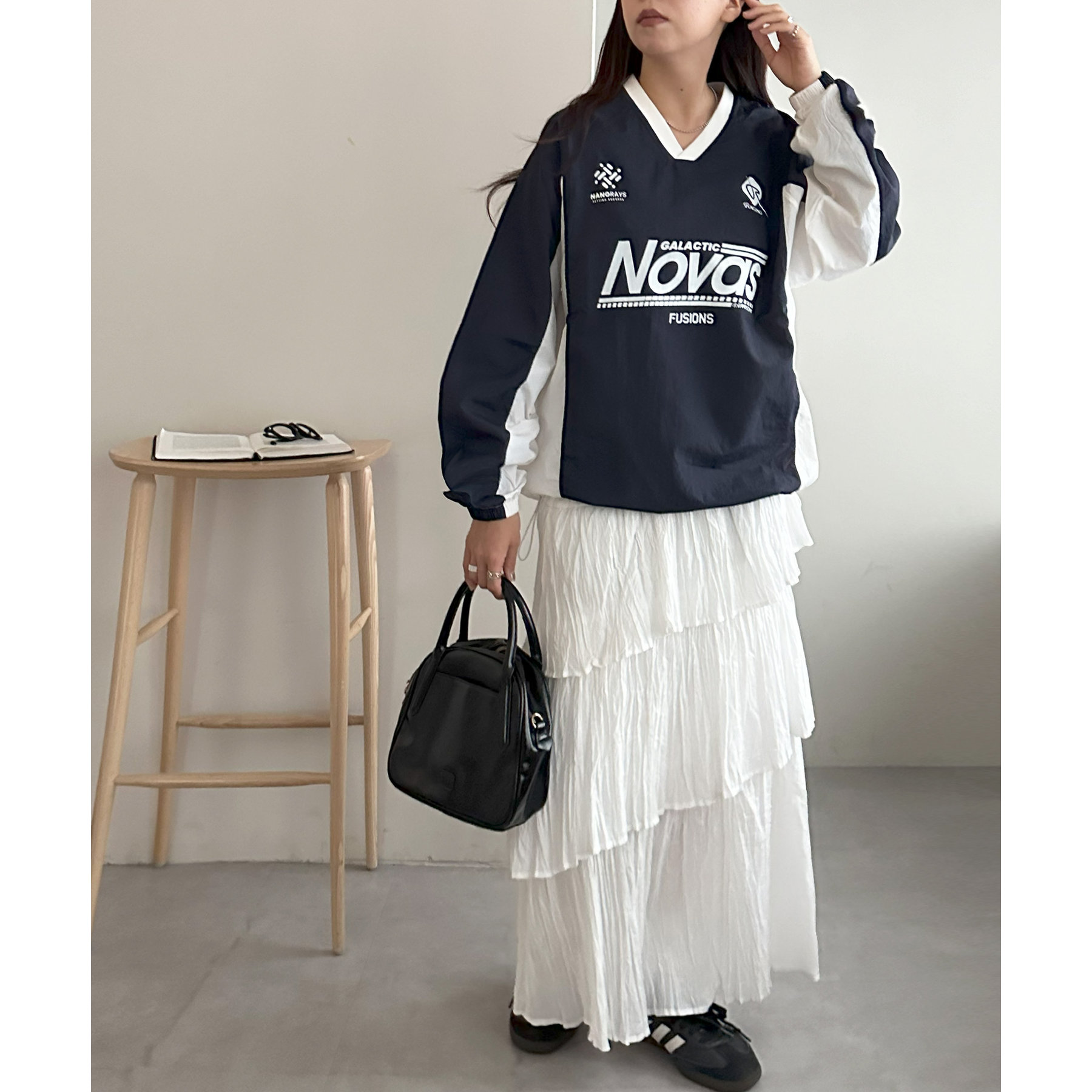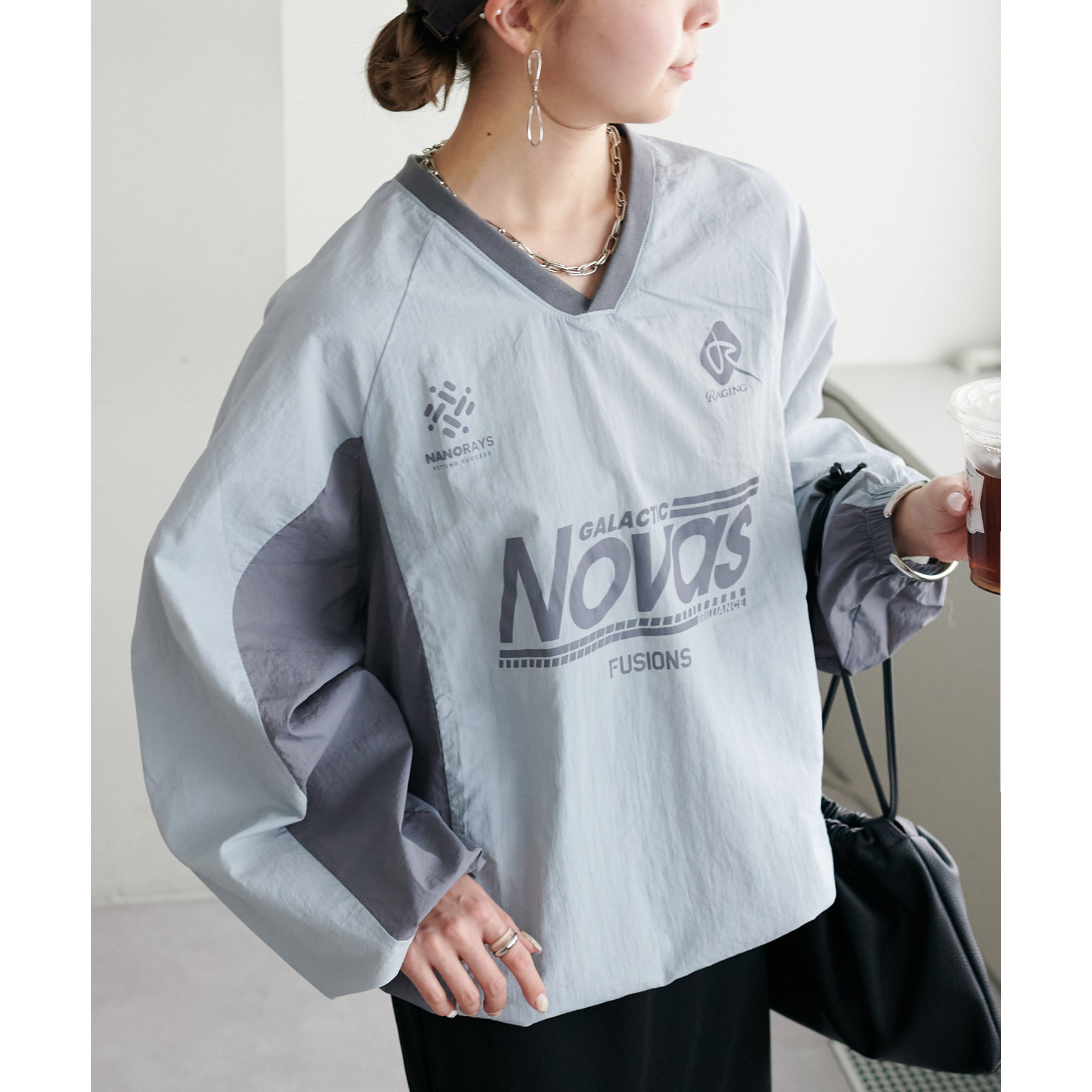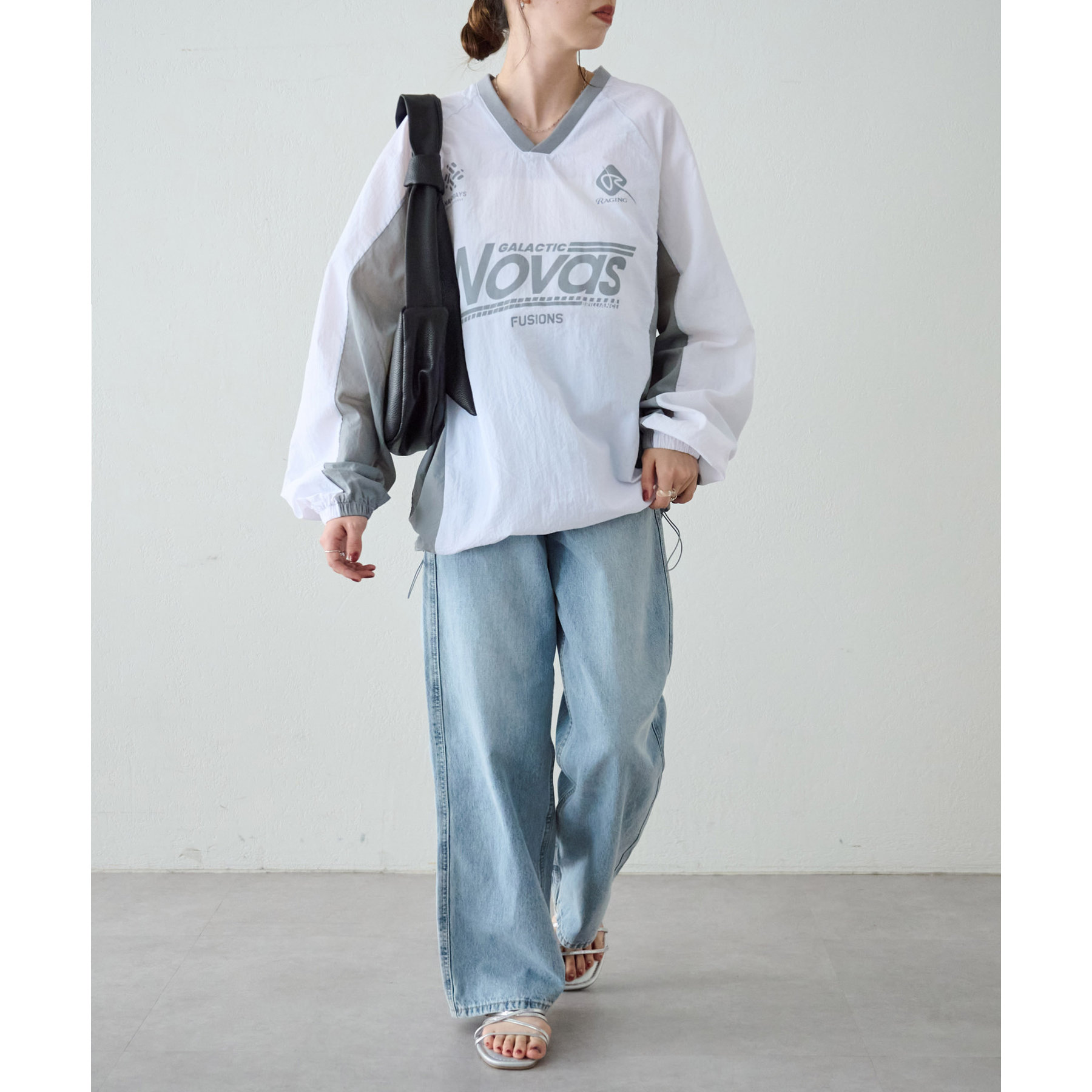 配色デザインとフロントのロゴデザインが魅力のナイロンスウェット。裾はドロスト仕様なので絞ってシルエットを丸くすれば女性らしさをプラスできます!Vネックで抜け感も◎メンズライクなアイテムなので、女性の方はスカートを合わせて少し甘さをプラスしたコーデがおすすめです♪