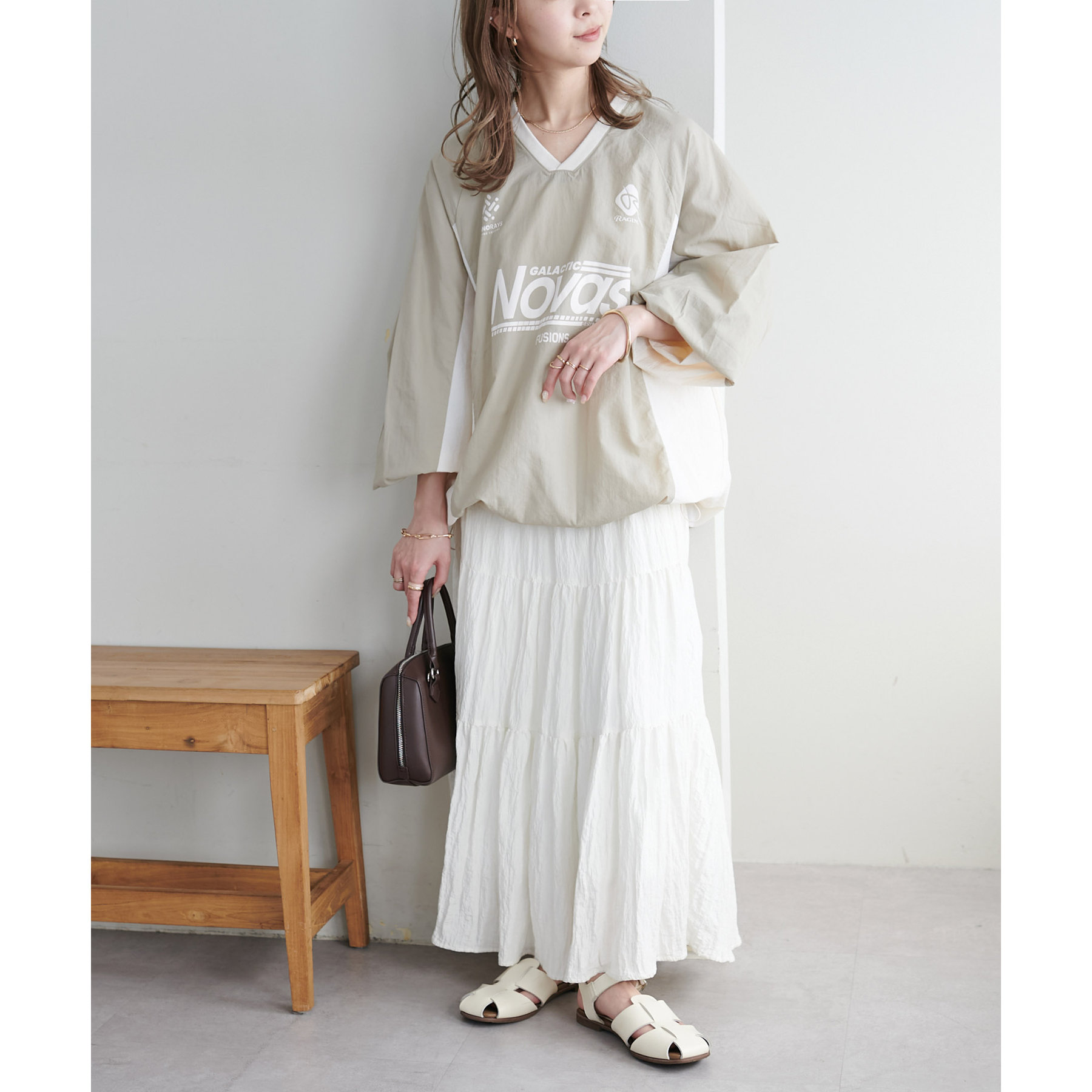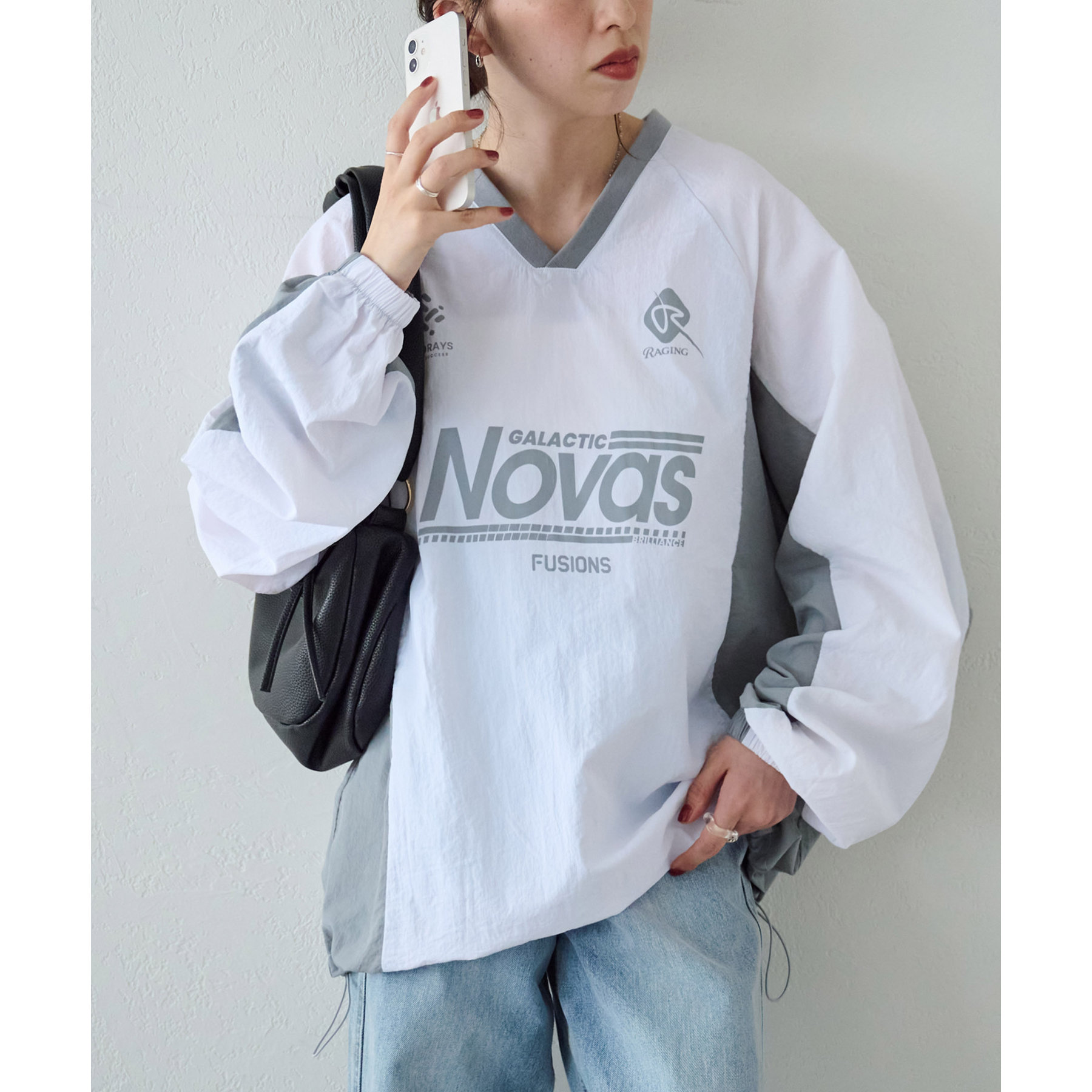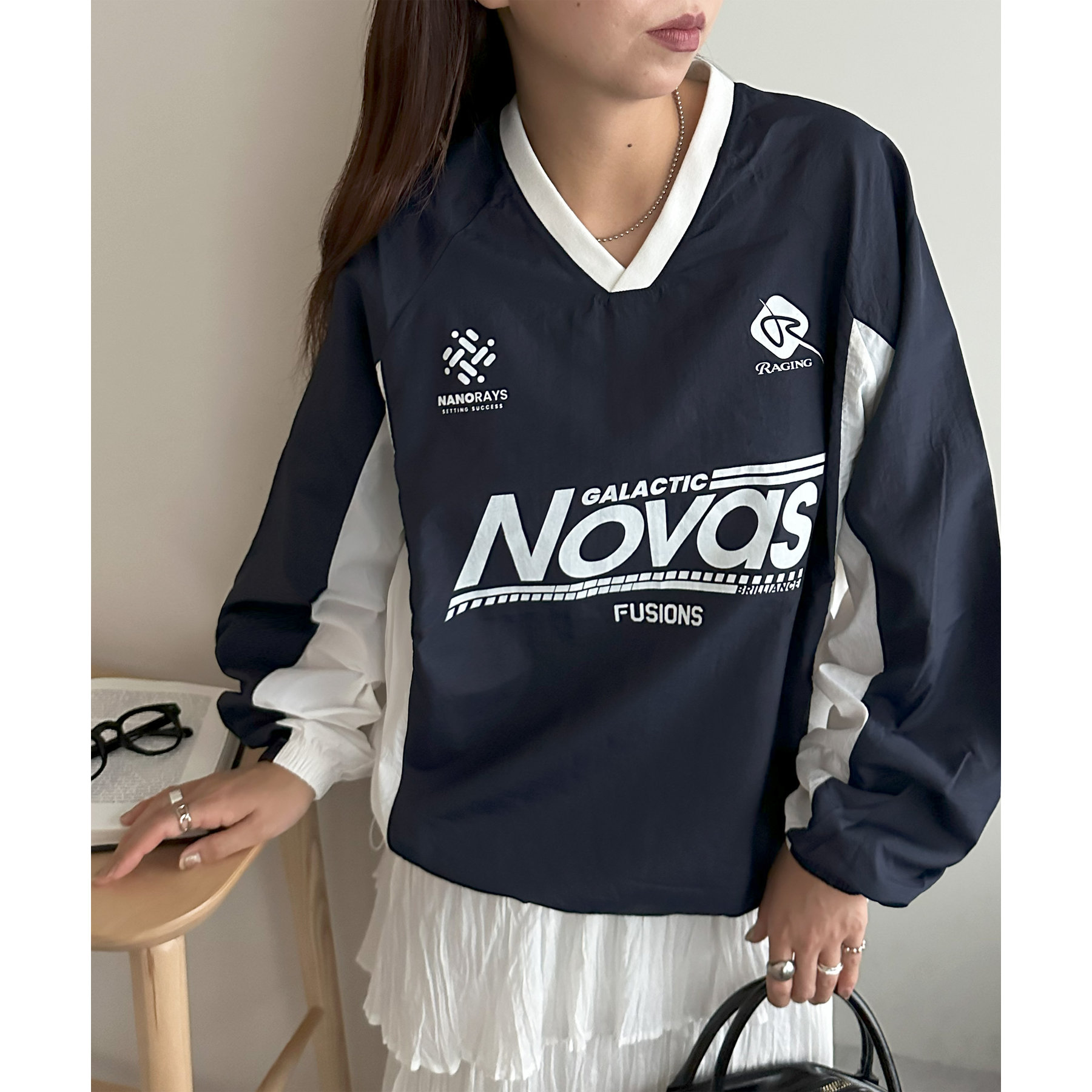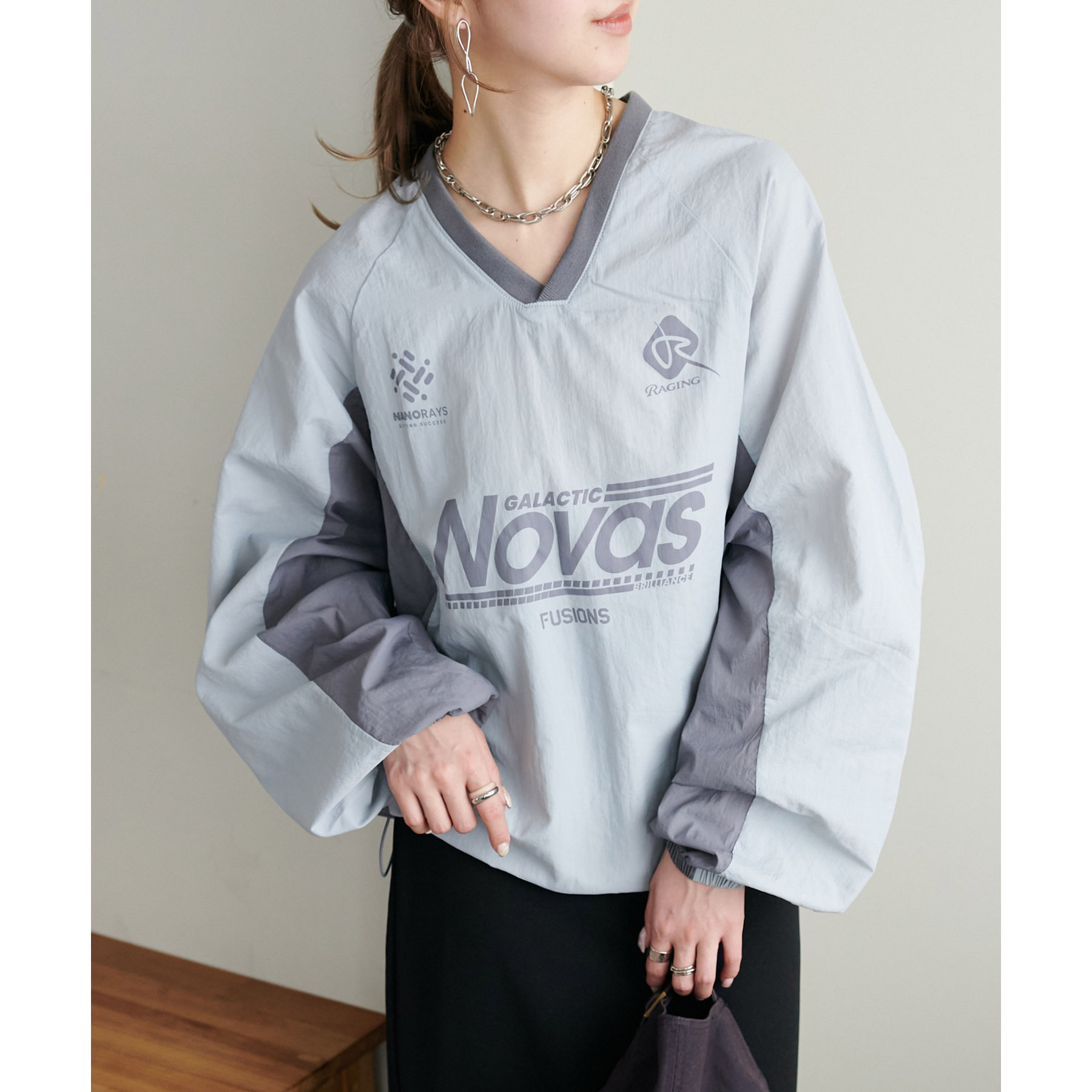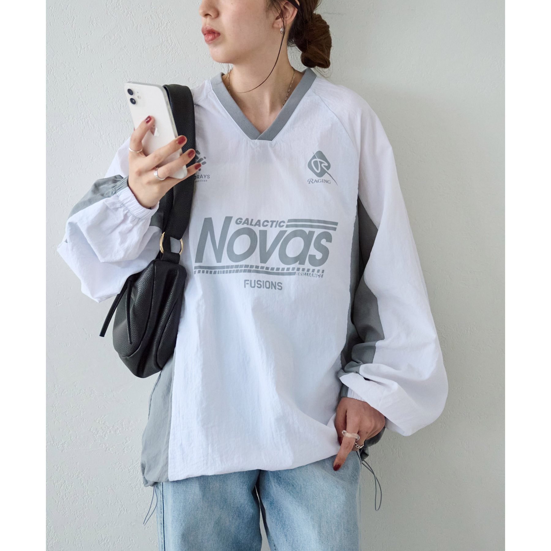 配色デザインとフロントのロゴデザインが魅力のナイロンスウェット。裾はドロスト仕様なので絞ってシルエットを丸くすれば女性らしさをプラスできます!Vネックで抜け感も◎メンズライクなアイテムなので、女性の方はスカートを合わせて少し甘さをプラスしたコーデがおすすめです♪