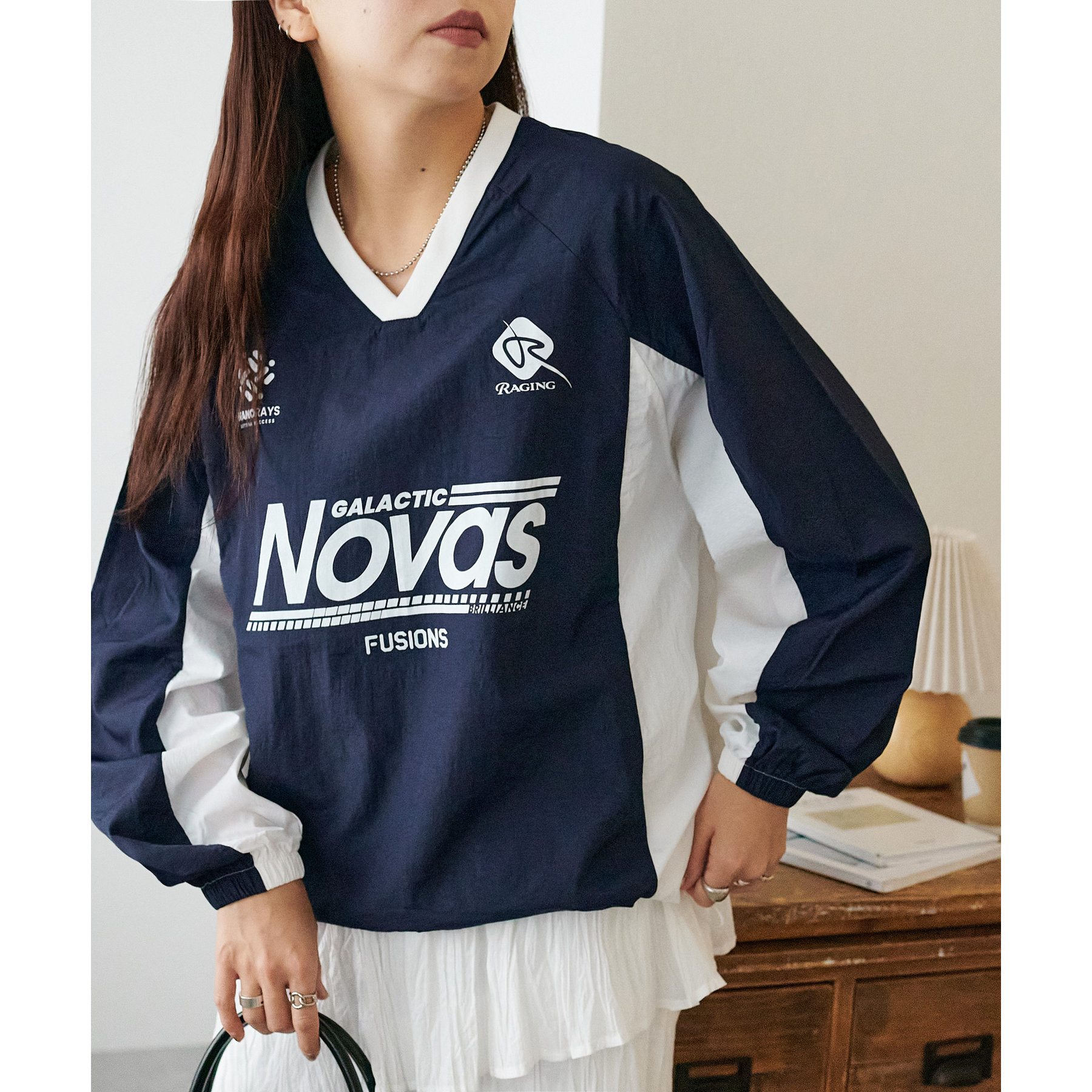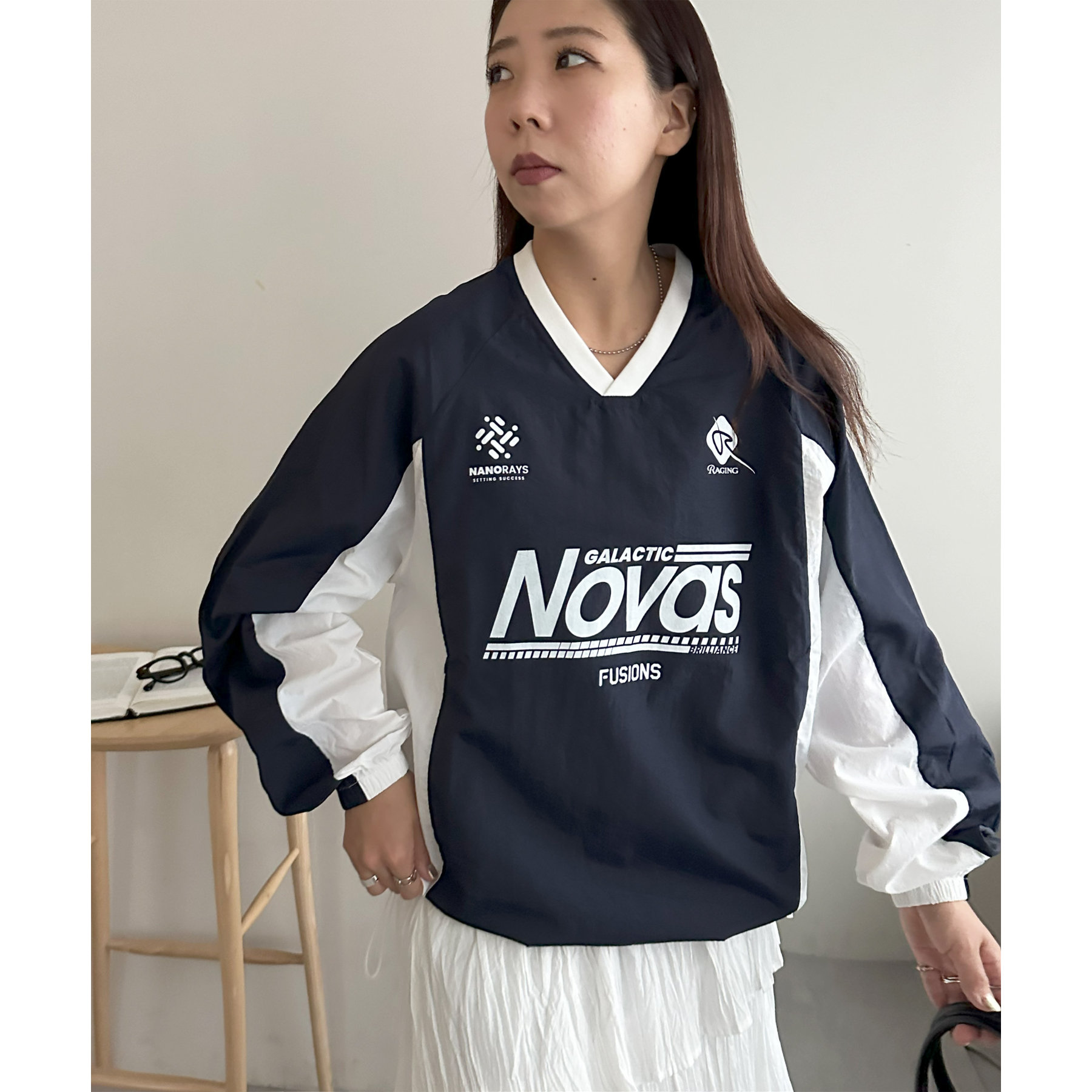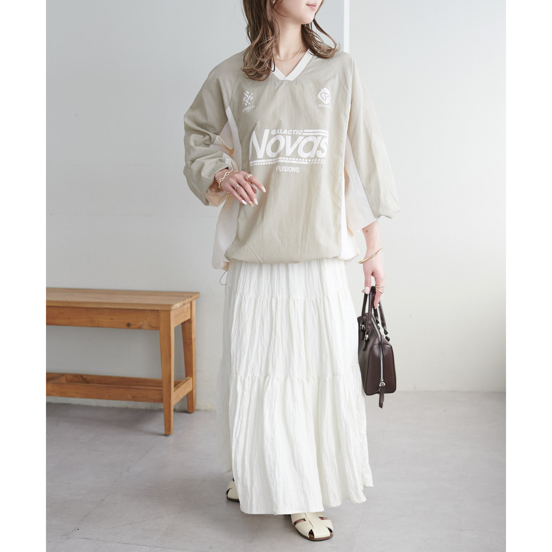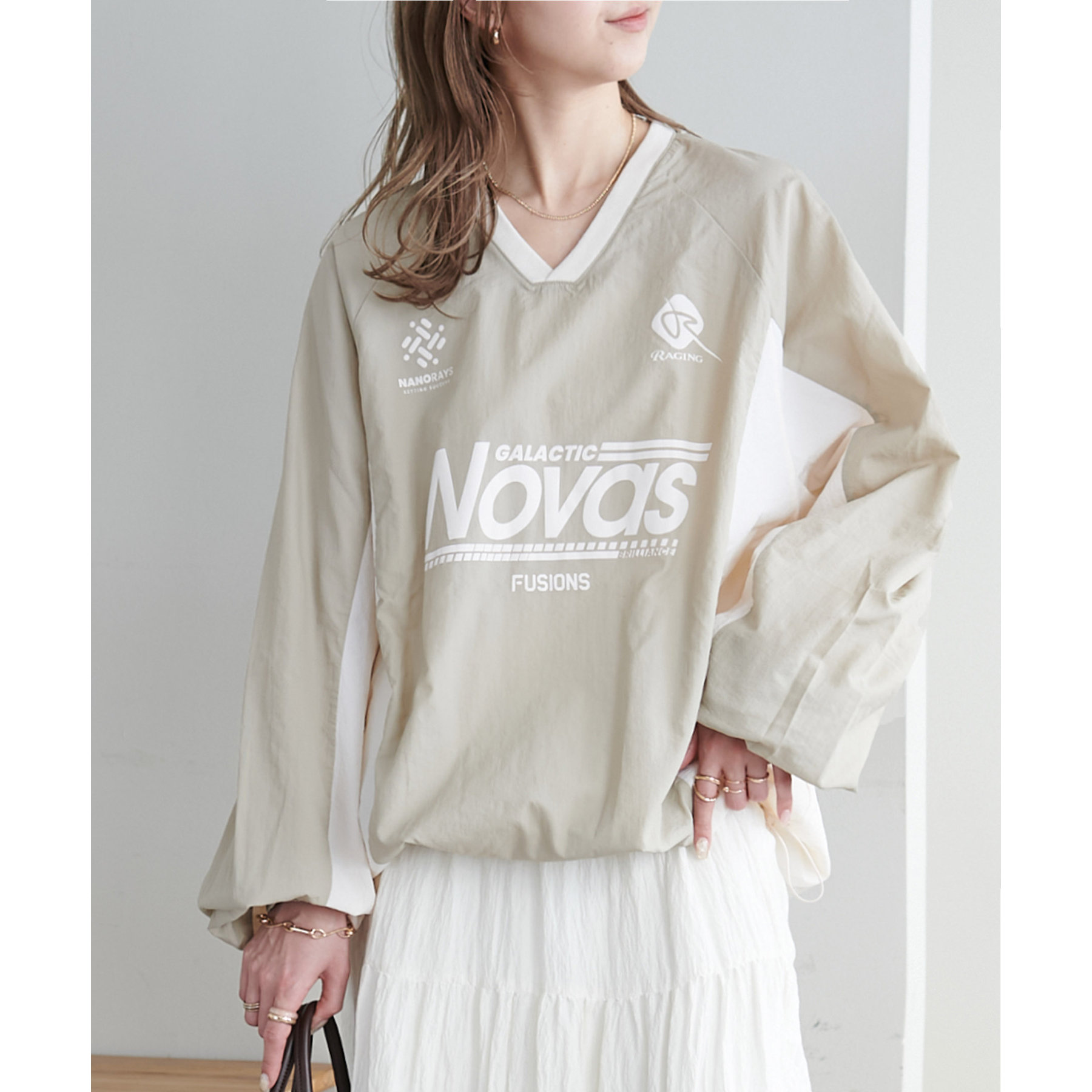 配色デザインとフロントのロゴデザインが魅力のナイロンスウェット。裾はドロスト仕様なので絞ってシルエットを丸くすれば女性らしさをプラスできます!Vネックで抜け感も◎メンズライクなアイテムなので、女性の方はスカートを合わせて少し甘さをプラスしたコーデがおすすめです♪