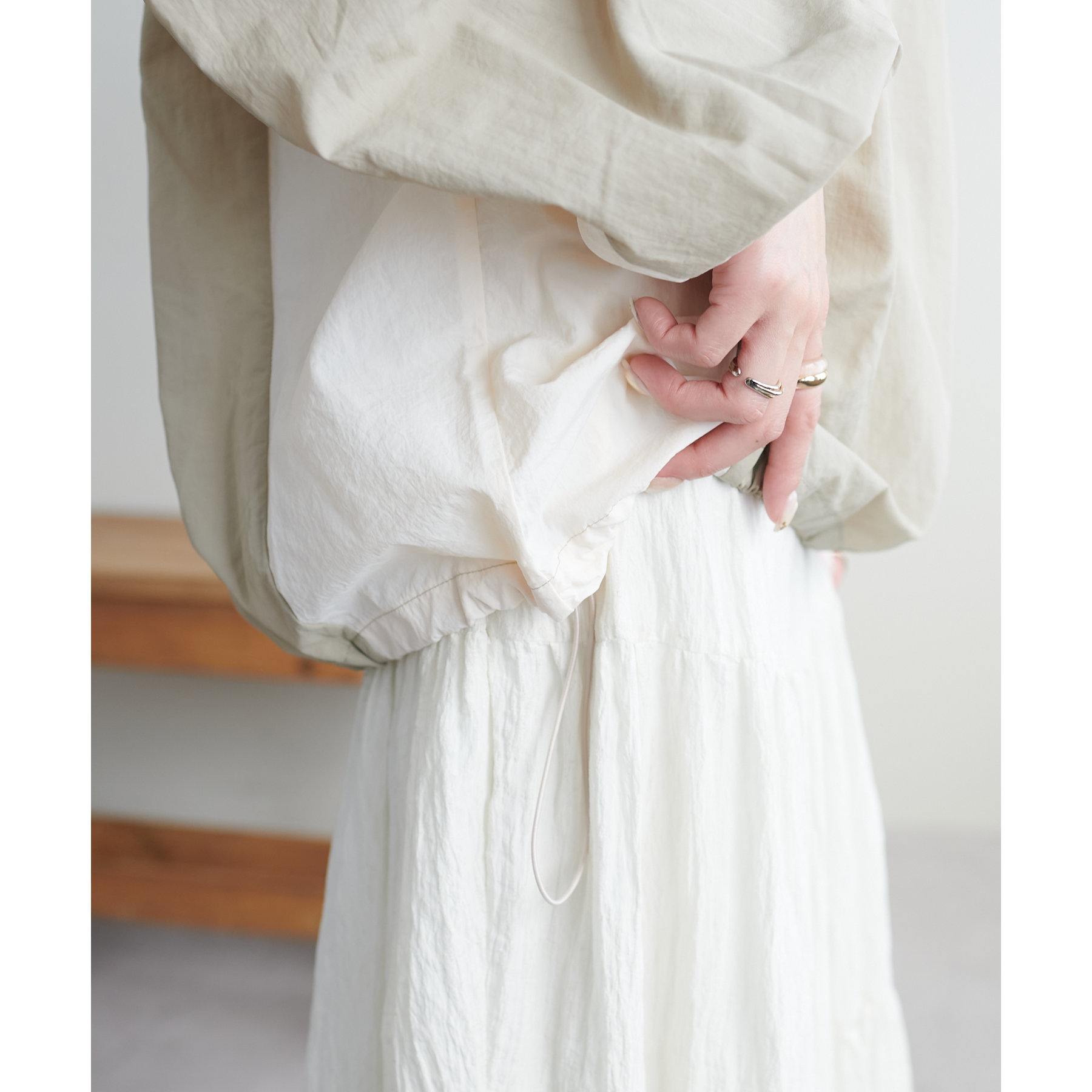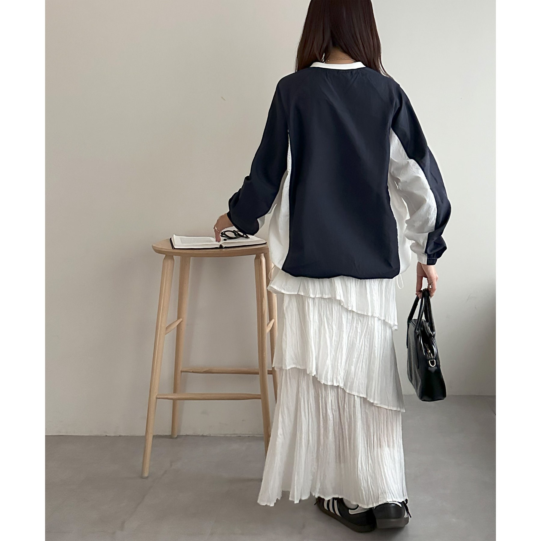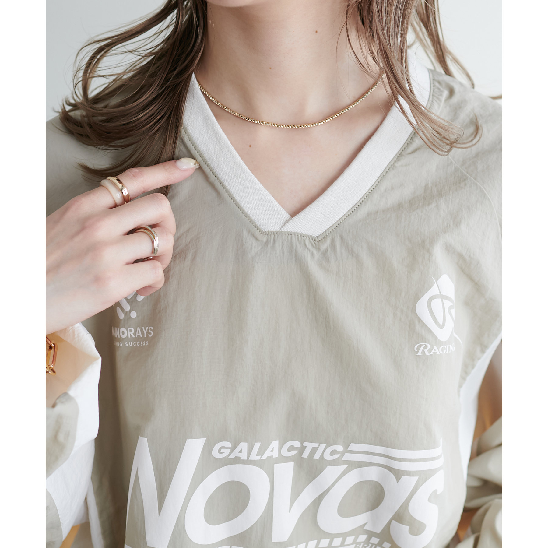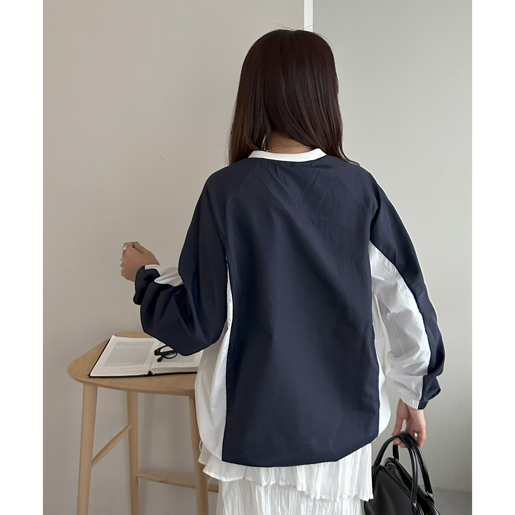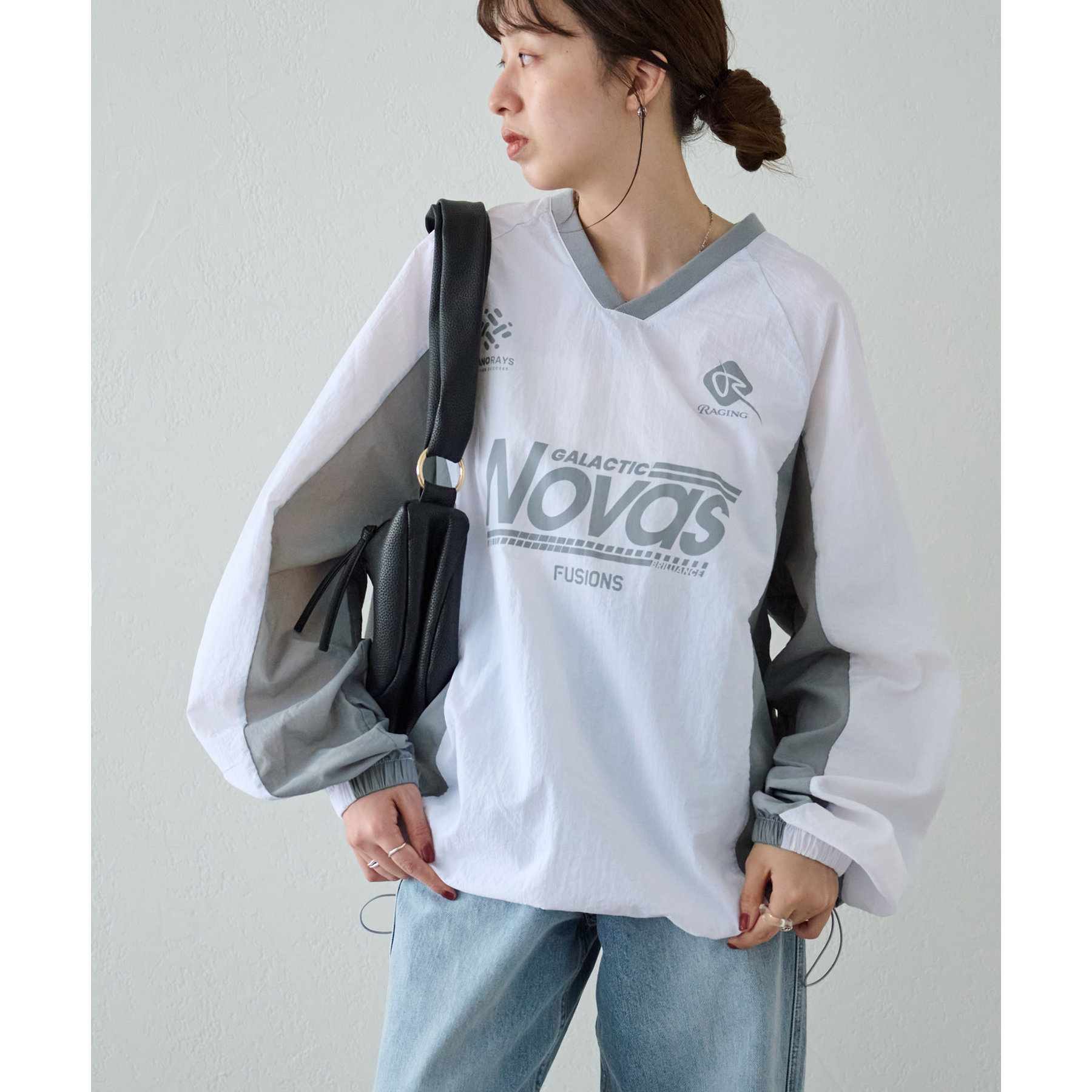 配色デザインとフロントのロゴデザインが魅力のナイロンスウェット。裾はドロスト仕様なので絞ってシルエットを丸くすれば女性らしさをプラスできます!Vネックで抜け感も◎メンズライクなアイテムなので、女性の方はスカートを合わせて少し甘さをプラスしたコーデがおすすめです♪