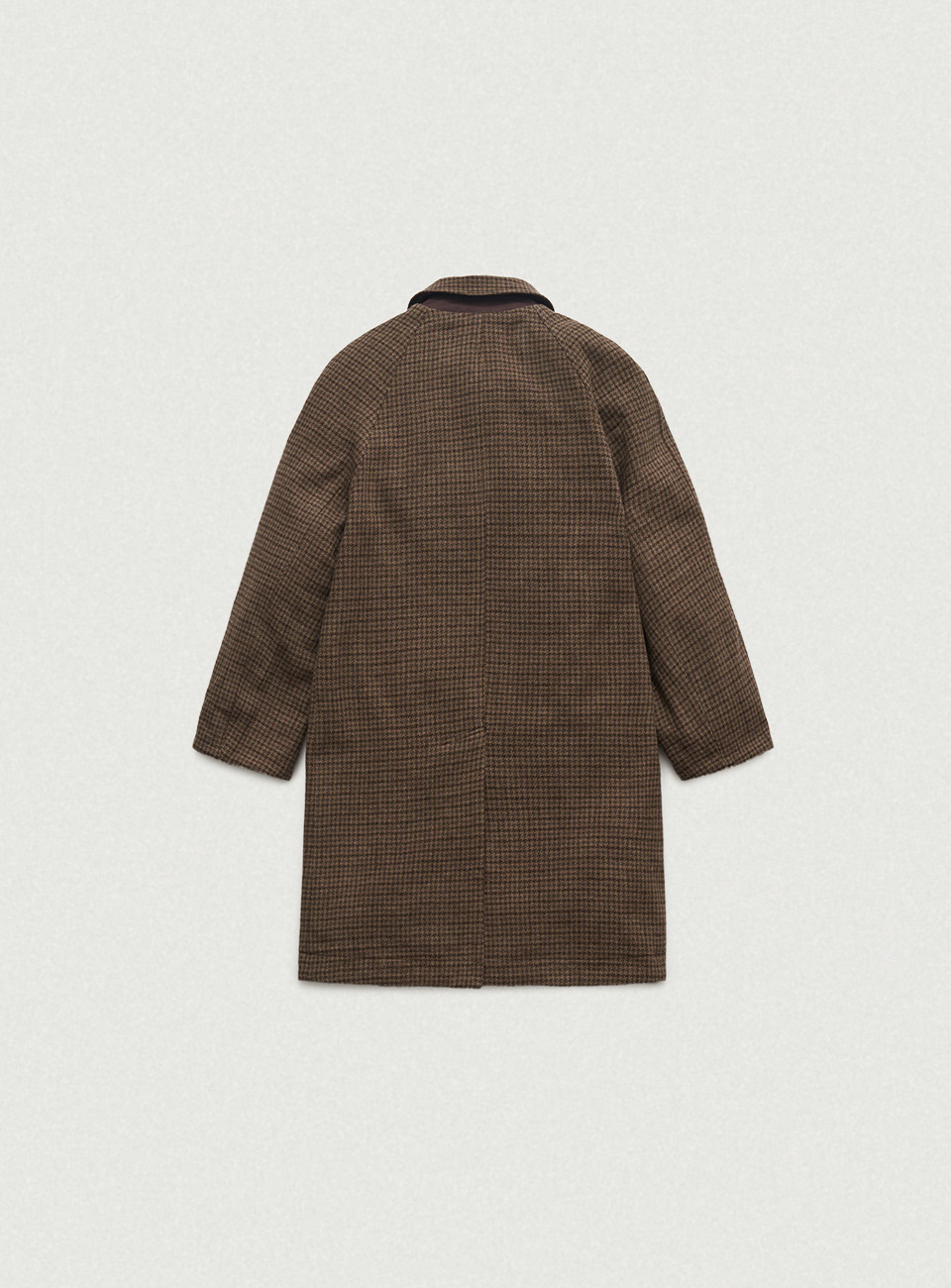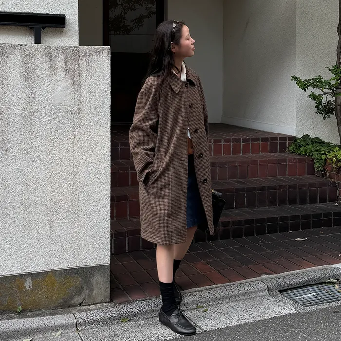 シングルブレストとクラシックカラー、ボタン開閉仕様のトレンチコートタイプ