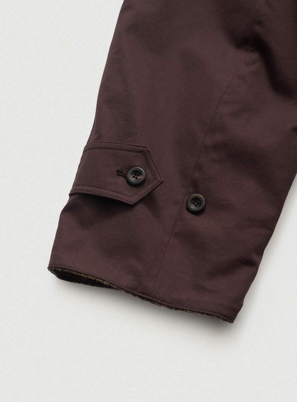 バーガンディカラーのコットン混紡ファブリックと、マルチカラーのチェック柄ウール混紡ファブリック