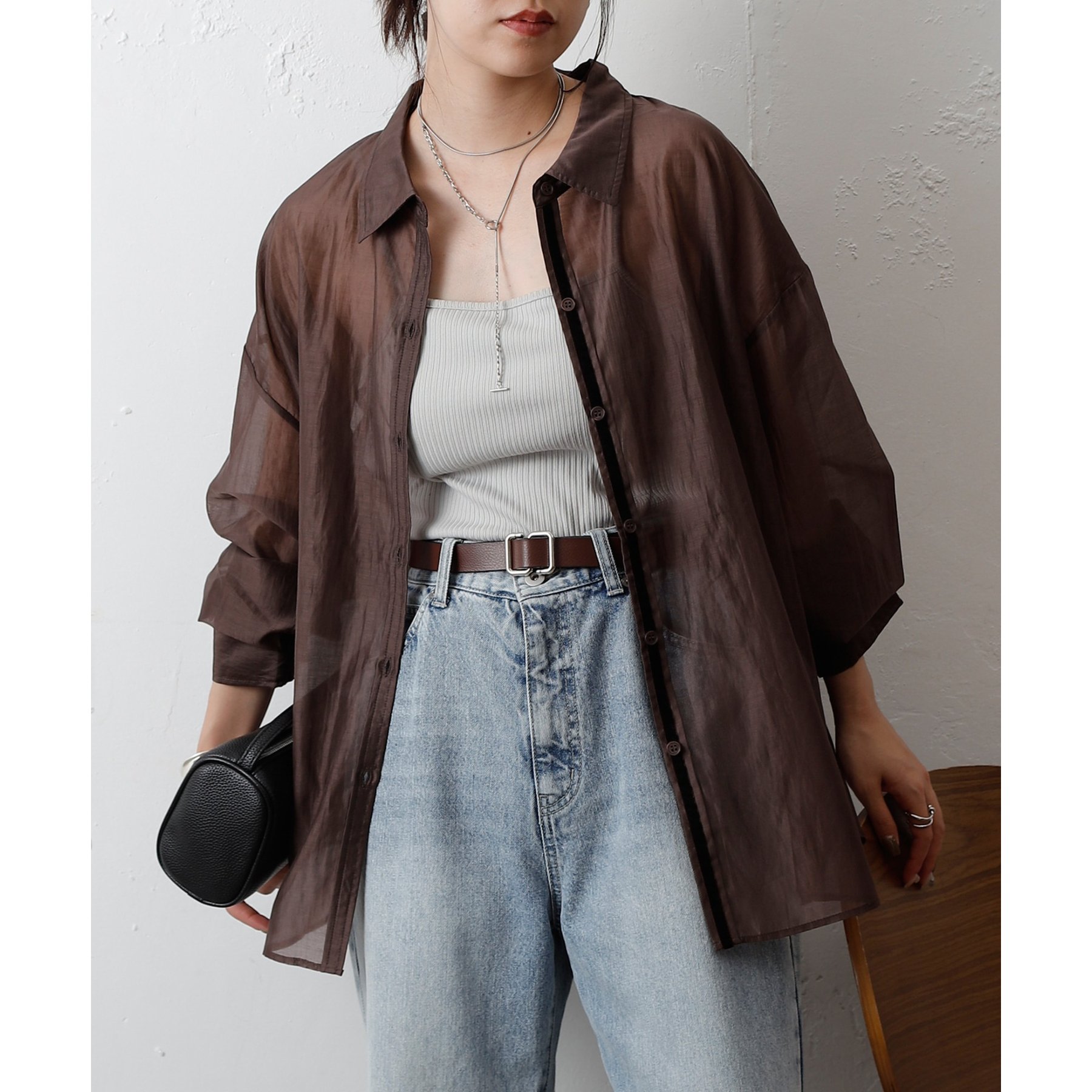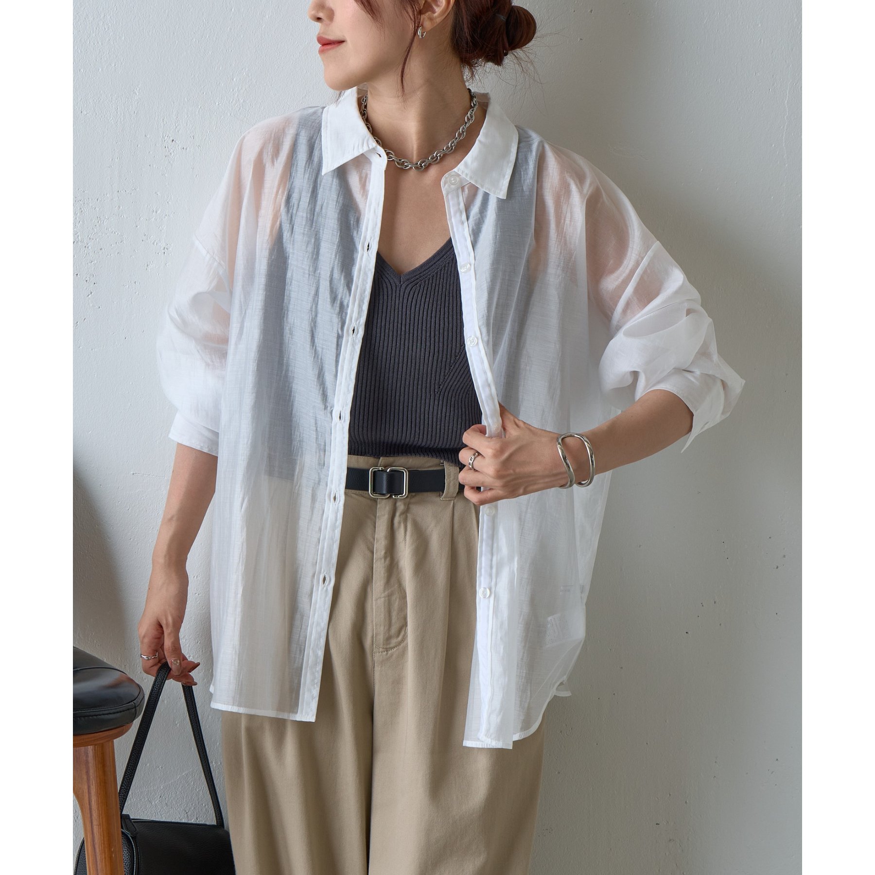 羽織としても活躍する着回し力の高いアイテムで、タンクトップやキャミソールに重ねるだけで抜け感のあるスタイルが完成。